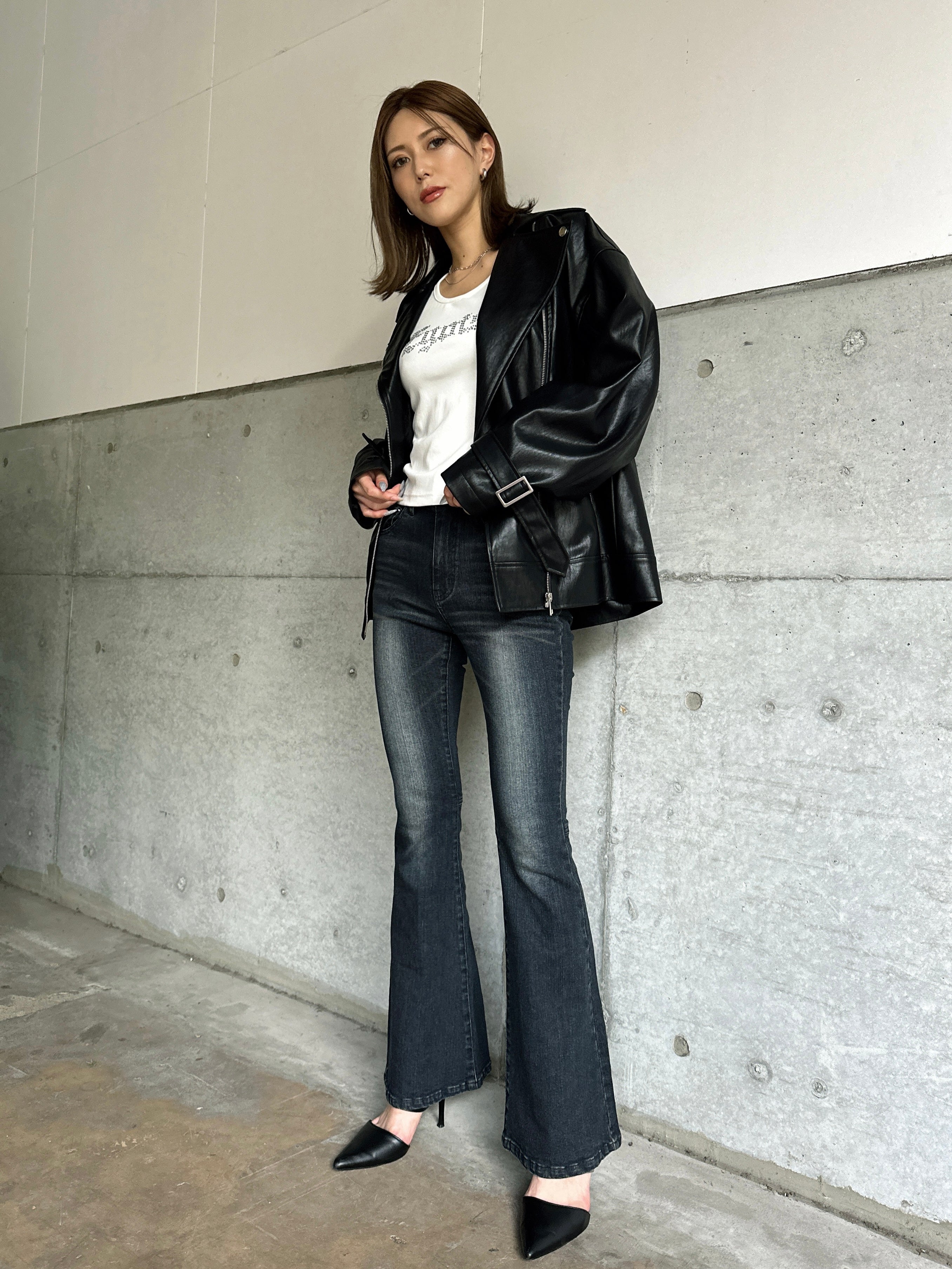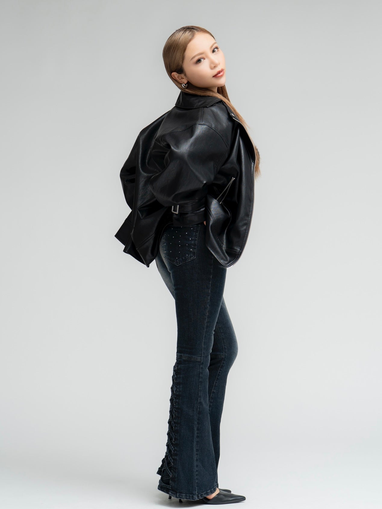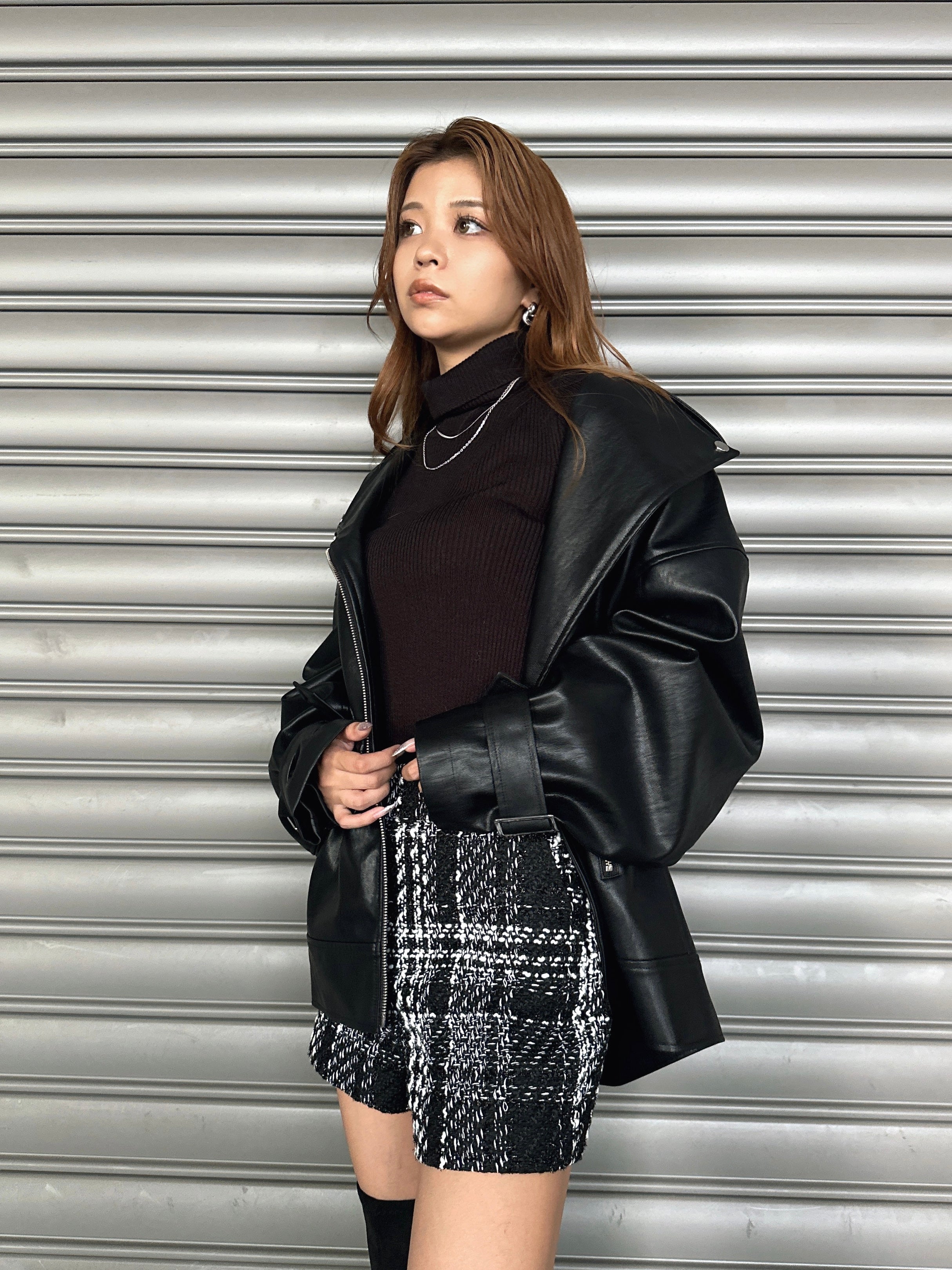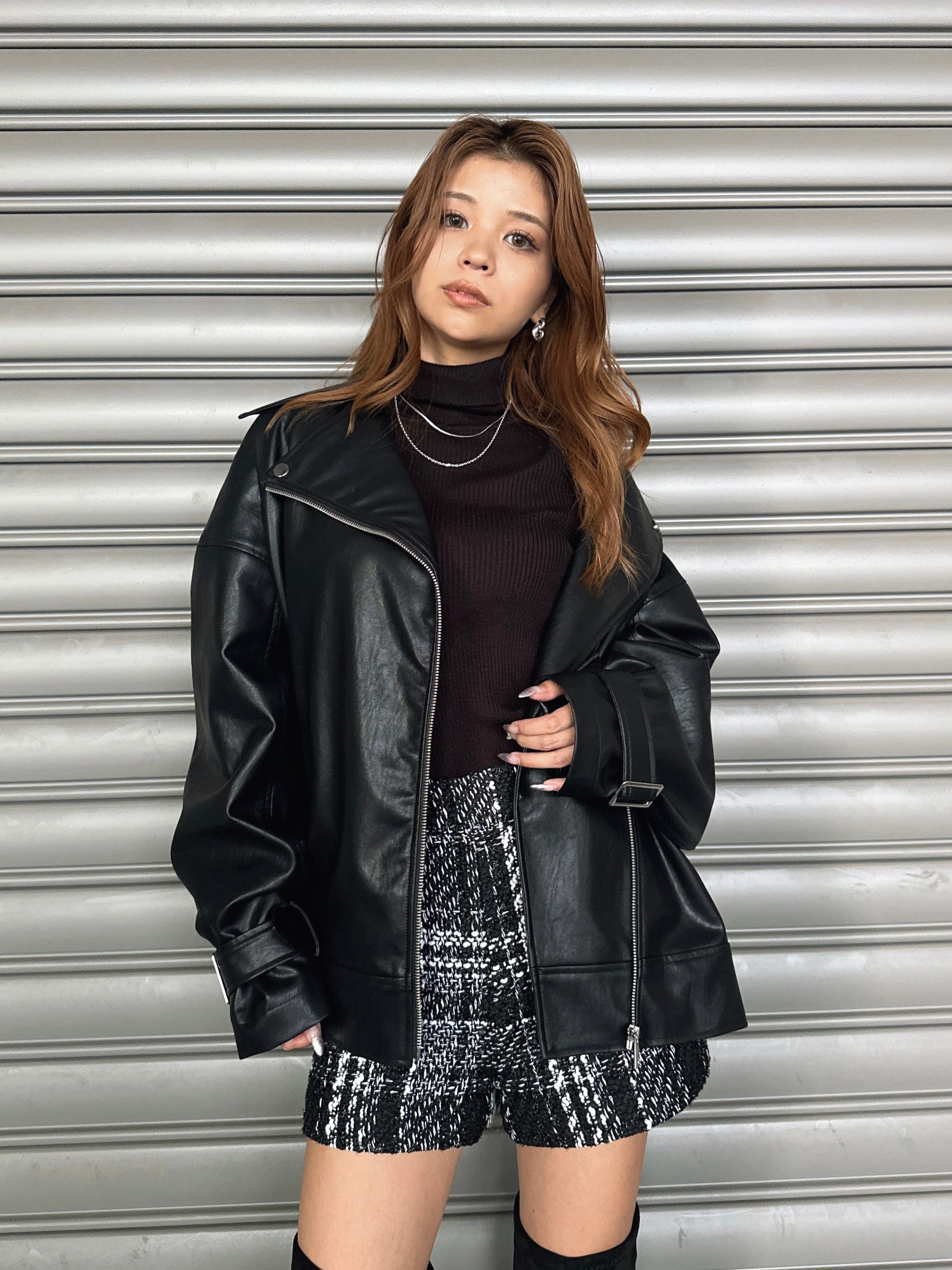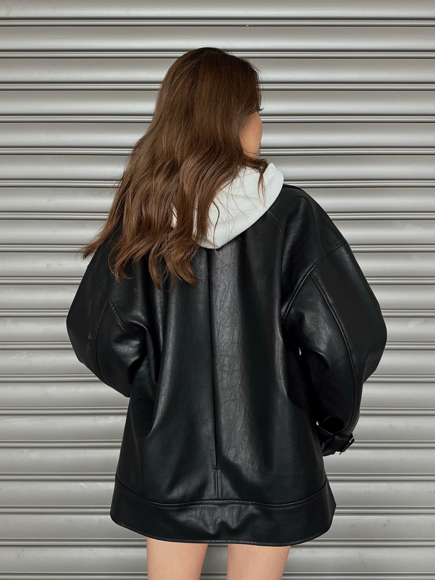 大きな衿がポイントのフェイクレザーライダースジャケット。ビッグカラーは、小顔効果をもたらしてくれるのも嬉しいポイント。ゆとりを持たせたアームと身頃の作りで、ボリュームのあるトップスでも窮屈感なくインナーに取り入れやすいです。ヒップが隠れる長めの着丈で、体型カバーもばっちり。付属品は全て艶ありシルバーで統一することで高級感を出しました。お好みで袖口の絞りを調整できるように、袖口BELTを付けています。センターバックにはざっくりとタックを入れ立体感を出し、360度どこから見ても抜かりのない1枚に仕上げました。流行りすたりのないライダースは1枚あると重宝すること間違いなし。レザーの辛口アイテムをレディライクに着こなしたい方は、スキニー/ミニボドム/タイトワンピースの合わせがオススメです。程よいツヤ感とシボ感のフェイクレザー生地が、まるで本革と思わせるような見た目。硬すぎない生地感のものを選んでいるので、ごわつきもなく全体にハリが出てしまうのを抑えてくれます。