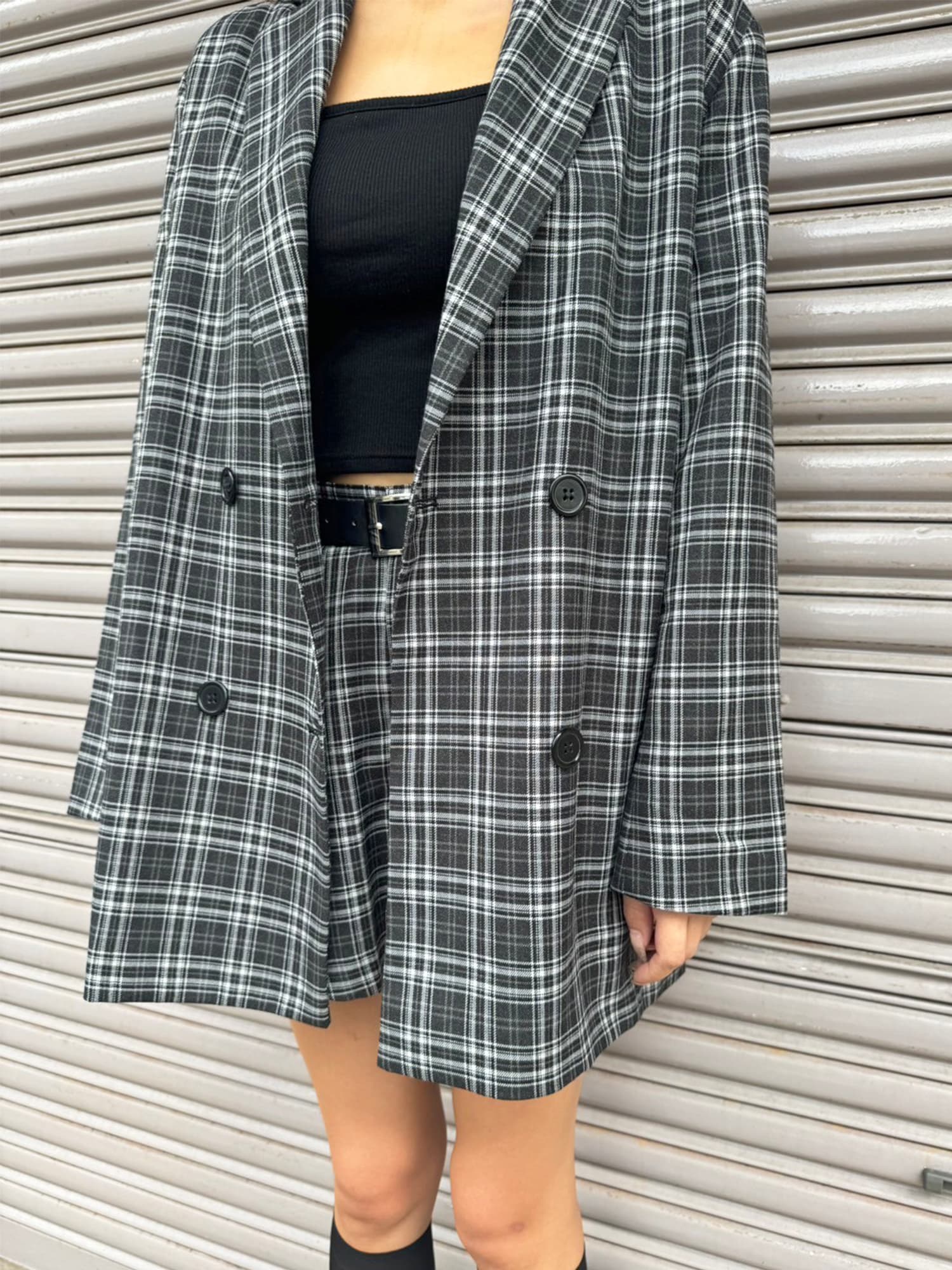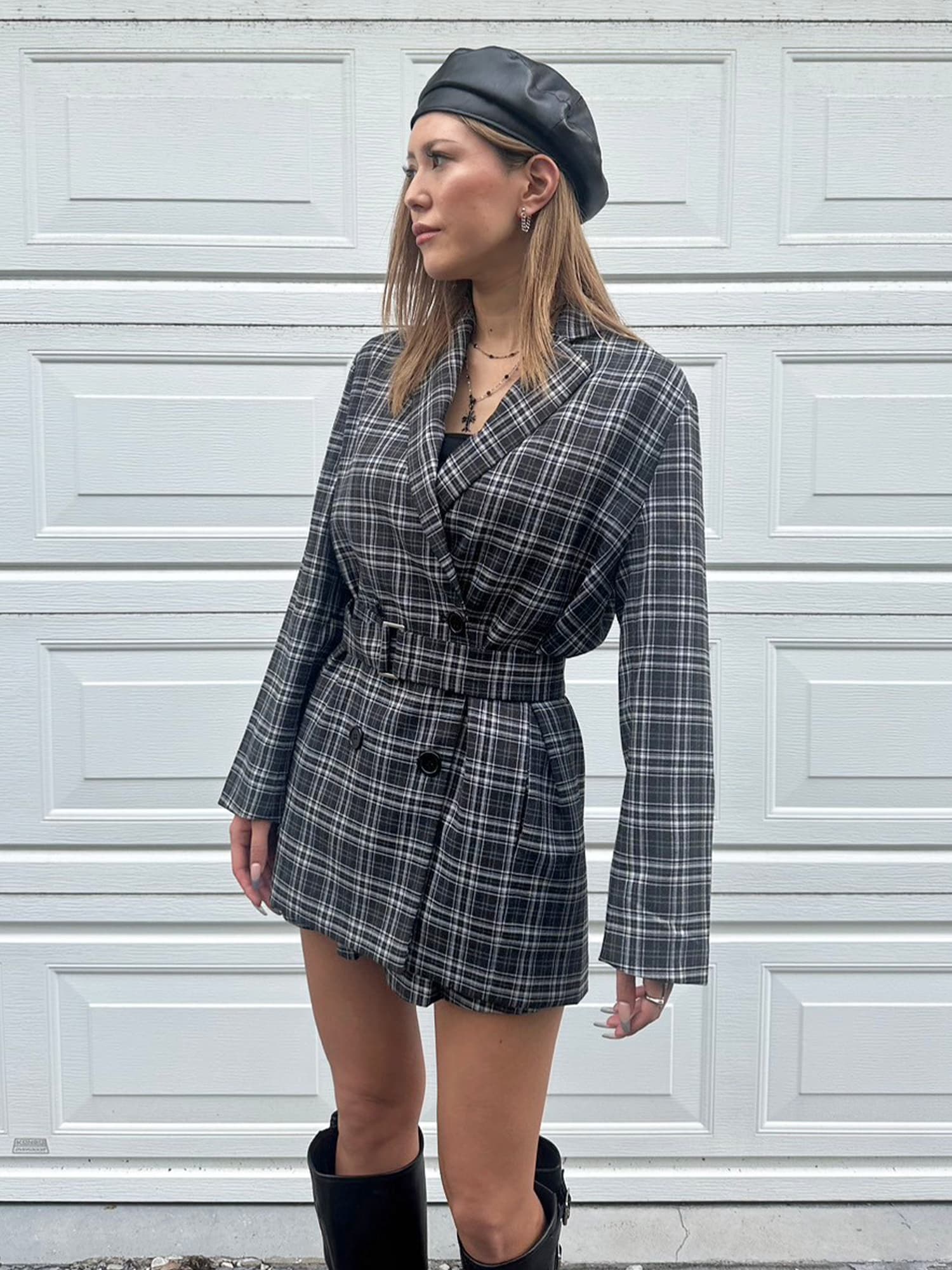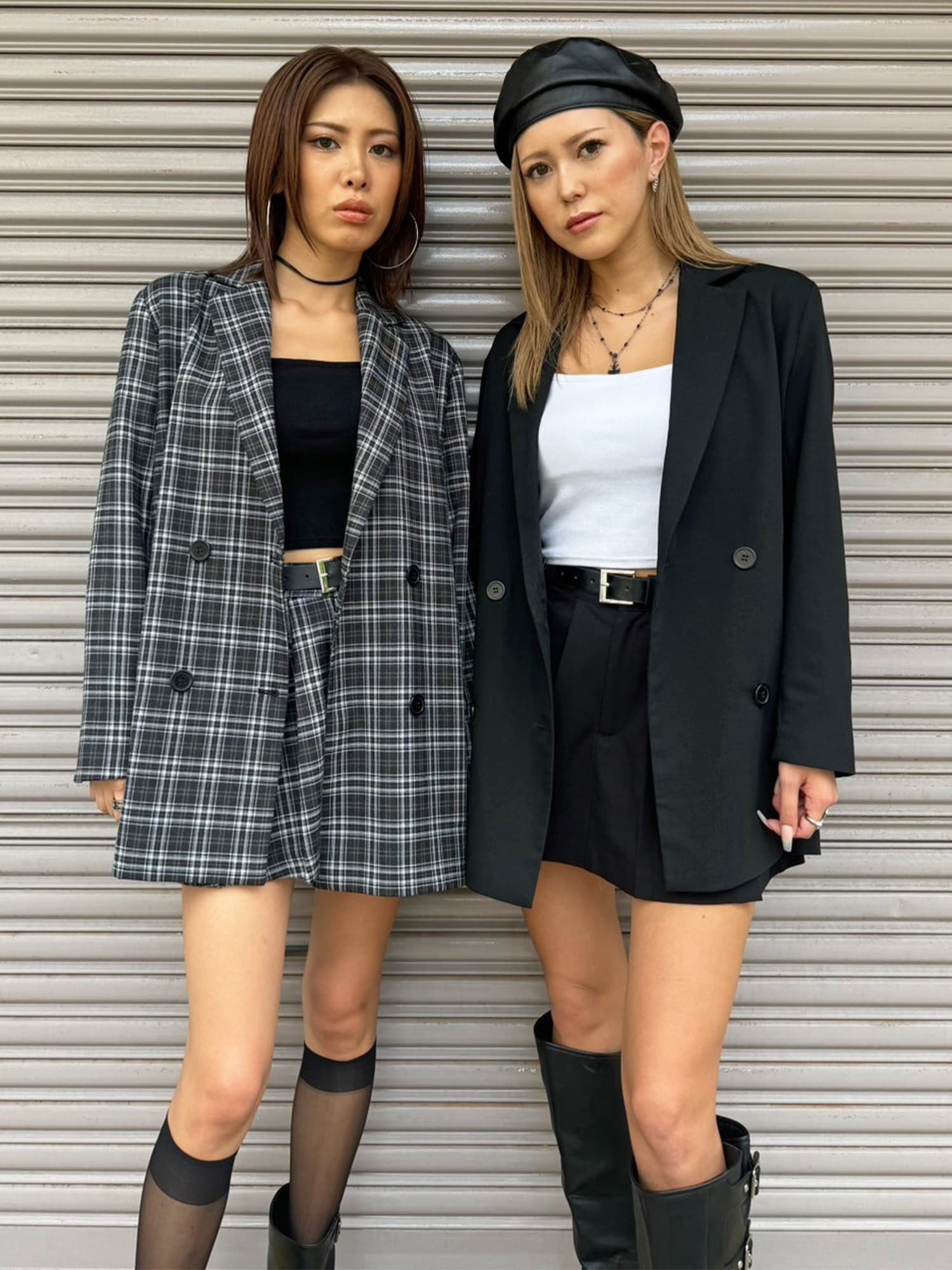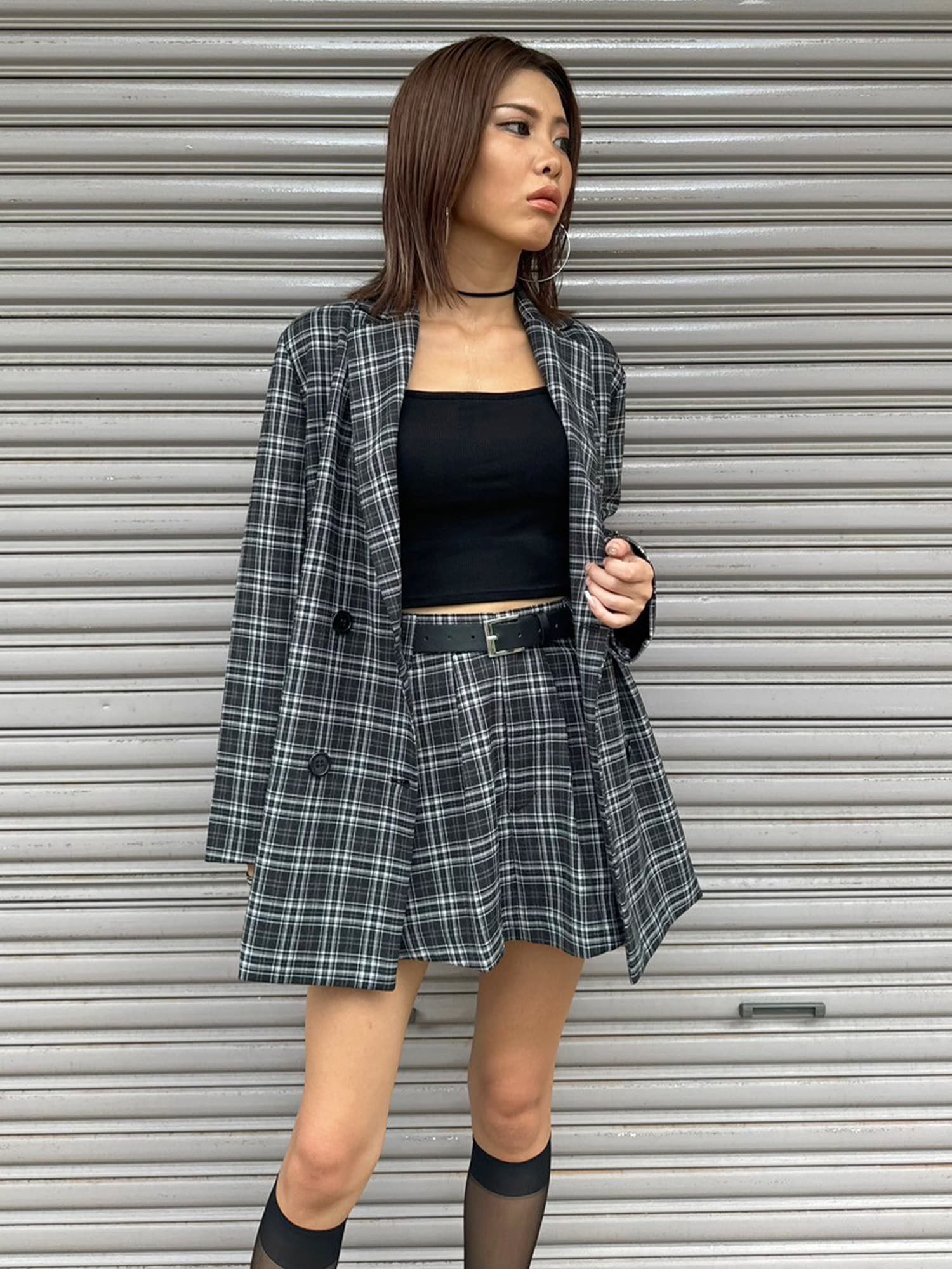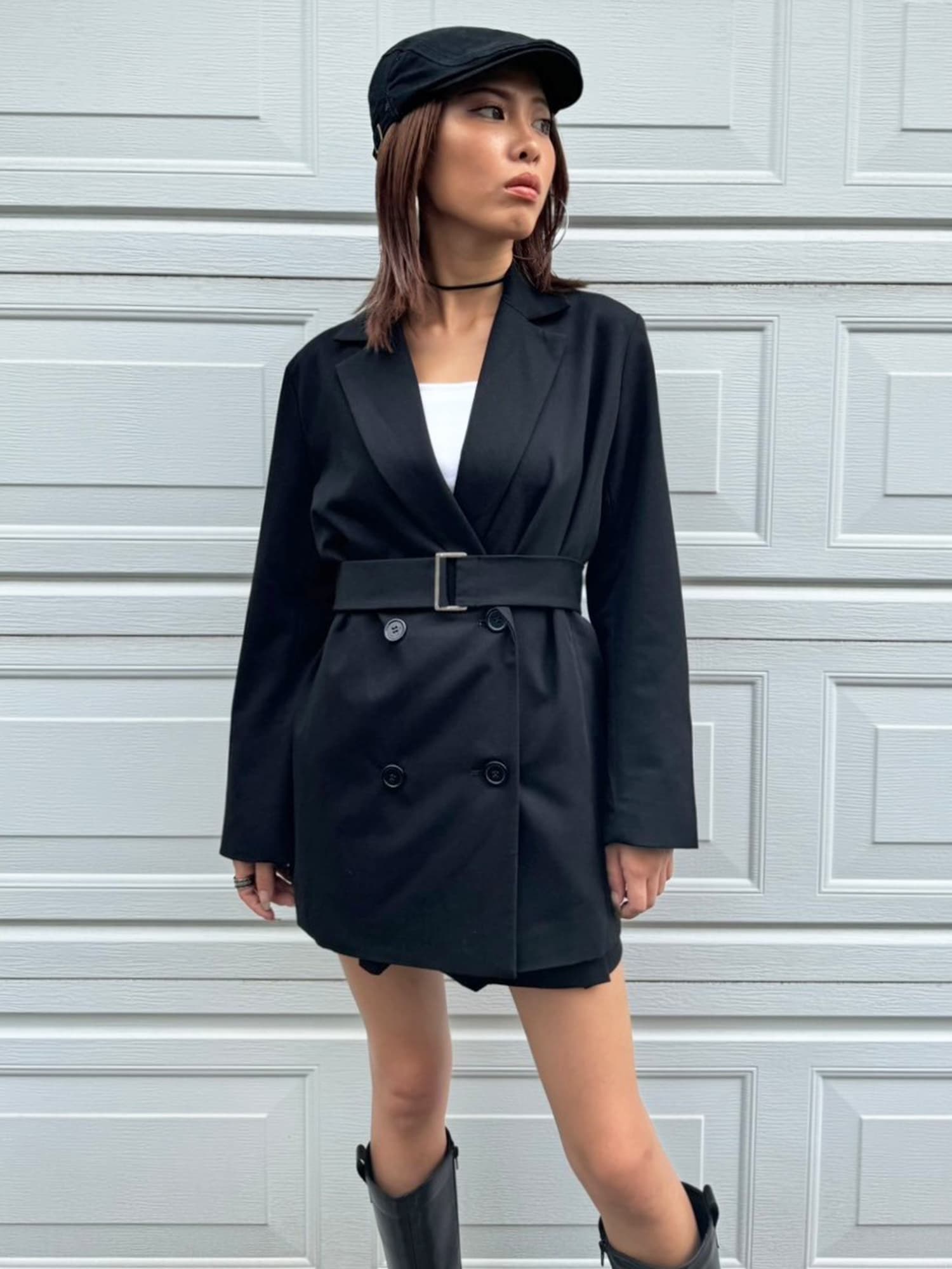 商品説明 スクエアのメタルバックルが付いた共地ベルトがワンポイントのダブルジャケット。