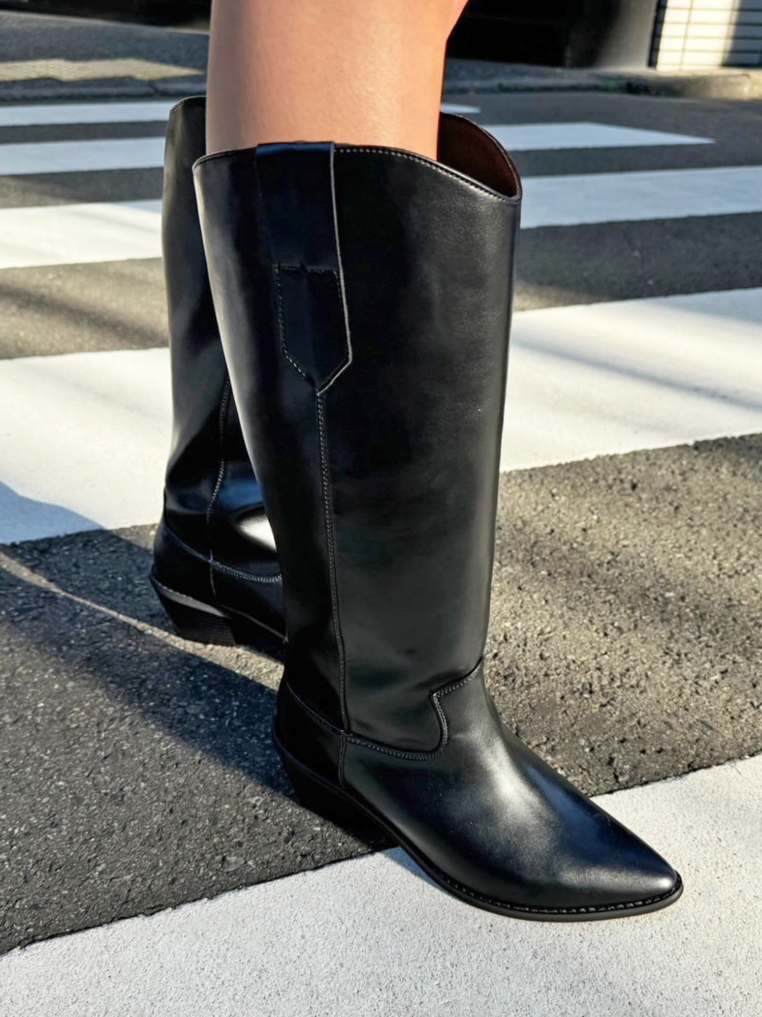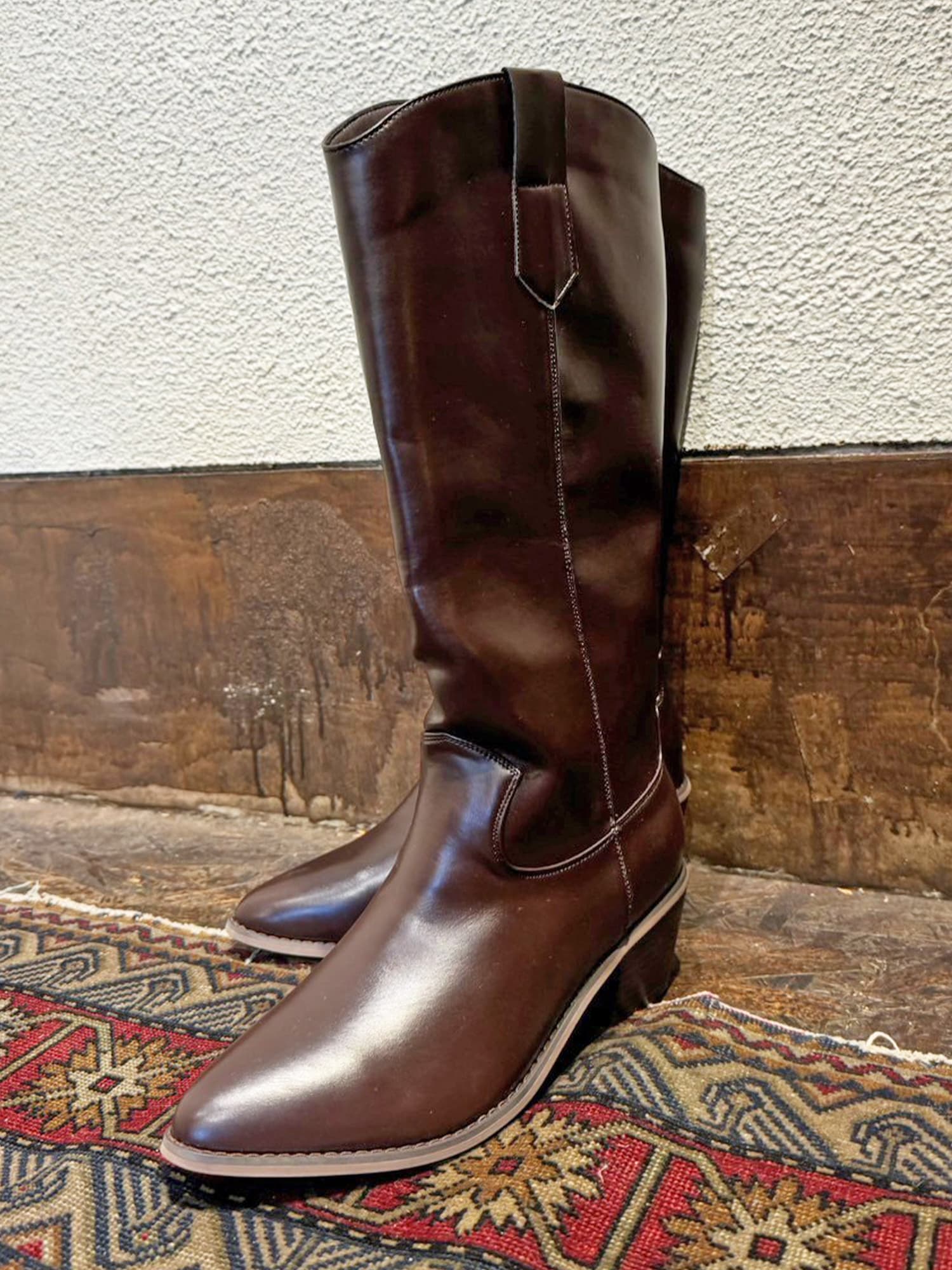 チャンキーヒールで安定感があるため長時間のお出かけでも快適にお過ごししていただけます。履き口が広めで履きやすいのと足細見えが狙えるところが嬉しいポイント。スキニーインやミニボトムスなど様々なコーデにピッタリです。先細のポインテッドトゥでウエスタン過ぎずキレイめな印象にもなる使い回し抜群なアイテム。