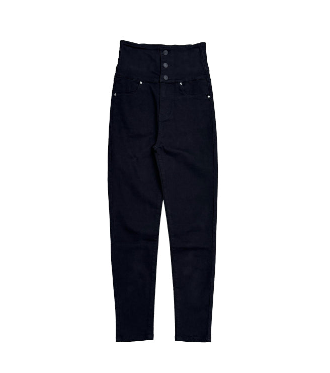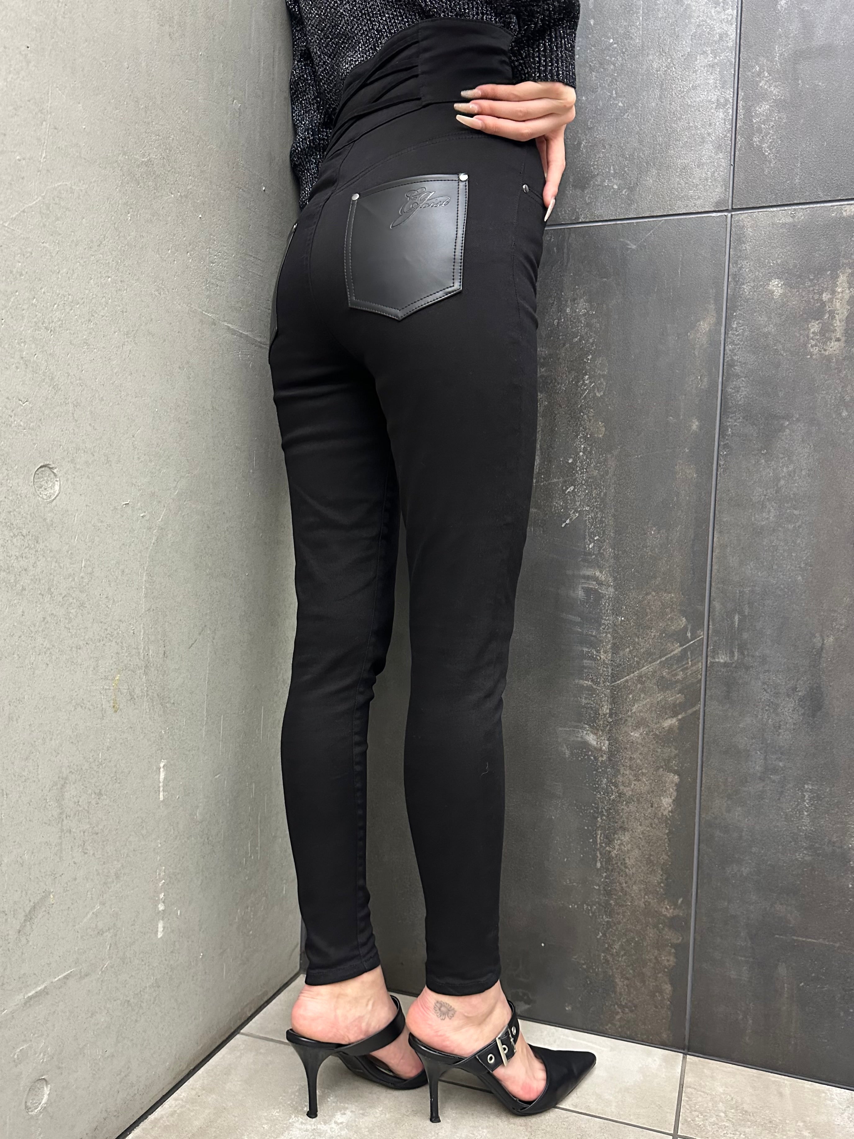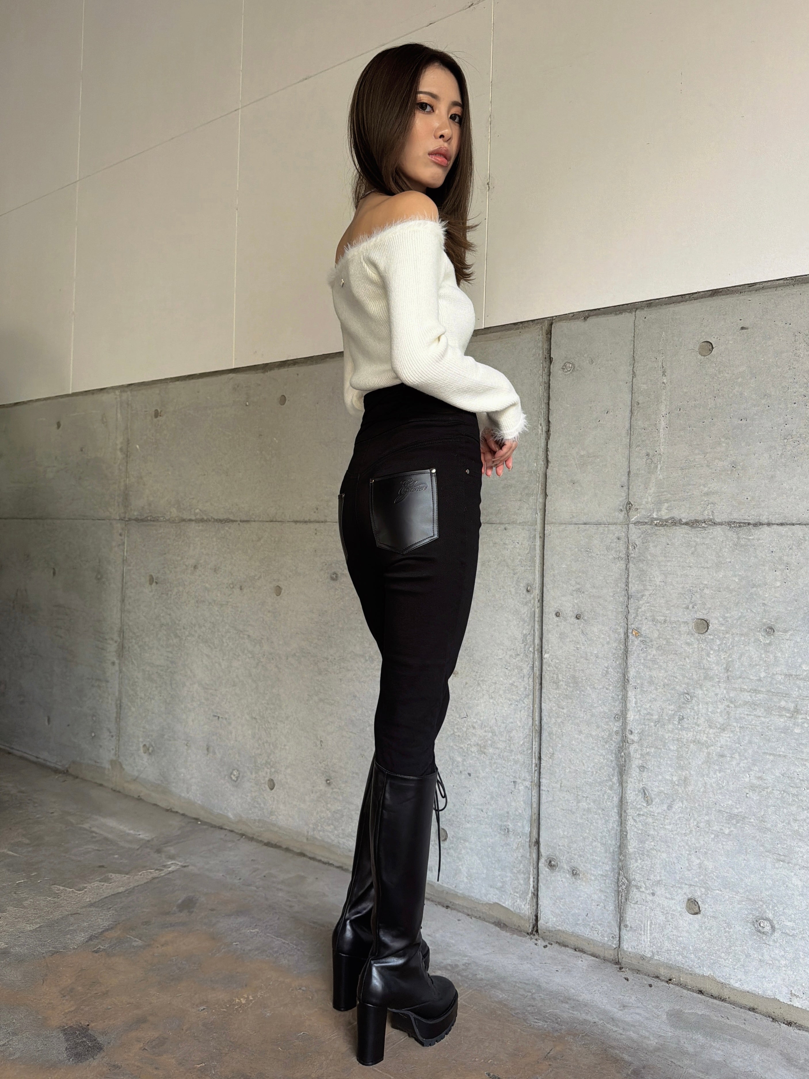 Backウエストのダブルクロスとフェイクレザーポケットがデザインポイントになっているハイウエストスキニーパンツ。フェイクレザーポケットにはオリジナルロゴを刻印し、オリジナリティ溢れる1着に仕上げました。ウエストをシェイプしたシルエットが女性らしいメリハリを演出。ヒップから裾にかけてピタっとフィットし足のラインを引き立ててくれるので、履くだけで自然とスタイルアップ効果が期待できます。細身でもポリウレタン3%配合しているので、伸縮性があり動きやすく着脱もしやすいです。引き締まってみえるBLACKカラーでクールな印象に。タイトトップスをINしてすっきりみせるスタイリングや短丈ボリュームトップスでメリハリをつけるスタイリングがオススメ。程よい厚みの生地感を選んでいるので、通年愛用していただけます。キレイめコーデでまとめたい方はピンヒールブーツやミュール合わせがオススメ。