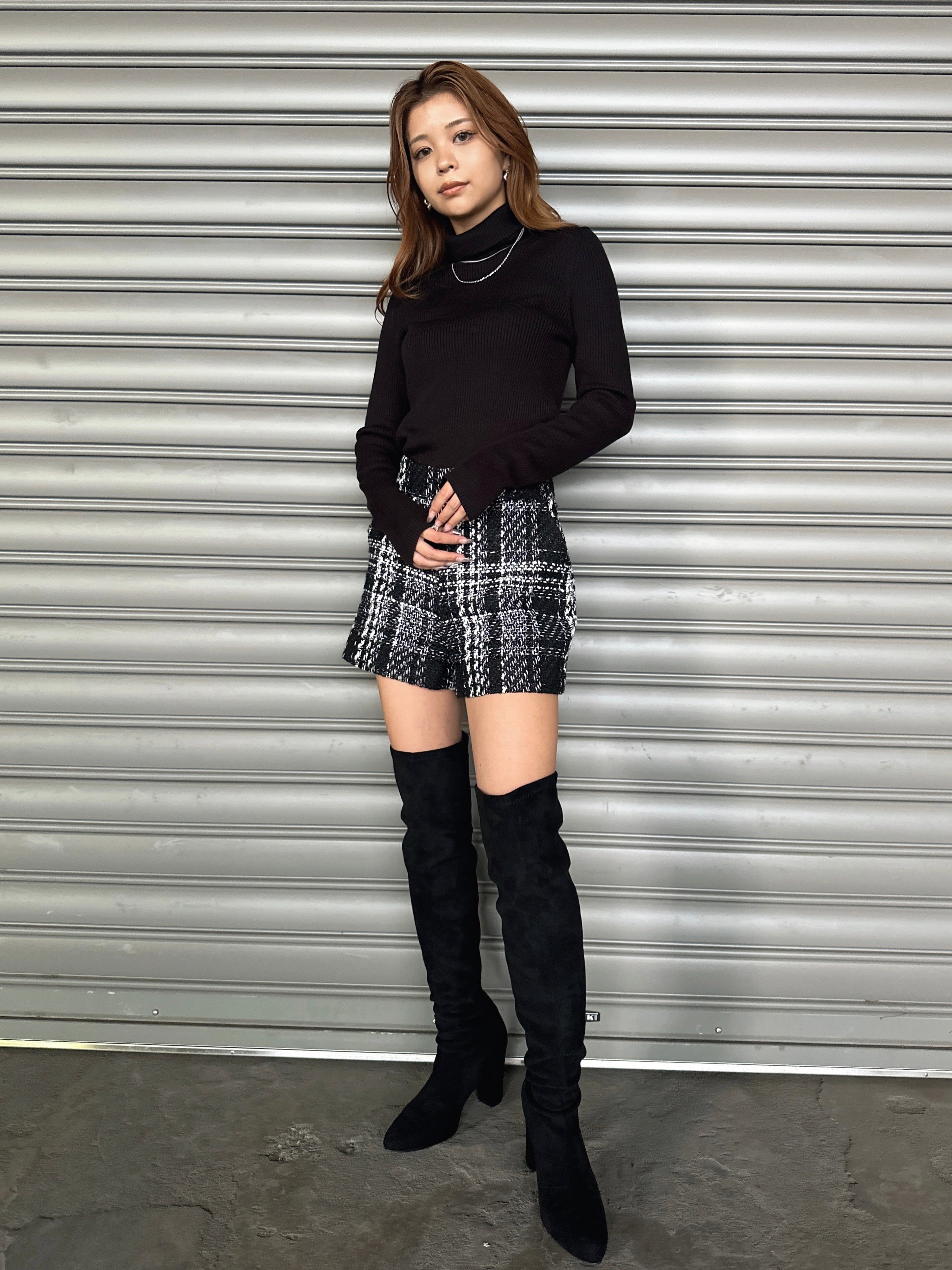 商品説明 キラッと輝くラメ入りツイードショートパンツ。表情豊かなモノトーンツイードが、上品かつ華やかな印象に仕上げてくれます。ウエスト位置が高く見えるハイウエスト設定で、脚長効果抜群。履くだけでスタイルアップを叶えてくれます。後ろウエストのみ平ゴム入りなので、窮屈感なく着用して頂けます。左脇に付けたファスナーは目立たないようにコンシールファスナーを使用し、綺麗に収まるようにこだわりました。甘くなりすぎないよう後ろにはフェイクレザーポケット(飾り)を付けパンチを効かせています。存在感のある主役級のショートパンツは、シンプルなトップス合わせでもコーデが極まります。タイトなトップスをINしてすっきり見せるスタイリングや、短丈ボリュームトップス合わせでメリハリを付けるのがオススメ。足元はニーハイブーツがマスト。裏地付きなので、肌に触れる部分もチクチク感なく履きやすいです。