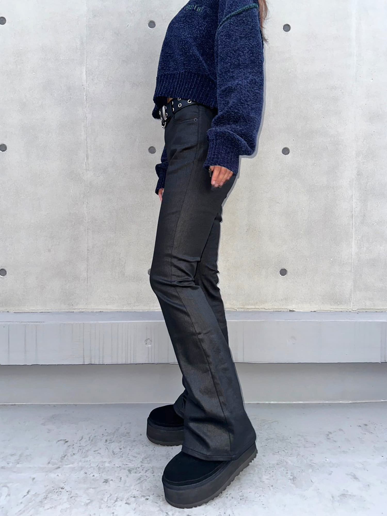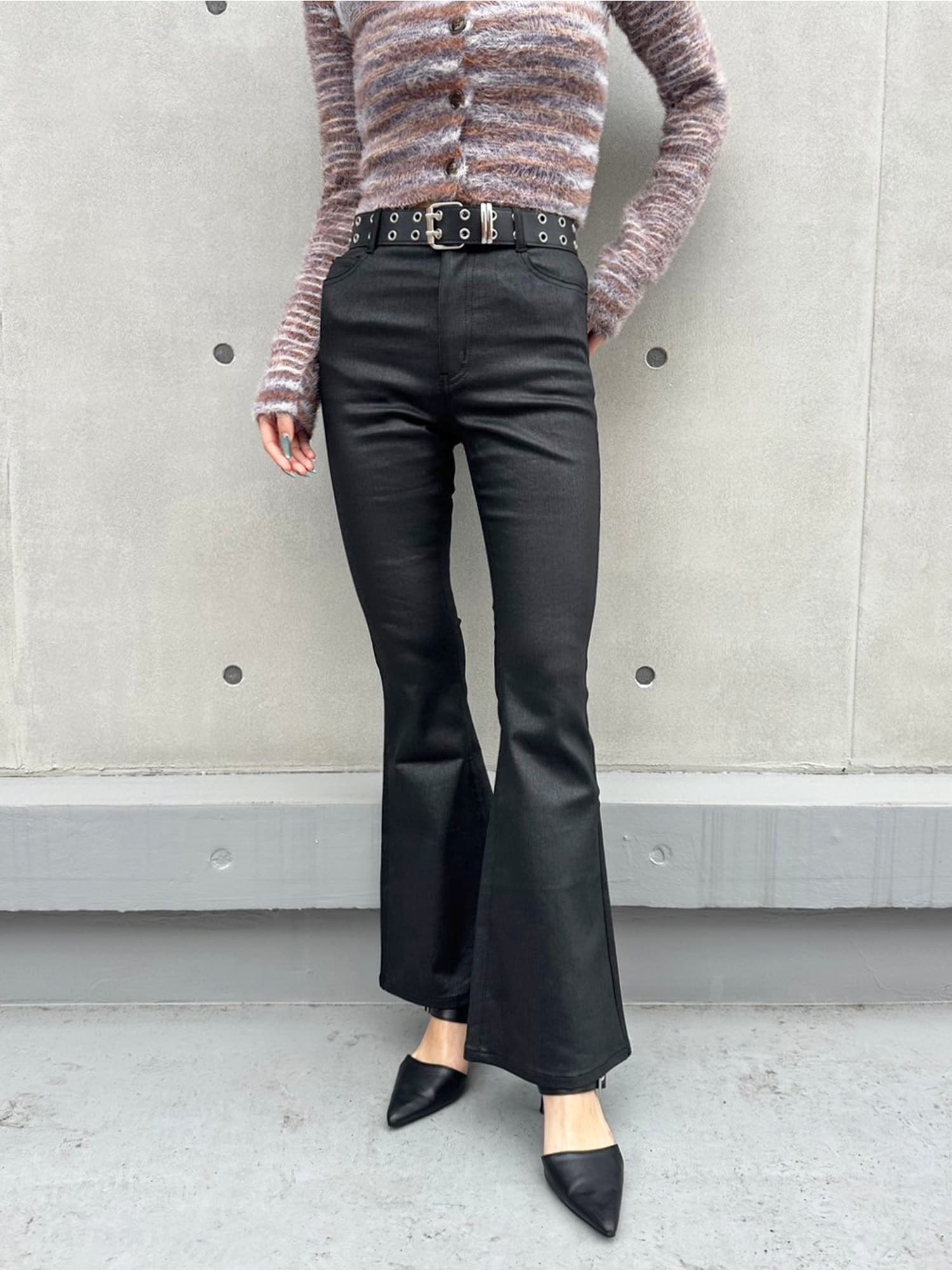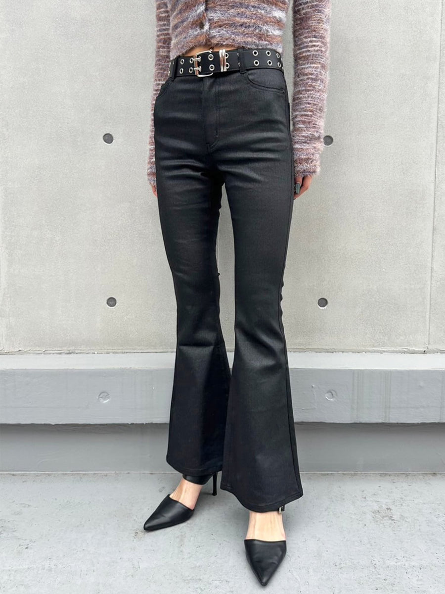 - レザーコーティングフレアパンツ
