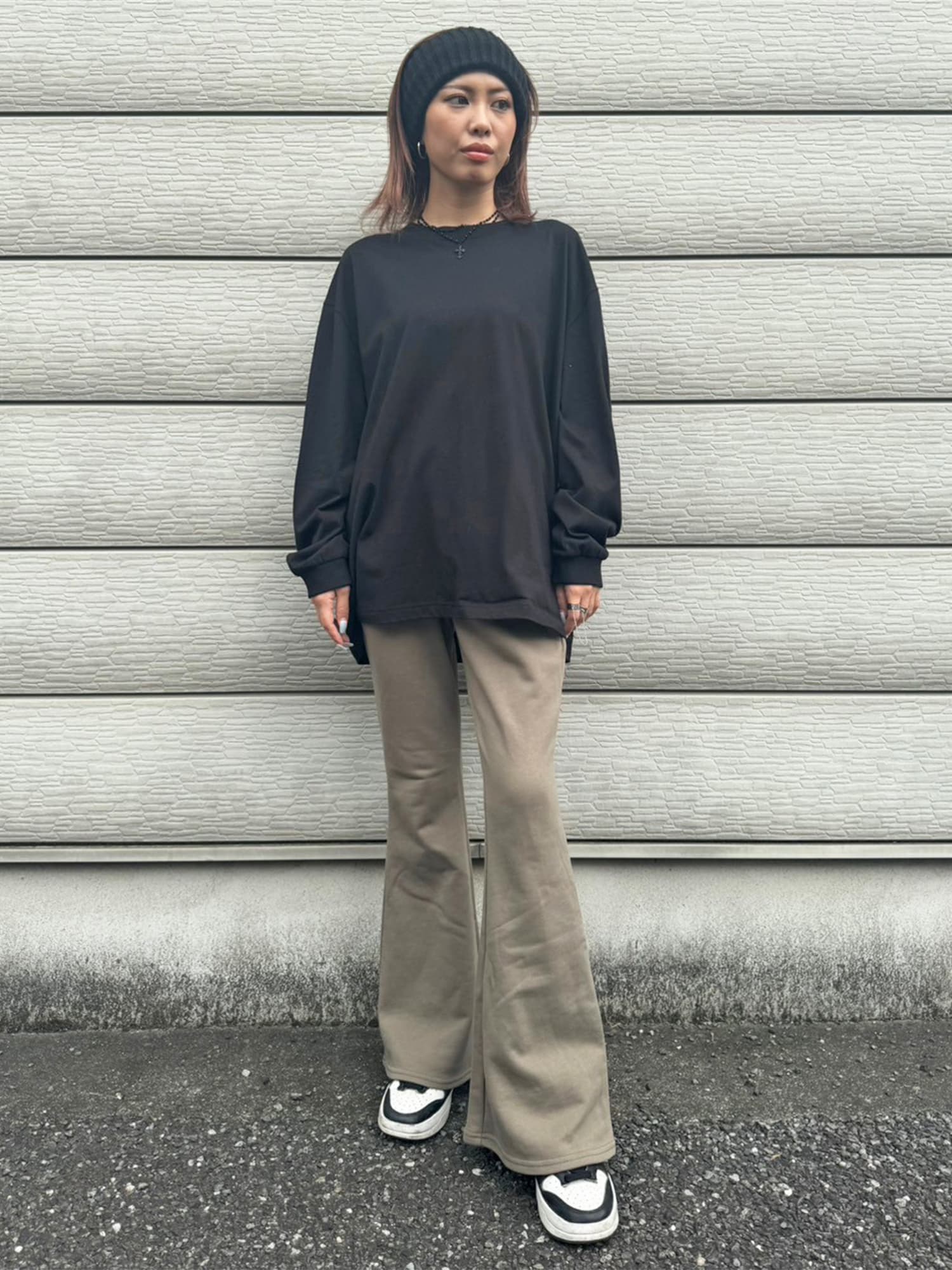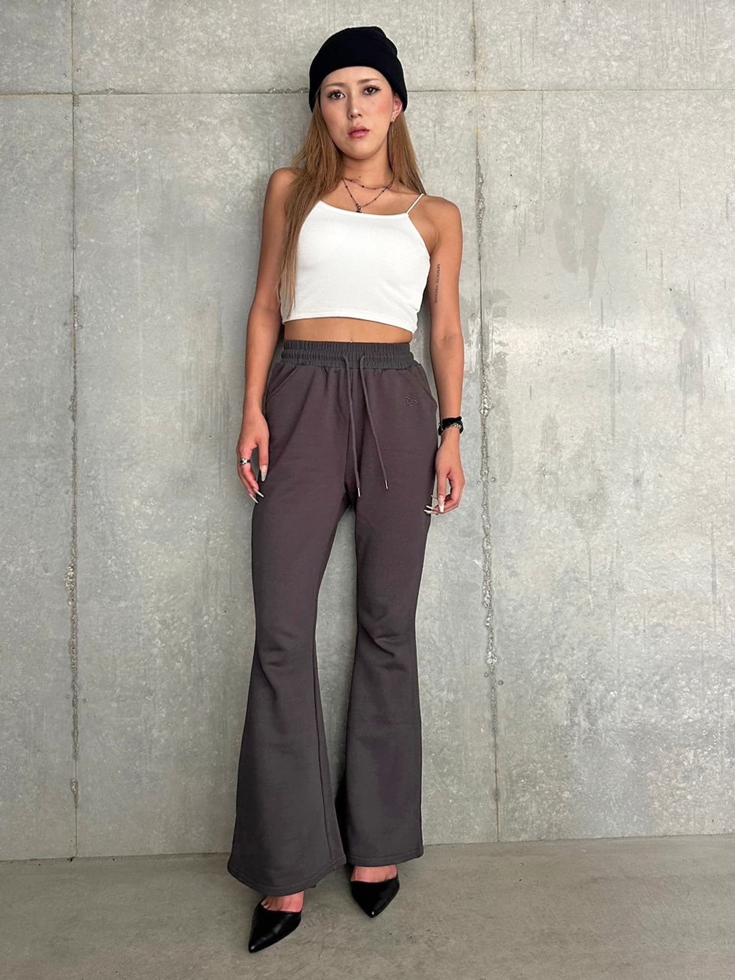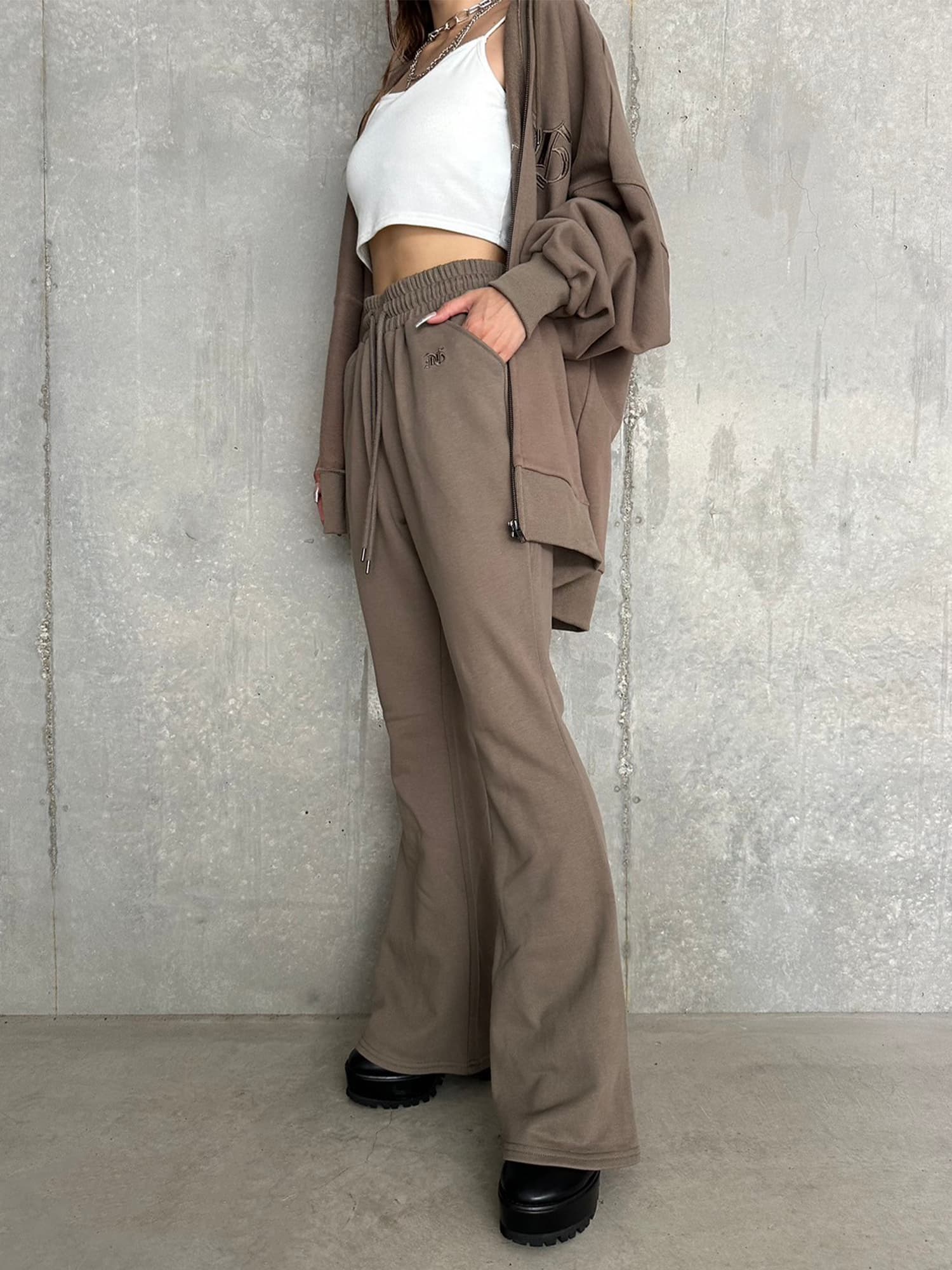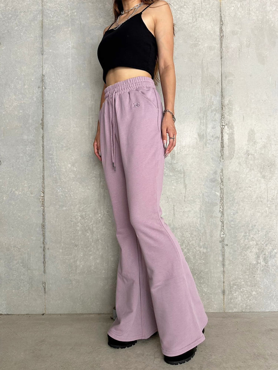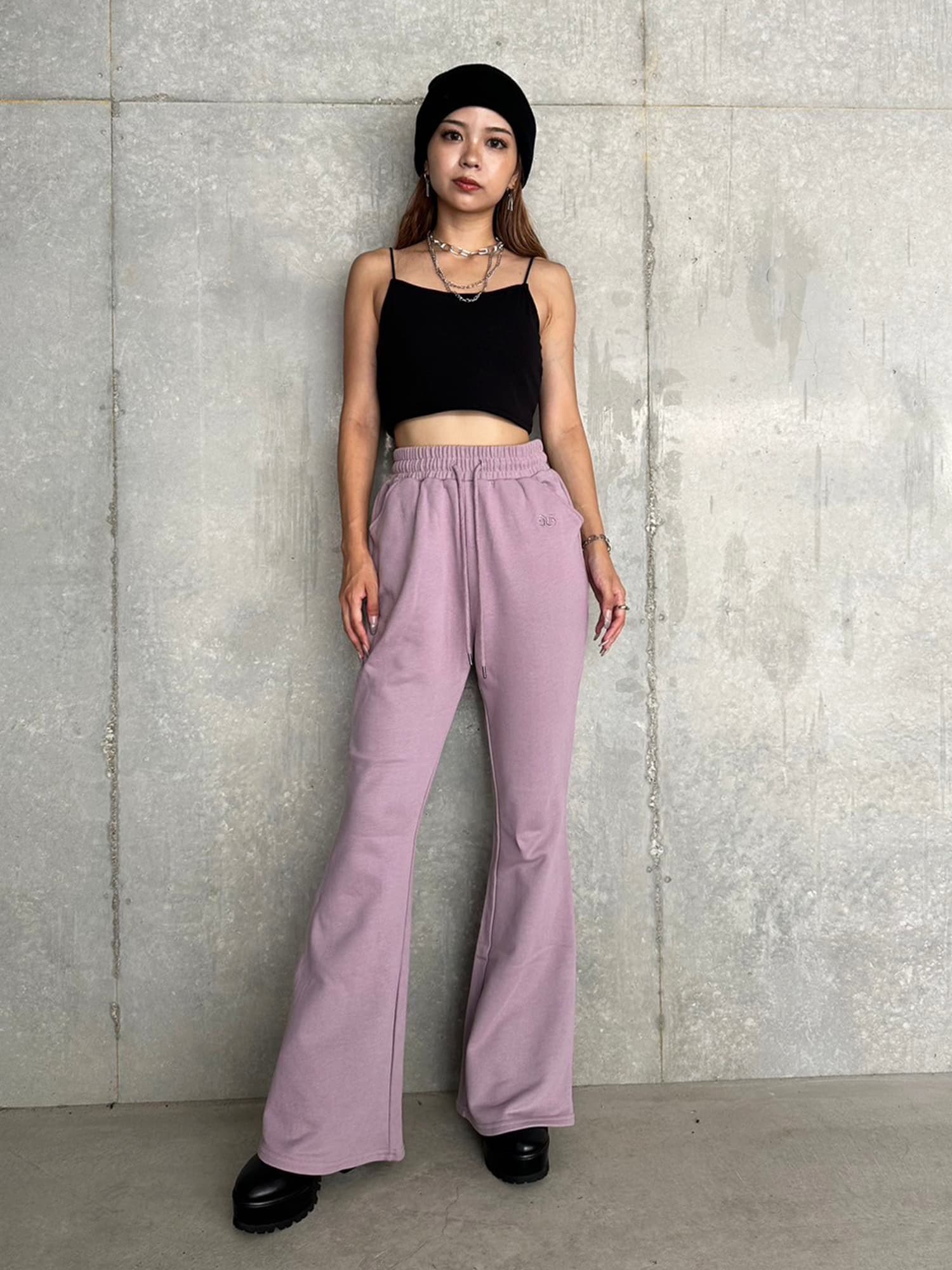 商品説明 ウエストゴムで着脱楽チンなフレアパンツはくびれシルエットでメリハリをつけ美脚効果抜群。左の太ももにはオリジナルのロゴ刺繍をいれていますが同色なので目立ちすぎずデイリー使いしやすいです。加工風の裏毛生地を選んでいるのでくすみカラーがヴィンテージ感あり、今季AWテーマの一つでもあるグランジ要素を取り入れたファッションにぴったりなアイテムとなっています。