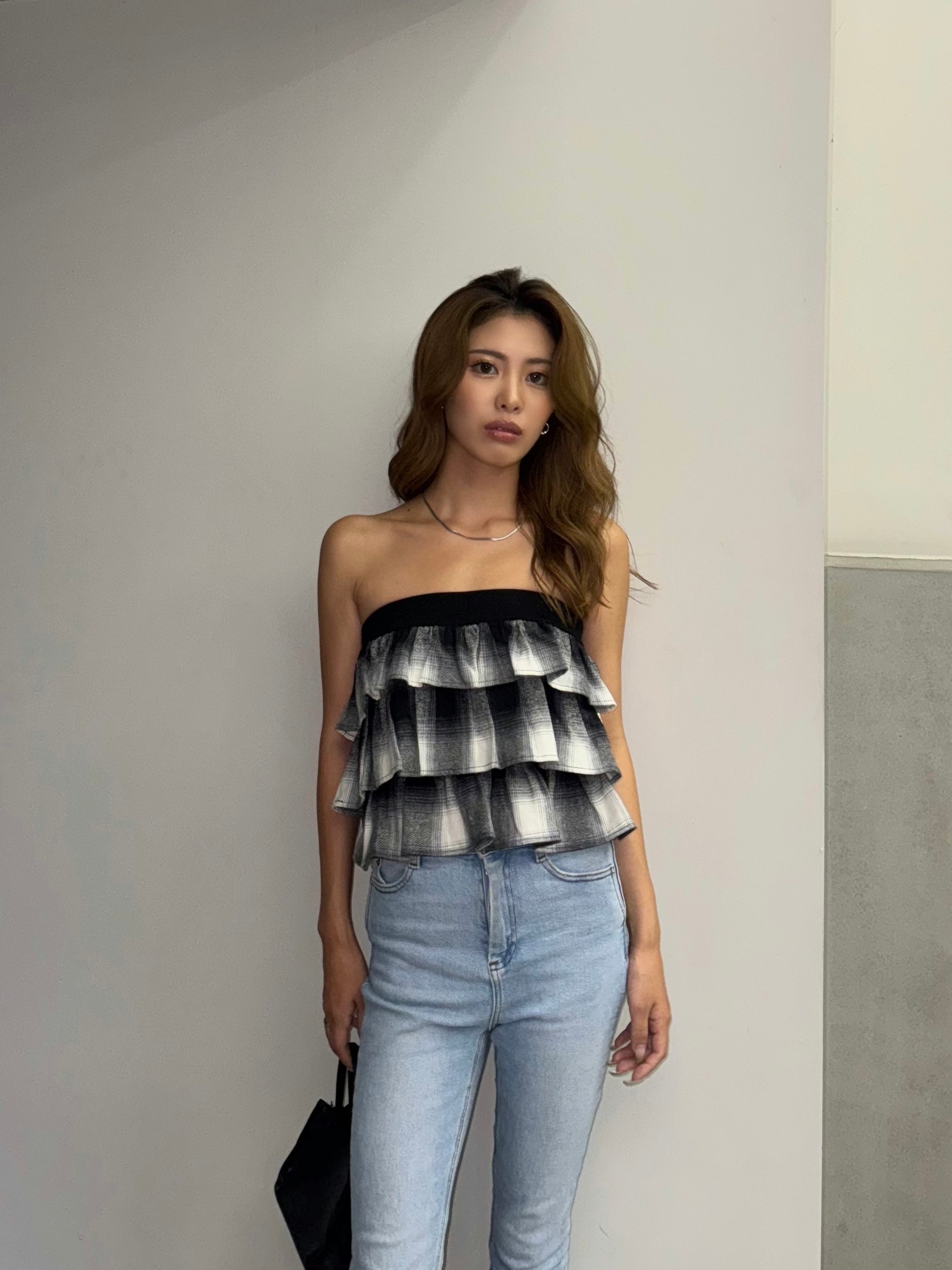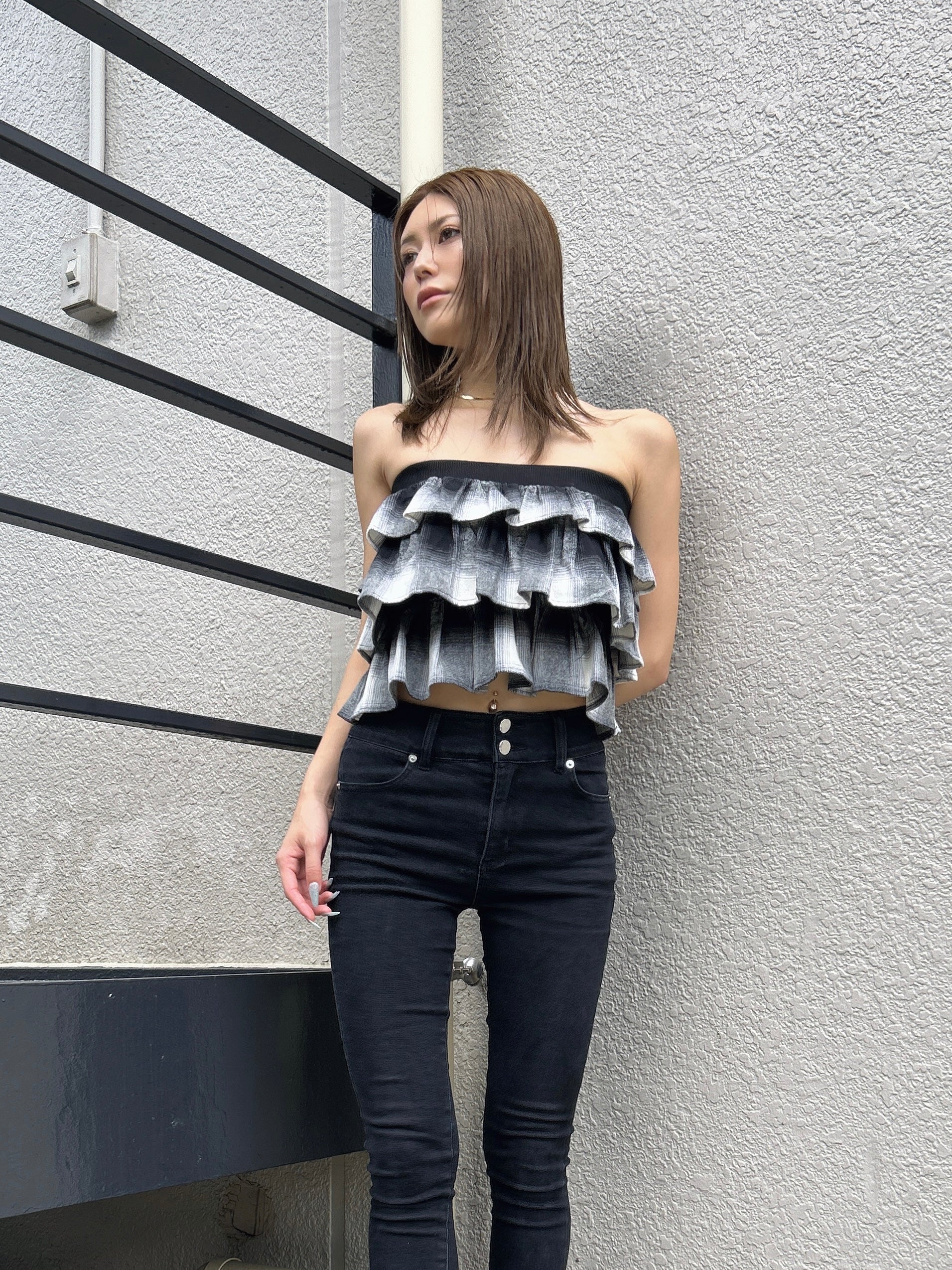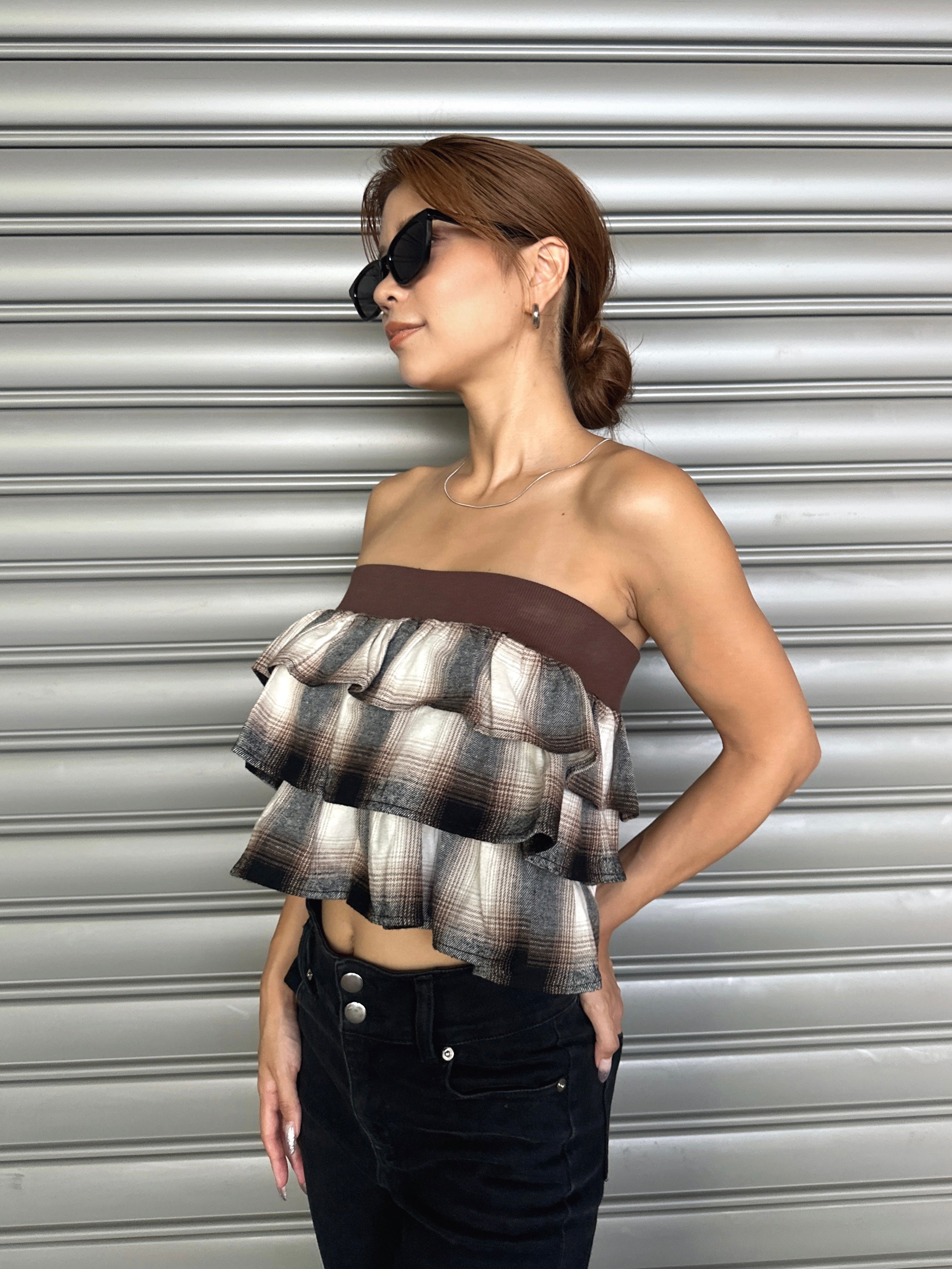 商品説明 三段チェック柄フリルが目を惹くベアトップス。