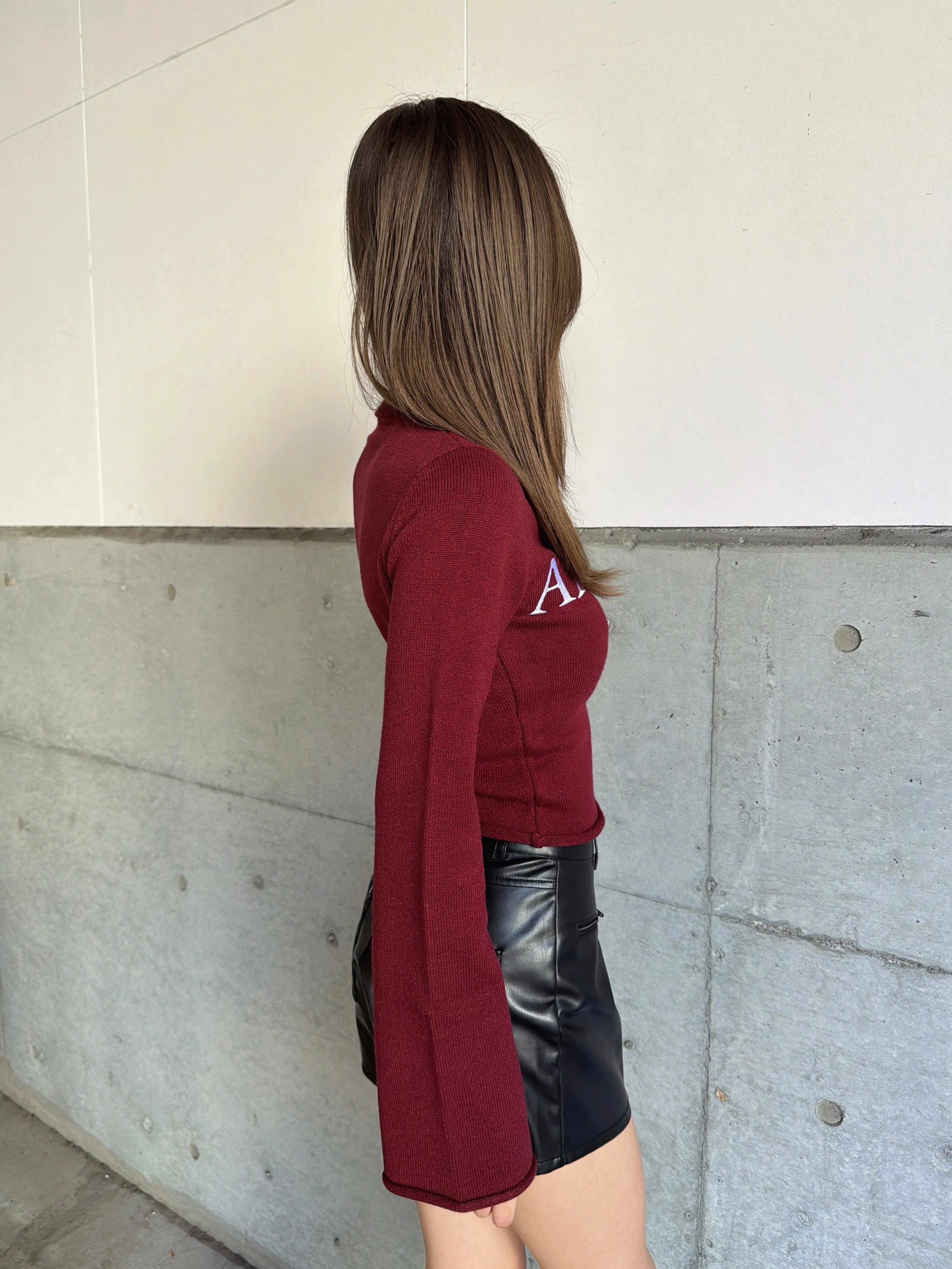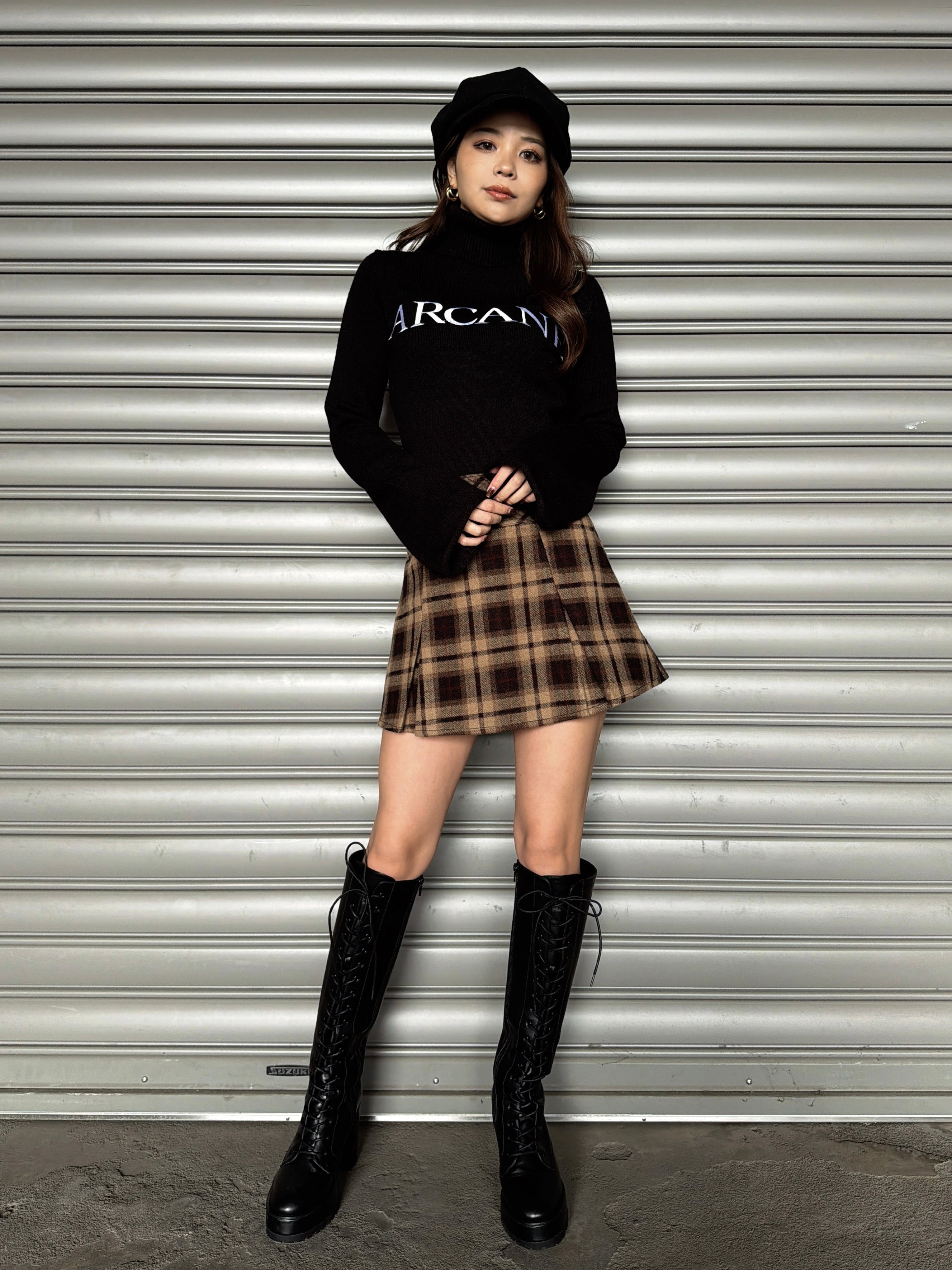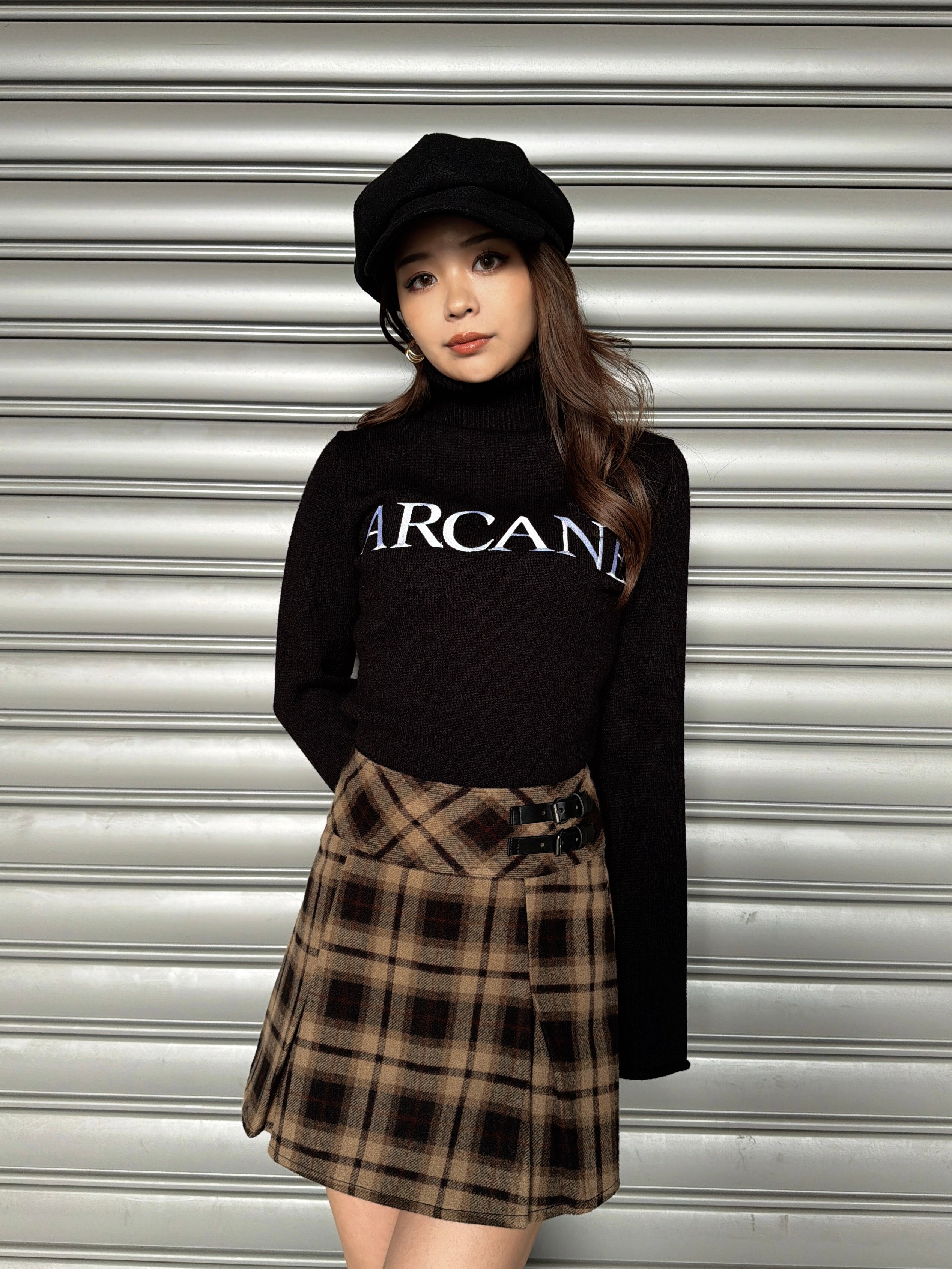 もちっと柔らかくフィット感のある糸を使用した、ショート丈タートルネックニットトップス。フロントには【ARCANE】(アーケイン:秘密の/神秘的な) という意味を持つロゴ刺繍を施しています。ロゴのフォントは大人っぽさを意識して、華奢で綺麗めな明朝体を選んでいます。袖口に向かって徐々に広がるフレアスリーブが女性らしいシルエットを演出。ボディ部分はストレッチ性のある天竺編みで、タートル部分はリブ編みにすることで首元の圧迫感を軽減し、着脱もしやすい仕様にしました。程よい厚みのある生地感はインナー使いにも最適。ジャスト丈なので、フルレングスからミニボトムまで幅広いボトムと相性抜群です。着回しができるので一枚は持っていたい万能アイテムです。
