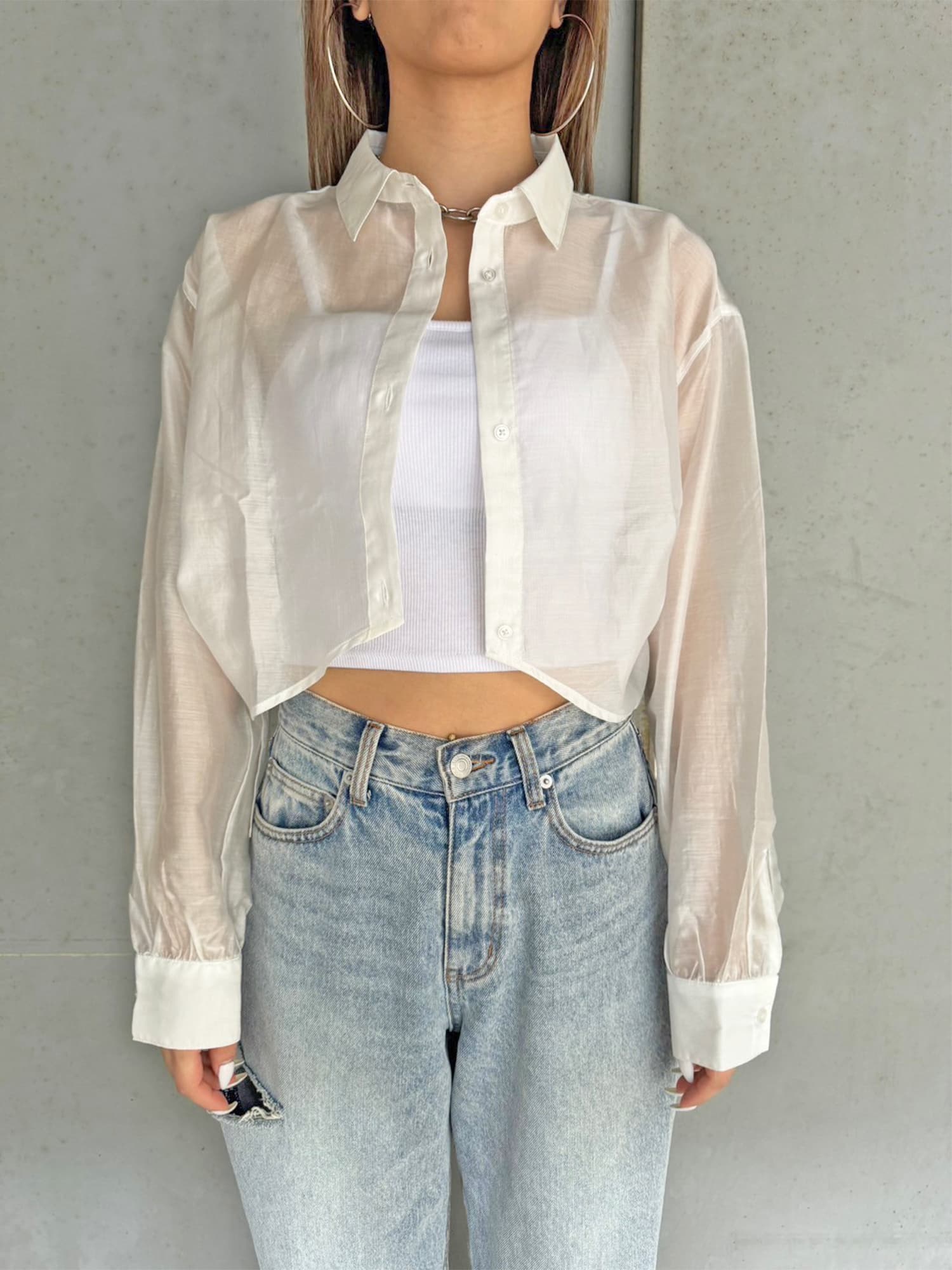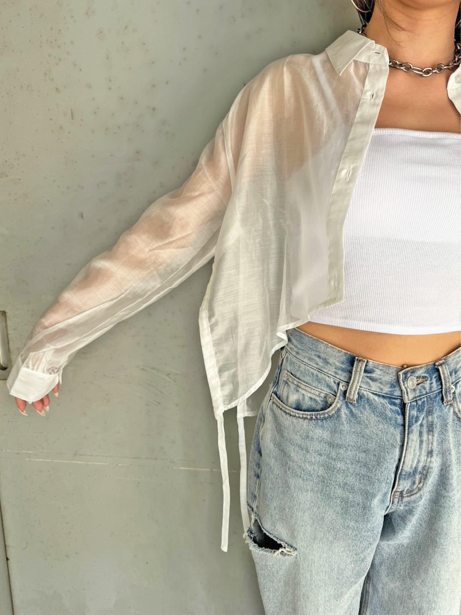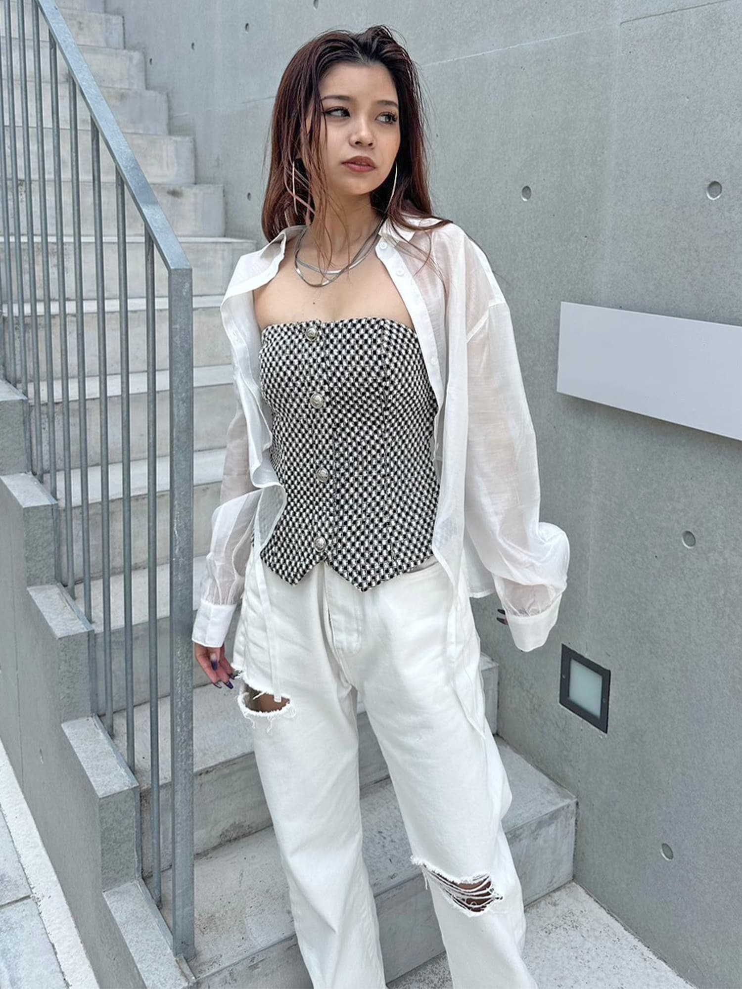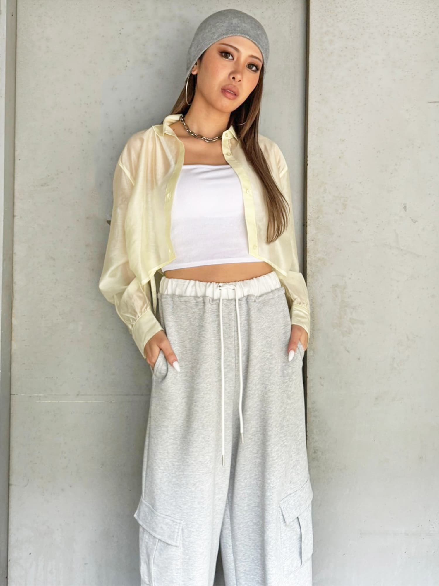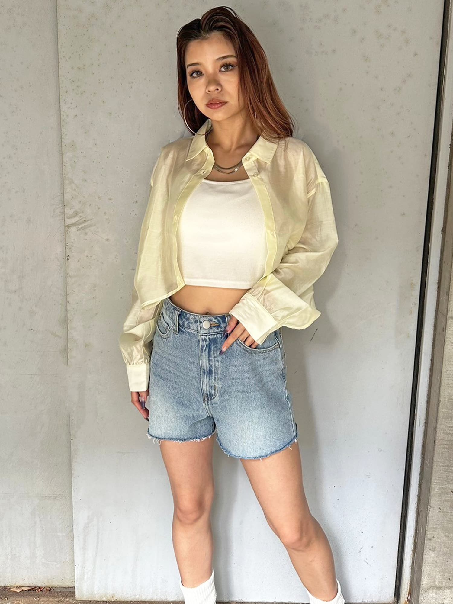 脇の下から裾に向かってスリットとスピンドルを入れたデザインシャツは好きなようにアレンジができ、オリジナリティを楽しめるアイテム。スリットのままの状態や絞って方結びにしたりとあえてリボン結びにせず、モードに着こなすのもおススメです。また透け感を利用して見せるインナー合わせがマスト。この時期羽織りとしても着用できるショート丈は素材も軽く持ち運びにも便利なため様々なシーンでお使いいただけます。