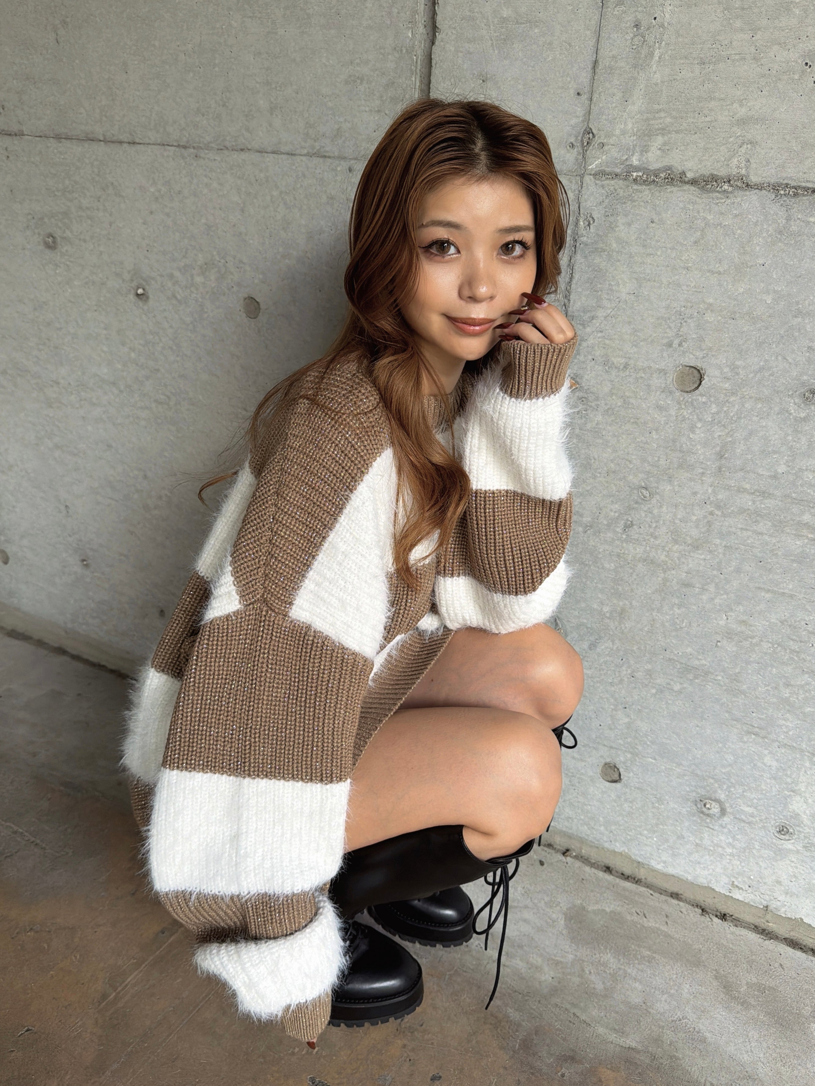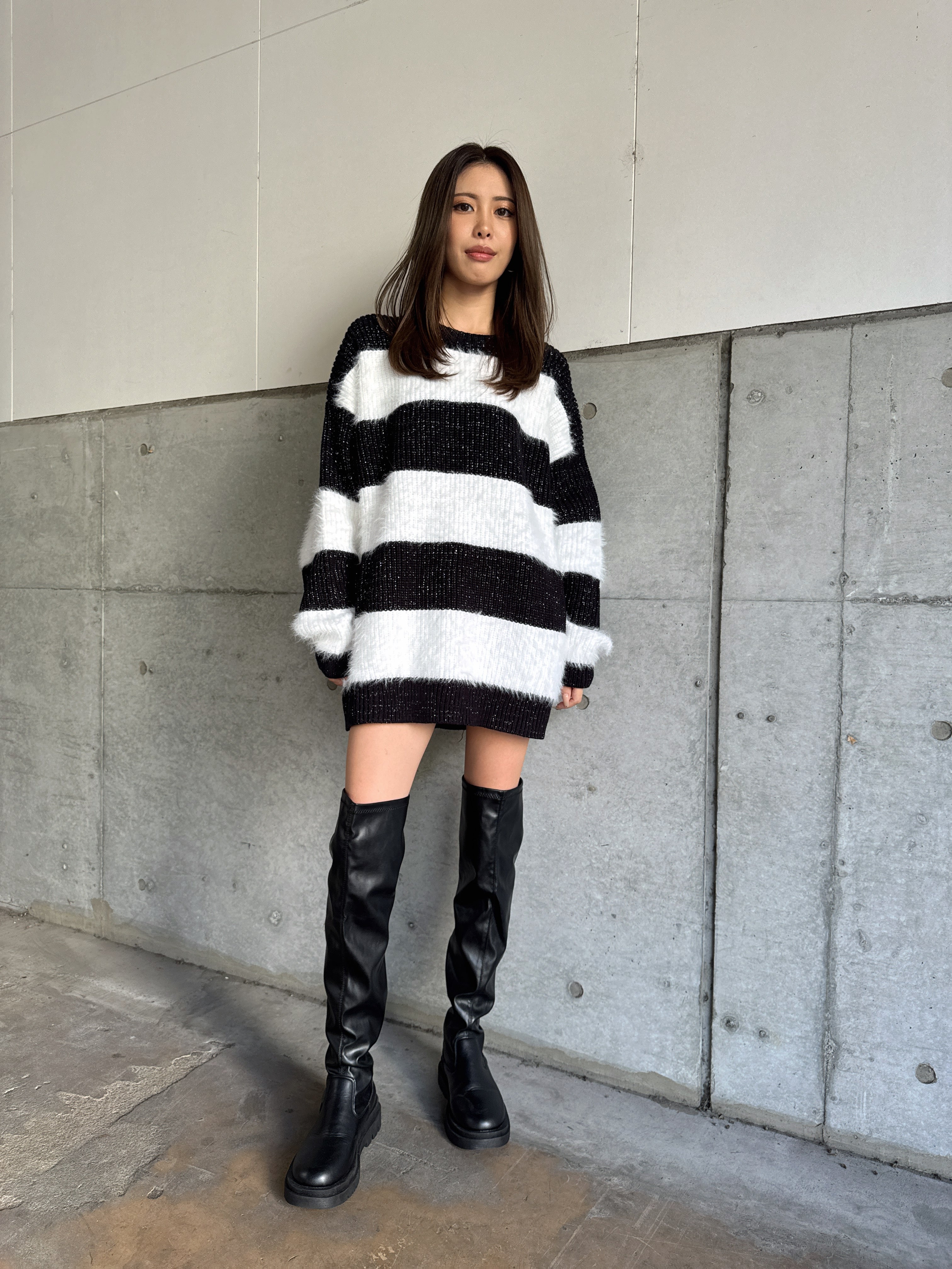 ふわっと柔らかいシャギーときらびやかなアクリルラメニットを使用したボーダーニットップス。太めのピッチボーダーが目を惹き、コーディネートに存在感のあるアクセントをプラスします。袖口にたまるスリーブが着るだけで女性らしい柔らかな印象を演出。ゆったりとしたシルエットが体を優しく包み込み、気負わずにトレンド感を楽しめる一枚です。程よく開いたラウンドネックが、顔回りをすっきりとさせてくれます。着丈はヒップ隠れる長さに設定しているので、ミニボトムとロングブーツを合わせた王道コーデがオススメです。