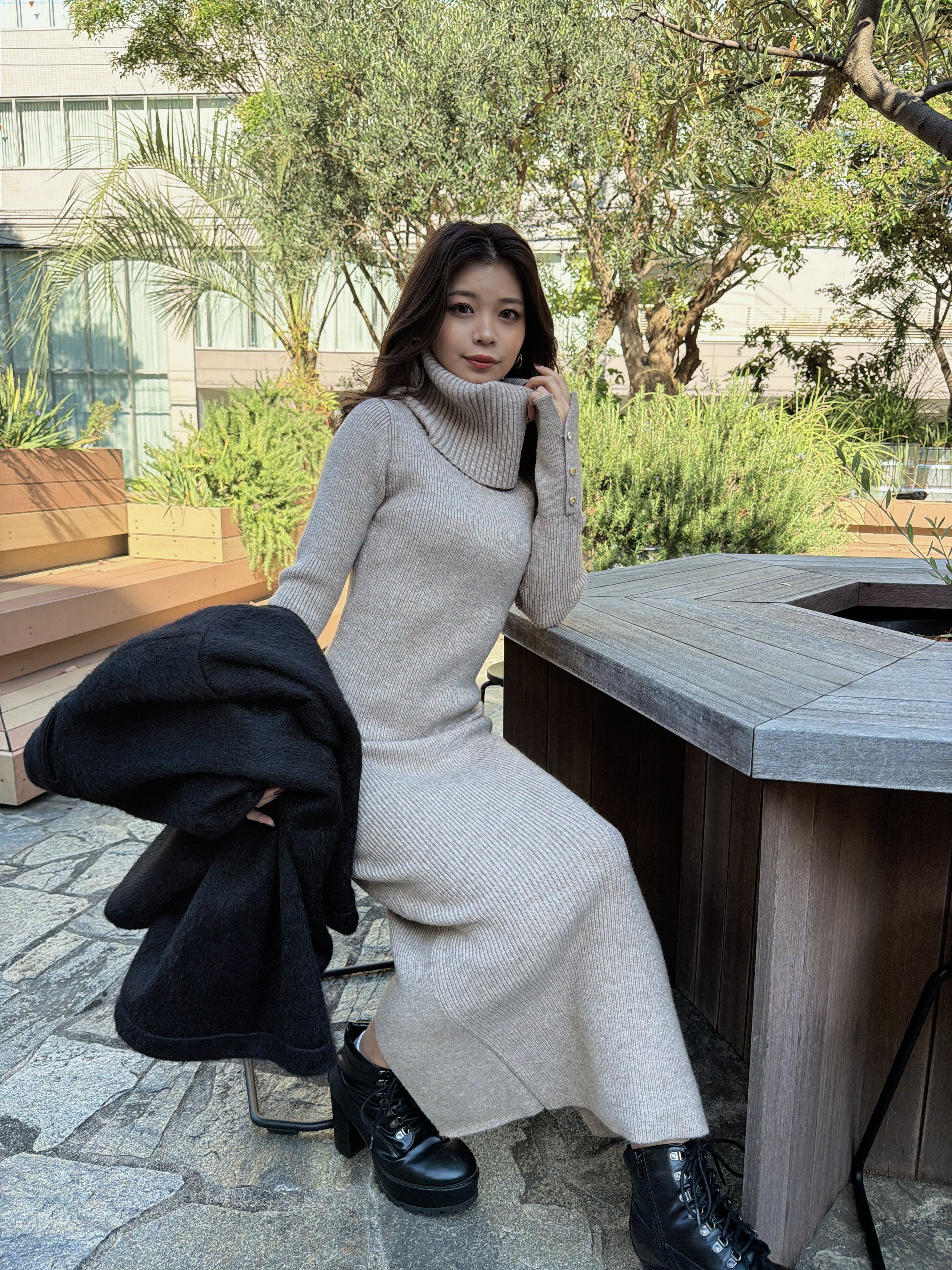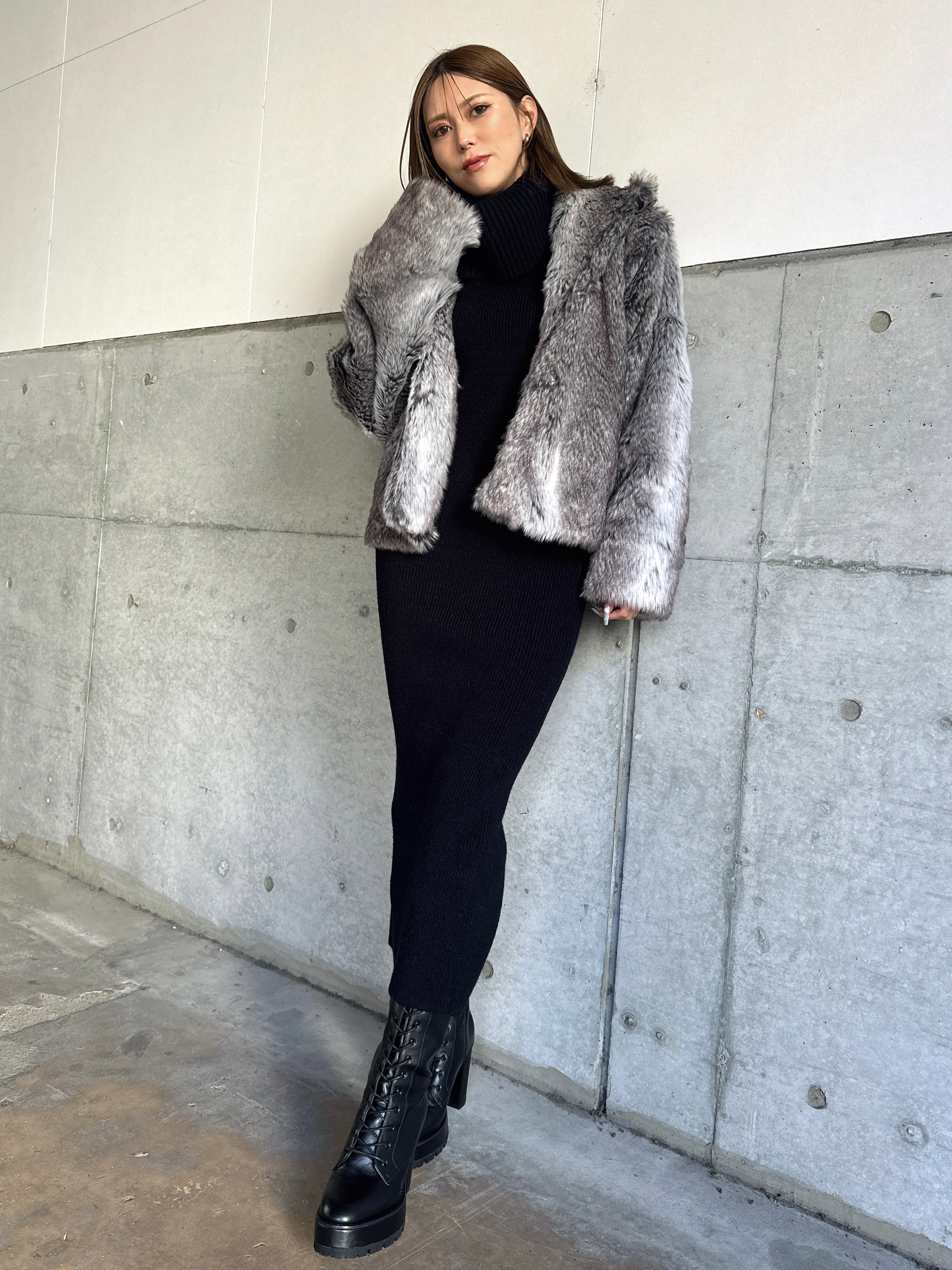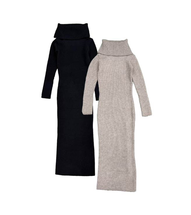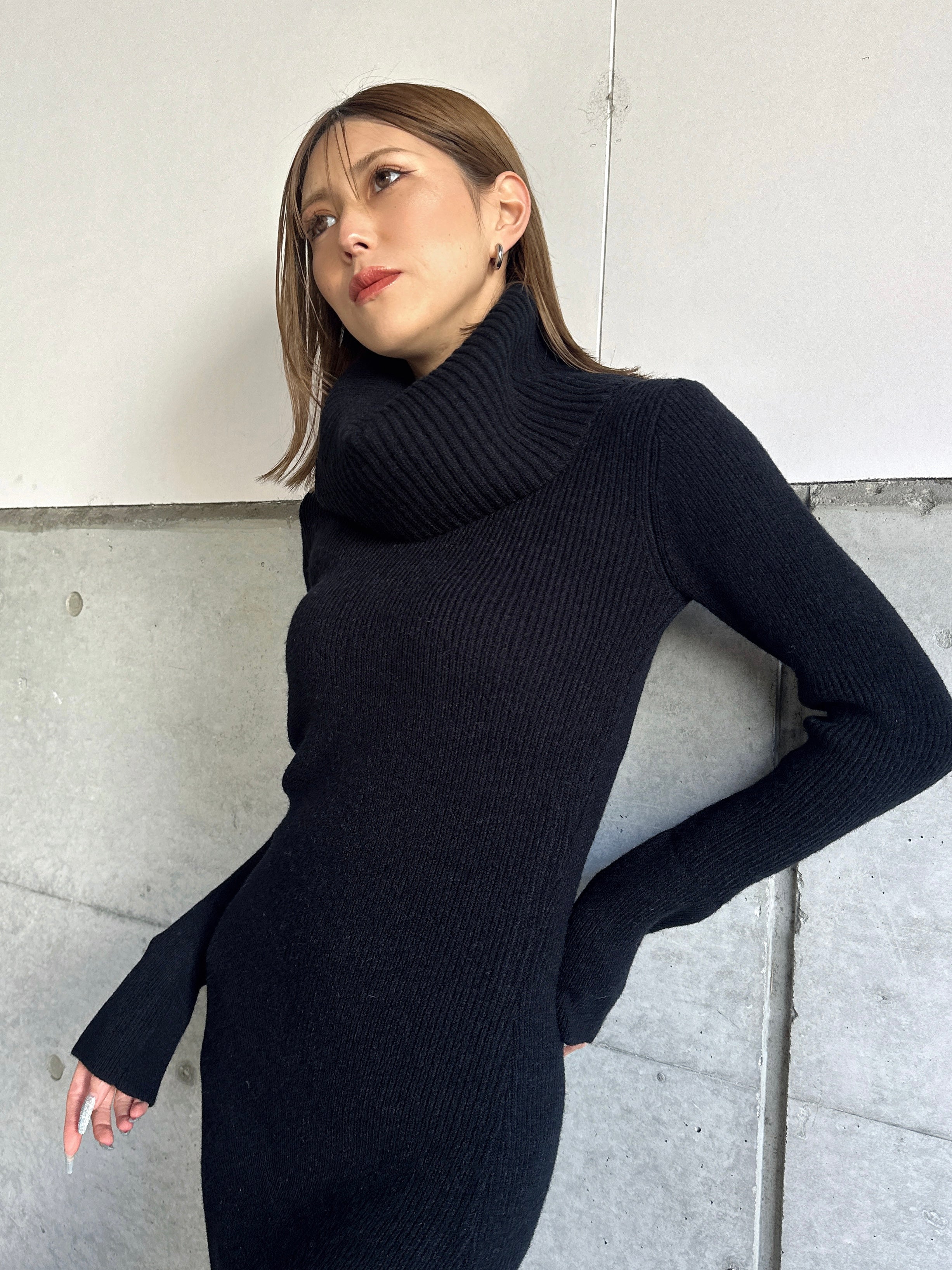 オフショルダーとしてもオフタートルとしても着用できる2WAY仕様のニットワンピース。シーンやアウターに合わせてアレンジ可能なのが嬉しいポイント。スリットを入れた袖口には艶ありSILVERの釦を施し、手首まで美しく見えるようにデザインしました。程よい厚みのある生地感なので暖かみがあります。伸縮性抜群なのでストレスフリーな着心地を叶えつつ、深めのバックスリットを入れることで動きやすさと抜け感をプラス。オフショルダーで着用すればデコルテを綺麗に魅せることができ、アクセサリーを合わせれば顔回りも華やかに。足元はロングブーツでスタイリッシュに。ミュールやヒールで女性らしく仕上げるのもオススメです。