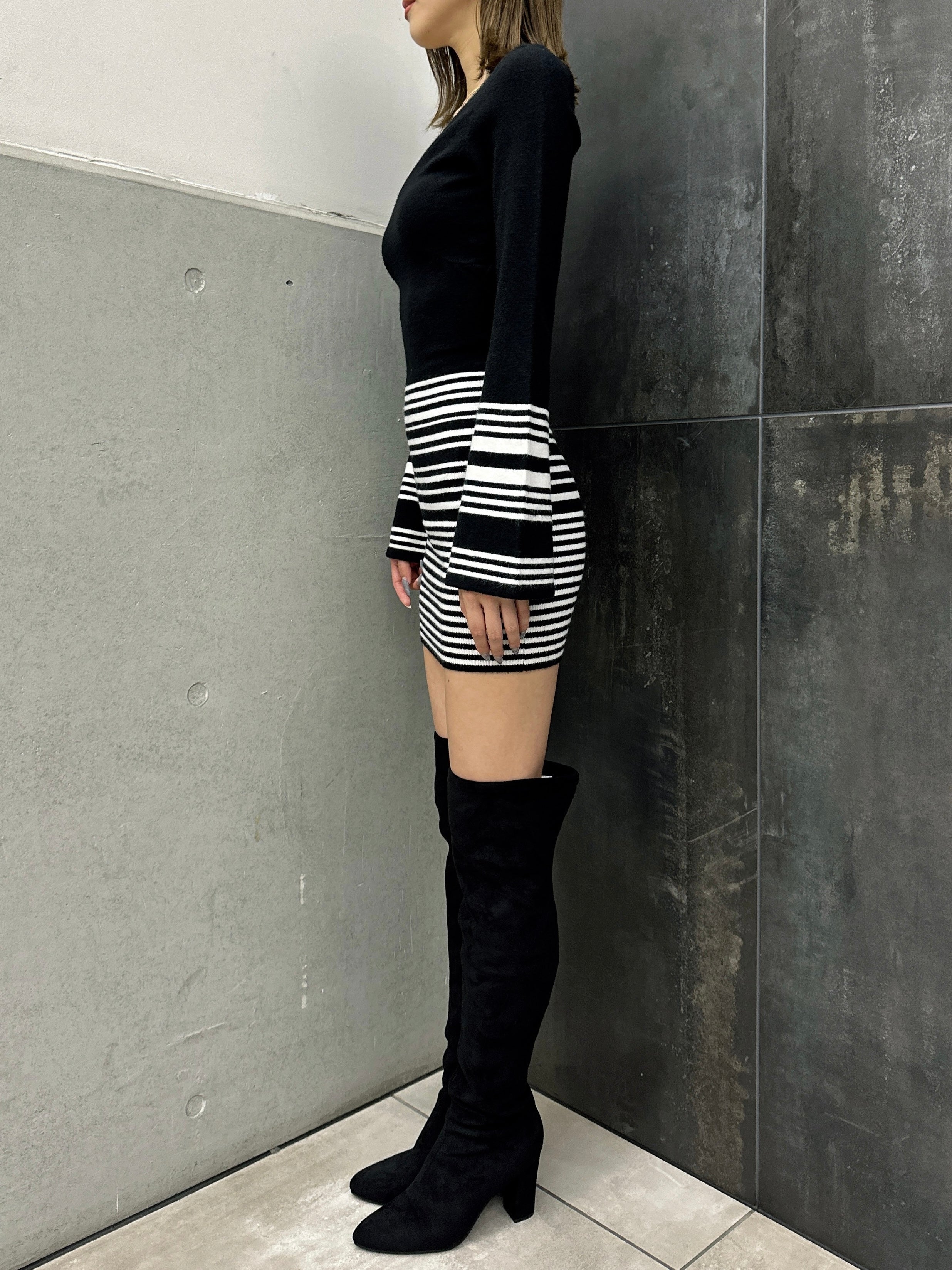 商品説明 EGOIST27周年を記念し、2003年~2008年のSEXY&GLAMAOROUS時代のHIT商品を復刻版として再現しました。思わず引き込まれる深Vネックで視線クギづけのニットミニワンピース。気になるウエスト~ヒップラインは細めボーダーでカモフラージュ。セクシーさを引き立てるピタっとタイトな身頃に対し、袖は袖口フレアにしてメリハリを付けました。ボディラインを引き締めてくれるよう、キックバックが強めな糸を選んでいるのでスタイルアップ効果も抜群。ショートブーツやニーハイブーツで脚の露出度をお好みで調整すれば雰囲気もガラッと変わります。コートを脱いだ時の上品な色気が群を抜くタイトミニワンピースは男女問わず魅了すること間違いなし。モノトーンベースなのでカラーもののBAGを合わせてアクセントを効かせるのも◎
