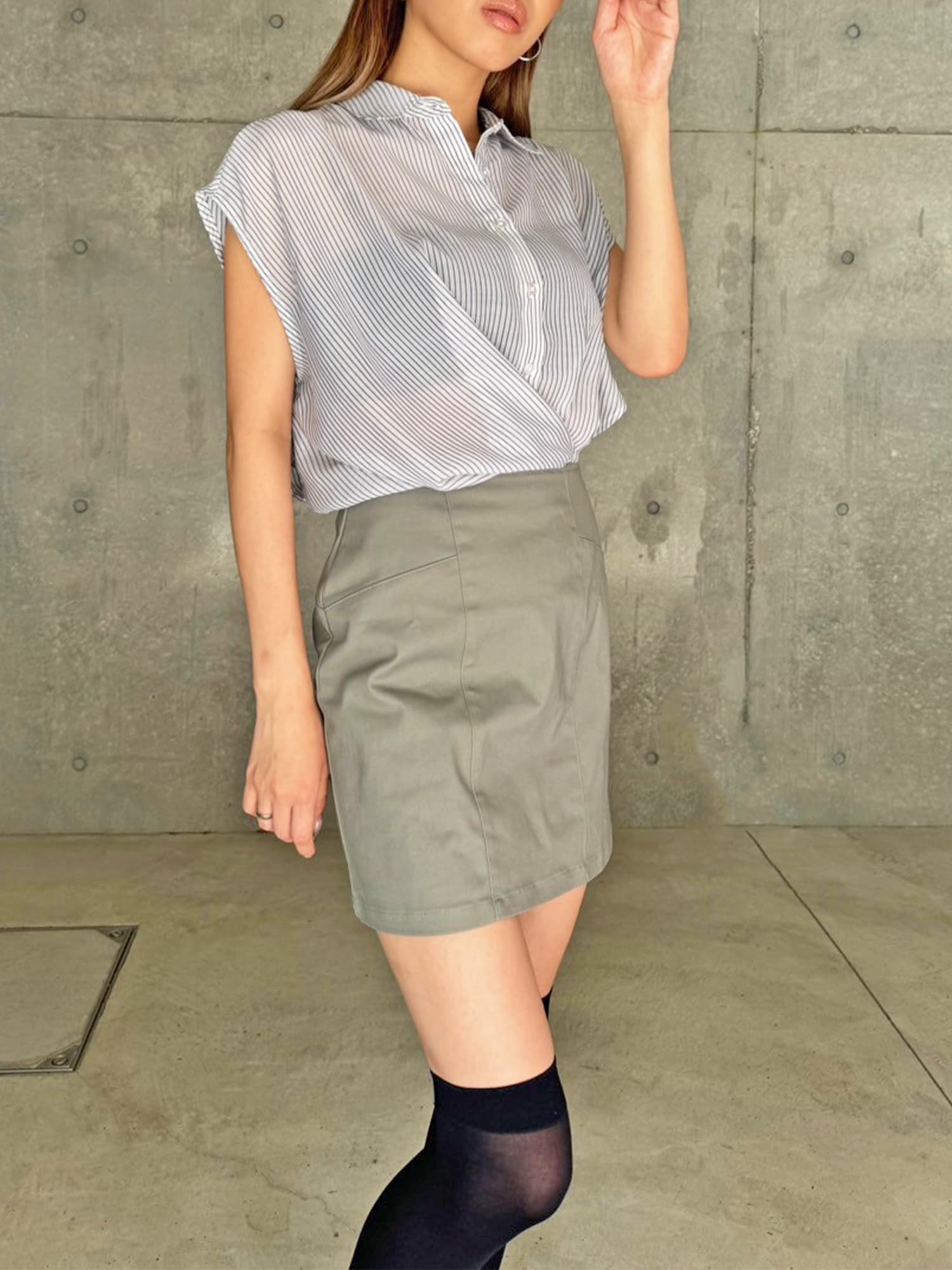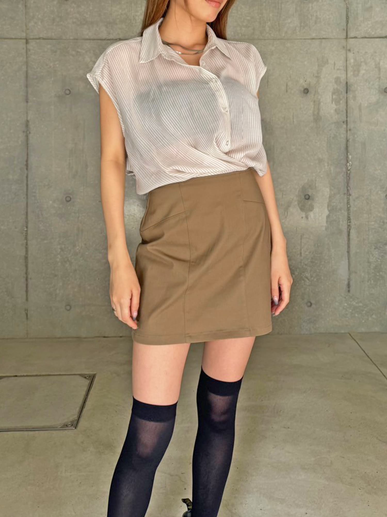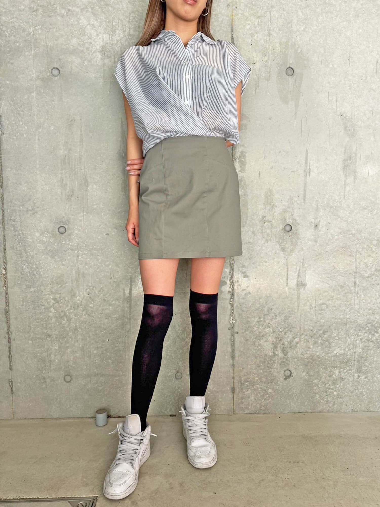 シャツの前裾をクロスさせたデザインで、前身頃部分のみスカートと繋がっています。シャツは軽くこの時期にぴったりな生地感で、ブラウジングさせているように見えるデザインなため程よいゆとりがあります。シャツの後ろは裾をINでもOUTでもお好みでアレンジしていただけるようにしました。スニーカーやサンダル+ソックス合わせでカジュアルなコーデもおススメ。小物次第で雰囲気を変えられるアイテムです。スカートのBackにファスナーが付いているので着脱は簡単です。