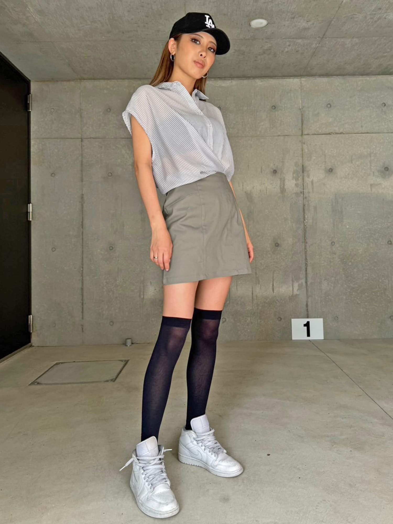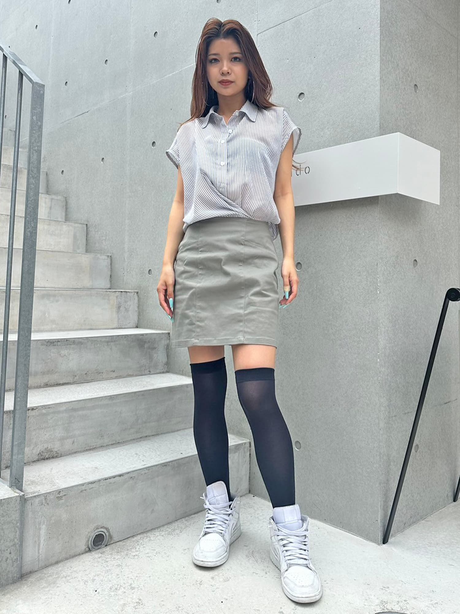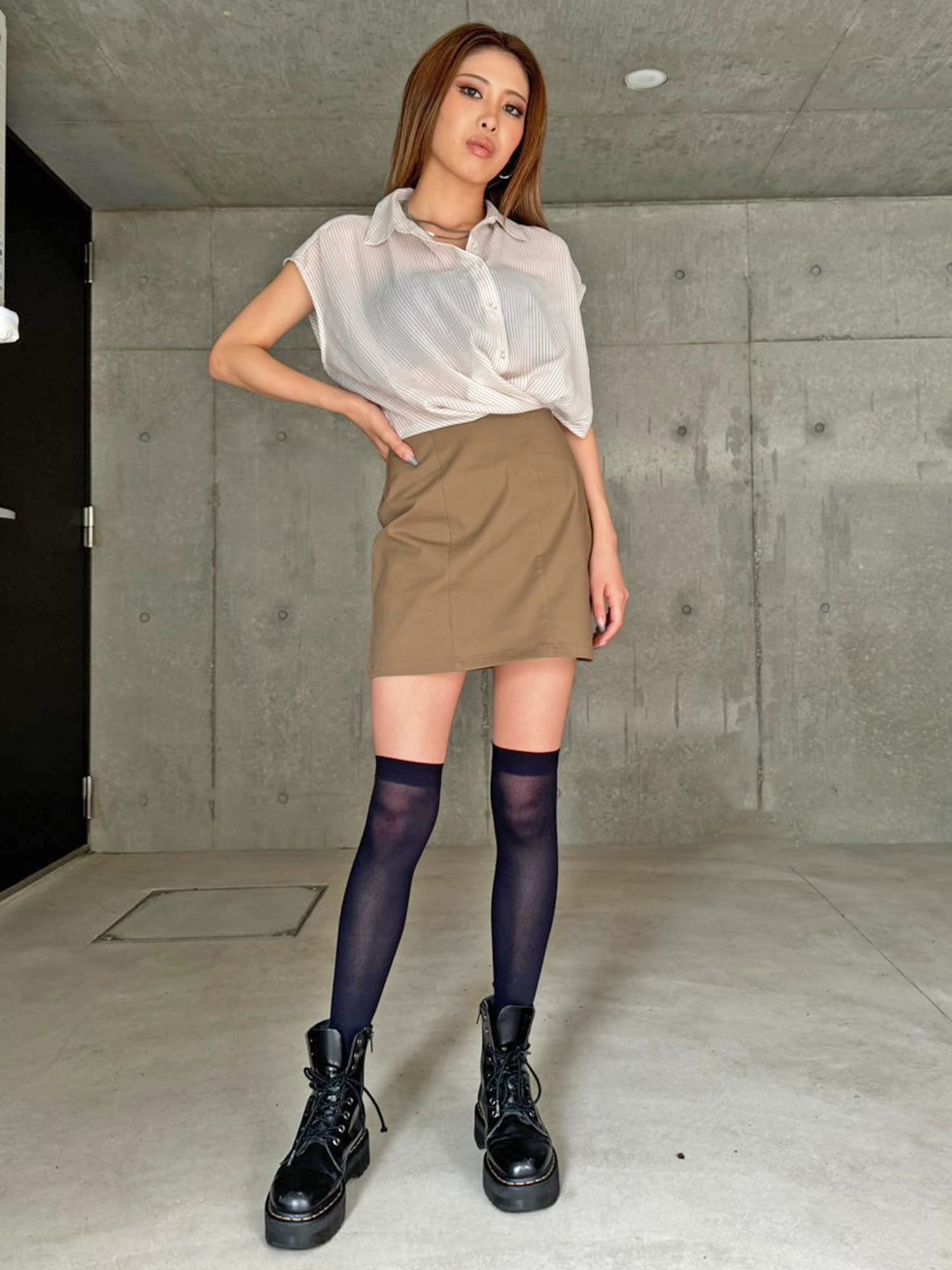 シャツの前裾をクロスさせたデザインで、前身頃部分のみスカートと繋がっています。シャツは軽くこの時期にぴったりな生地感で、ブラウジングさせているように見えるデザインなため程よいゆとりがあります。シャツの後ろは裾をINでもOUTでもお好みでアレンジしていただけるようにしました。スニーカーやサンダル+ソックス合わせでカジュアルなコーデもおススメ。小物次第で雰囲気を変えられるアイテムです。スカートのBackにファスナーが付いているので着脱は簡単です。