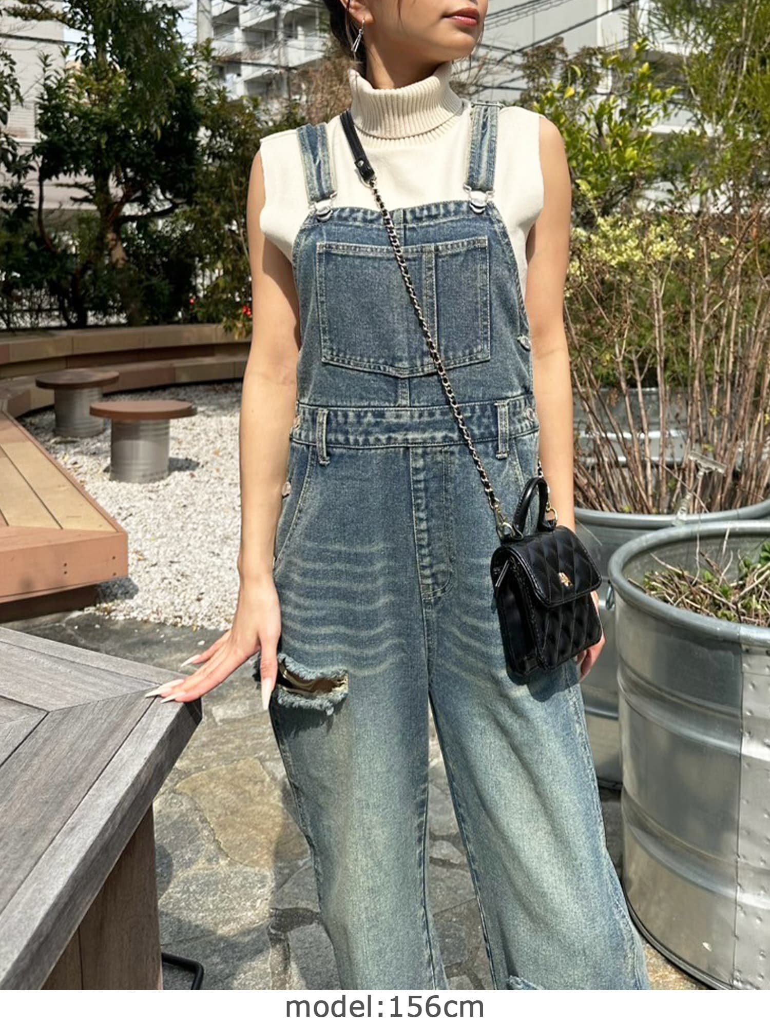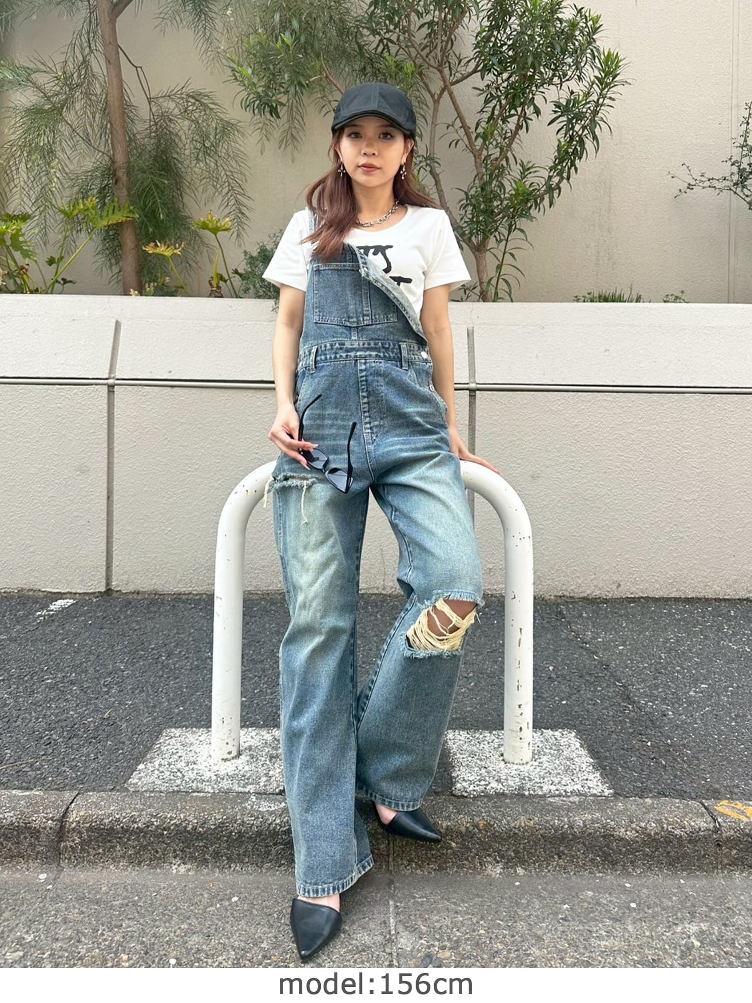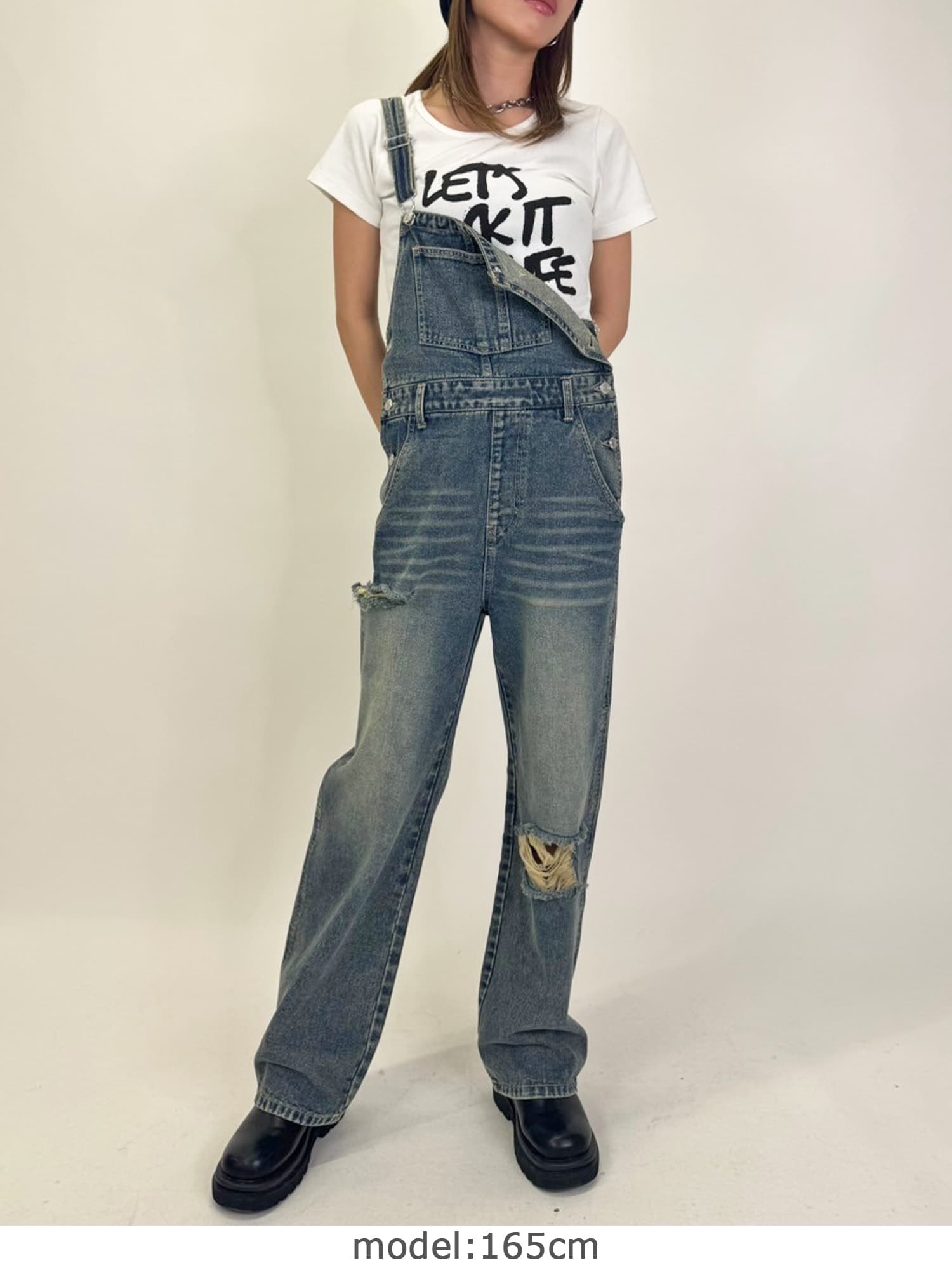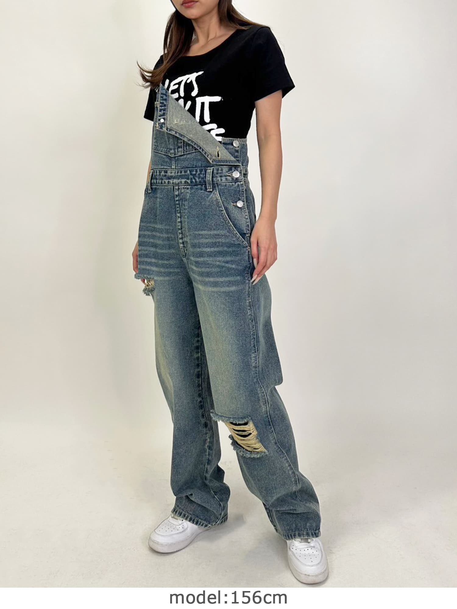 足元にボリュームを出したい場合は、肩紐のアジャスターで調整し下げることでルーズな着こなしに。カジュアルなイメージのオーバーオールでも、モモに施された大胆なダメージでセクシーさを忘れません。