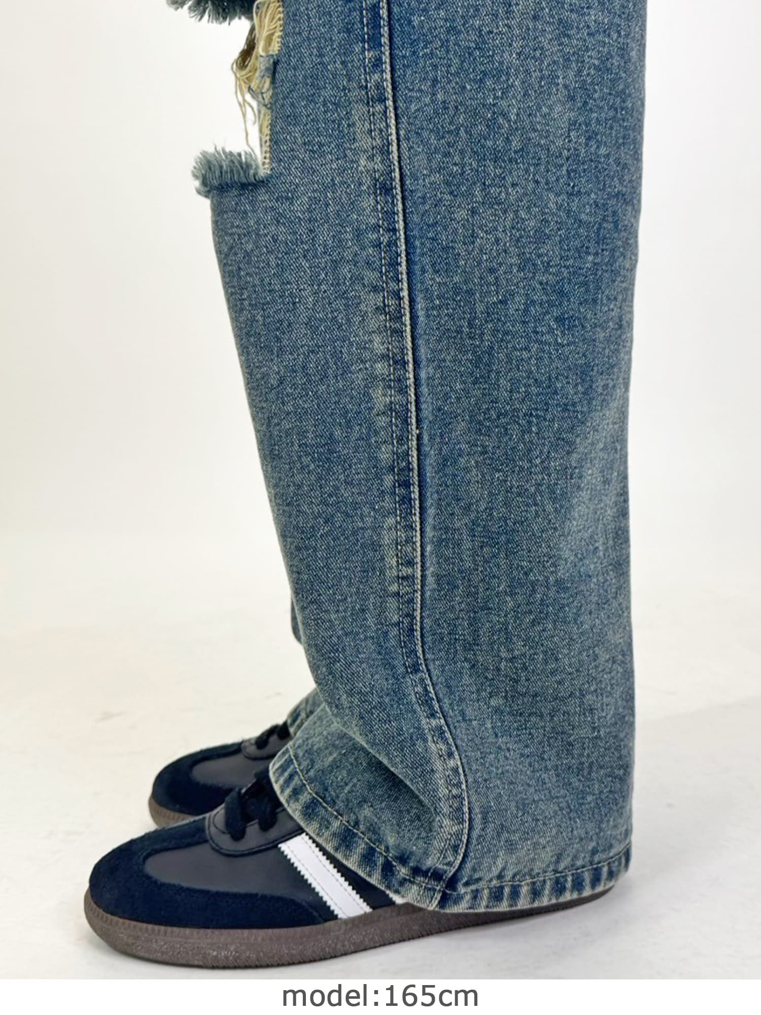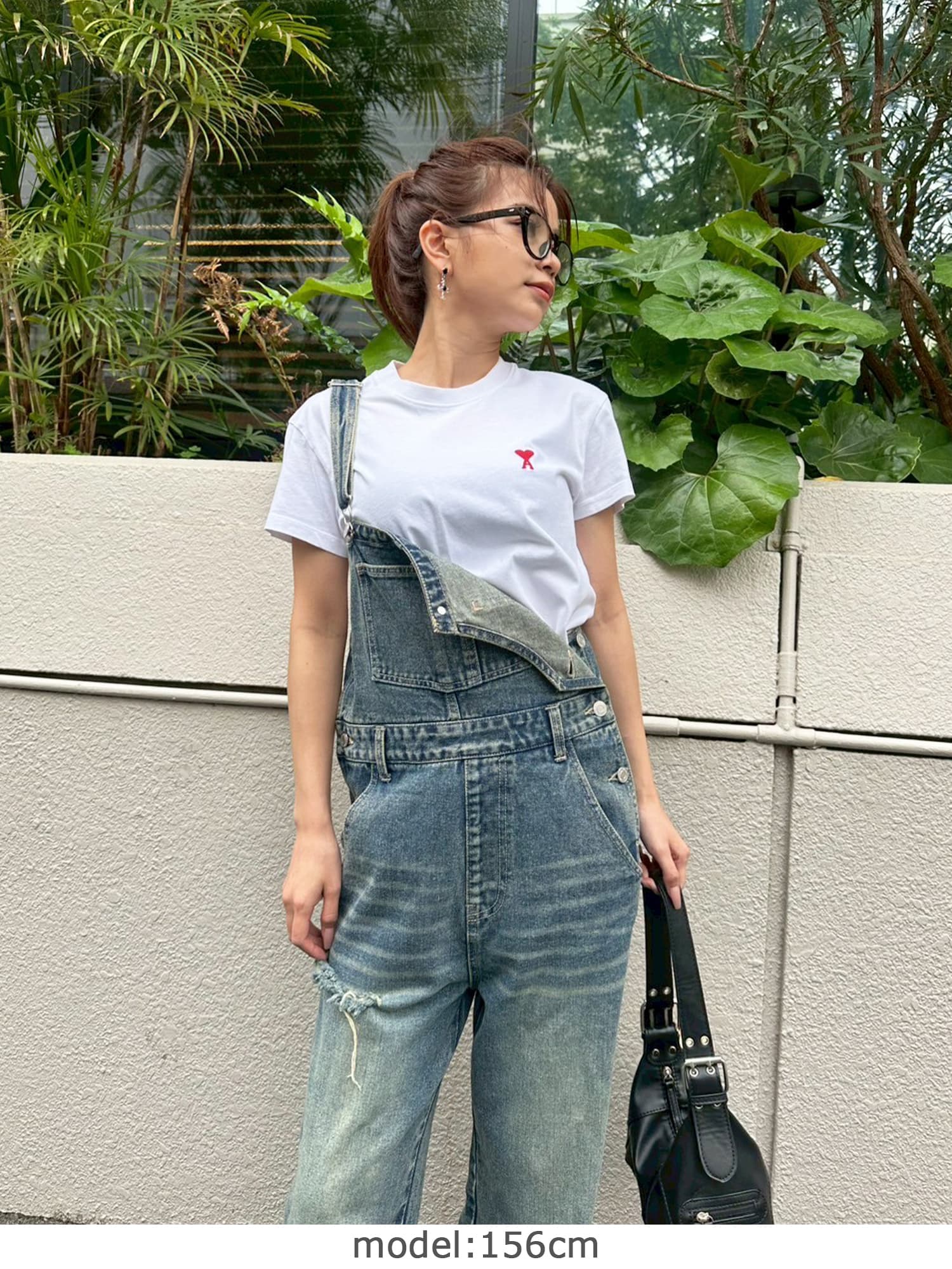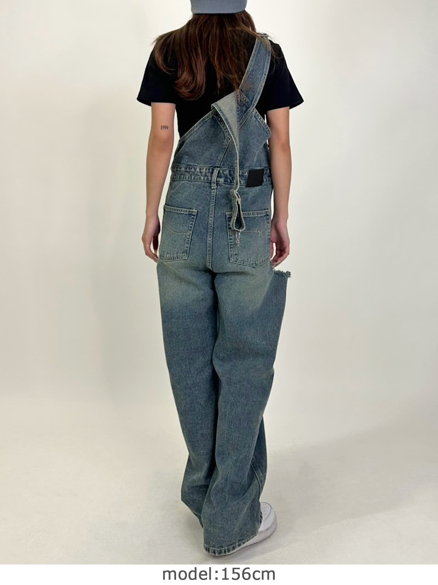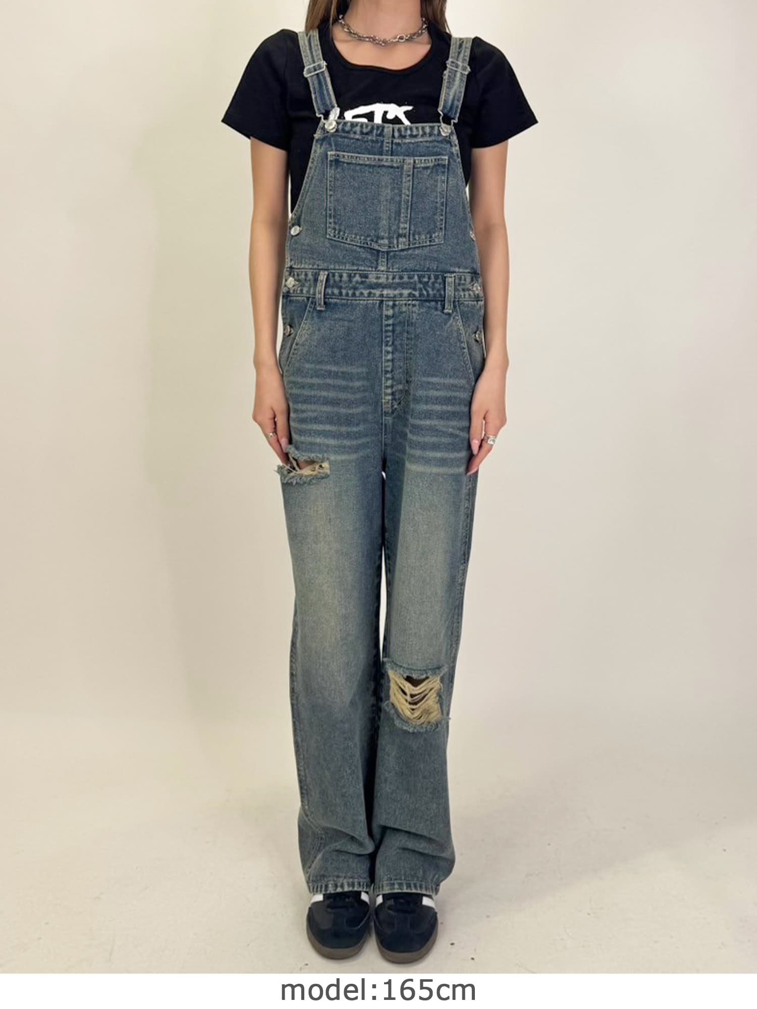 足元にボリュームを出したい場合は、肩紐のアジャスターで調整し下げることでルーズな着こなしに。カジュアルなイメージのオーバーオールでも、モモに施された大胆なダメージでセクシーさを忘れません。