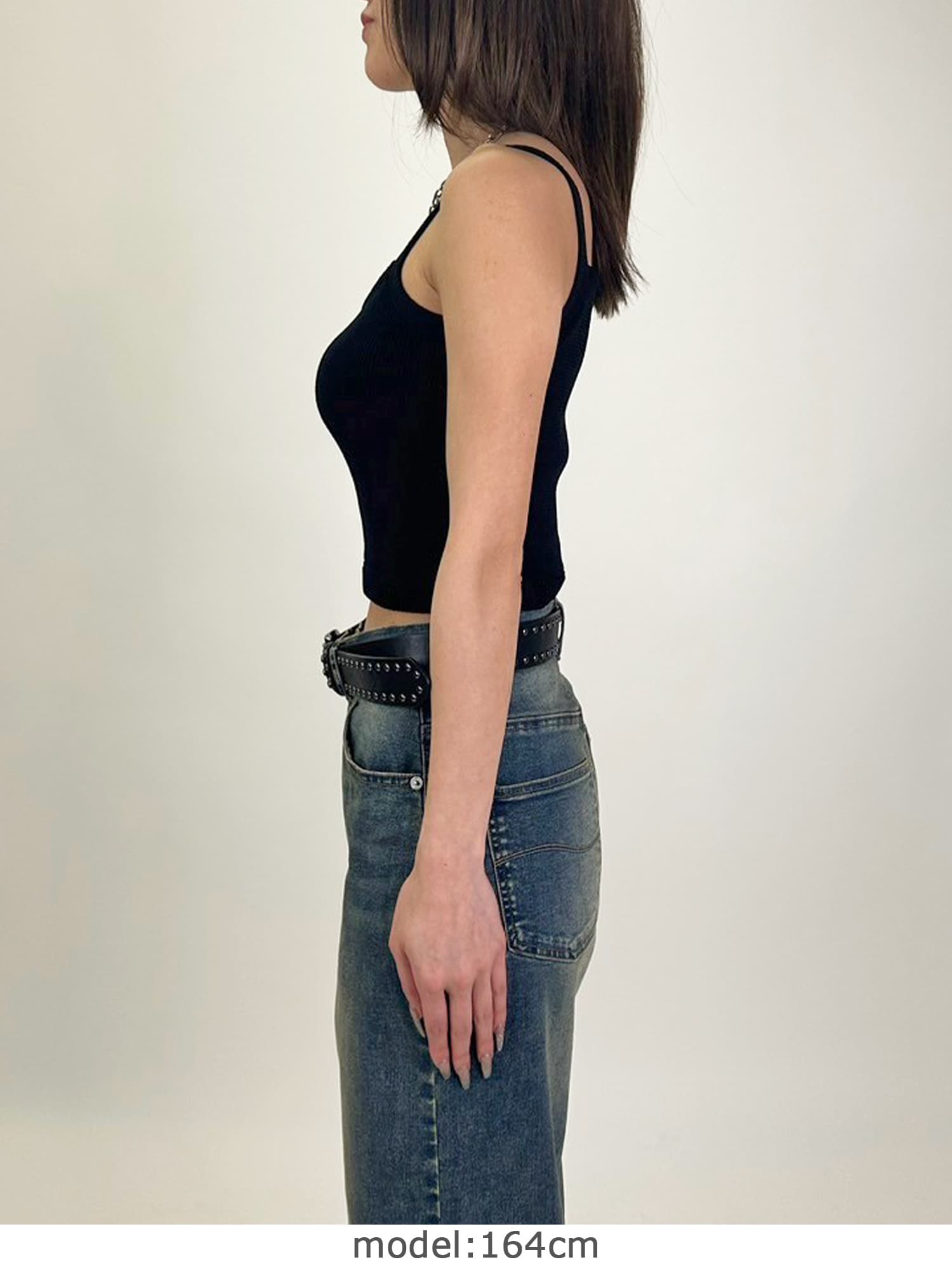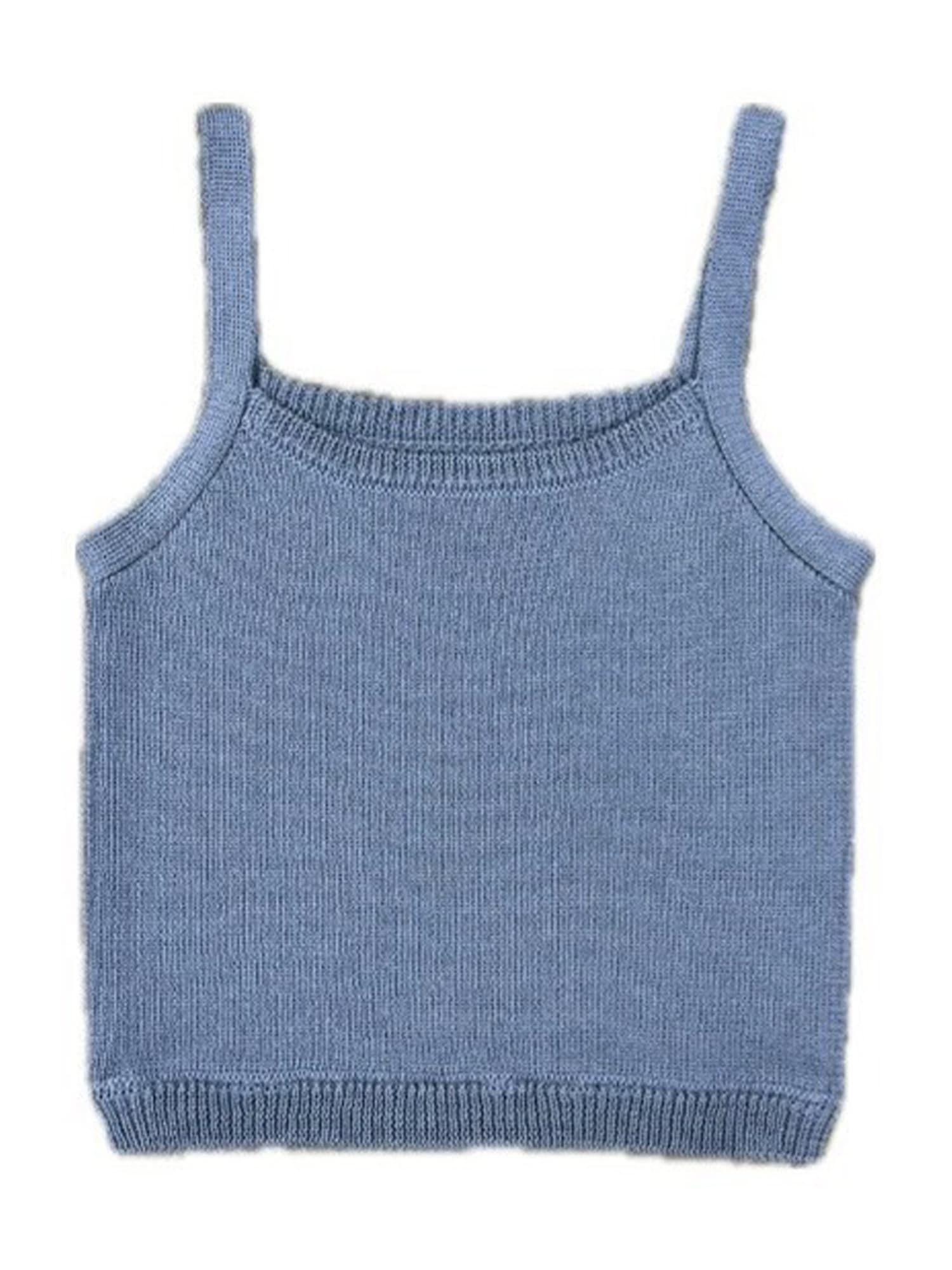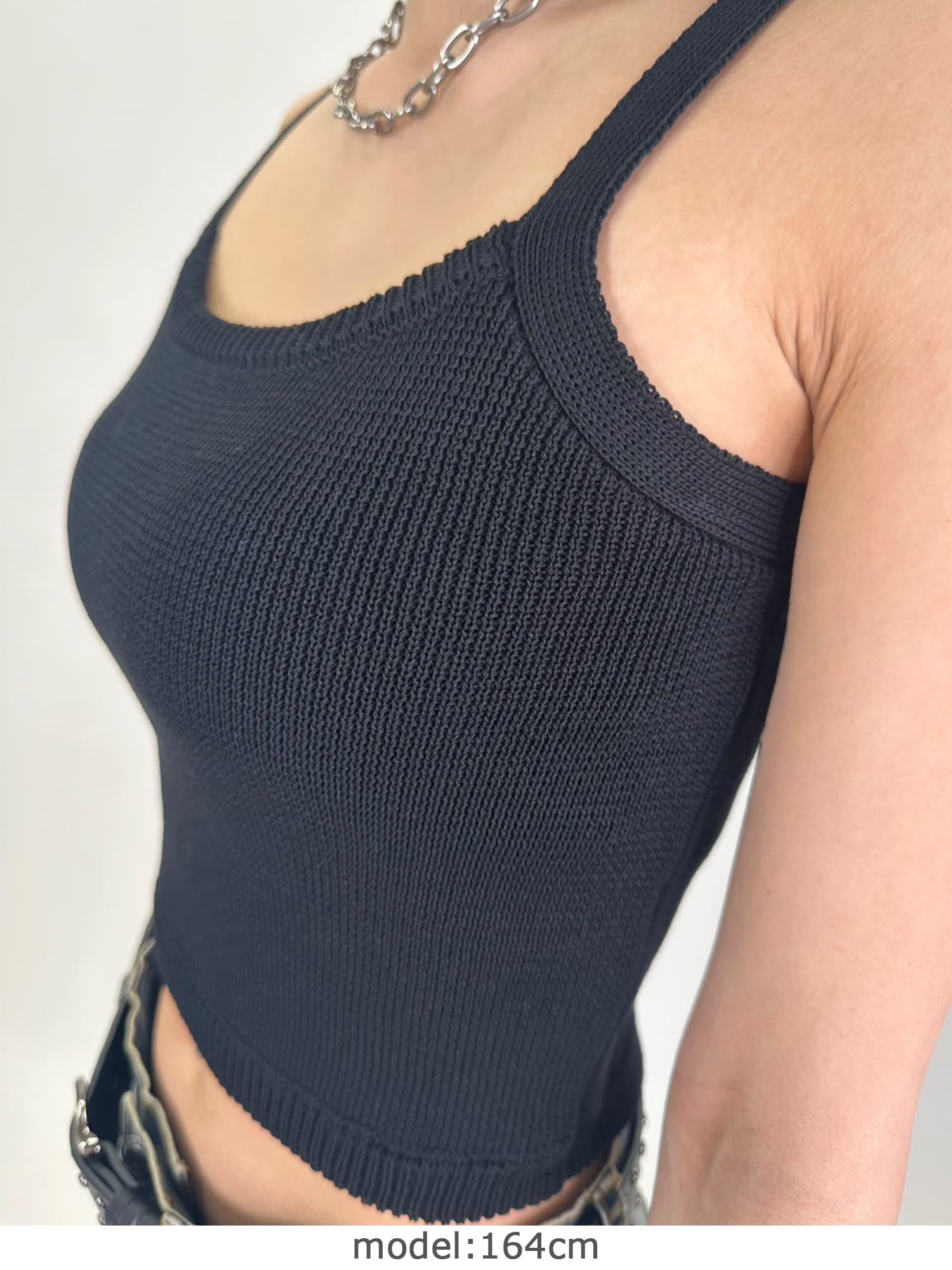 シャリ感のある薄手で通気性の良い糸を使用し、肩紐は安定感のある太さに仕上げました。ボディラインにフィットする細身なサイジングですが、伸縮性があるので窮屈感がなくストレスフリーです。
