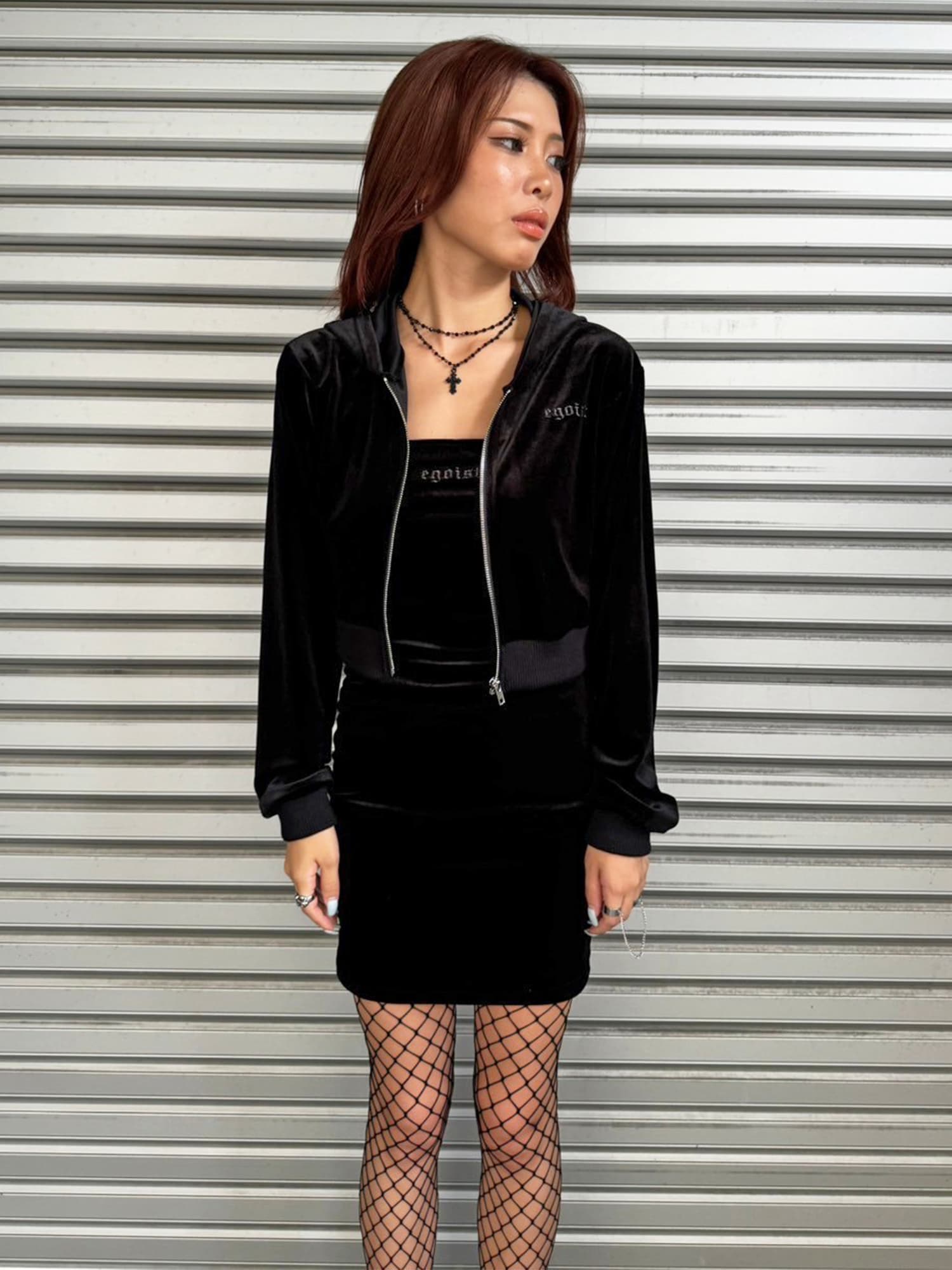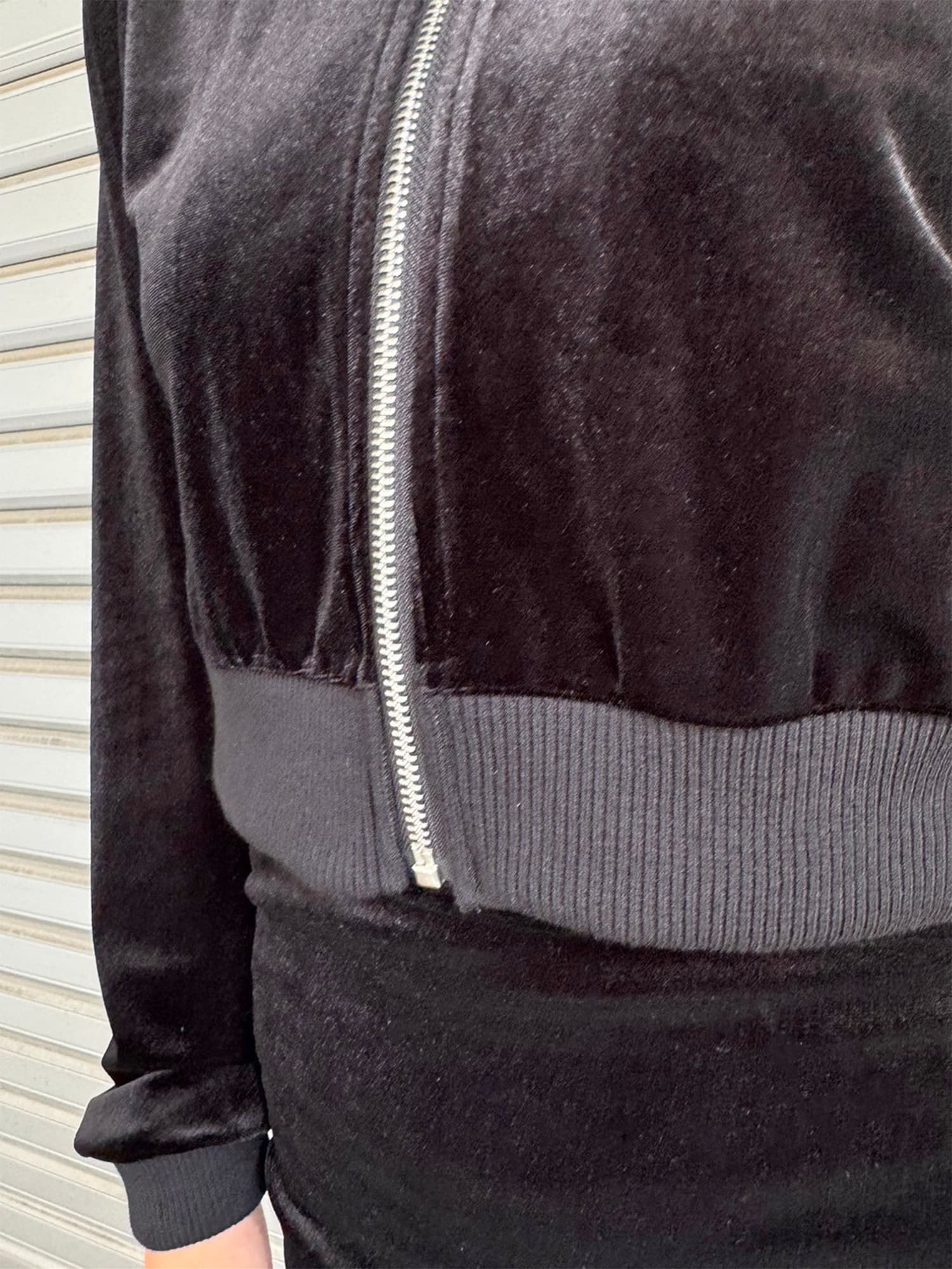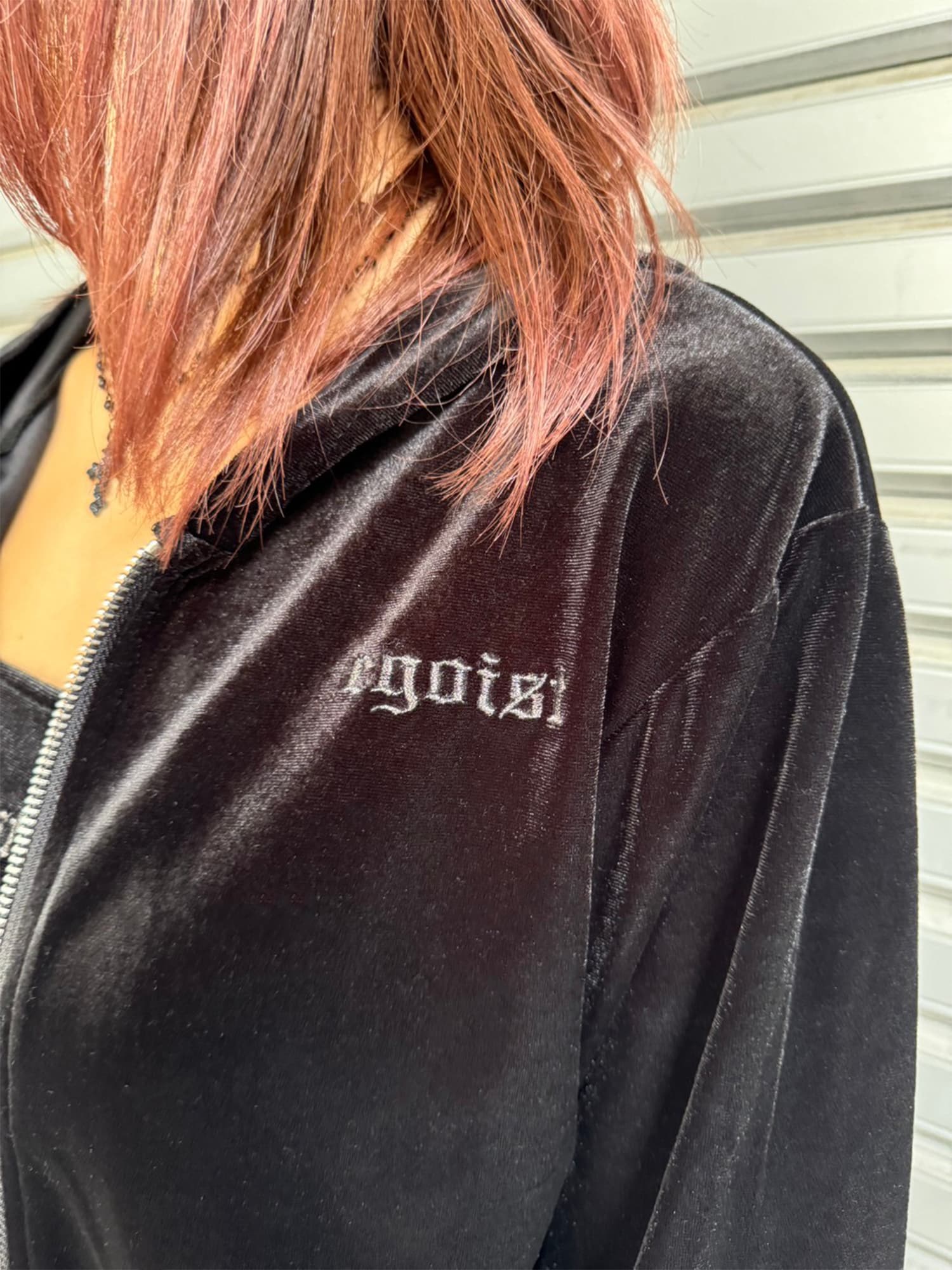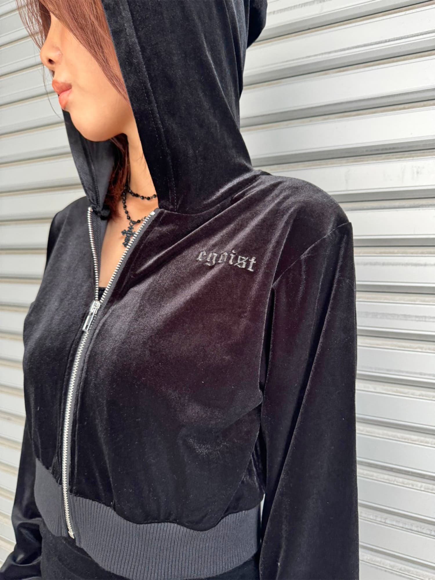 商品説明 程よく光沢感があり、肌触りの良いカットベロアを使用したフルジップパーカー。