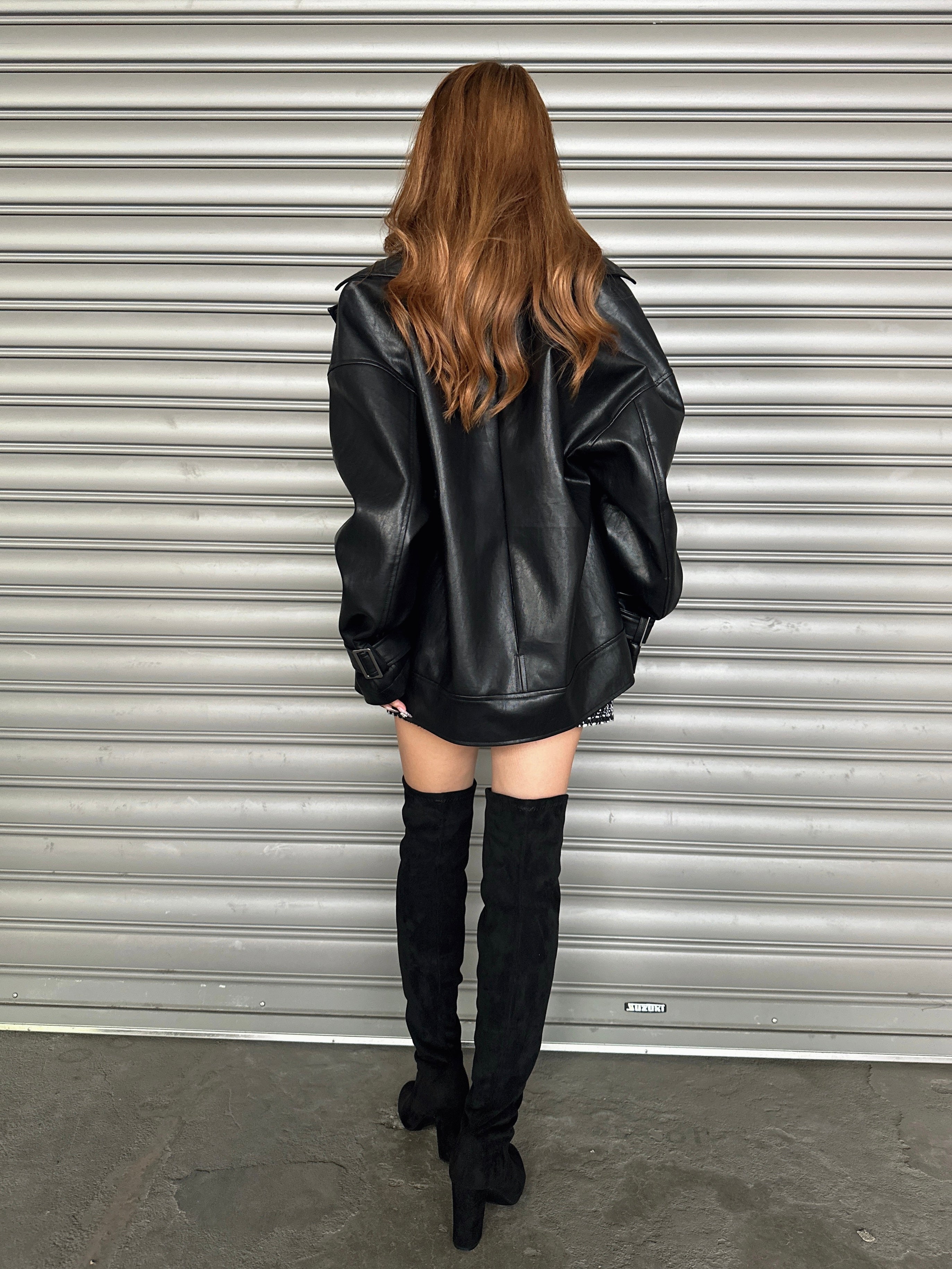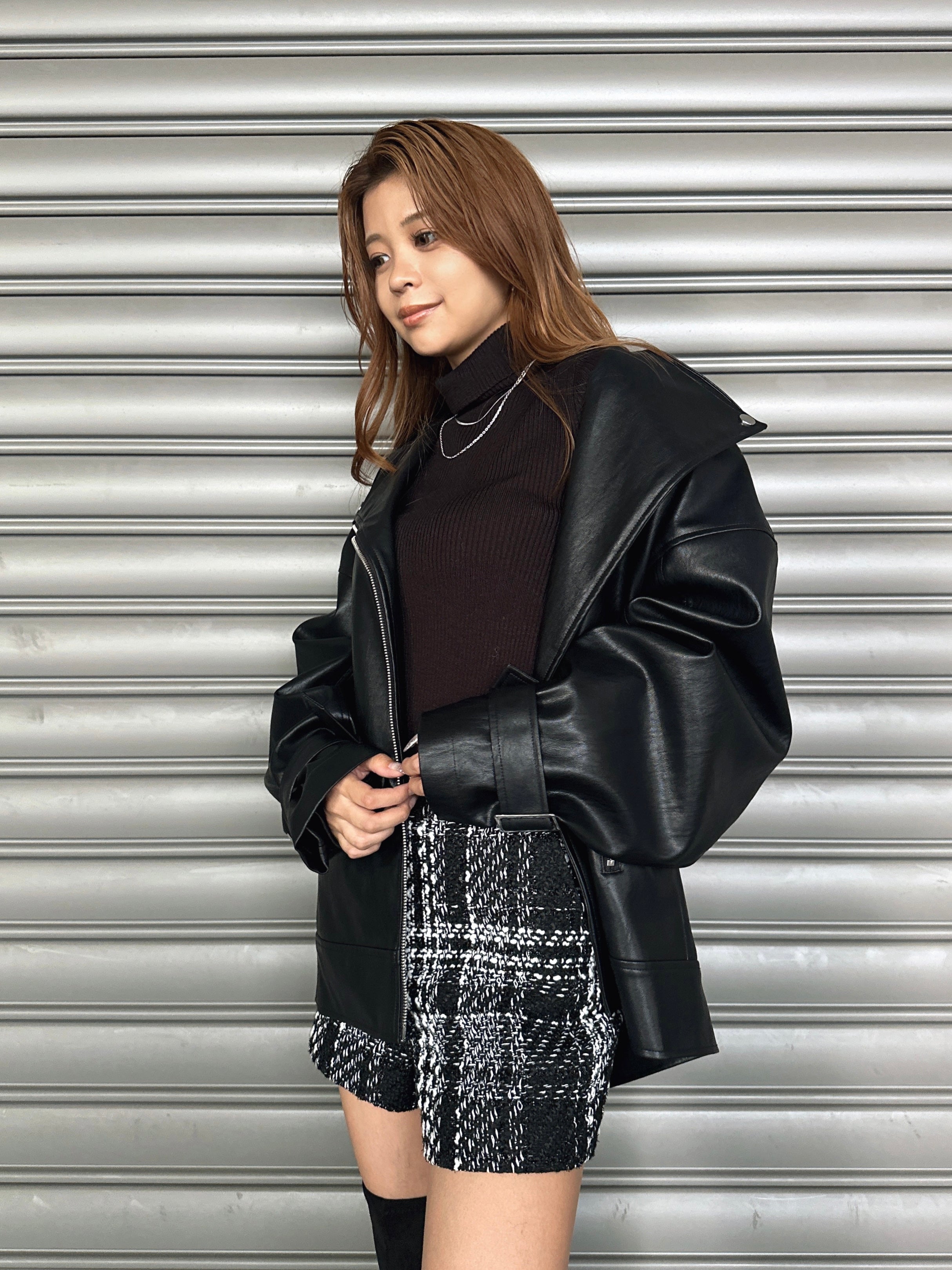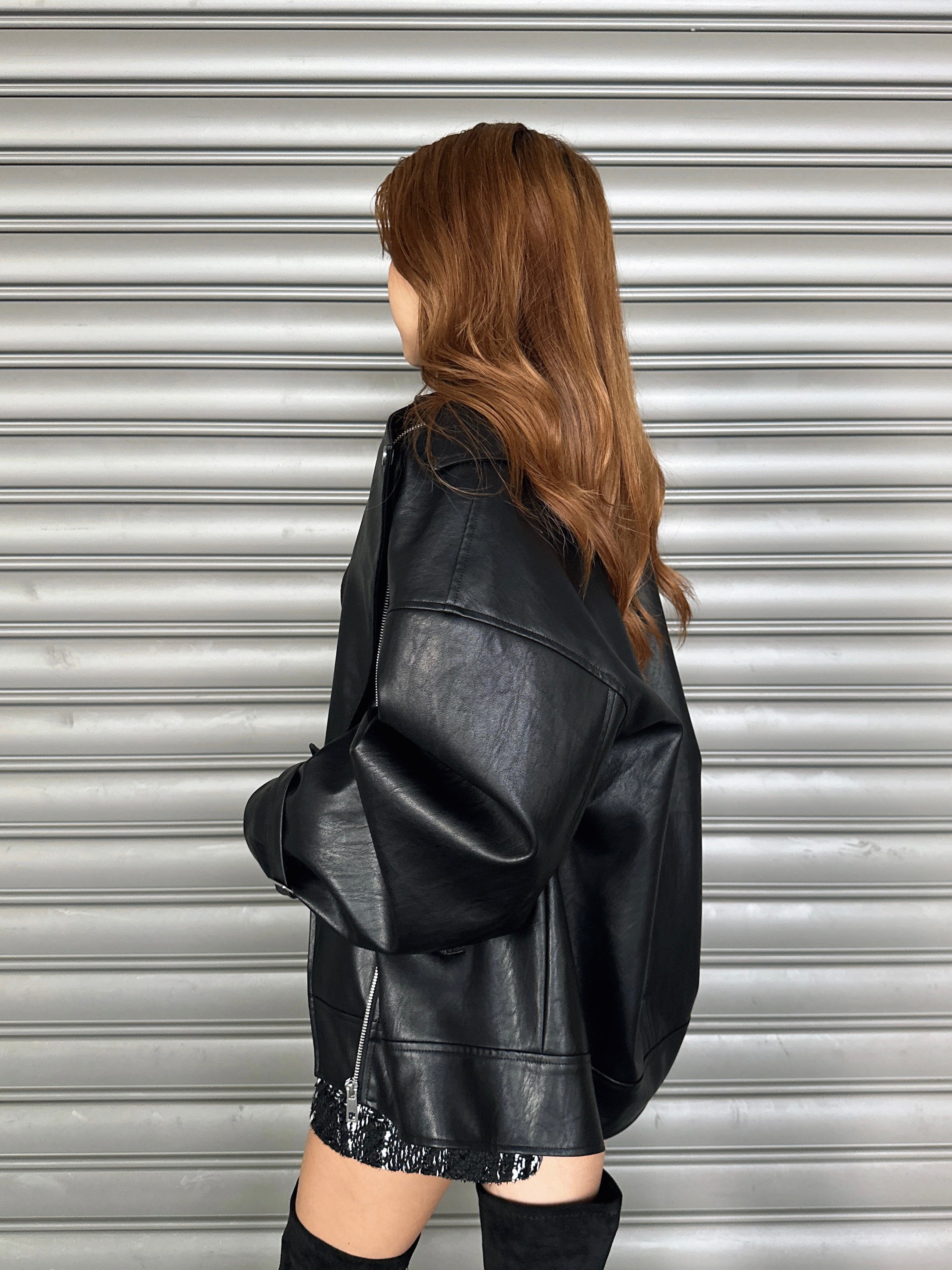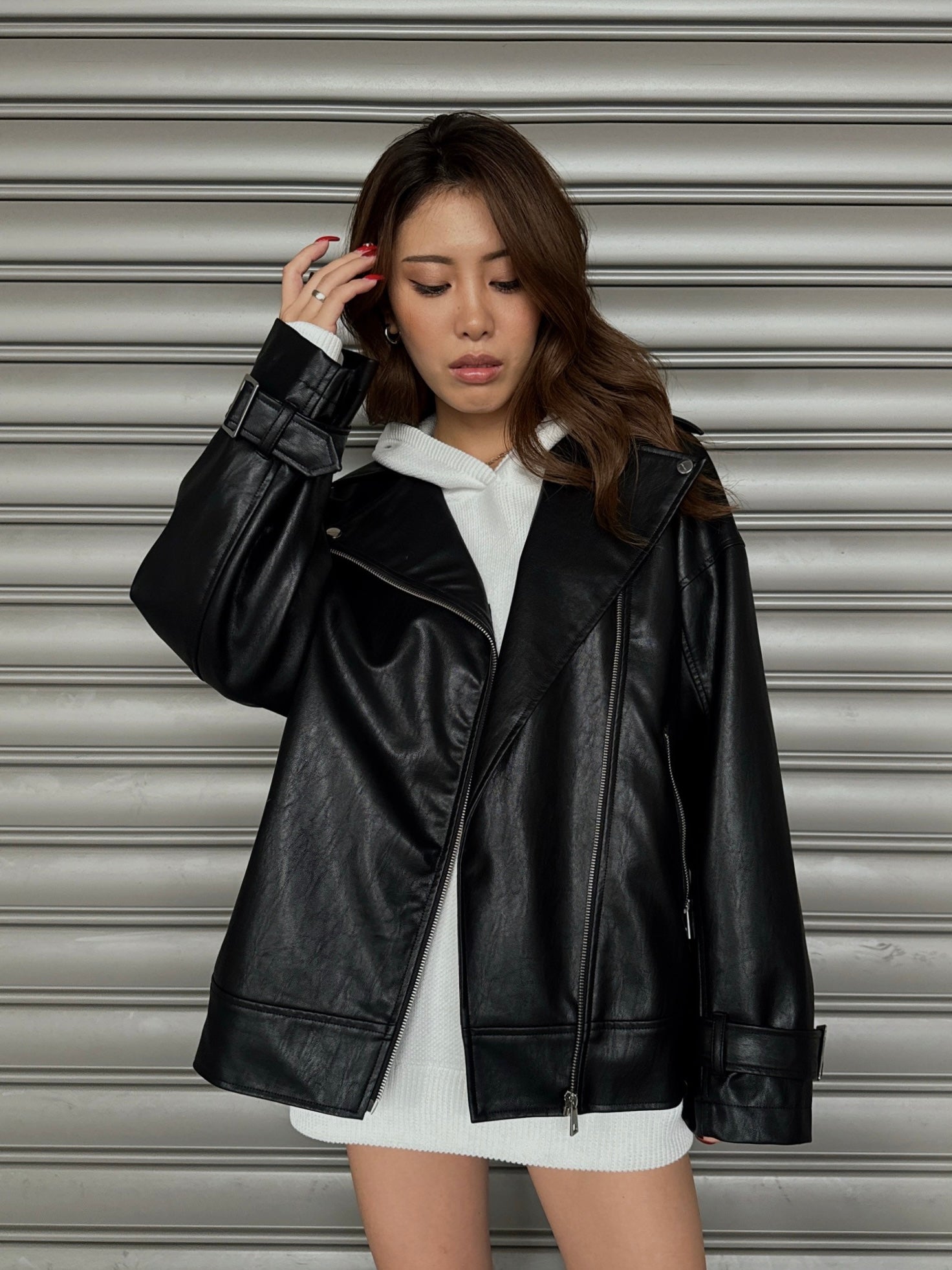 大きな衿がポイントのフェイクレザーライダースジャケット。ビッグカラーは、小顔効果をもたらしてくれるのも嬉しいポイント。ゆとりを持たせたアームと身頃の作りで、ボリュームのあるトップスでも窮屈感なくインナーに取り入れやすいです。ヒップが隠れる長めの着丈で、体型カバーもばっちり。付属品は全て艶ありシルバーで統一することで高級感を出しました。お好みで袖口の絞りを調整できるように、袖口BELTを付けています。センターバックにはざっくりとタックを入れ立体感を出し、360度どこから見ても抜かりのない1枚に仕上げました。流行りすたりのないライダースは1枚あると重宝すること間違いなし。レザーの辛口アイテムをレディライクに着こなしたい方は、スキニー/ミニボドム/タイトワンピースの合わせがオススメです。程よいツヤ感とシボ感のフェイクレザー生地が、まるで本革と思わせるような見た目。硬すぎない生地感のものを選んでいるので、ごわつきもなく全体にハリが出てしまうのを抑えてくれます。