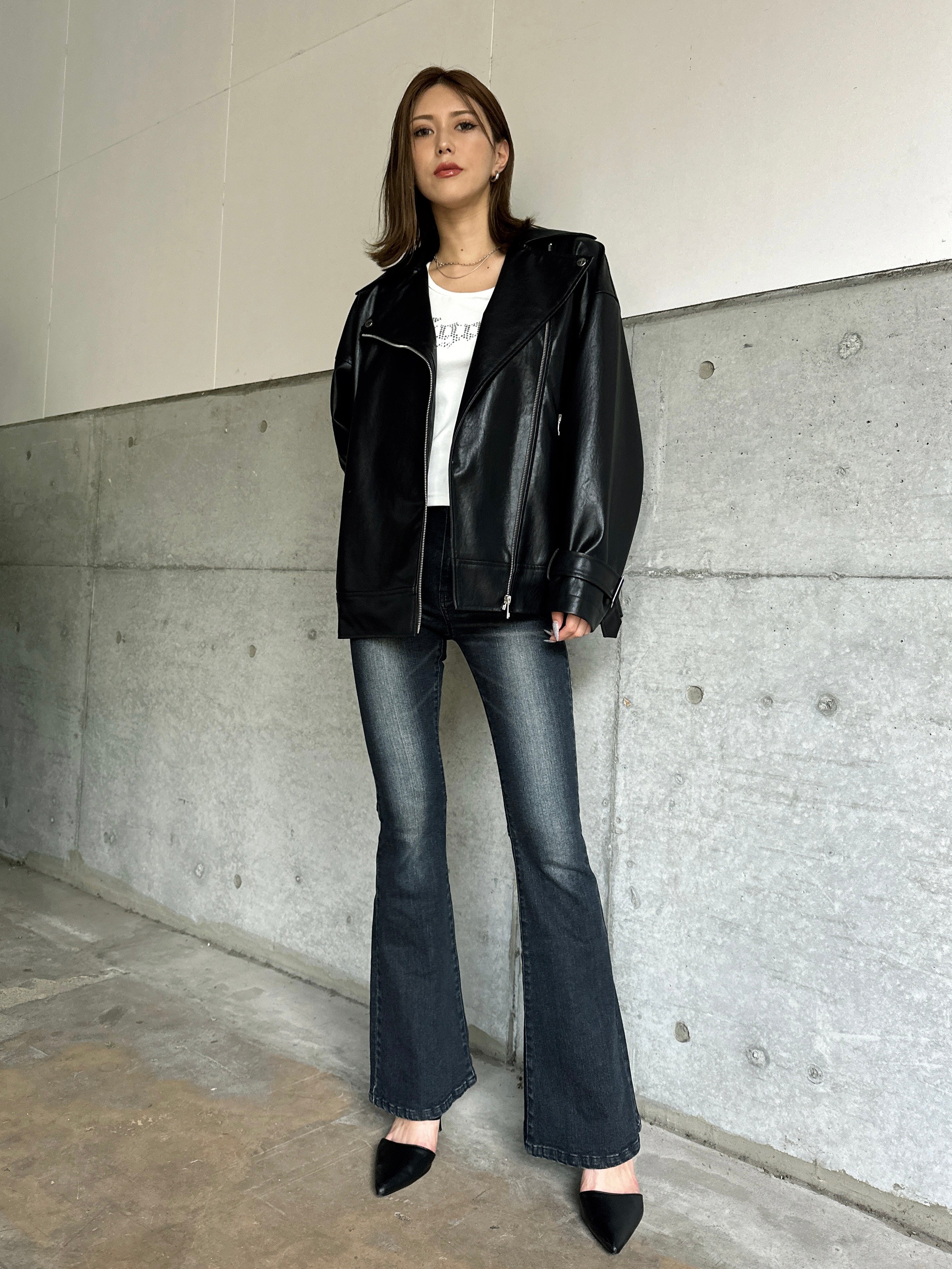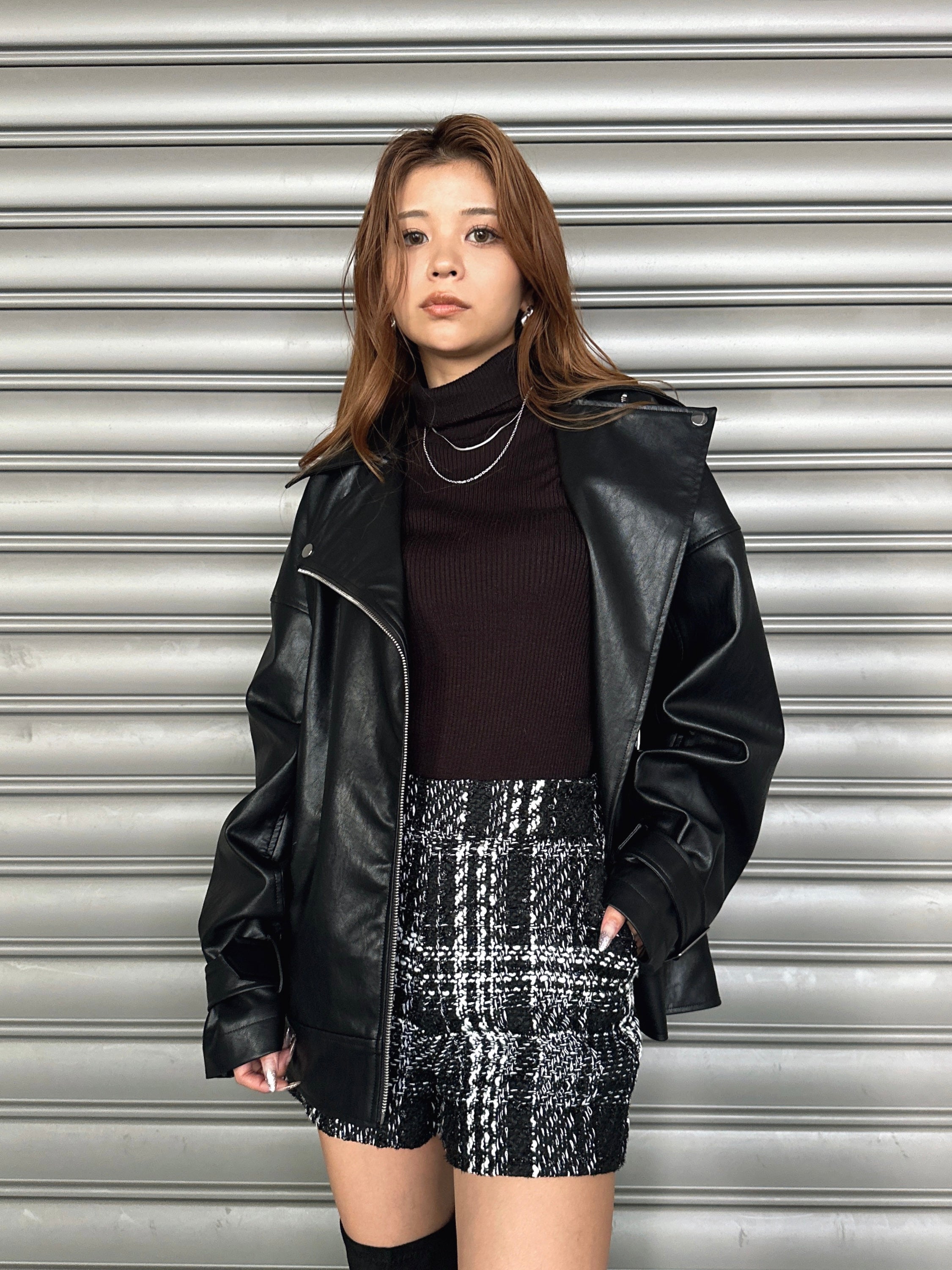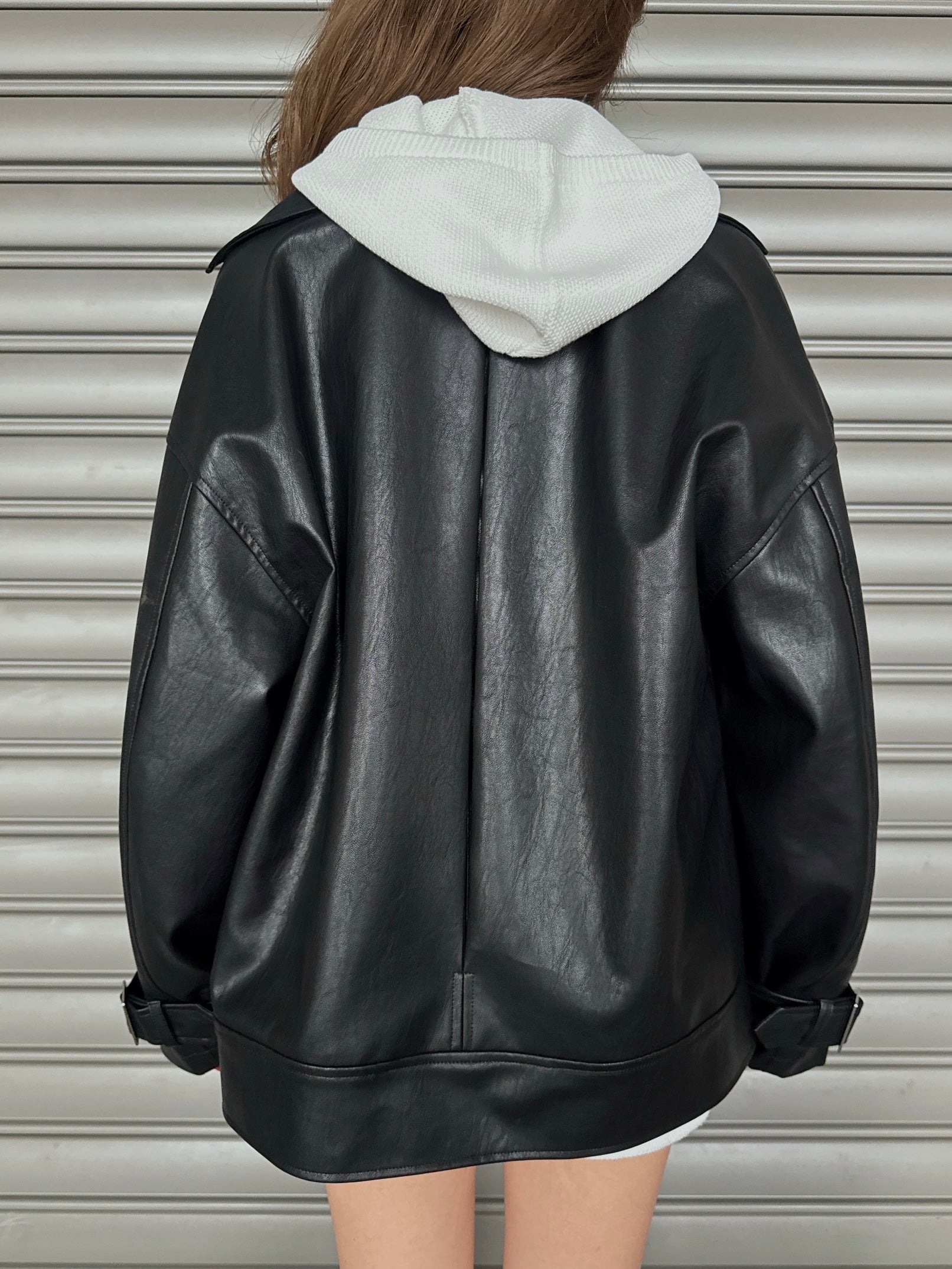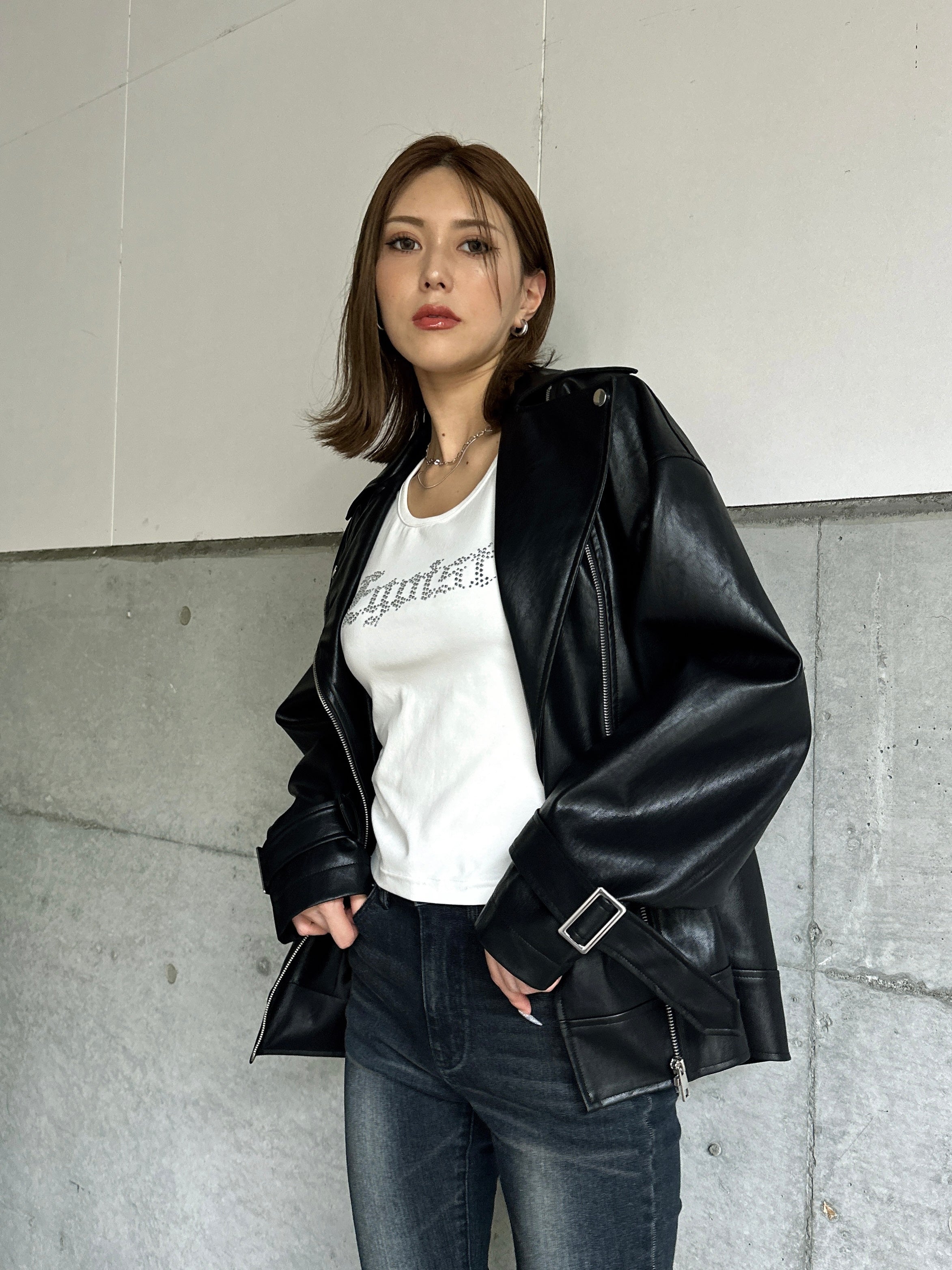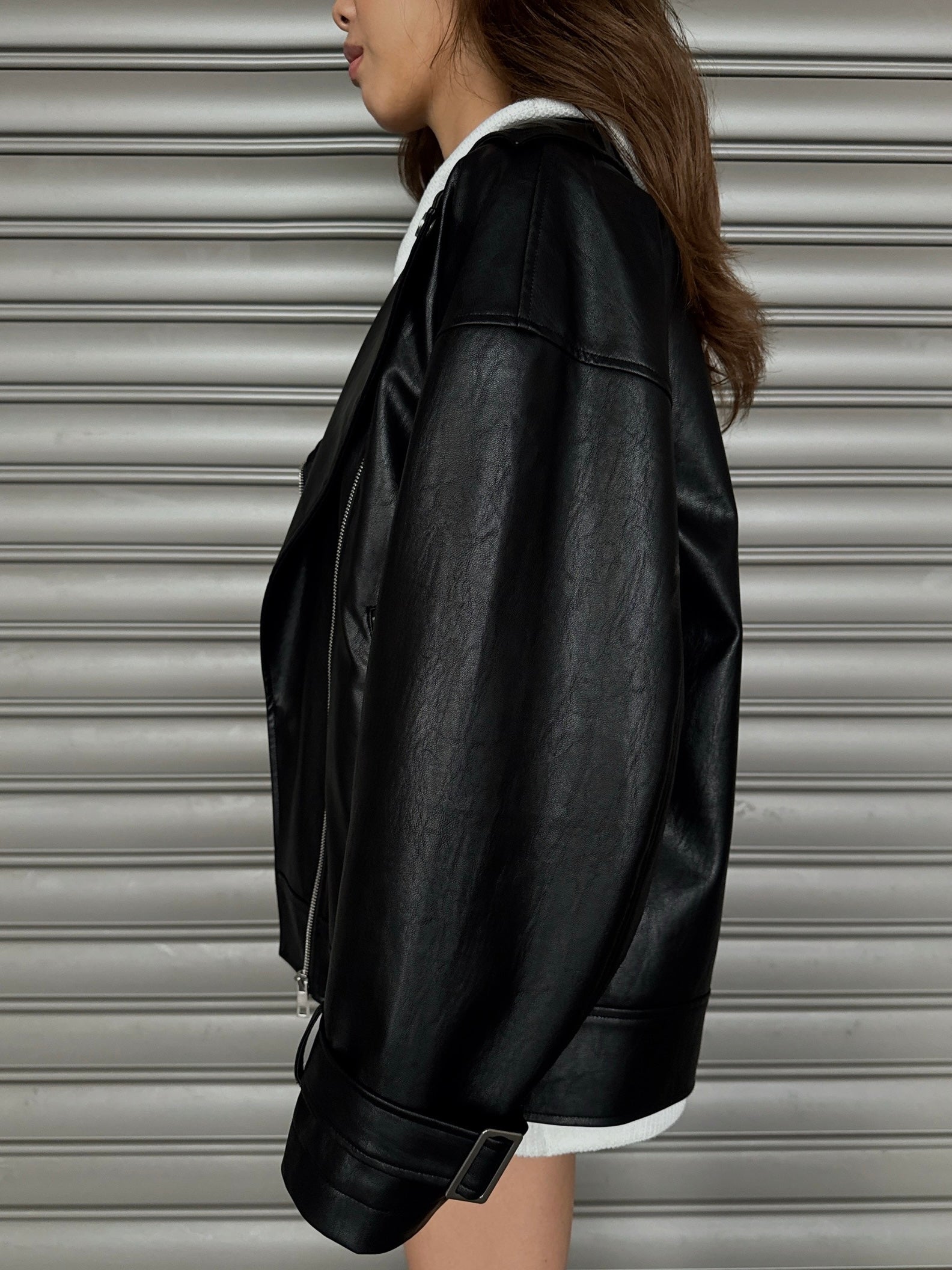 大きな衿がポイントのフェイクレザーライダースジャケット。ビッグカラーは、小顔効果をもたらしてくれるのも嬉しいポイント。ゆとりを持たせたアームと身頃の作りで、ボリュームのあるトップスでも窮屈感なくインナーに取り入れやすいです。ヒップが隠れる長めの着丈で、体型カバーもばっちり。付属品は全て艶ありシルバーで統一することで高級感を出しました。お好みで袖口の絞りを調整できるように、袖口BELTを付けています。センターバックにはざっくりとタックを入れ立体感を出し、360度どこから見ても抜かりのない1枚に仕上げました。流行りすたりのないライダースは1枚あると重宝すること間違いなし。レザーの辛口アイテムをレディライクに着こなしたい方は、スキニー/ミニボドム/タイトワンピースの合わせがオススメです。程よいツヤ感とシボ感のフェイクレザー生地が、まるで本革と思わせるような見た目。硬すぎない生地感のものを選んでいるので、ごわつきもなく全体にハリが出てしまうのを抑えてくれます。