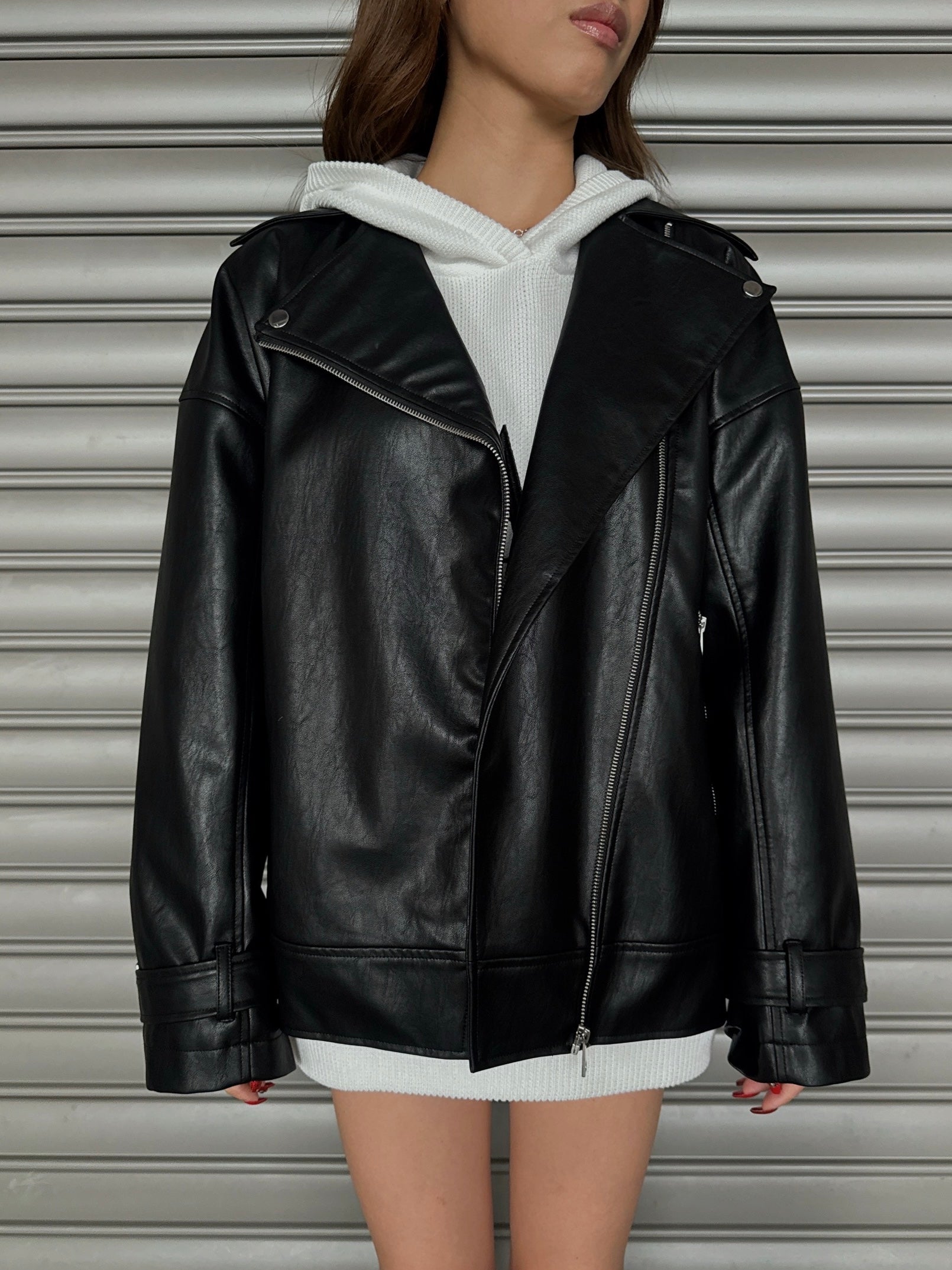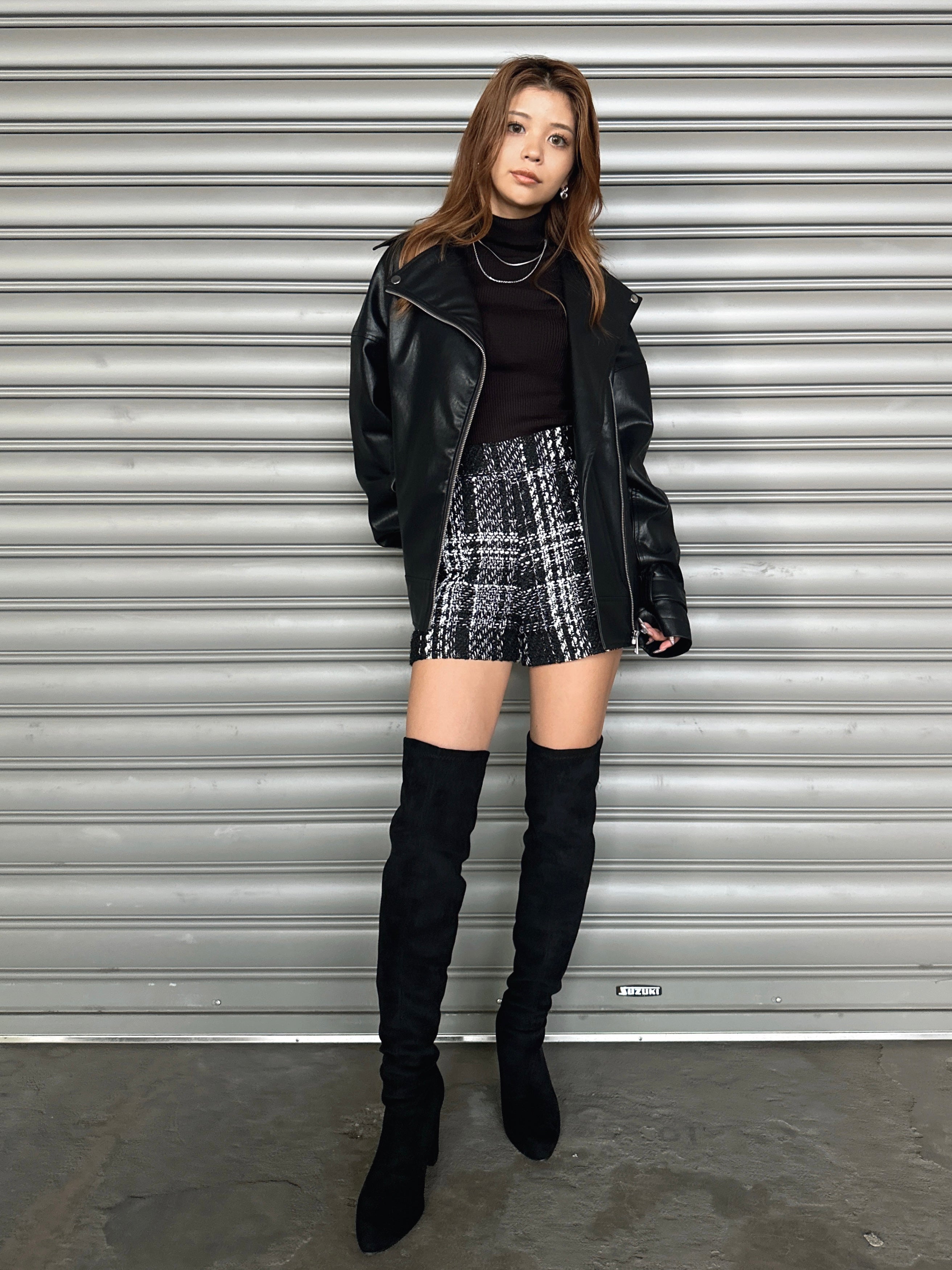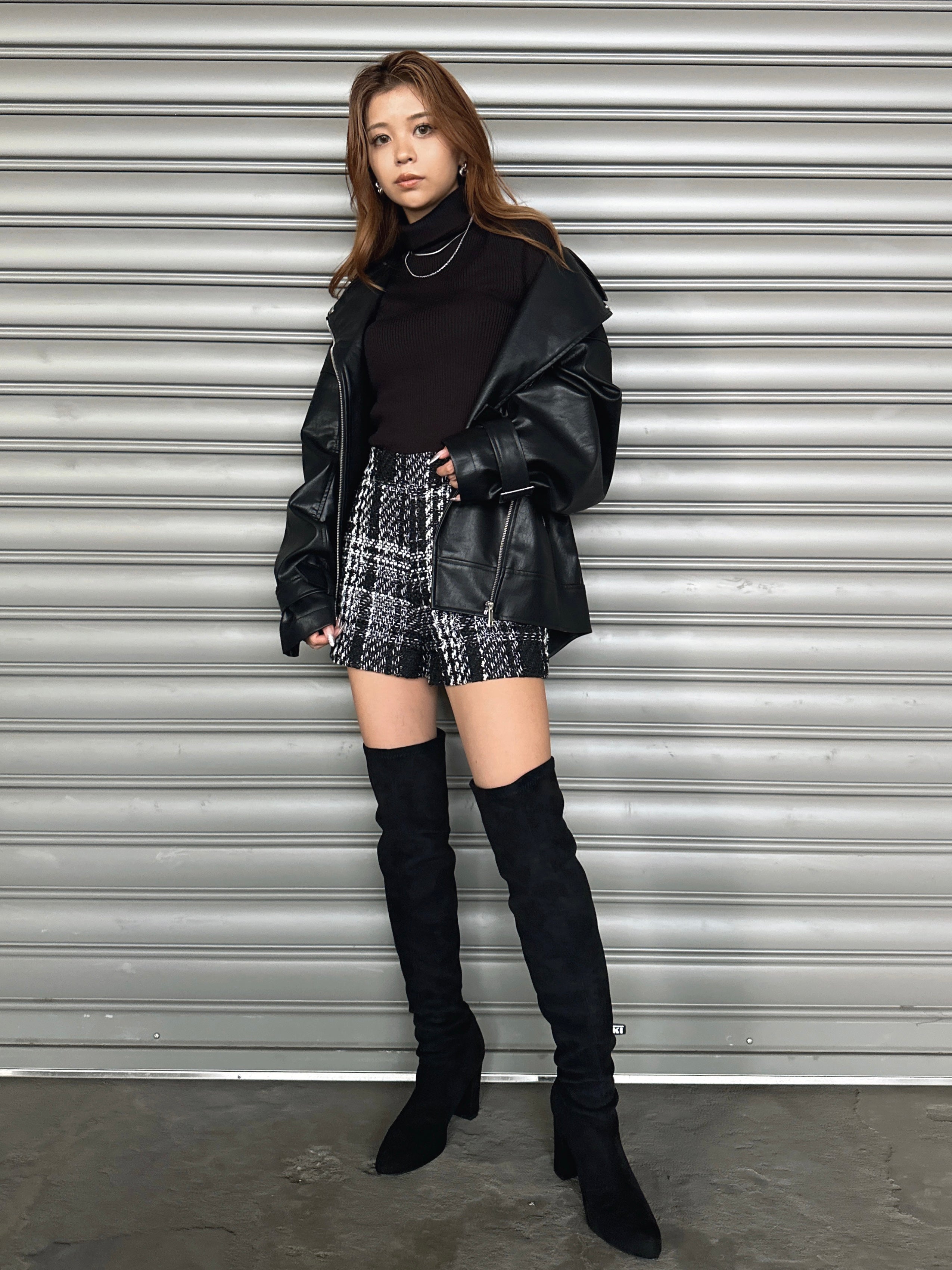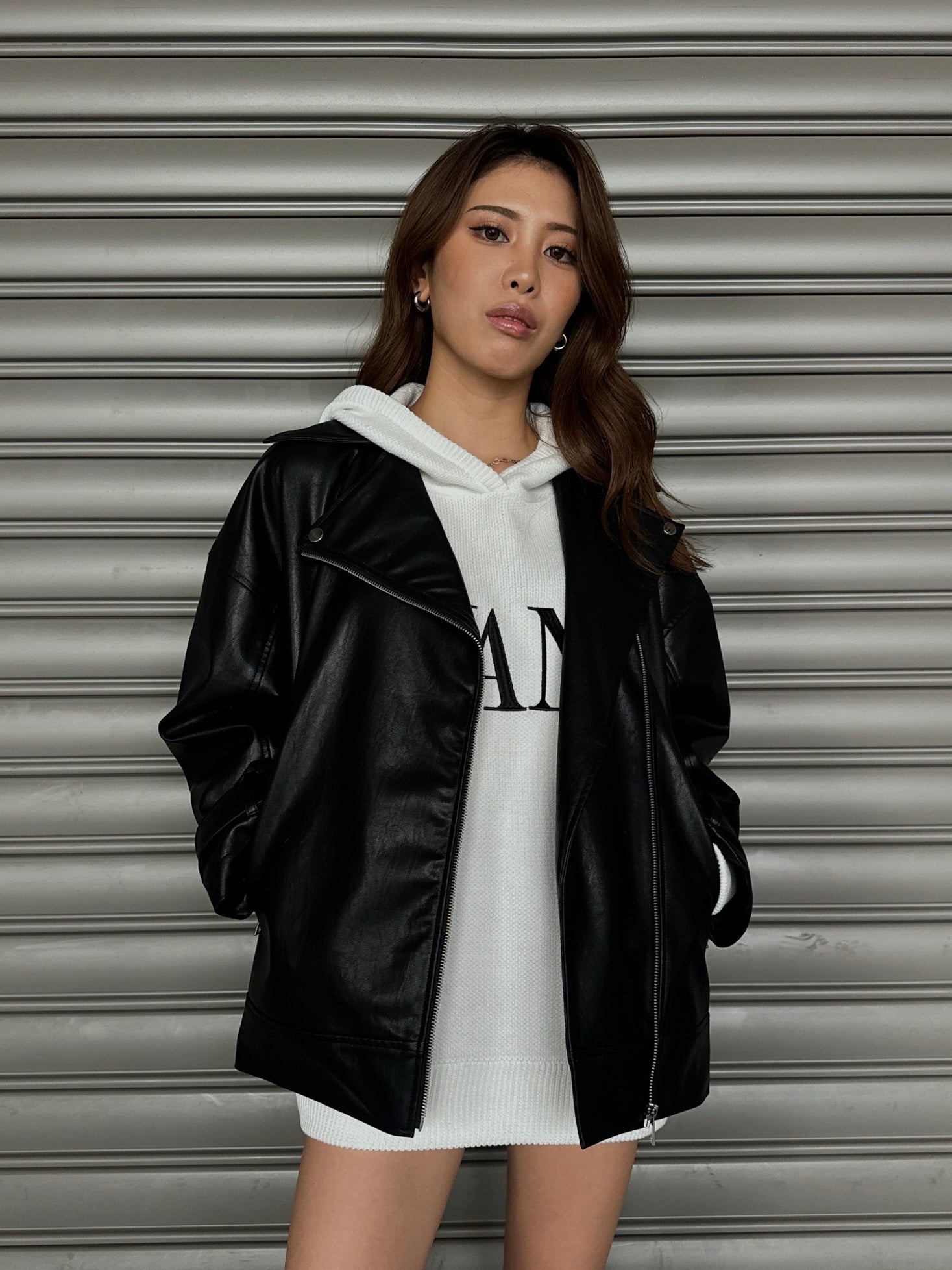 大きな衿がポイントのフェイクレザーライダースジャケット。ビッグカラーは、小顔効果をもたらしてくれるのも嬉しいポイント。ゆとりを持たせたアームと身頃の作りで、ボリュームのあるトップスでも窮屈感なくインナーに取り入れやすいです。ヒップが隠れる長めの着丈で、体型カバーもばっちり。付属品は全て艶ありシルバーで統一することで高級感を出しました。お好みで袖口の絞りを調整できるように、袖口BELTを付けています。センターバックにはざっくりとタックを入れ立体感を出し、360度どこから見ても抜かりのない1枚に仕上げました。流行りすたりのないライダースは1枚あると重宝すること間違いなし。レザーの辛口アイテムをレディライクに着こなしたい方は、スキニー/ミニボドム/タイトワンピースの合わせがオススメです。程よいツヤ感とシボ感のフェイクレザー生地が、まるで本革と思わせるような見た目。硬すぎない生地感のものを選んでいるので、ごわつきもなく全体にハリが出てしまうのを抑えてくれます。