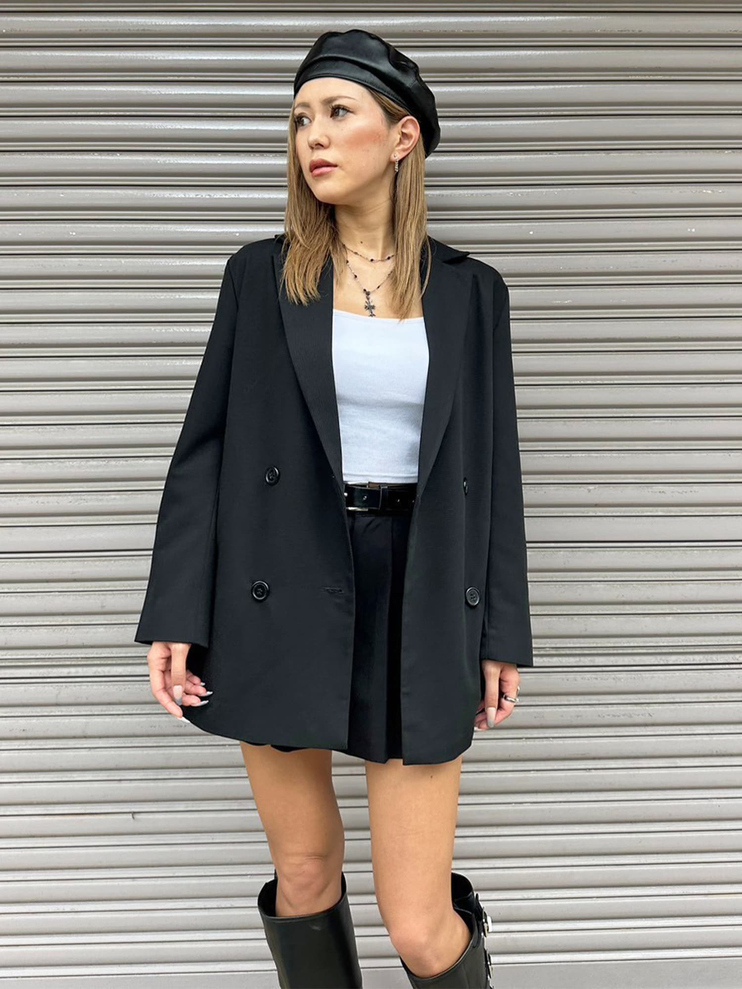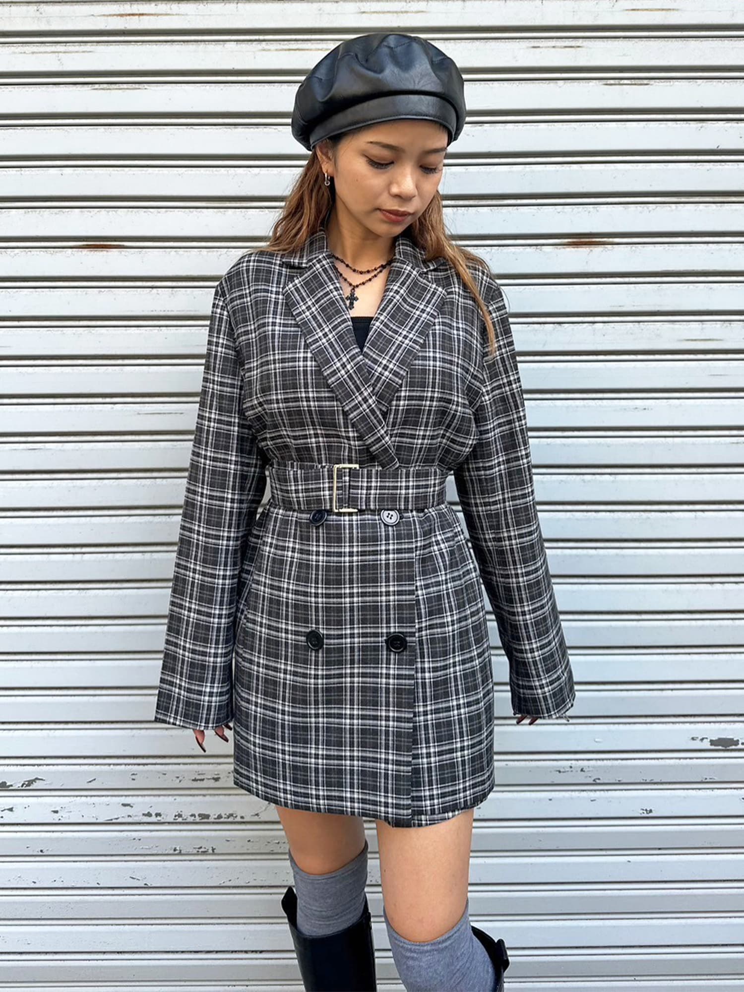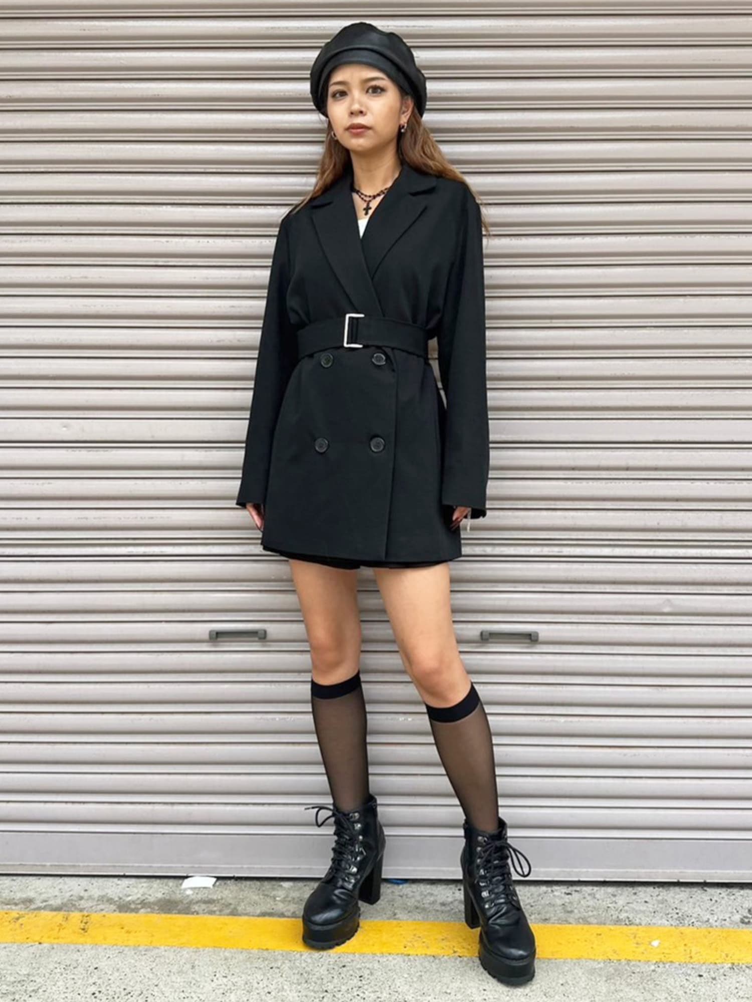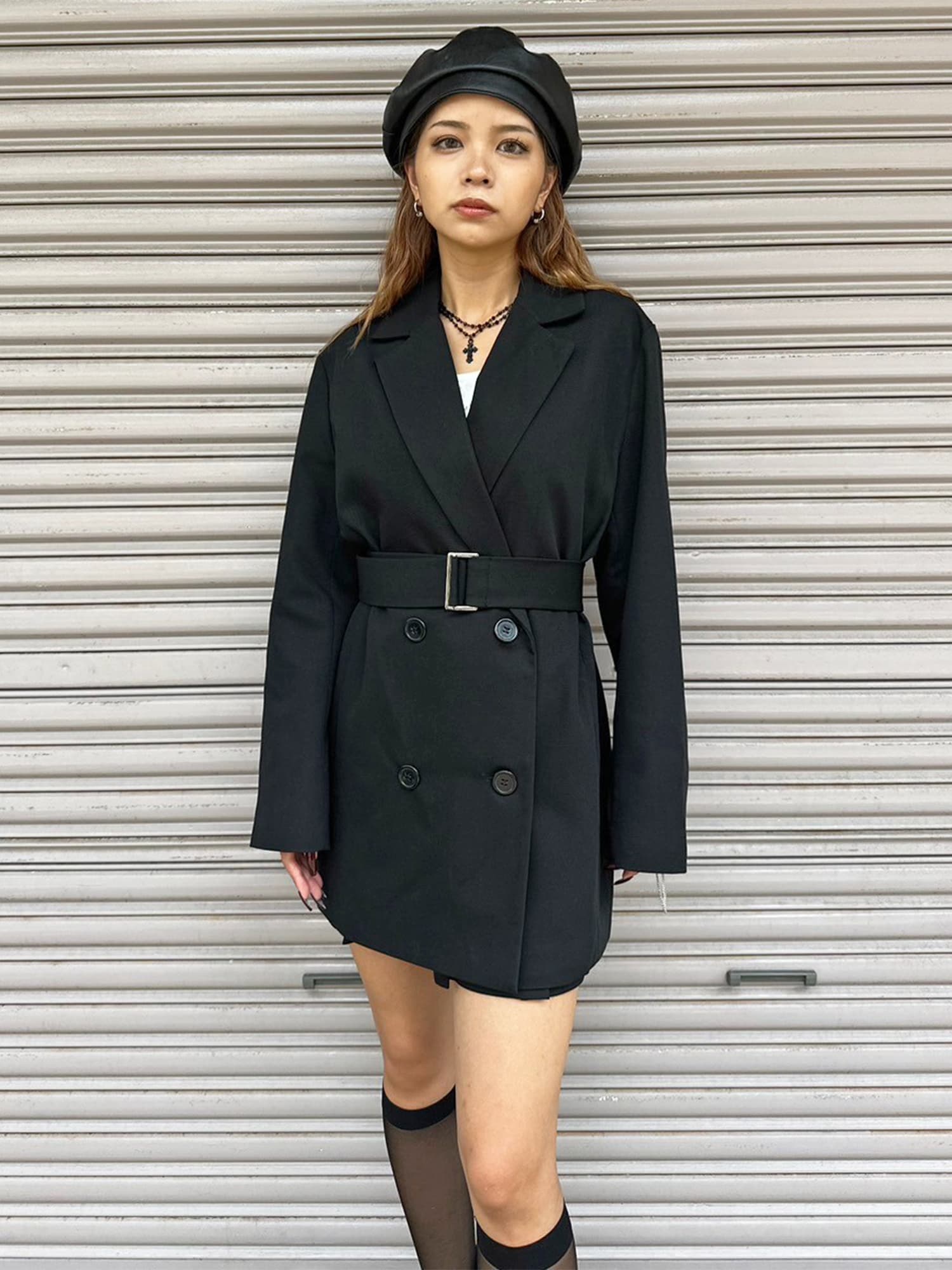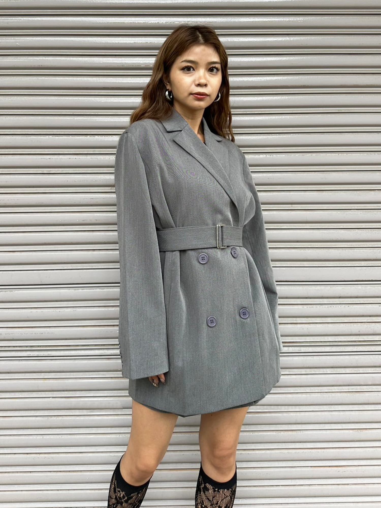商品説明 スクエアのメタルバックルが付いた共地ベルトがワンポイントのダブルジャケット。