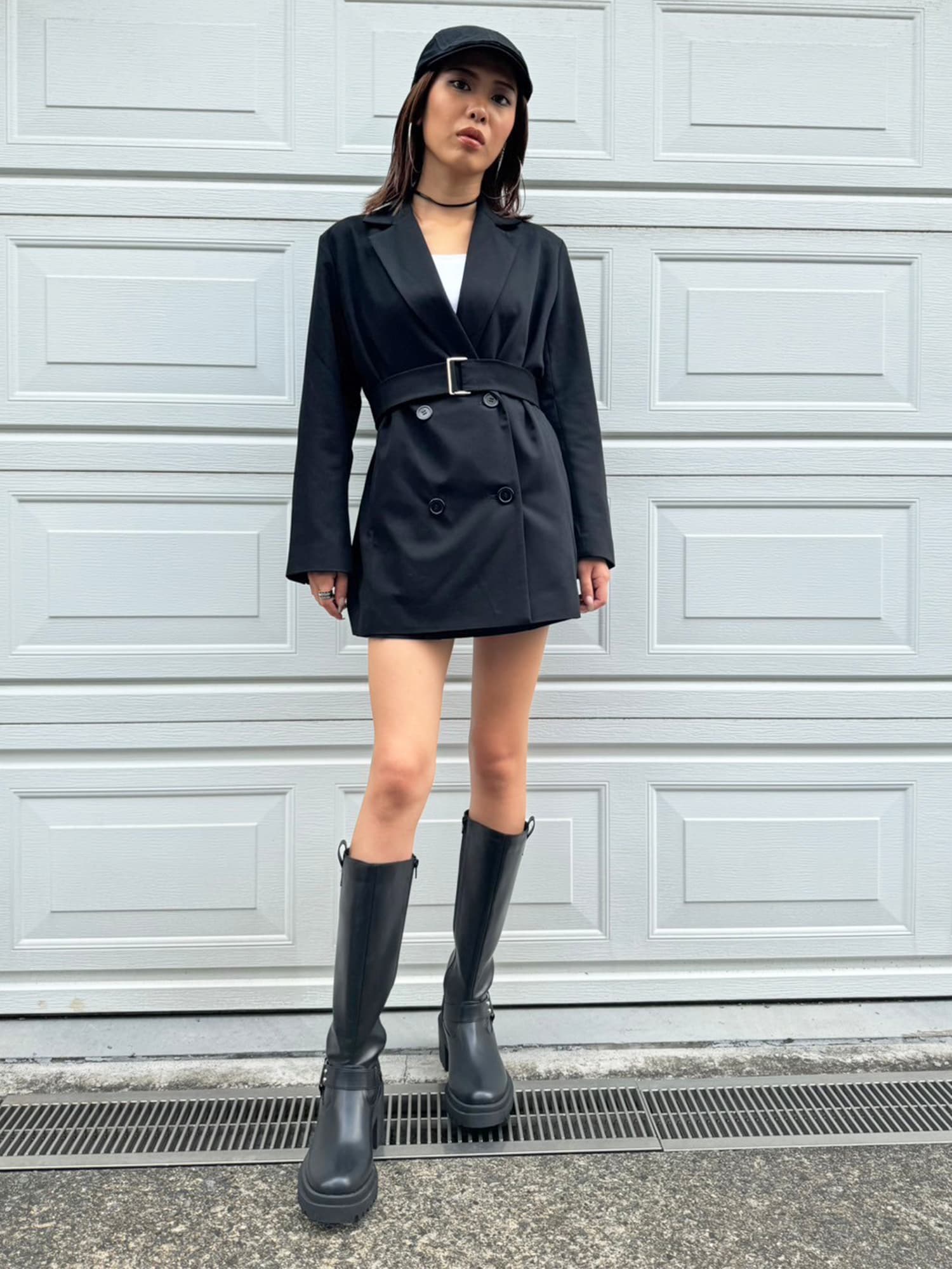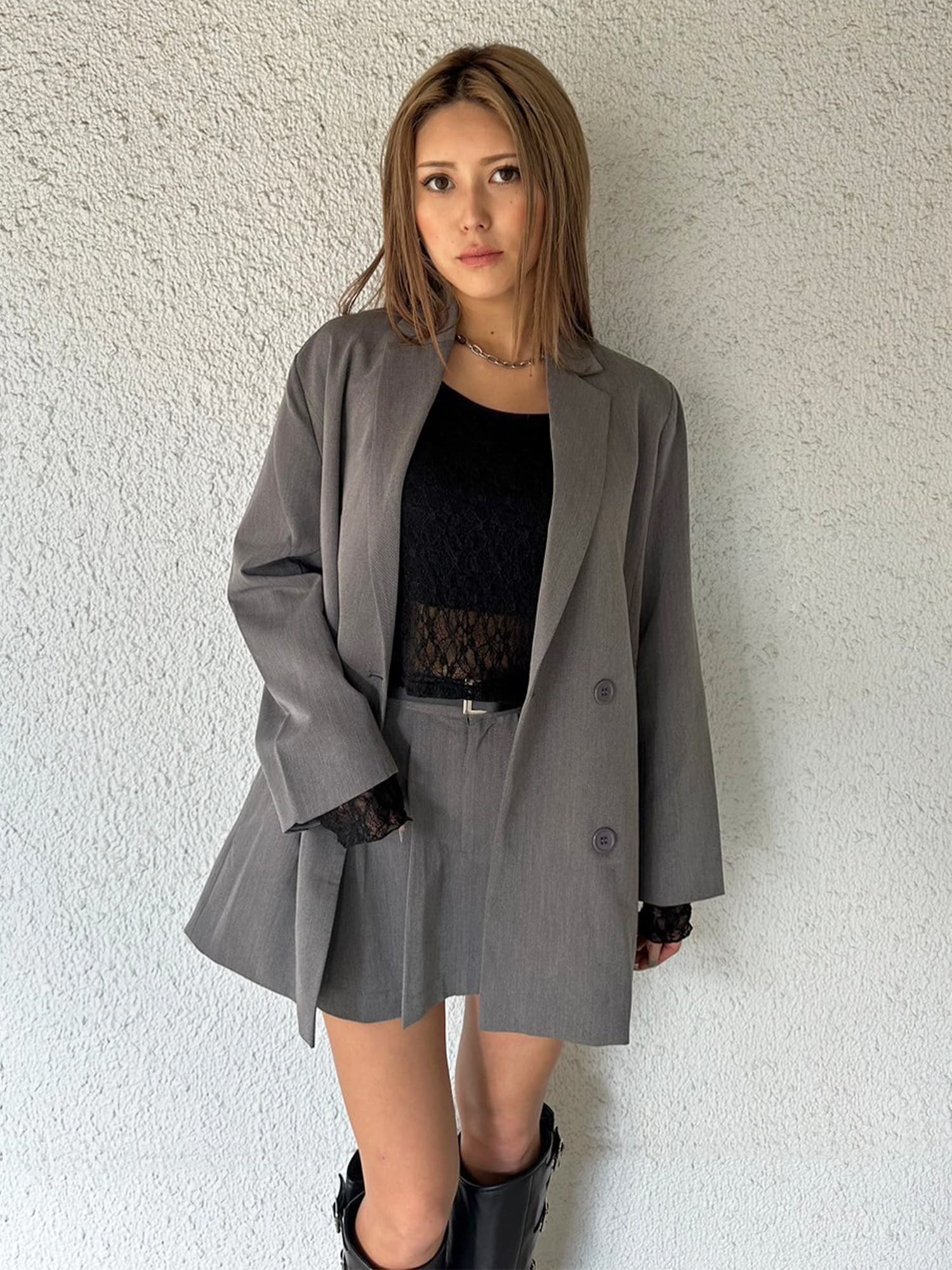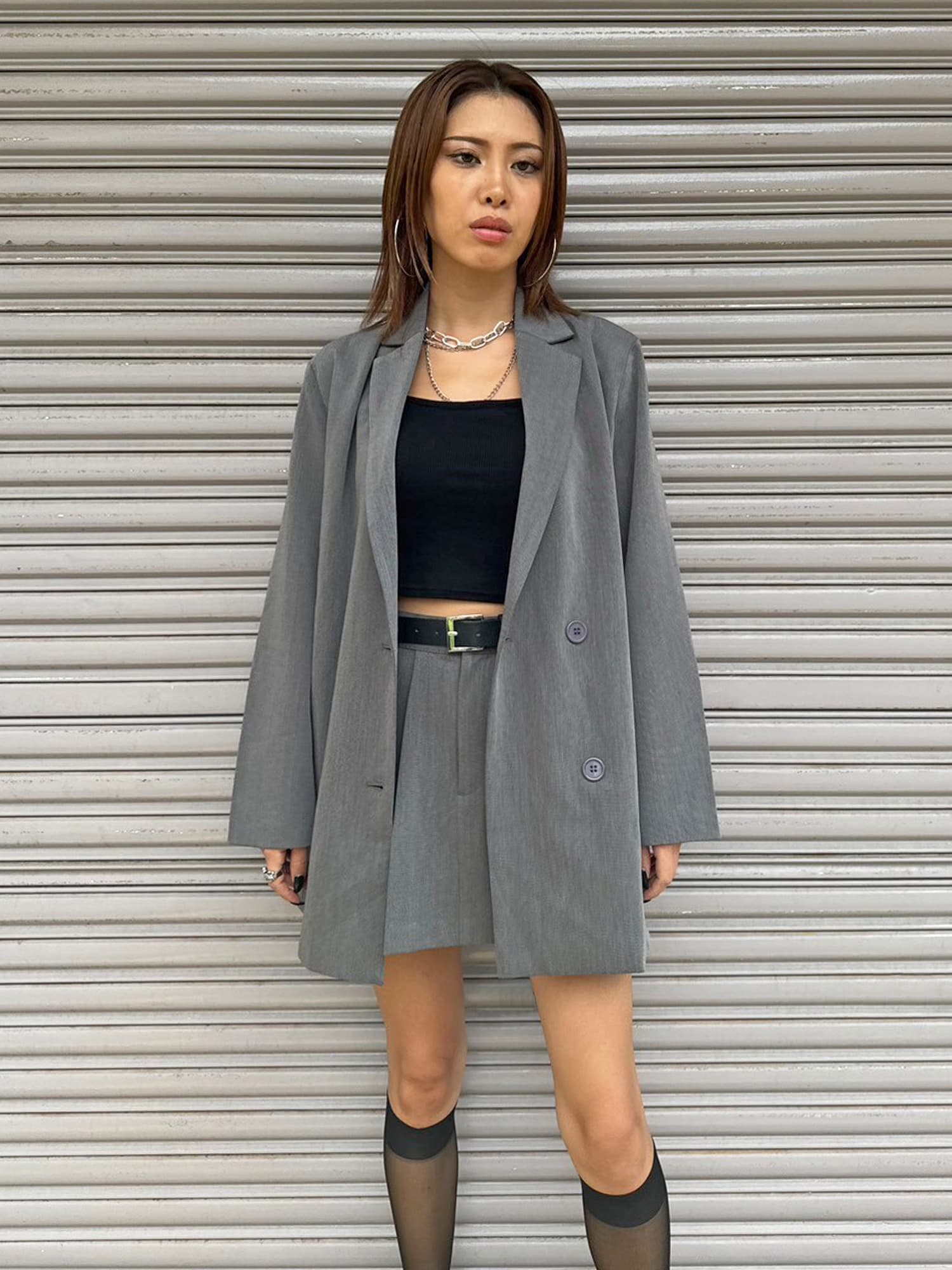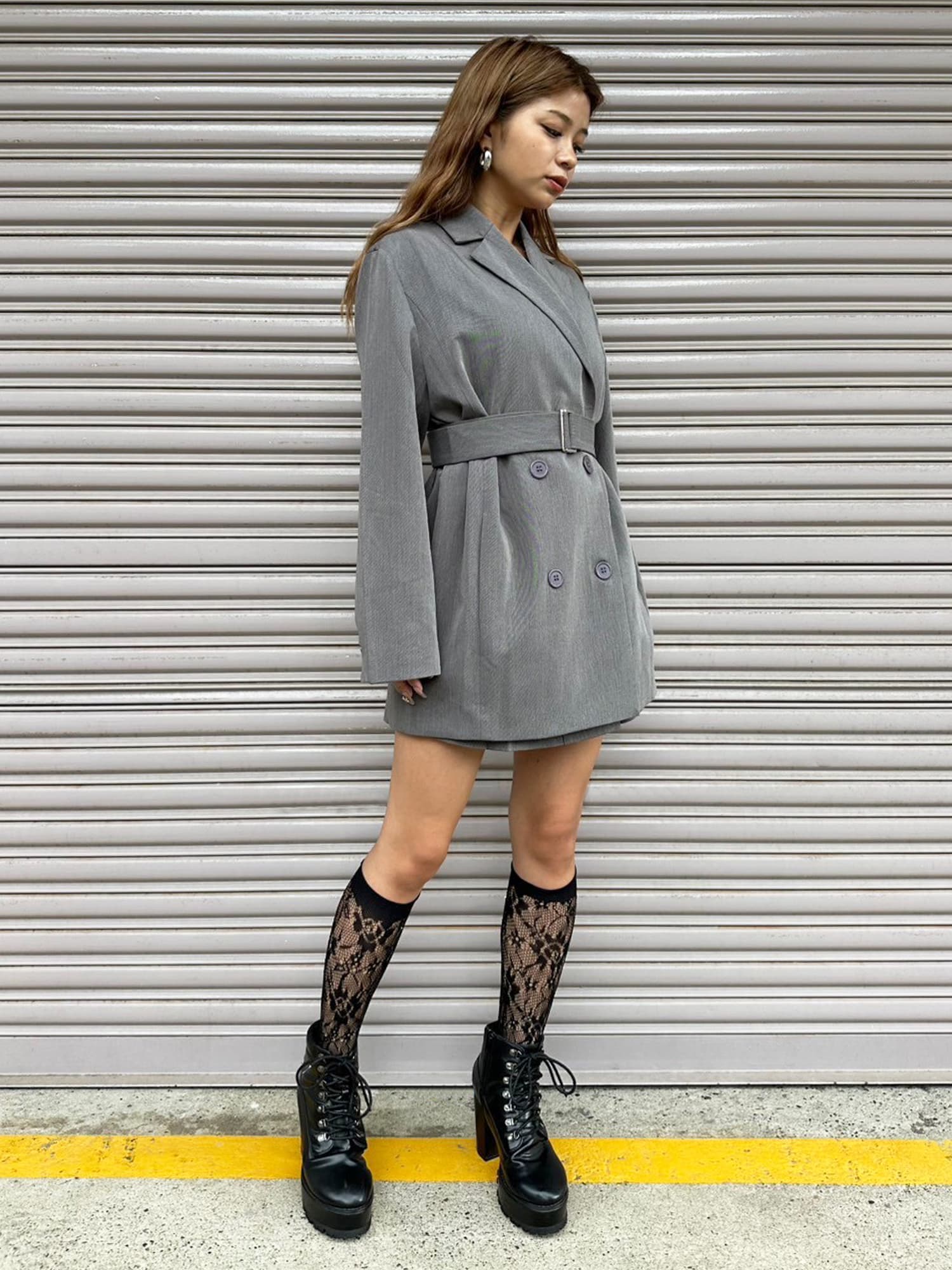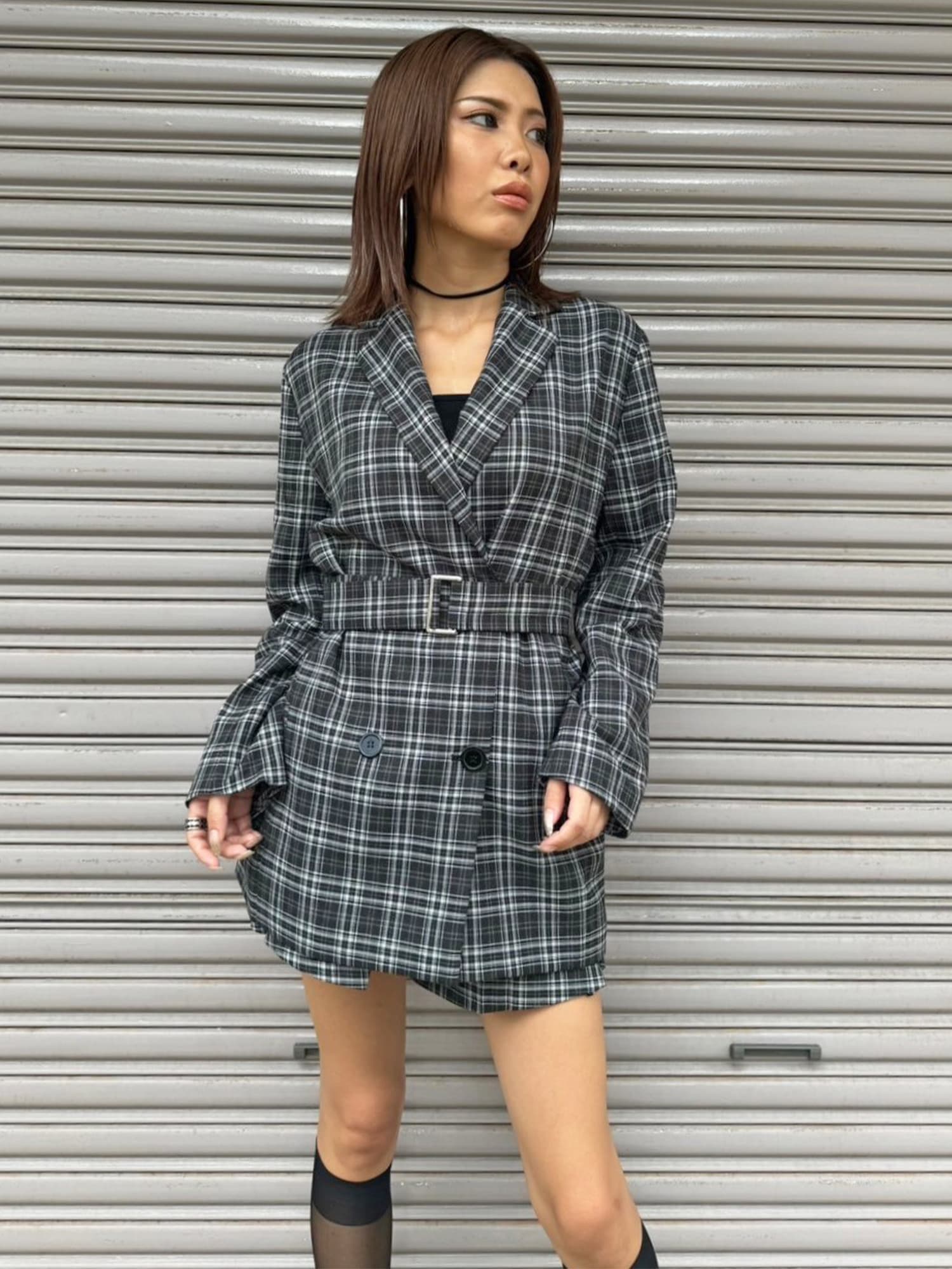 商品説明 スクエアのメタルバックルが付いた共地ベルトがワンポイントのダブルジャケット。