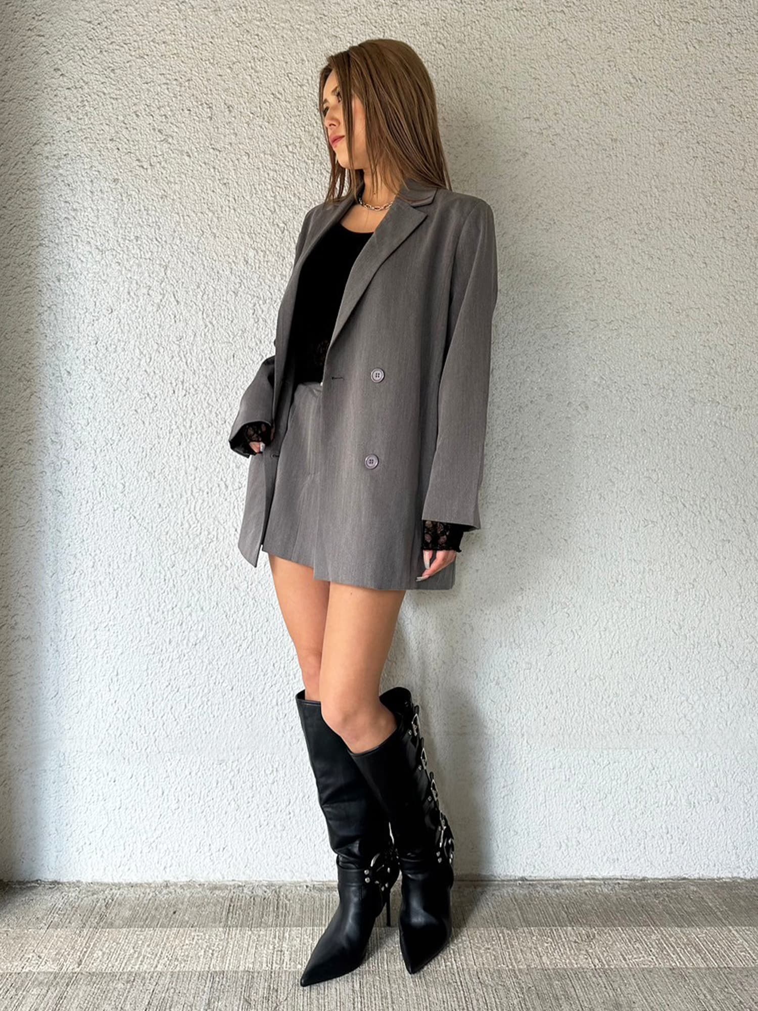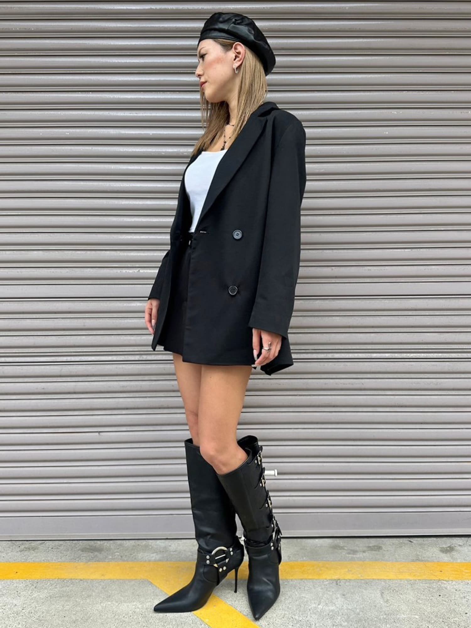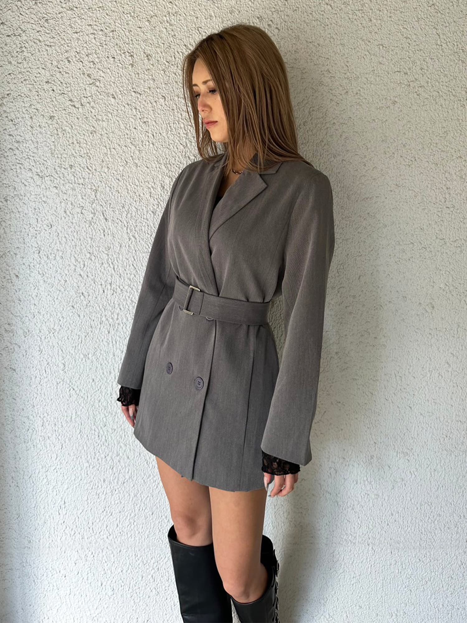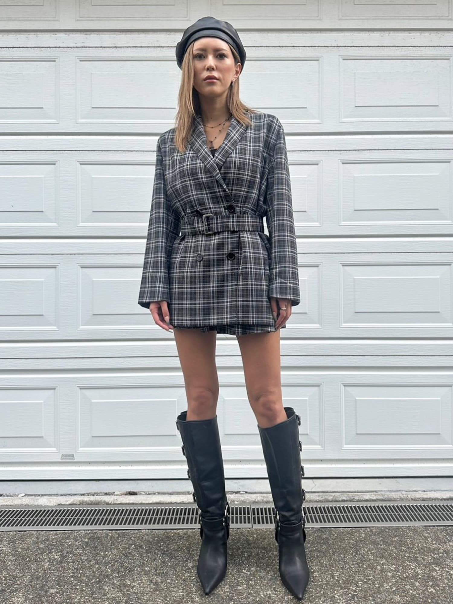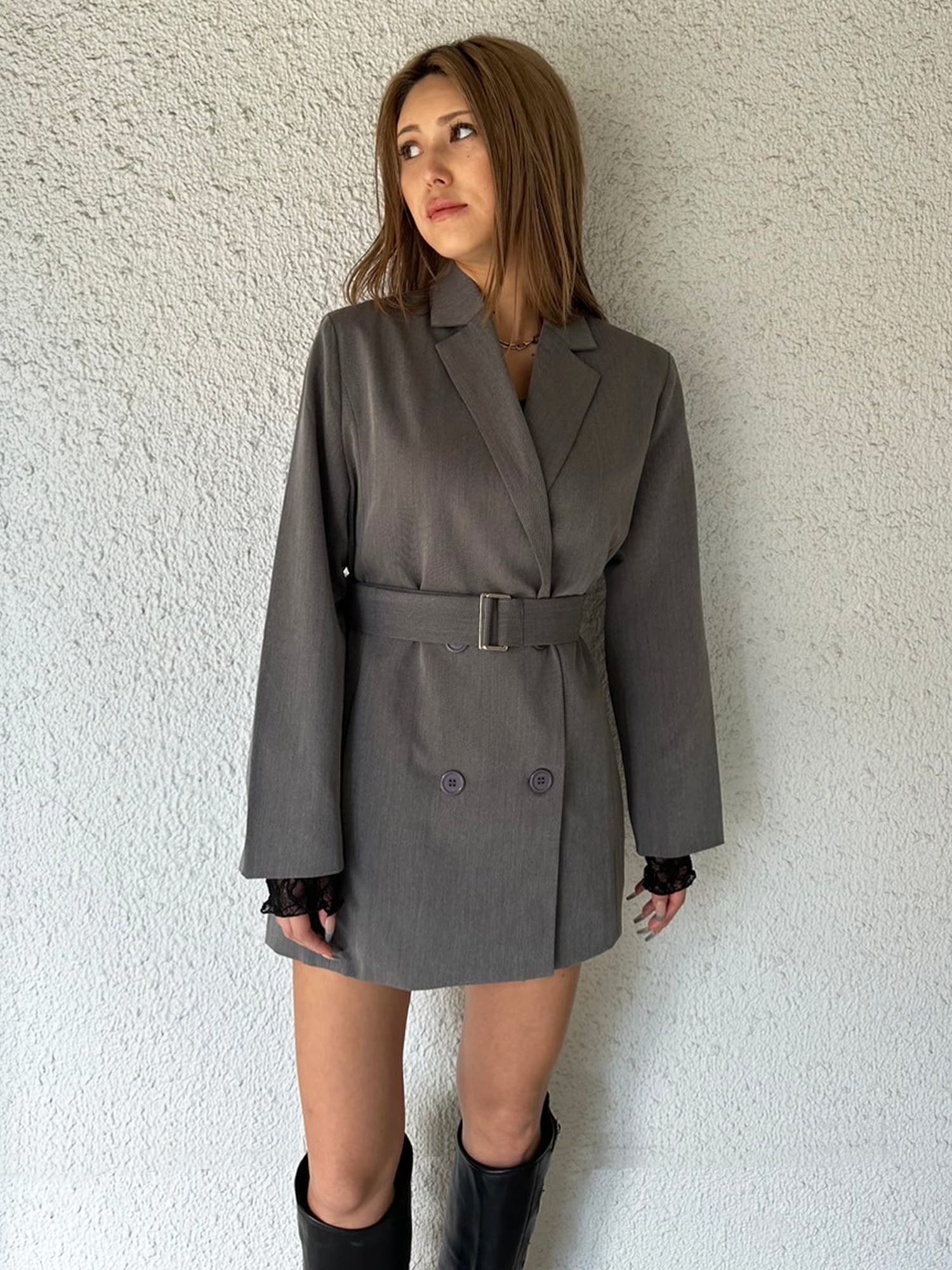 商品説明 スクエアのメタルバックルが付いた共地ベルトがワンポイントのダブルジャケット。