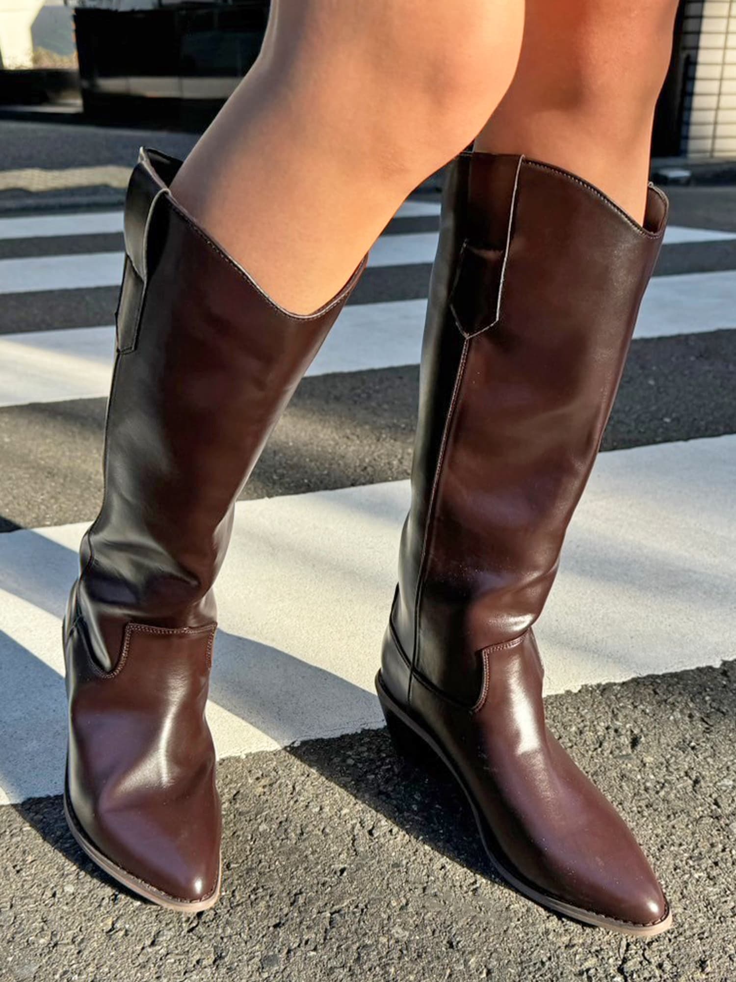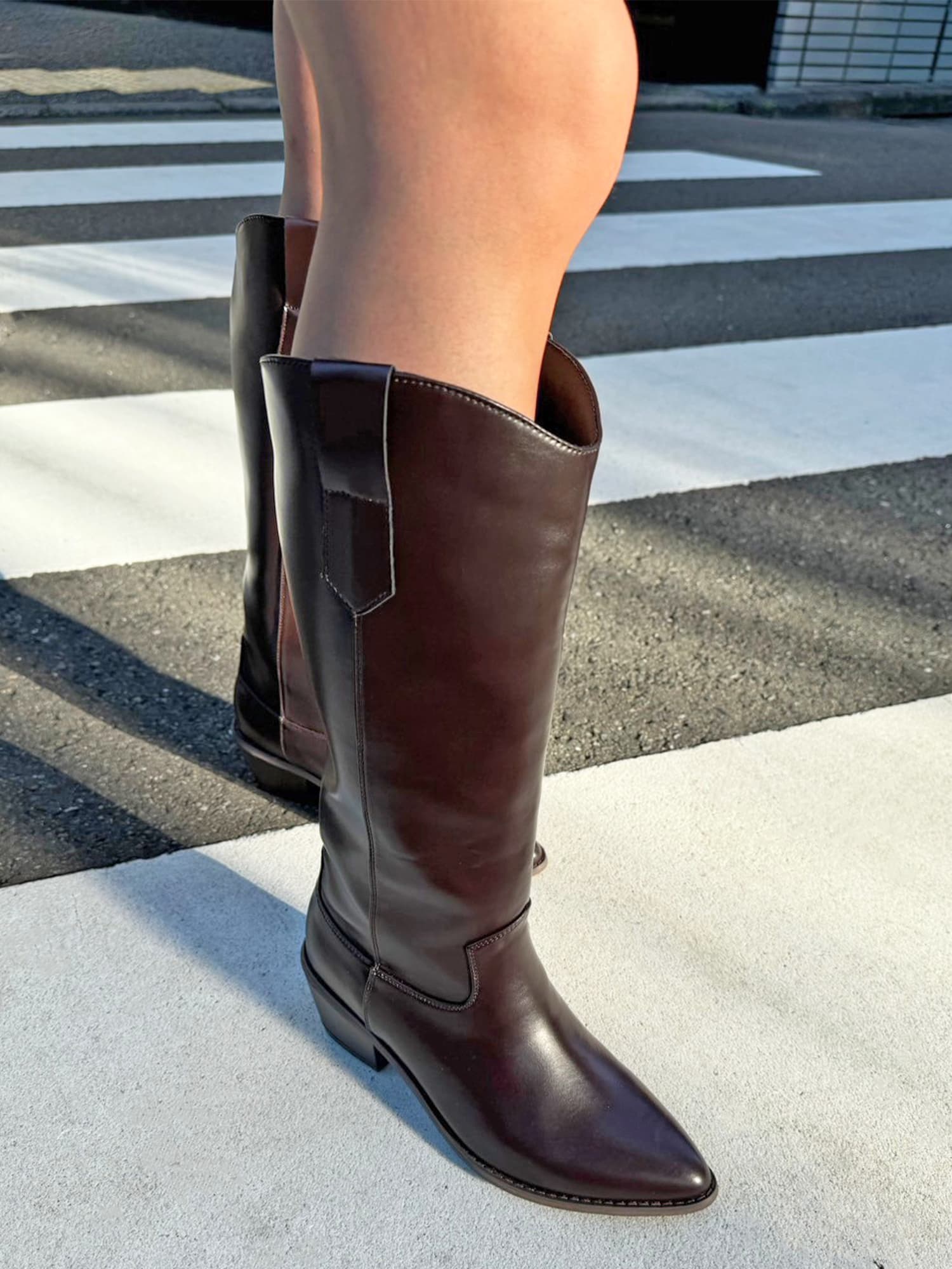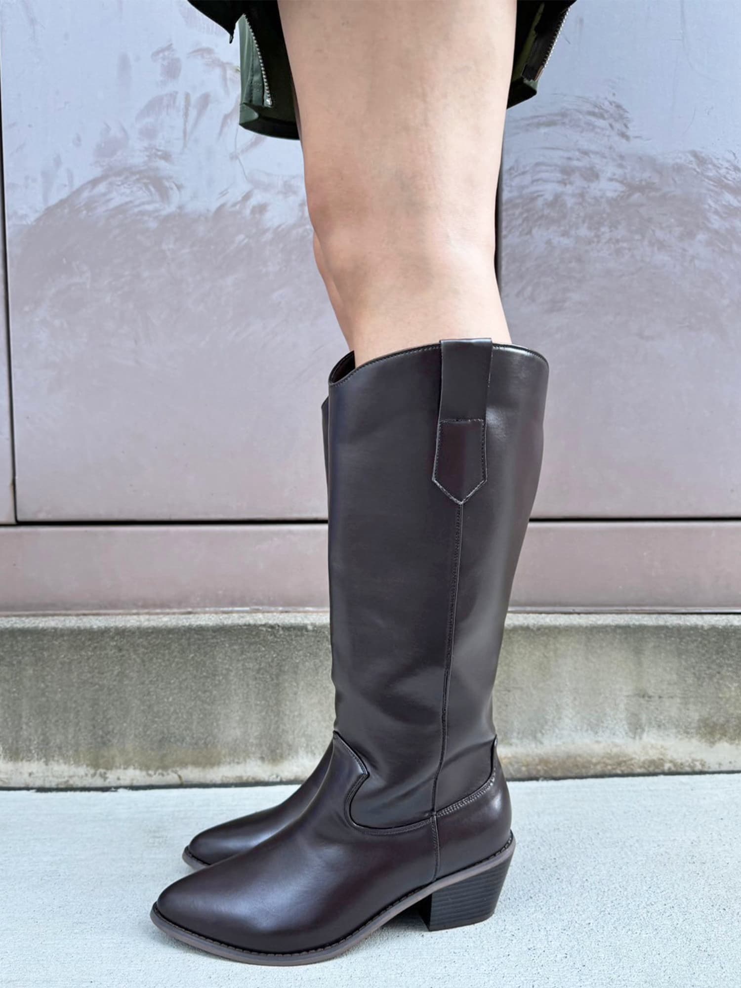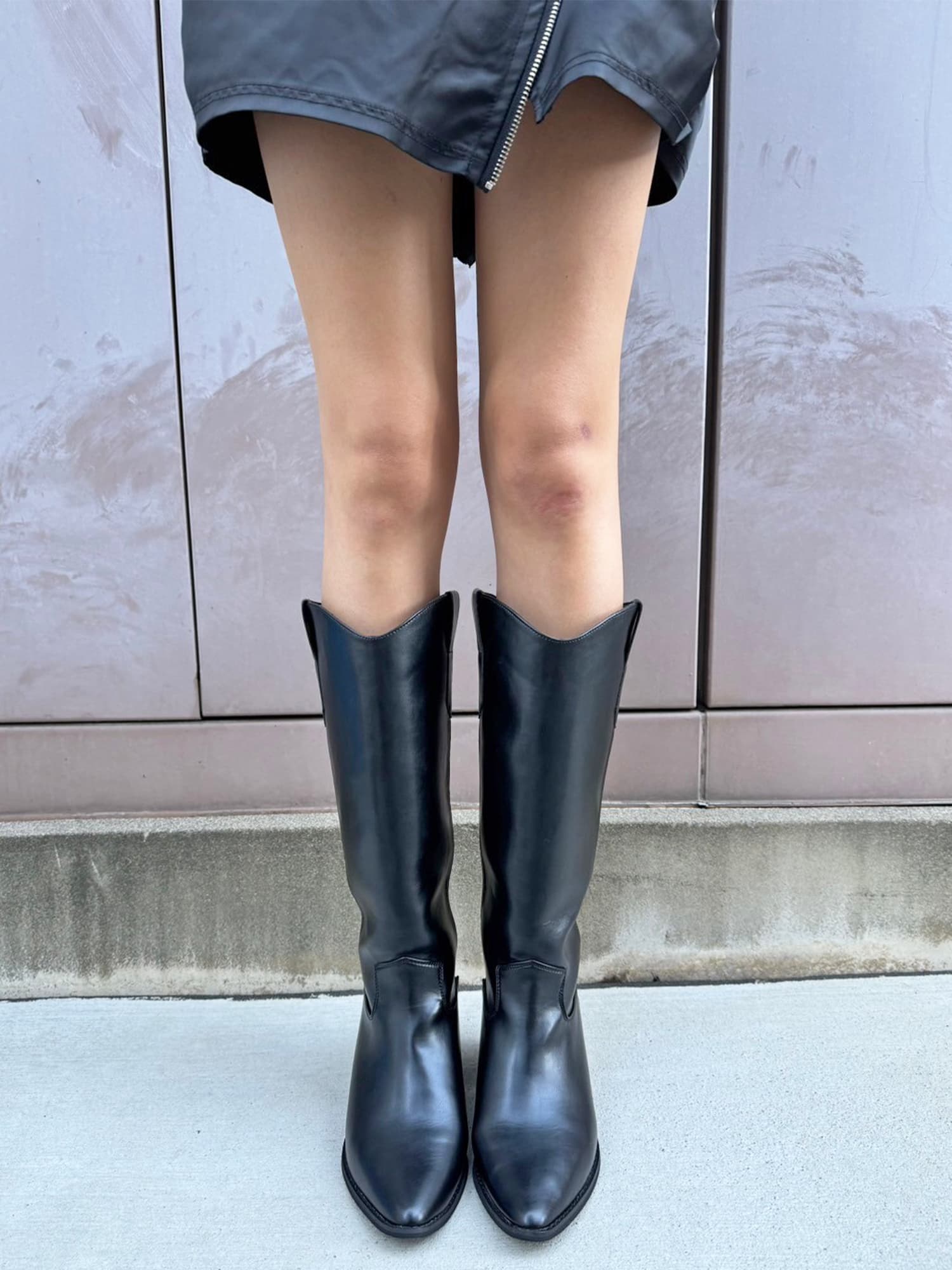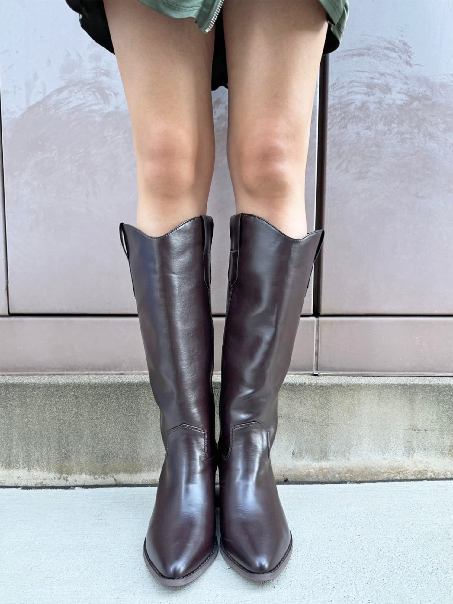 チャンキーヒールで安定感があるため長時間のお出かけでも快適にお過ごししていただけます。履き口が広めで履きやすいのと足細見えが狙えるところが嬉しいポイント。スキニーインやミニボトムスなど様々なコーデにピッタリです。先細のポインテッドトゥでウエスタン過ぎずキレイめな印象にもなる使い回し抜群なアイテム。