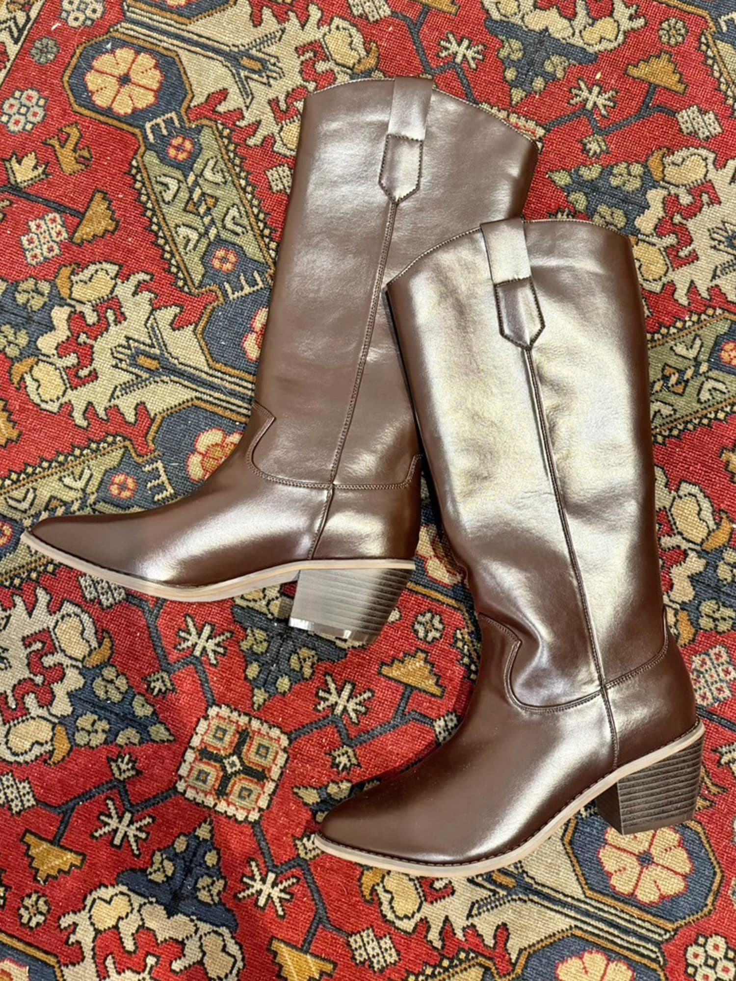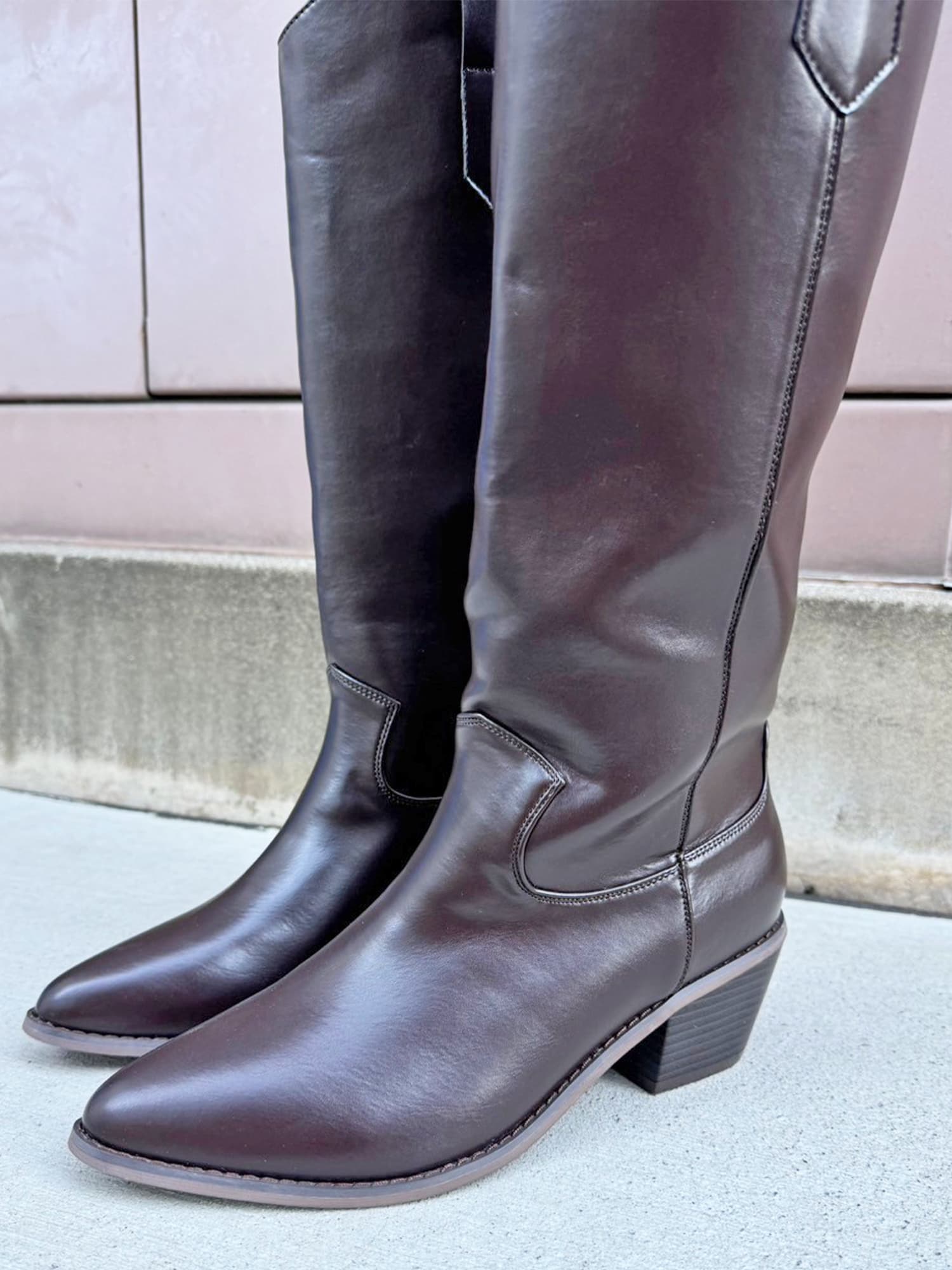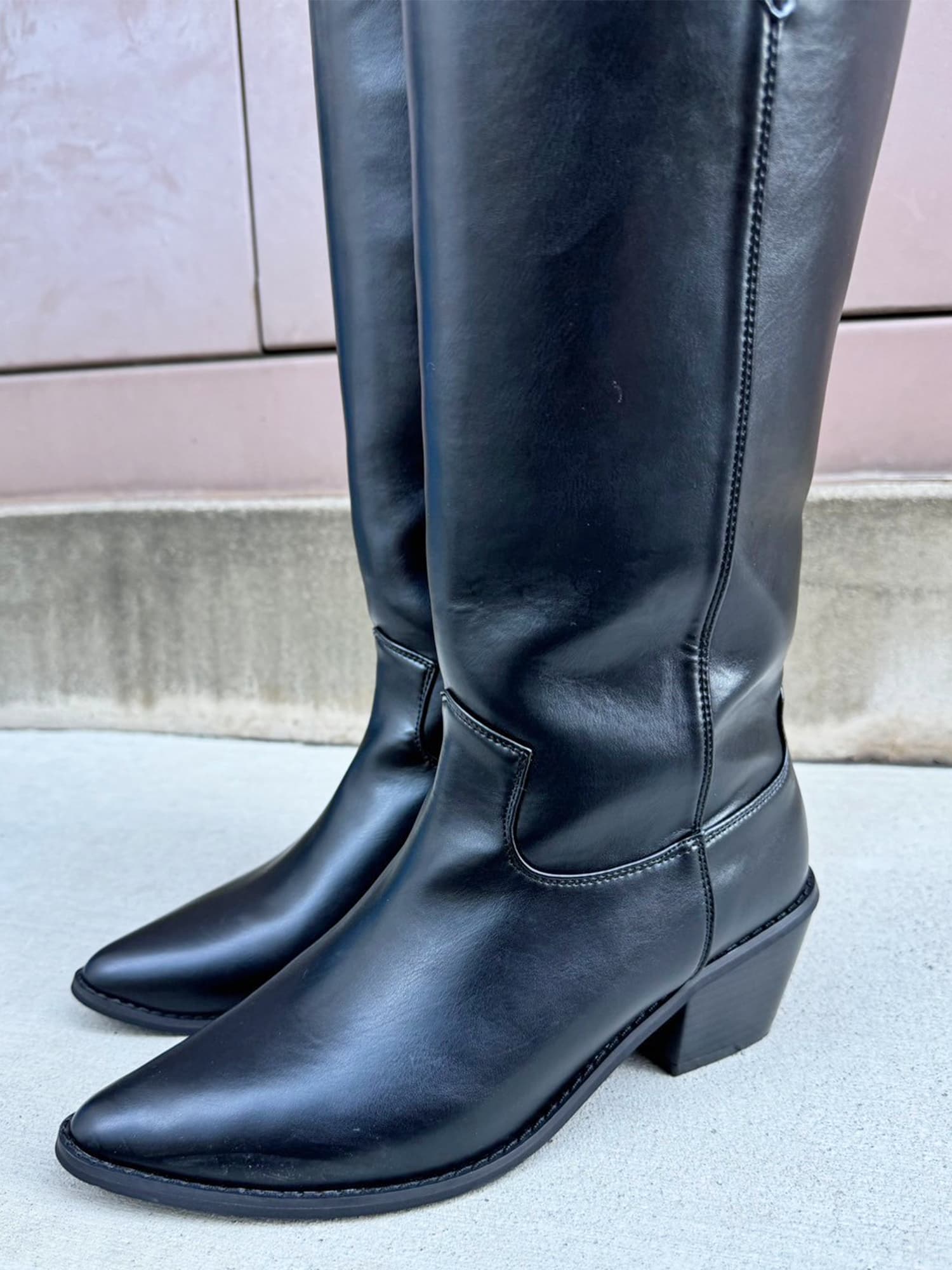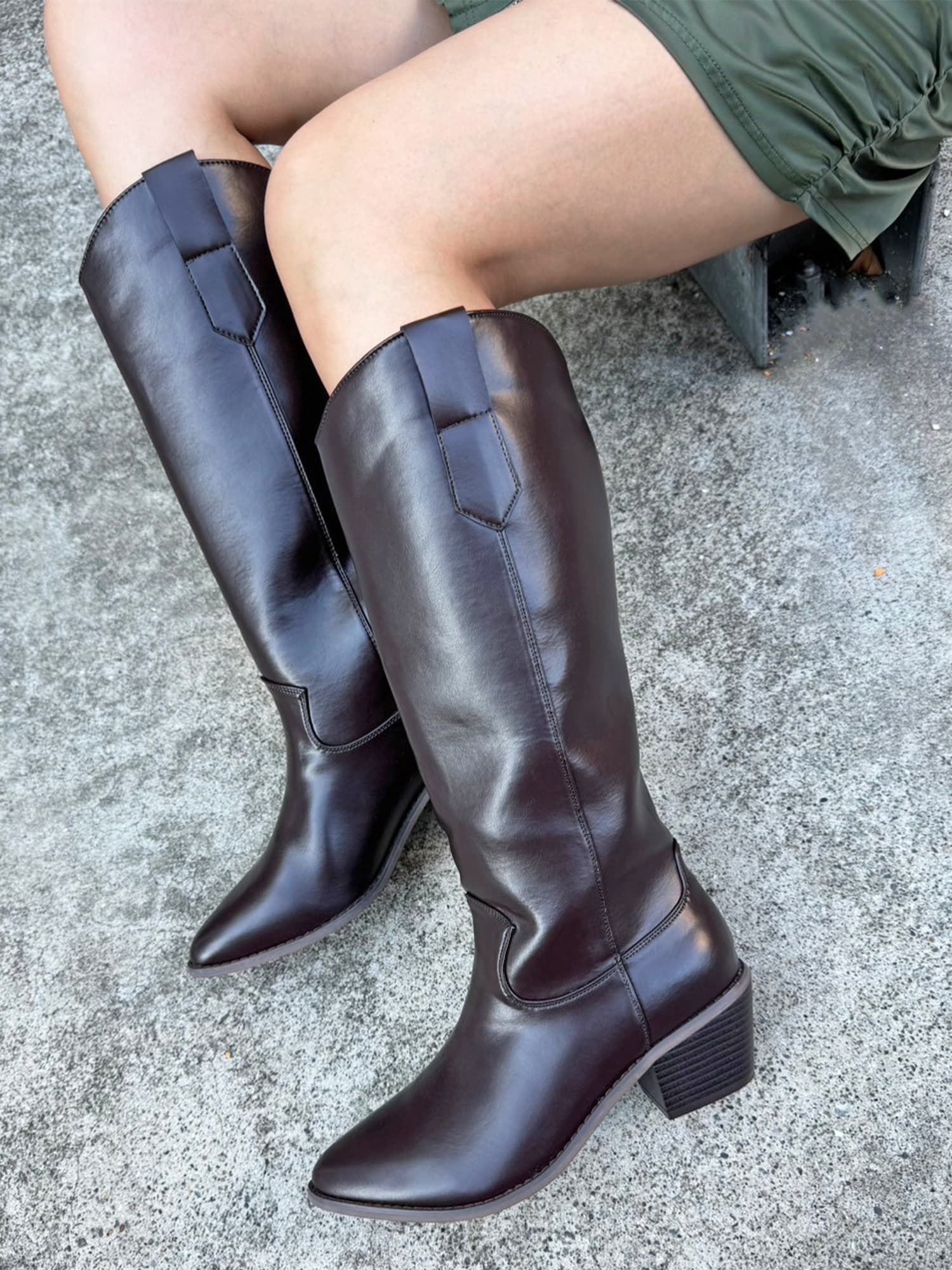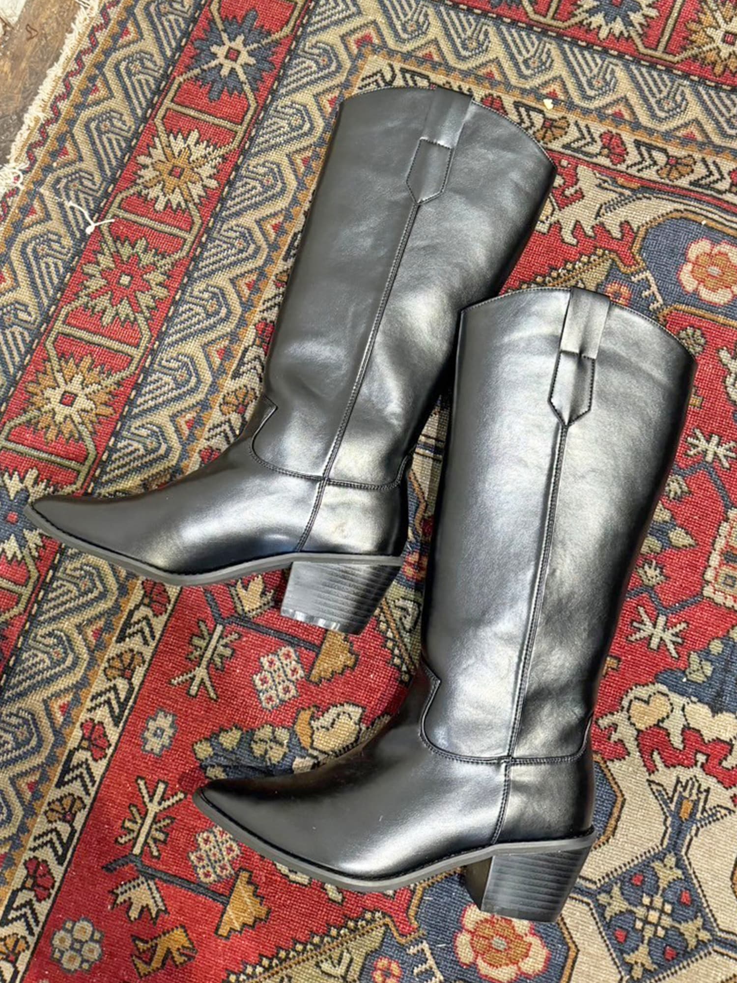 チャンキーヒールで安定感があるため長時間のお出かけでも快適にお過ごししていただけます。履き口が広めで履きやすいのと足細見えが狙えるところが嬉しいポイント。スキニーインやミニボトムスなど様々なコーデにピッタリです。先細のポインテッドトゥでウエスタン過ぎずキレイめな印象にもなる使い回し抜群なアイテム。