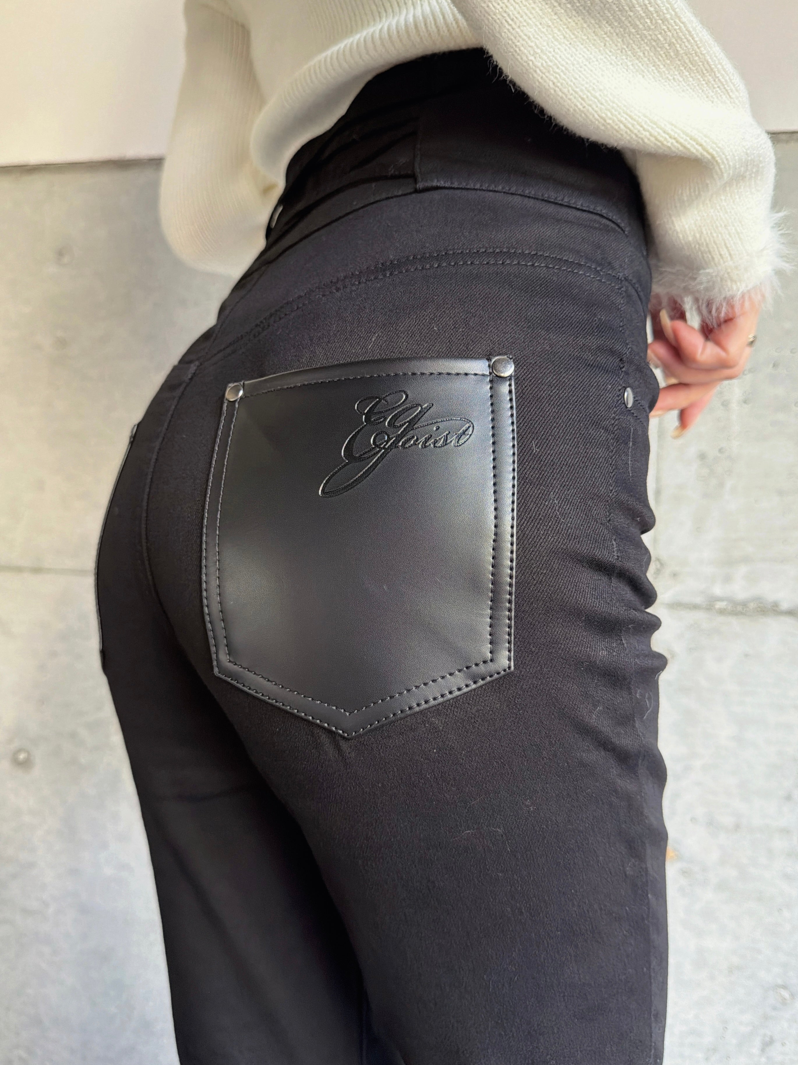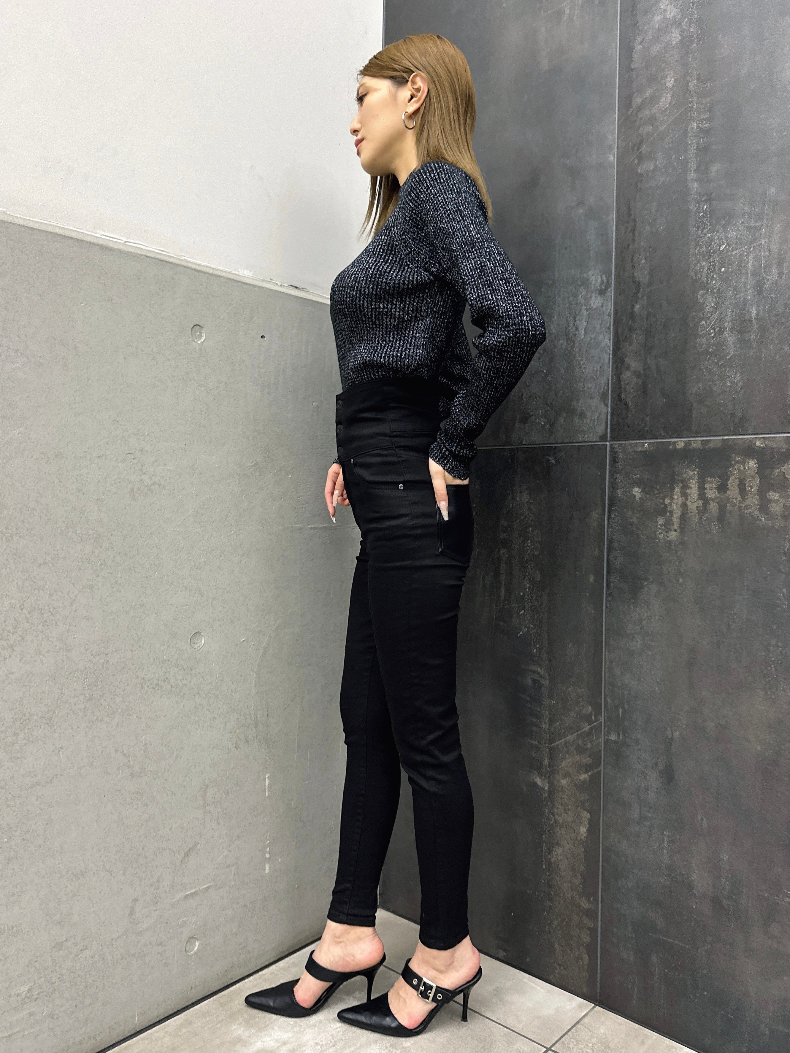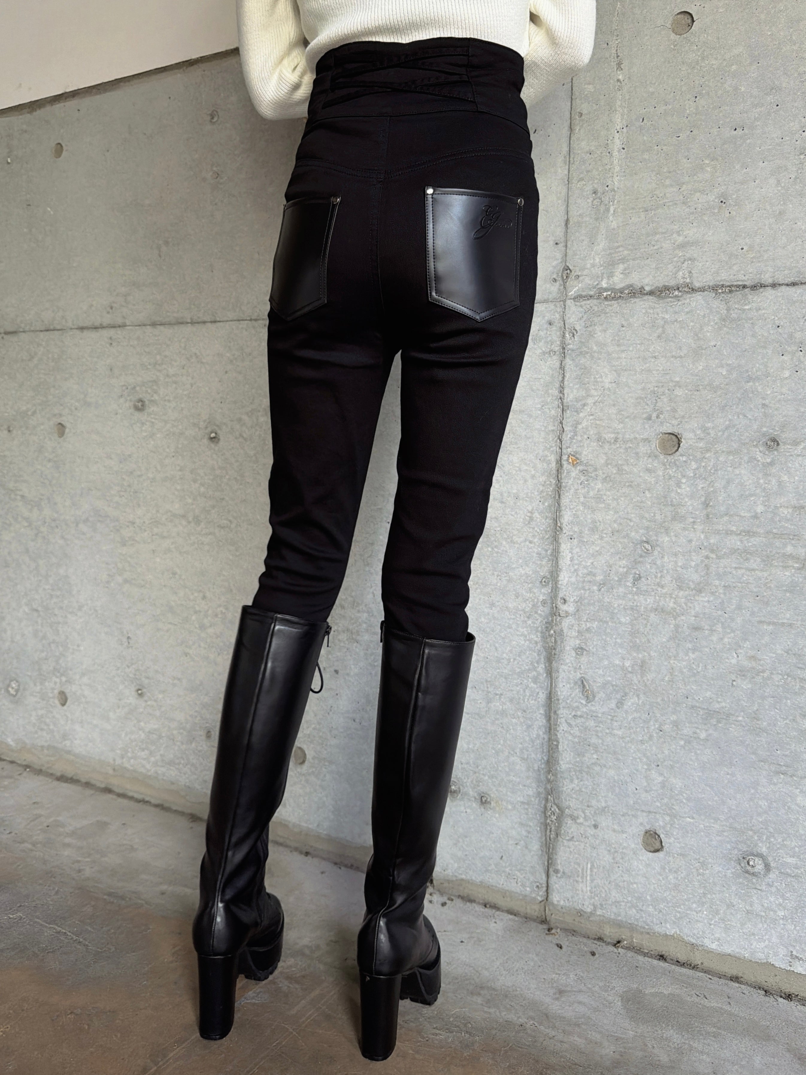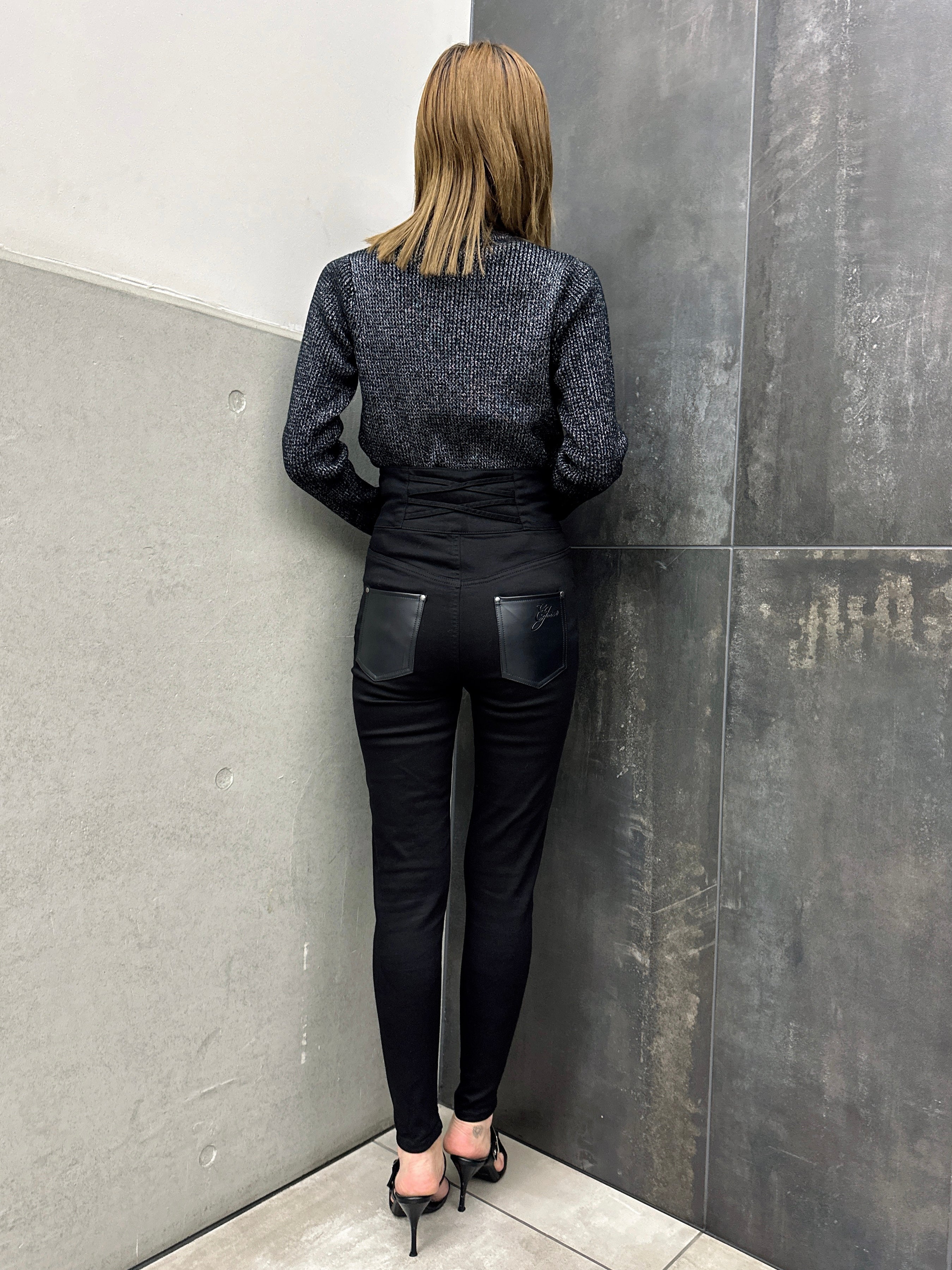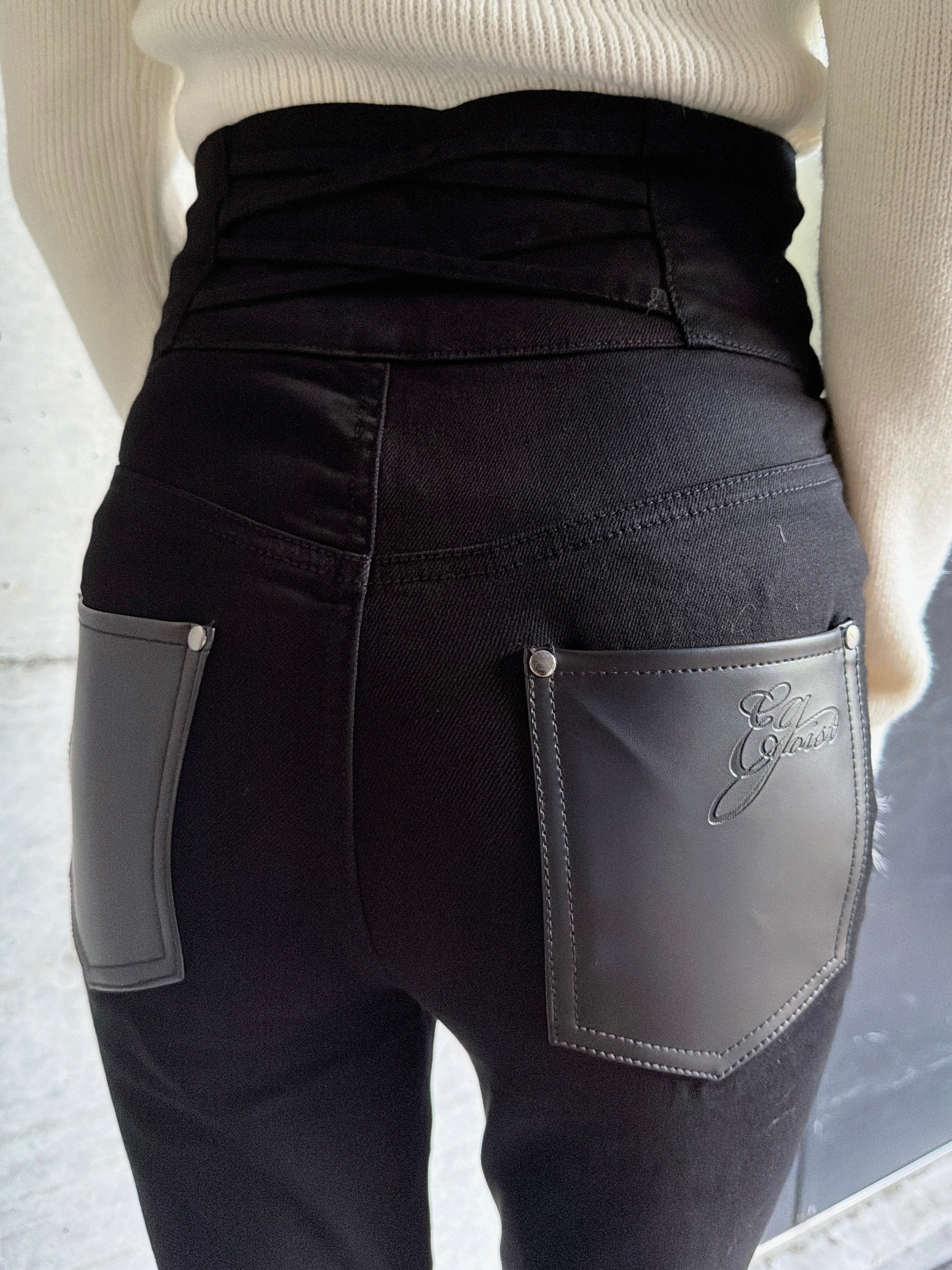 Backウエストのダブルクロスとフェイクレザーポケットがデザインポイントになっているハイウエストスキニーパンツ。フェイクレザーポケットにはオリジナルロゴを刻印し、オリジナリティ溢れる1着に仕上げました。ウエストをシェイプしたシルエットが女性らしいメリハリを演出。ヒップから裾にかけてピタっとフィットし足のラインを引き立ててくれるので、履くだけで自然とスタイルアップ効果が期待できます。細身でもポリウレタン3%配合しているので、伸縮性があり動きやすく着脱もしやすいです。引き締まってみえるBLACKカラーでクールな印象に。タイトトップスをINしてすっきりみせるスタイリングや短丈ボリュームトップスでメリハリをつけるスタイリングがオススメ。程よい厚みの生地感を選んでいるので、通年愛用していただけます。キレイめコーデでまとめたい方はピンヒールブーツやミュール合わせがオススメ。