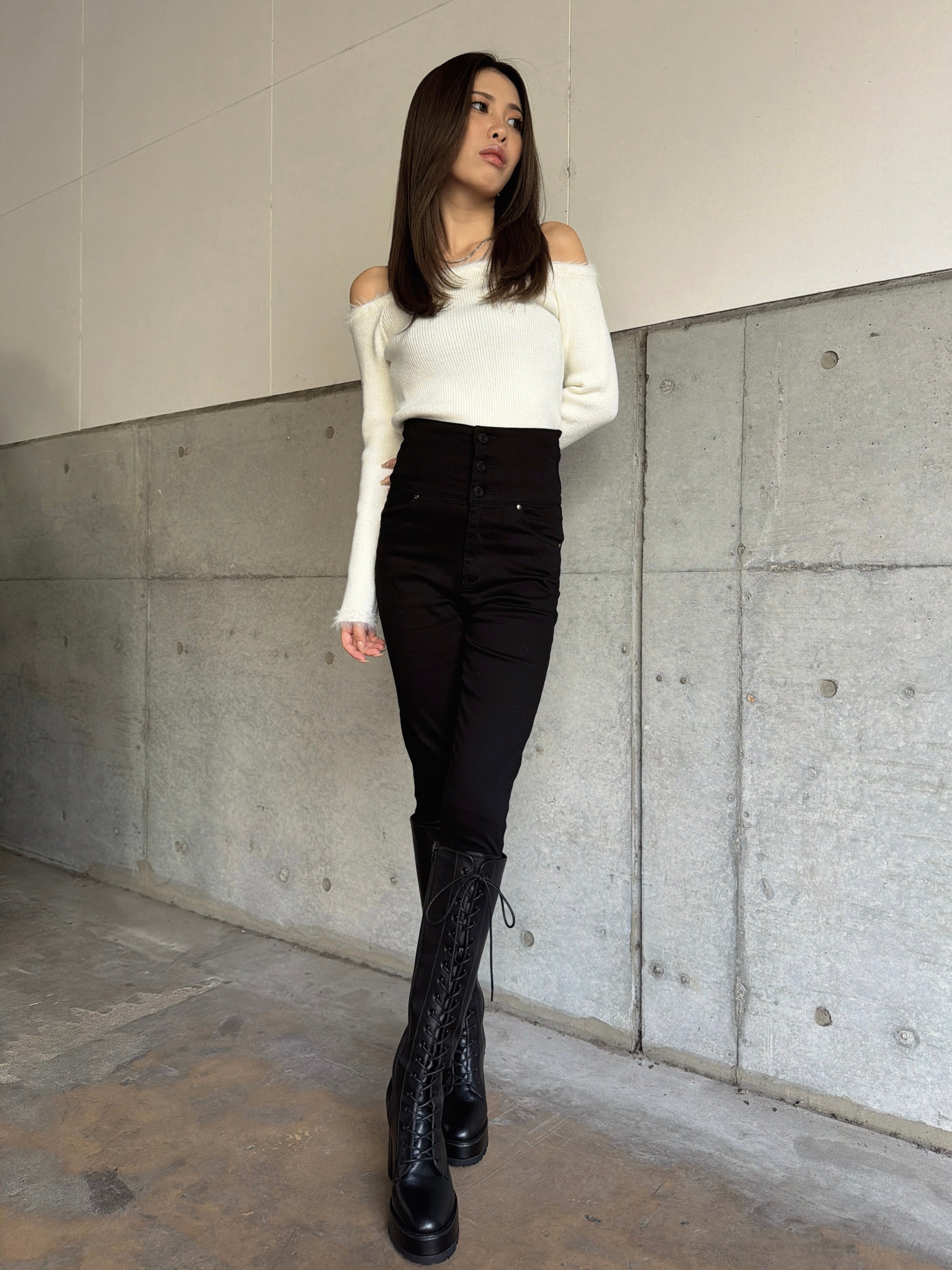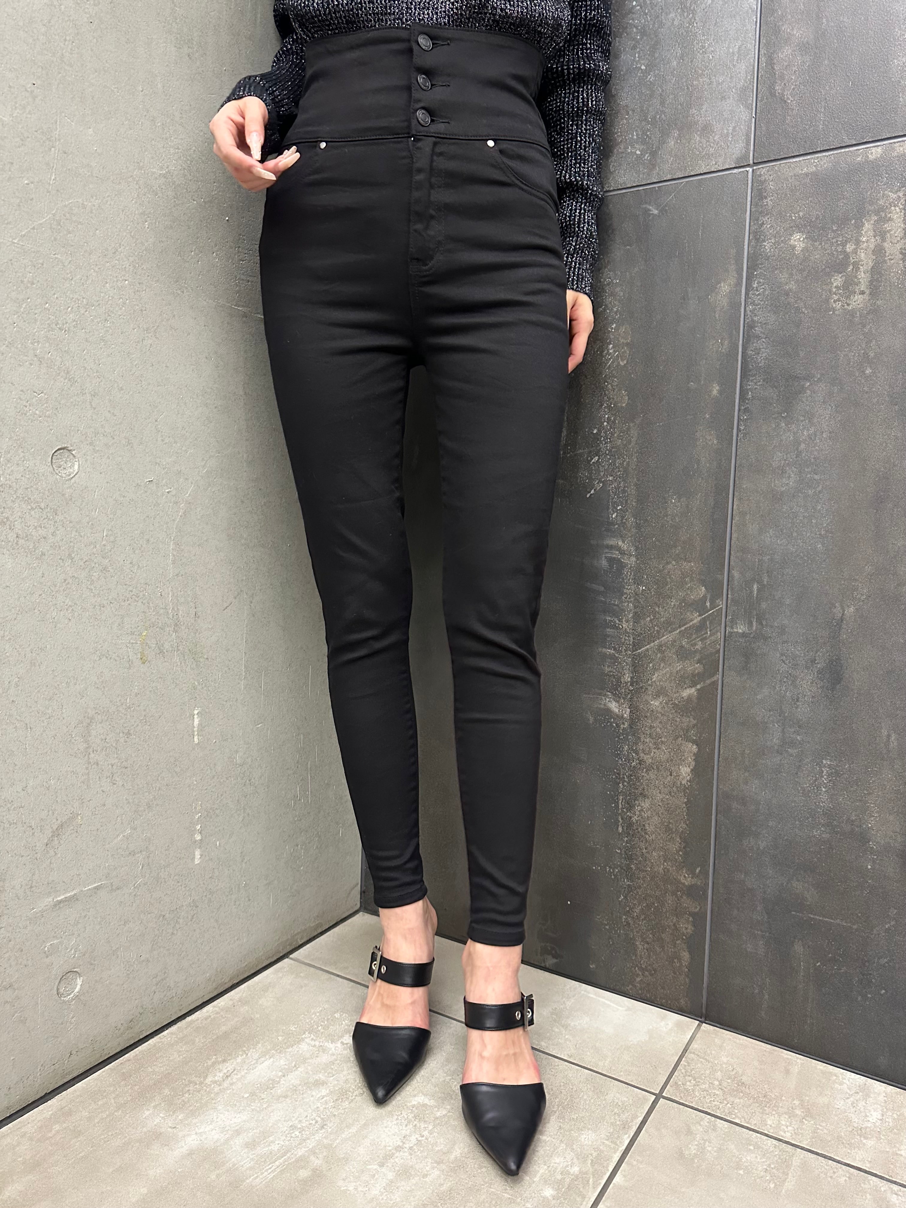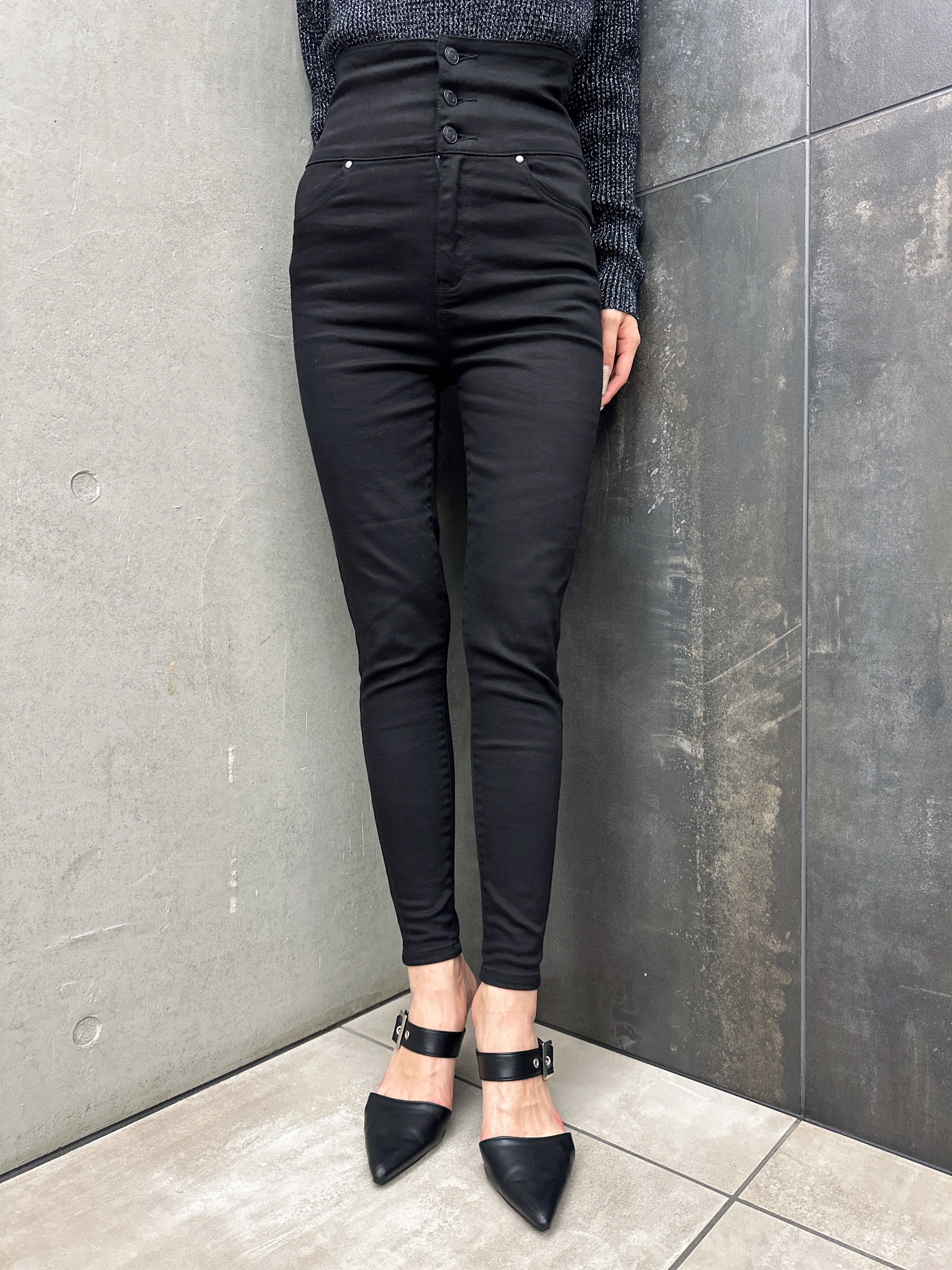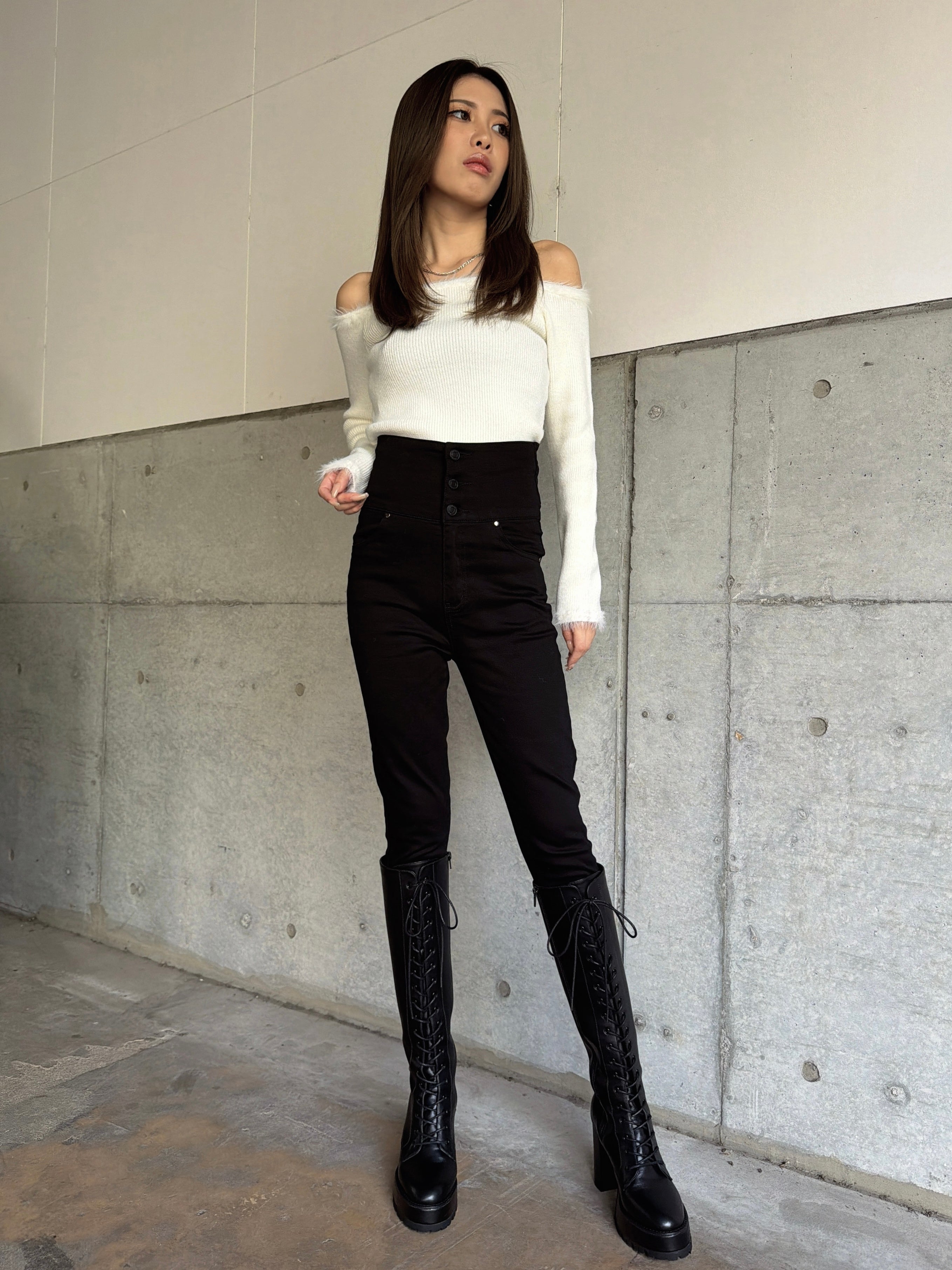 Backウエストのダブルクロスとフェイクレザーポケットがデザインポイントになっているハイウエストスキニーパンツ。フェイクレザーポケットにはオリジナルロゴを刻印し、オリジナリティ溢れる1着に仕上げました。ウエストをシェイプしたシルエットが女性らしいメリハリを演出。ヒップから裾にかけてピタっとフィットし足のラインを引き立ててくれるので、履くだけで自然とスタイルアップ効果が期待できます。細身でもポリウレタン3%配合しているので、伸縮性があり動きやすく着脱もしやすいです。引き締まってみえるBLACKカラーでクールな印象に。タイトトップスをINしてすっきりみせるスタイリングや短丈ボリュームトップスでメリハリをつけるスタイリングがオススメ。程よい厚みの生地感を選んでいるので、通年愛用していただけます。キレイめコーデでまとめたい方はピンヒールブーツやミュール合わせがオススメ。