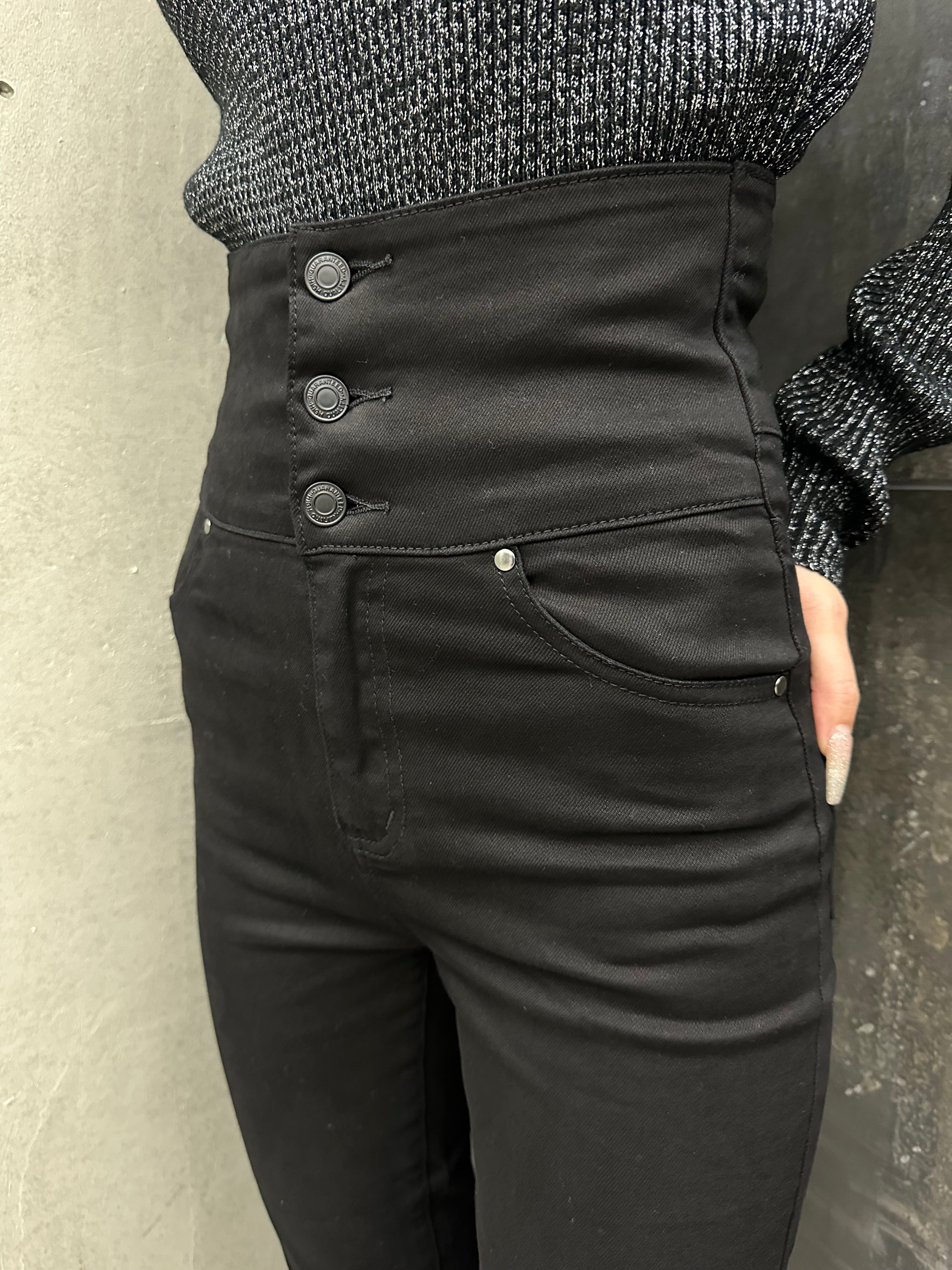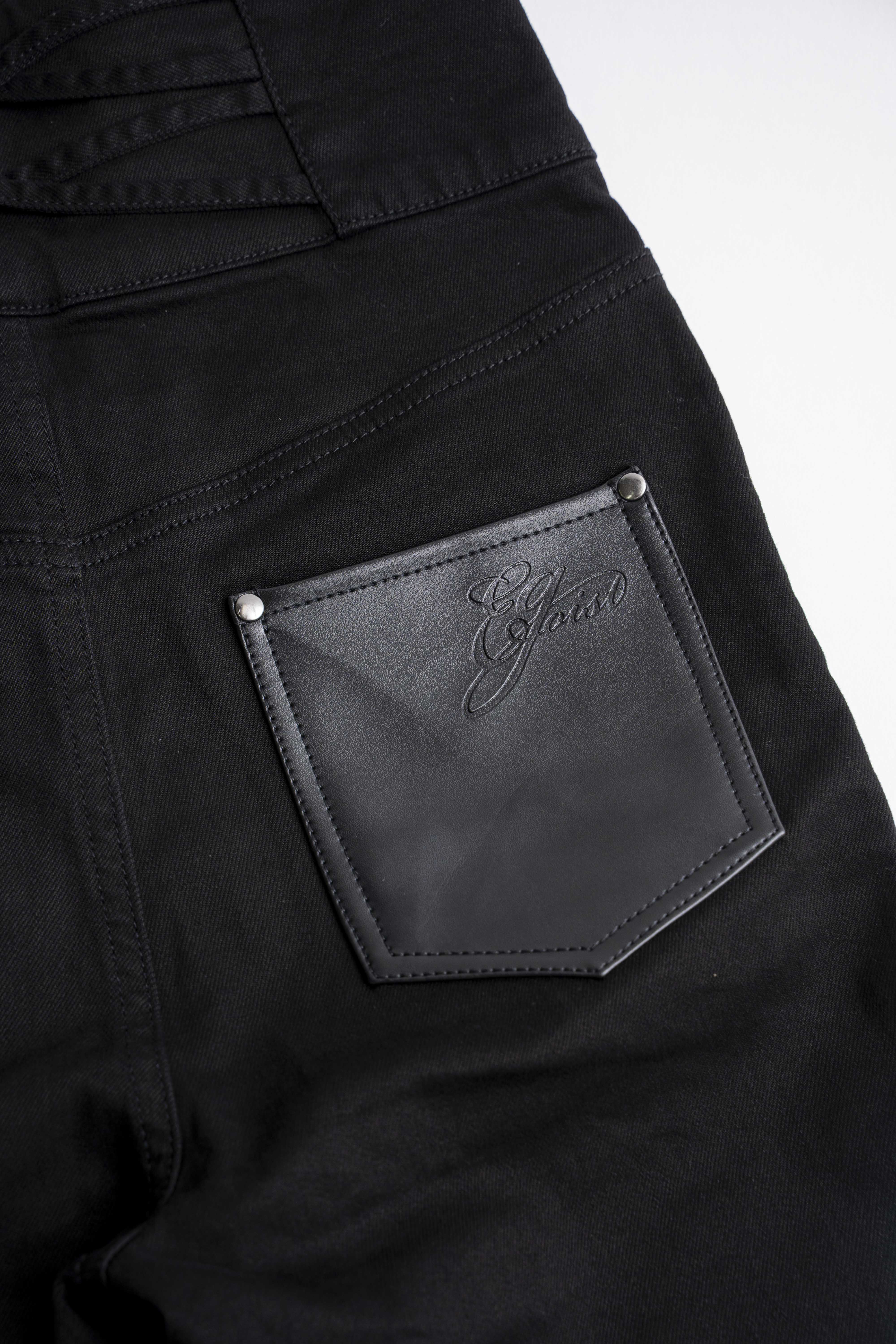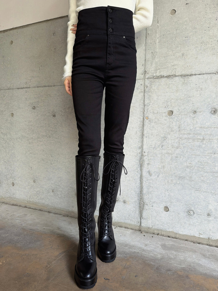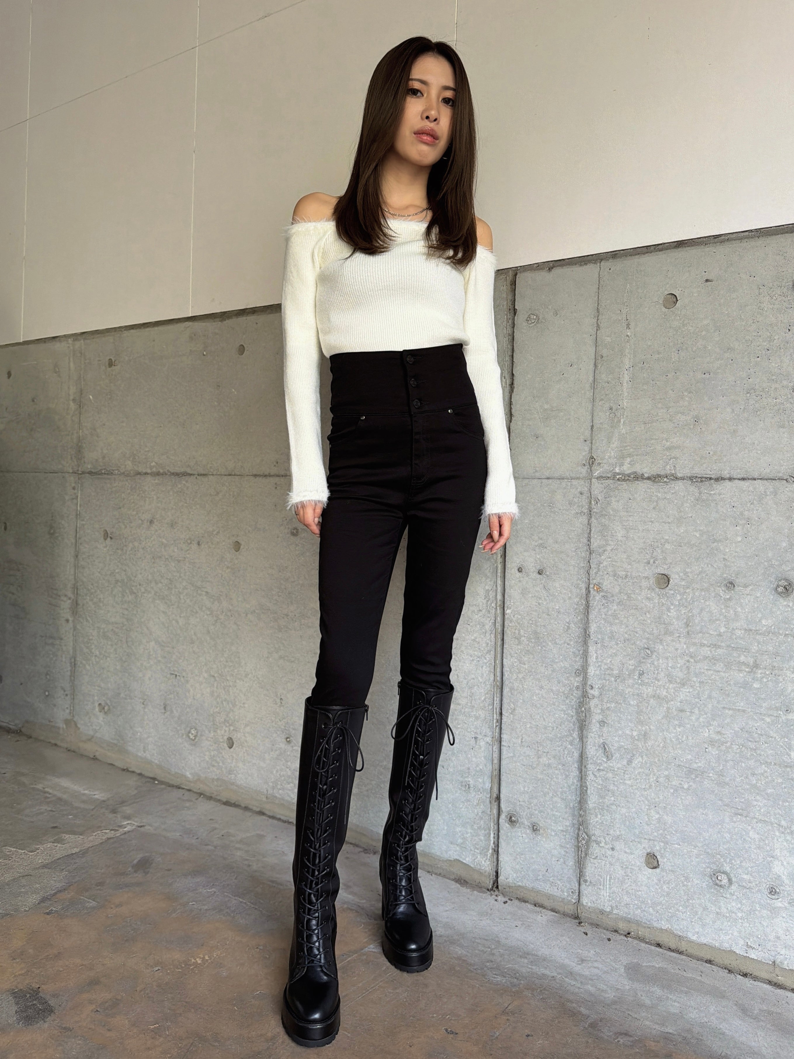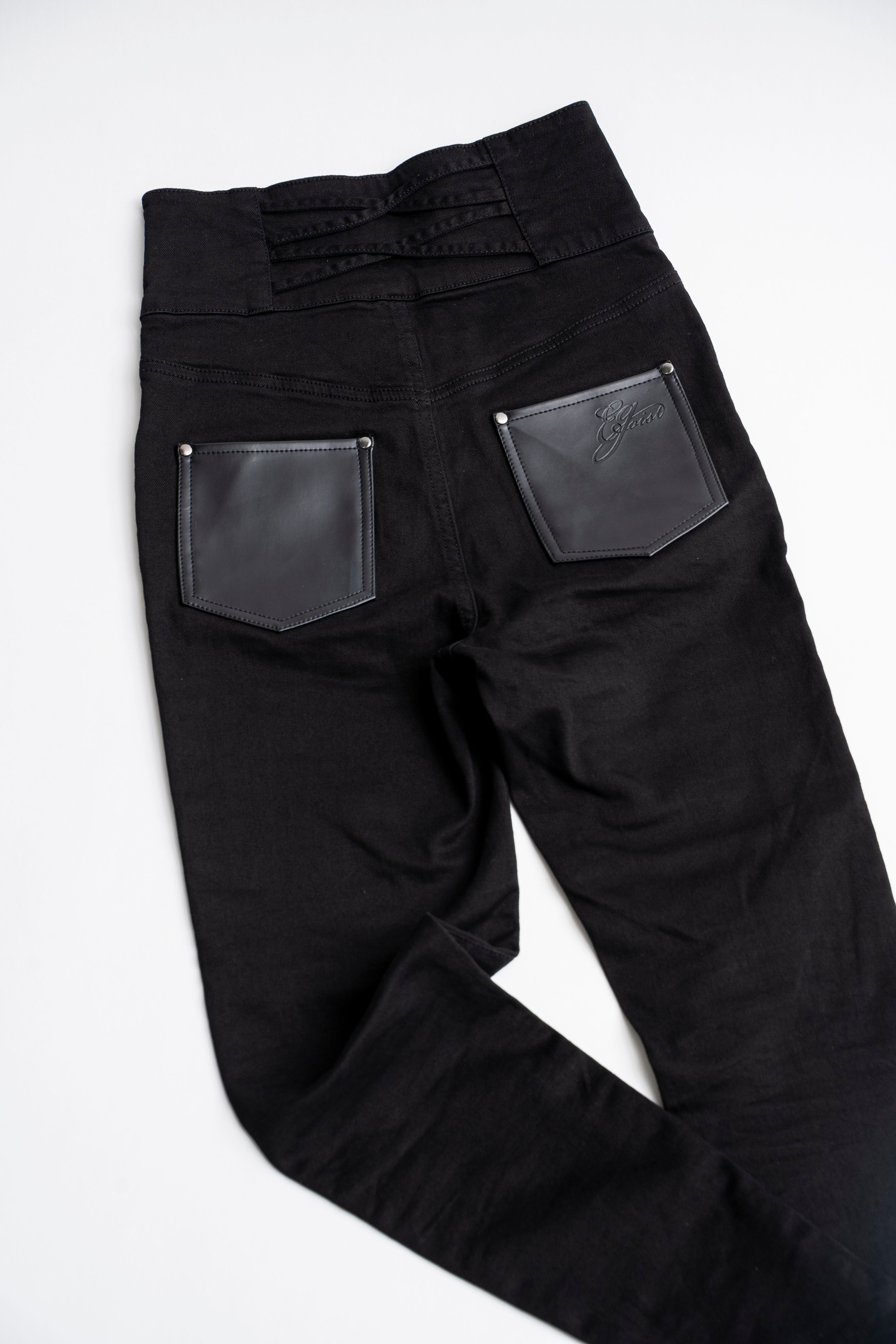 Backウエストのダブルクロスとフェイクレザーポケットがデザインポイントになっているハイウエストスキニーパンツ。フェイクレザーポケットにはオリジナルロゴを刻印し、オリジナリティ溢れる1着に仕上げました。ウエストをシェイプしたシルエットが女性らしいメリハリを演出。ヒップから裾にかけてピタっとフィットし足のラインを引き立ててくれるので、履くだけで自然とスタイルアップ効果が期待できます。細身でもポリウレタン3%配合しているので、伸縮性があり動きやすく着脱もしやすいです。引き締まってみえるBLACKカラーでクールな印象に。タイトトップスをINしてすっきりみせるスタイリングや短丈ボリュームトップスでメリハリをつけるスタイリングがオススメ。程よい厚みの生地感を選んでいるので、通年愛用していただけます。キレイめコーデでまとめたい方はピンヒールブーツやミュール合わせがオススメ。