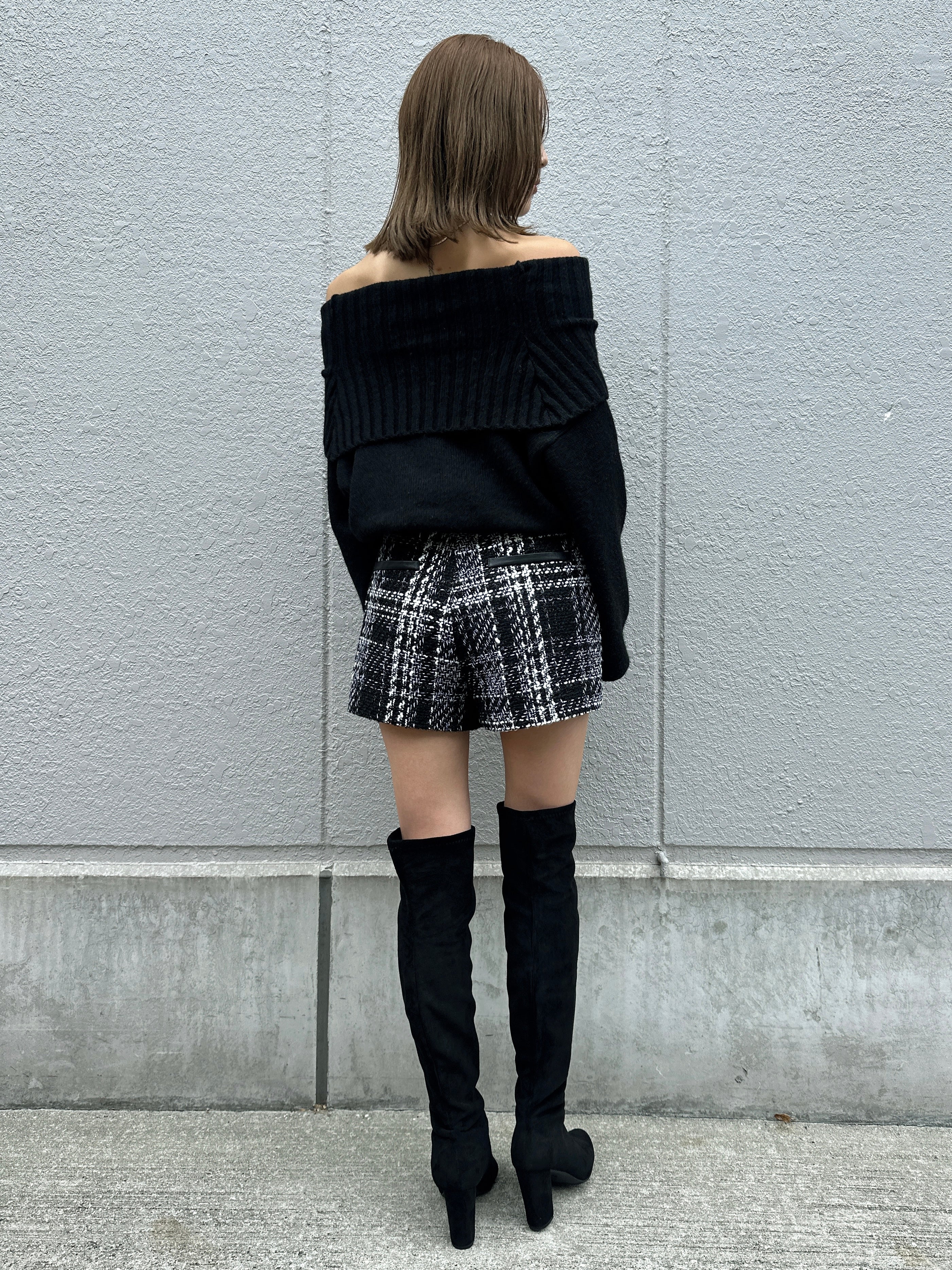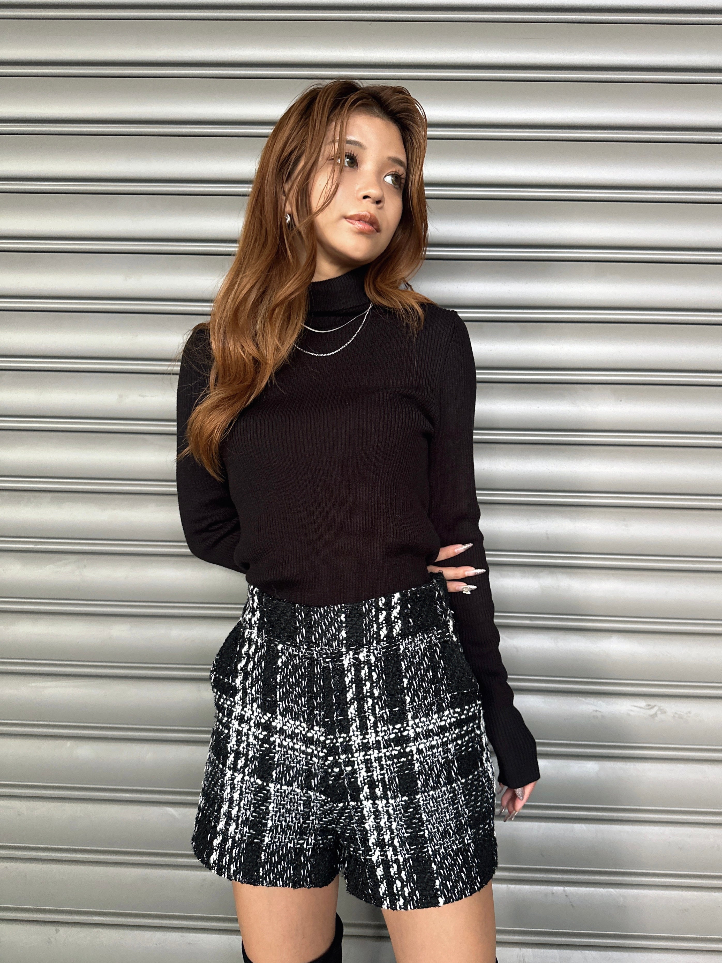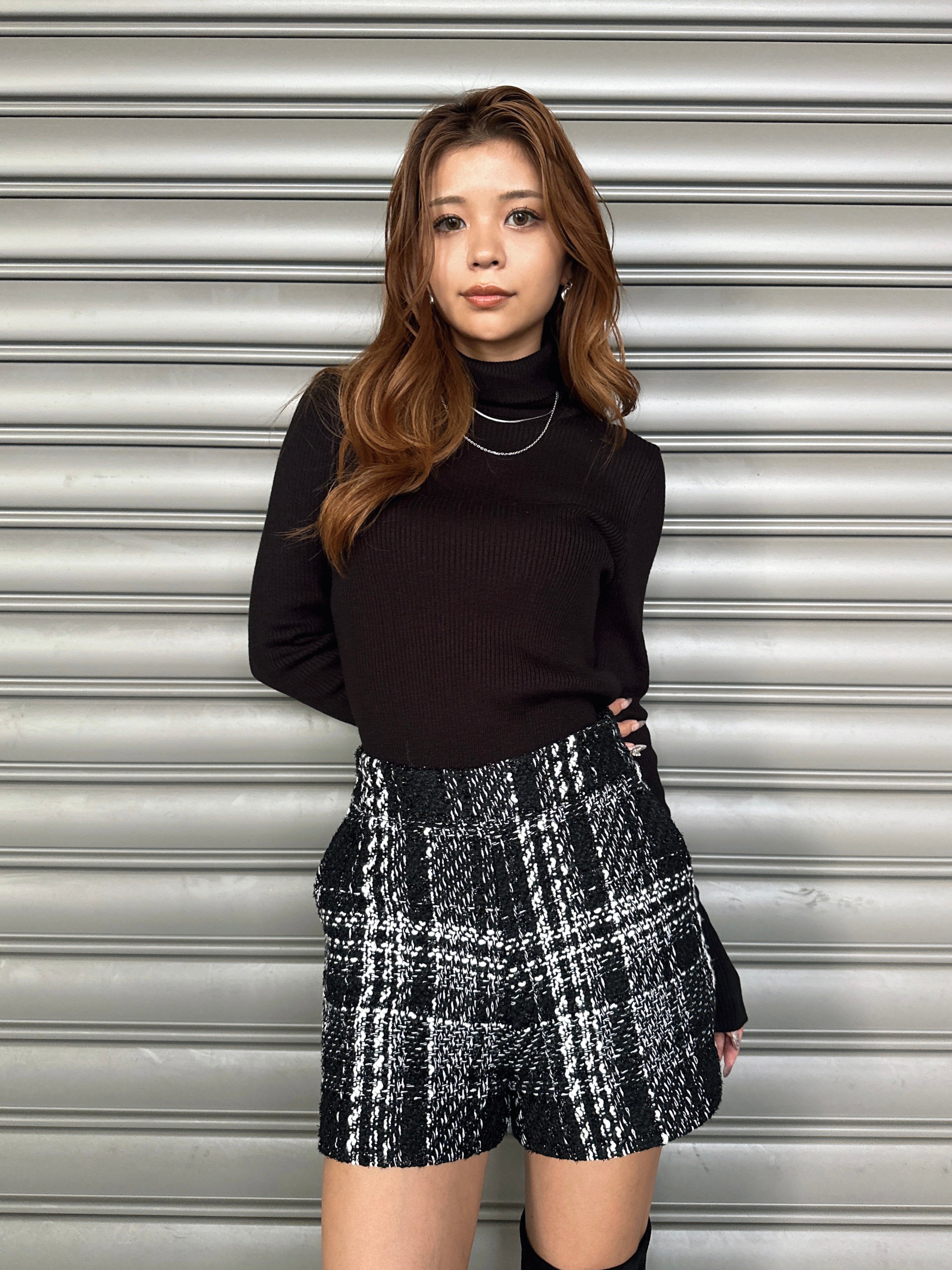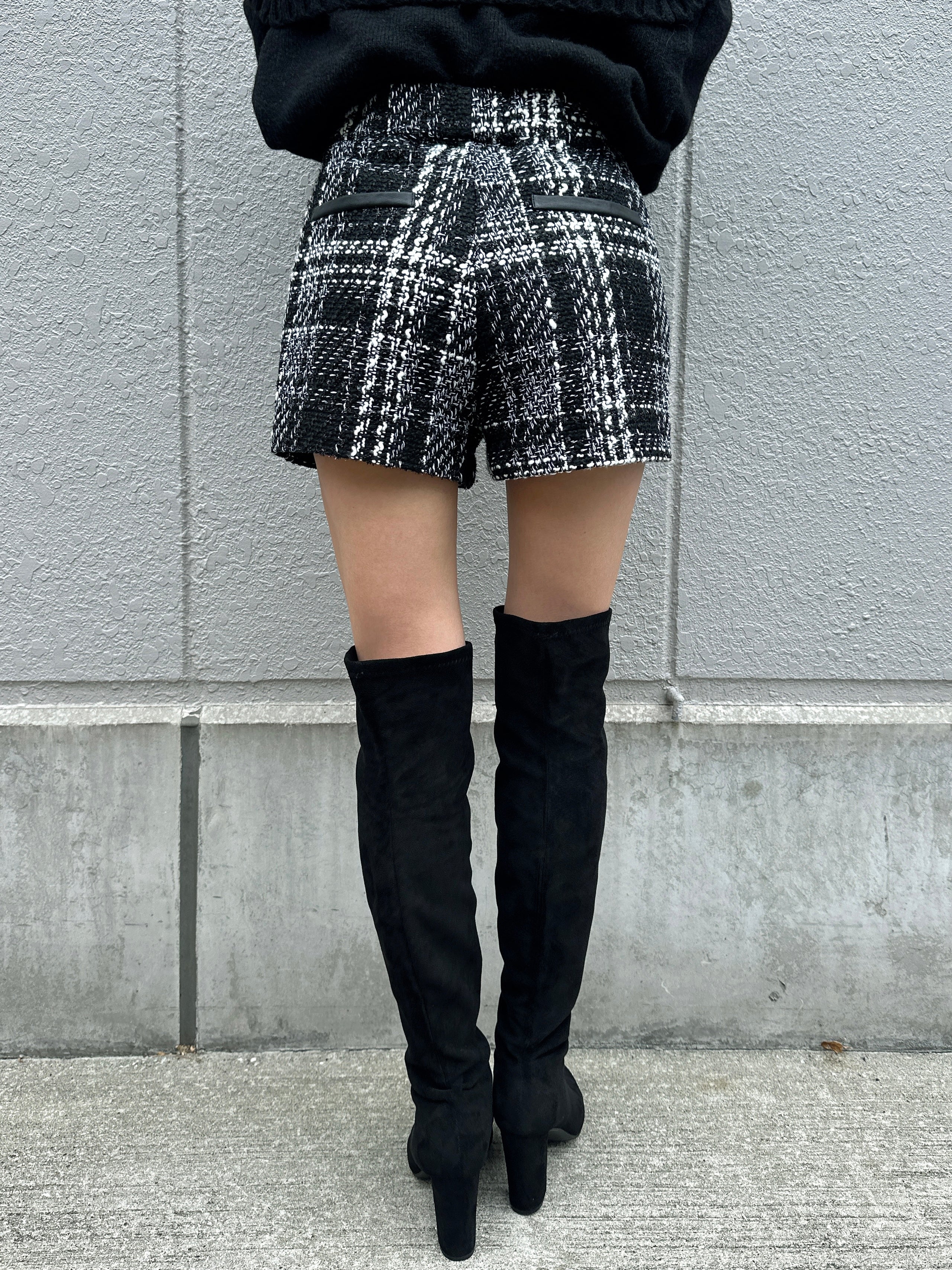 商品説明 キラッと輝くラメ入りツイードショートパンツ。表情豊かなモノトーンツイードが、上品かつ華やかな印象に仕上げてくれます。ウエスト位置が高く見えるハイウエスト設定で、脚長効果抜群。履くだけでスタイルアップを叶えてくれます。後ろウエストのみ平ゴム入りなので、窮屈感なく着用して頂けます。左脇に付けたファスナーは目立たないようにコンシールファスナーを使用し、綺麗に収まるようにこだわりました。甘くなりすぎないよう後ろにはフェイクレザーポケット(飾り)を付けパンチを効かせています。存在感のある主役級のショートパンツは、シンプルなトップス合わせでもコーデが極まります。タイトなトップスをINしてすっきり見せるスタイリングや、短丈ボリュームトップス合わせでメリハリを付けるのがオススメ。足元はニーハイブーツがマスト。裏地付きなので、肌に触れる部分もチクチク感なく履きやすいです。
