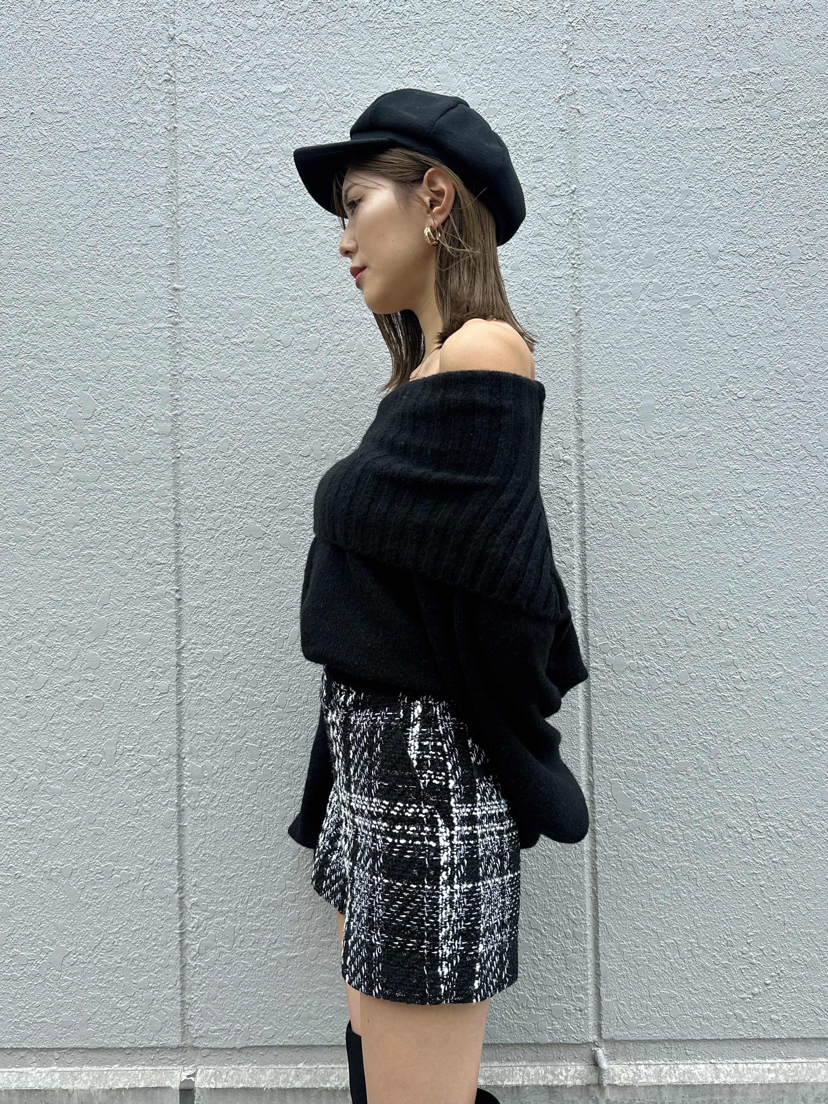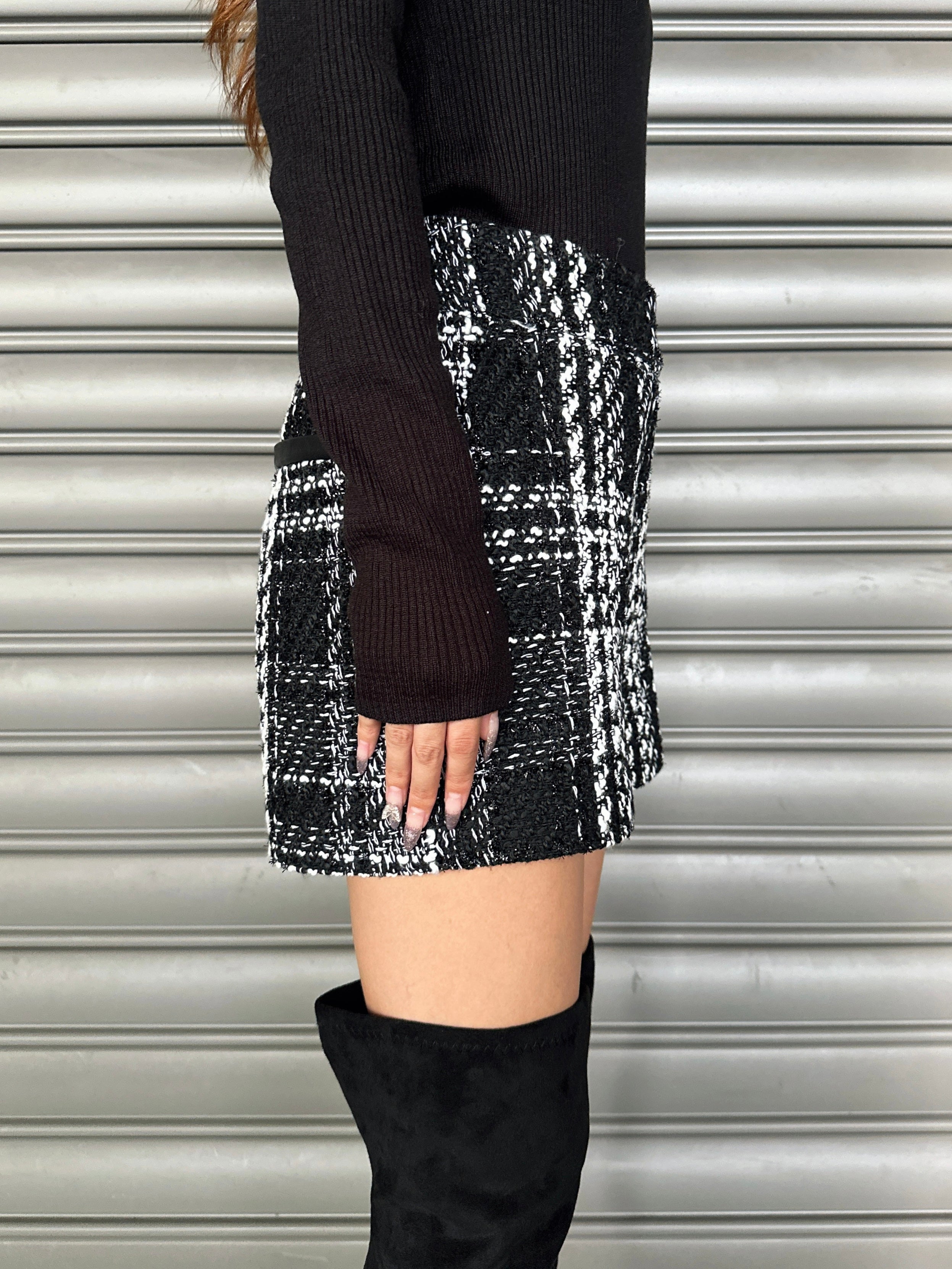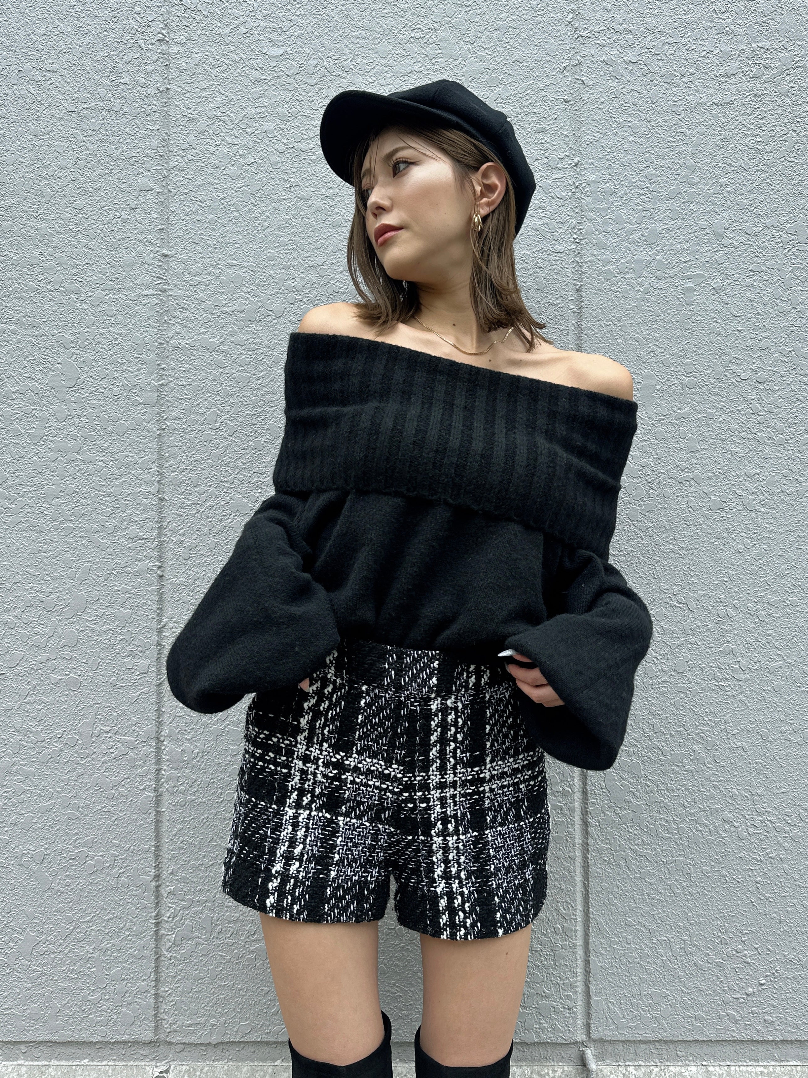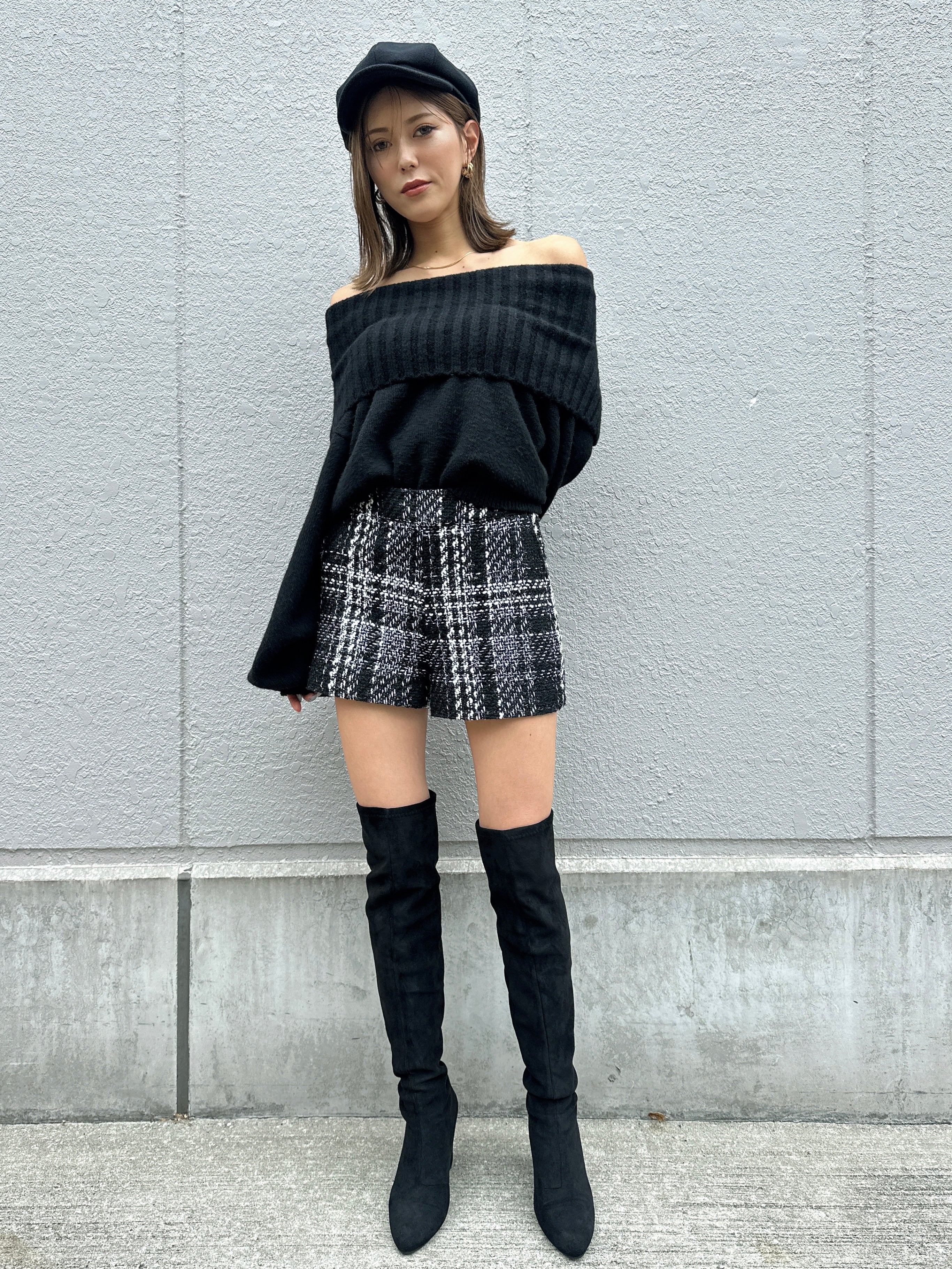 商品説明 キラッと輝くラメ入りツイードショートパンツ。表情豊かなモノトーンツイードが、上品かつ華やかな印象に仕上げてくれます。ウエスト位置が高く見えるハイウエスト設定で、脚長効果抜群。履くだけでスタイルアップを叶えてくれます。後ろウエストのみ平ゴム入りなので、窮屈感なく着用して頂けます。左脇に付けたファスナーは目立たないようにコンシールファスナーを使用し、綺麗に収まるようにこだわりました。甘くなりすぎないよう後ろにはフェイクレザーポケット(飾り)を付けパンチを効かせています。存在感のある主役級のショートパンツは、シンプルなトップス合わせでもコーデが極まります。タイトなトップスをINしてすっきり見せるスタイリングや、短丈ボリュームトップス合わせでメリハリを付けるのがオススメ。足元はニーハイブーツがマスト。裏地付きなので、肌に触れる部分もチクチク感なく履きやすいです。