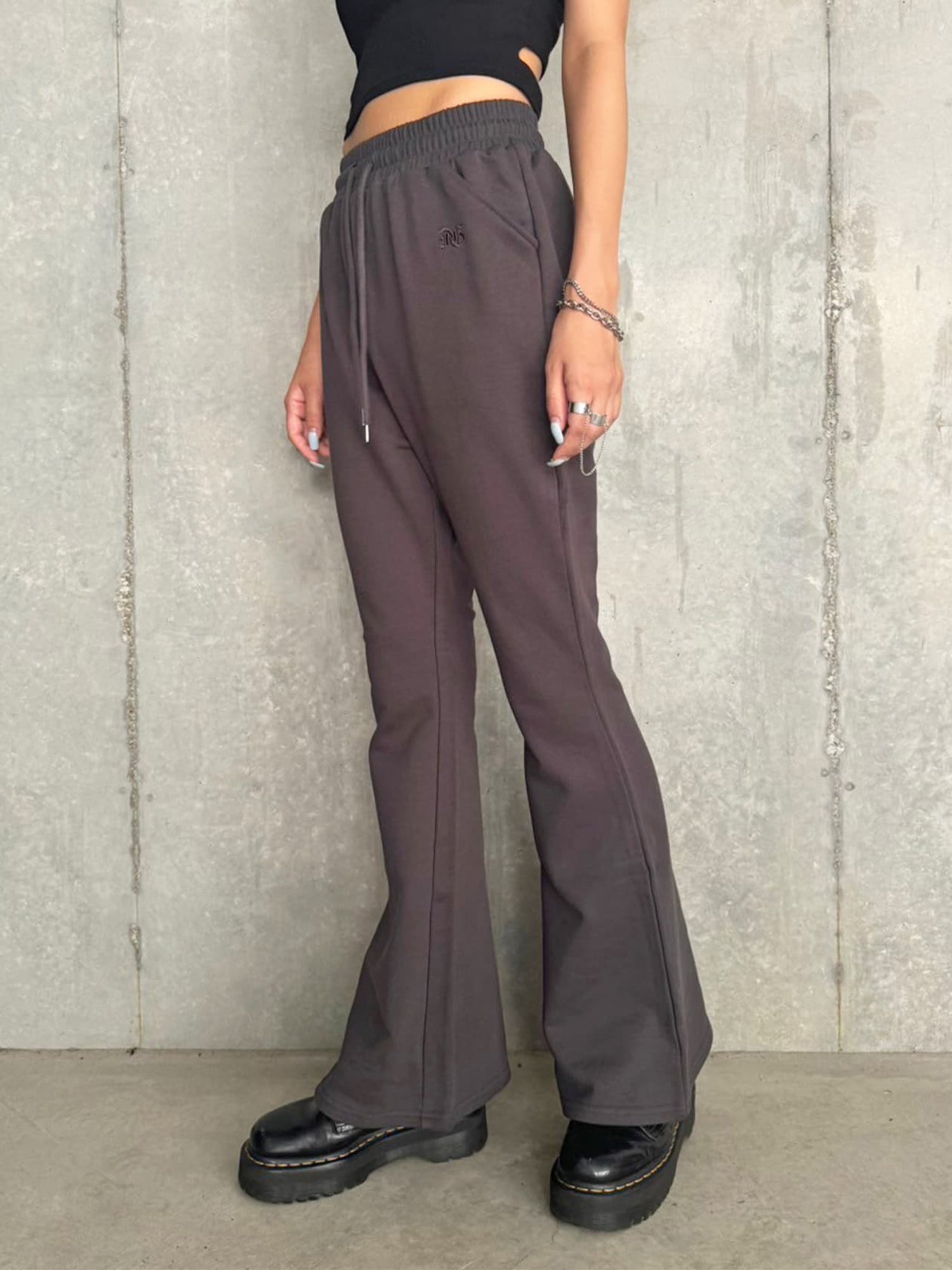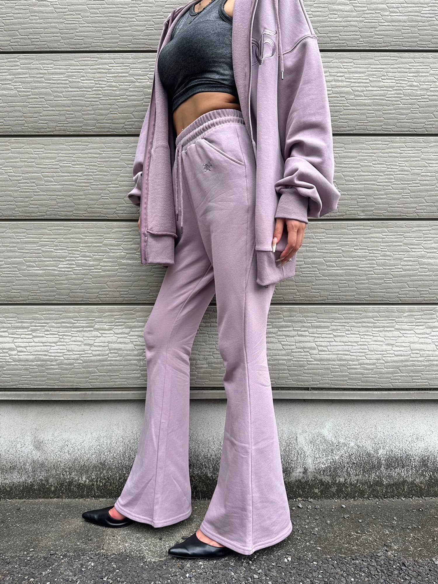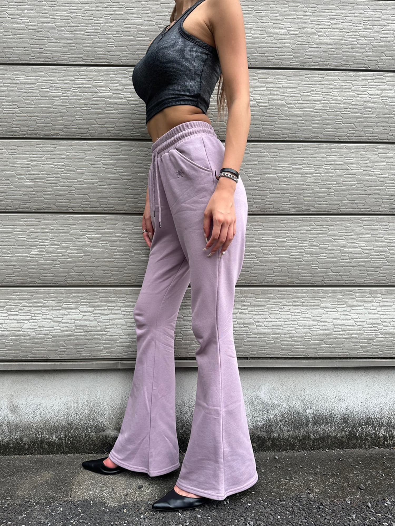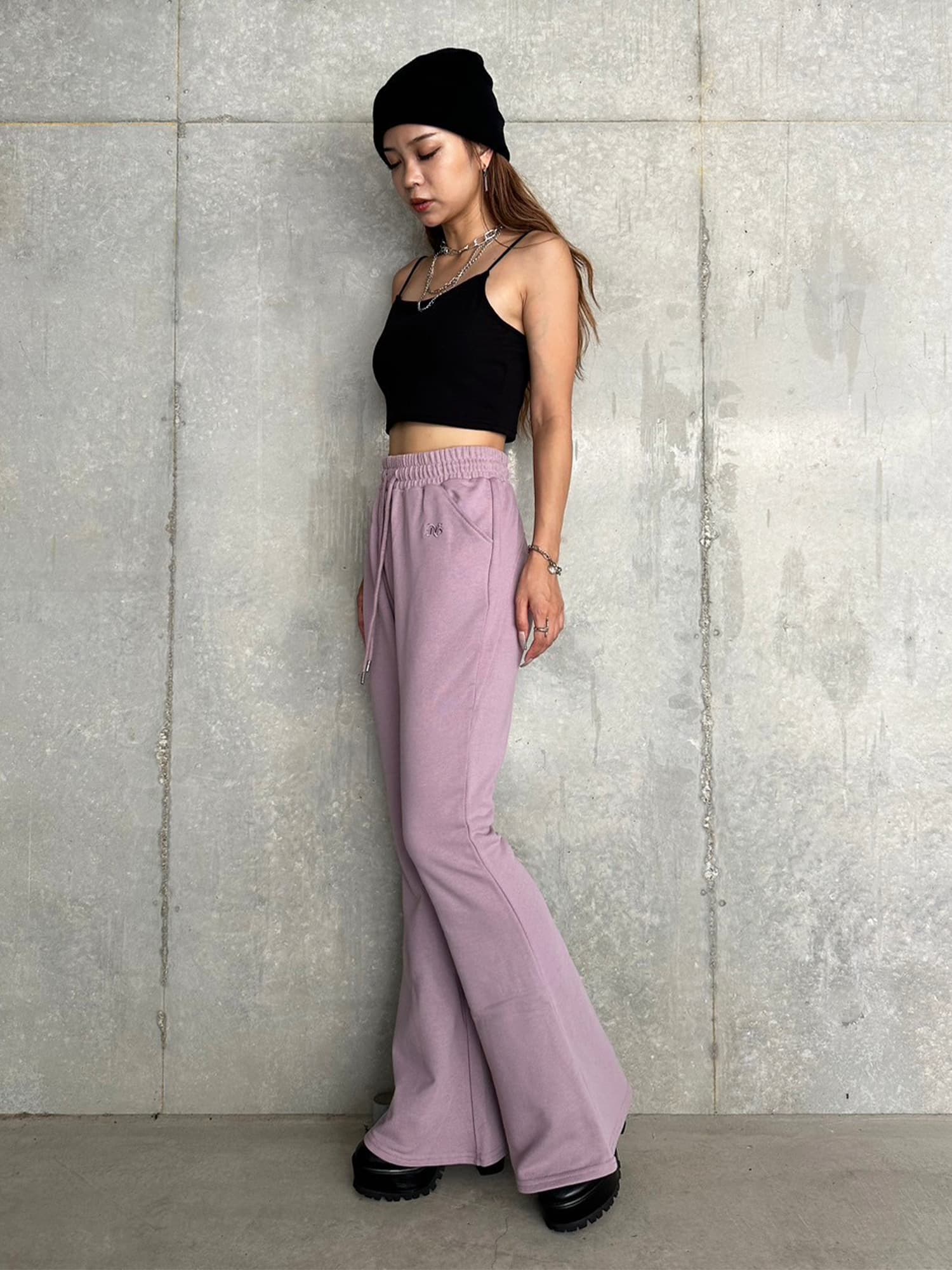 商品説明 ウエストゴムで着脱楽チンなフレアパンツはくびれシルエットでメリハリをつけ美脚効果抜群。左の太ももにはオリジナルのロゴ刺繍をいれていますが同色なので目立ちすぎずデイリー使いしやすいです。加工風の裏毛生地を選んでいるのでくすみカラーがヴィンテージ感あり、今季AWテーマの一つでもあるグランジ要素を取り入れたファッションにぴったりなアイテムとなっています。