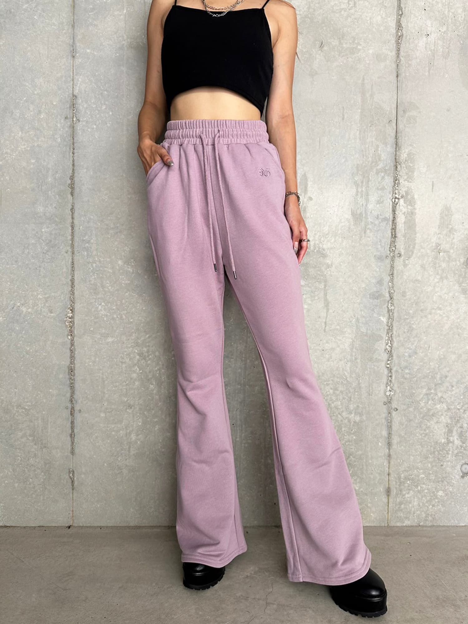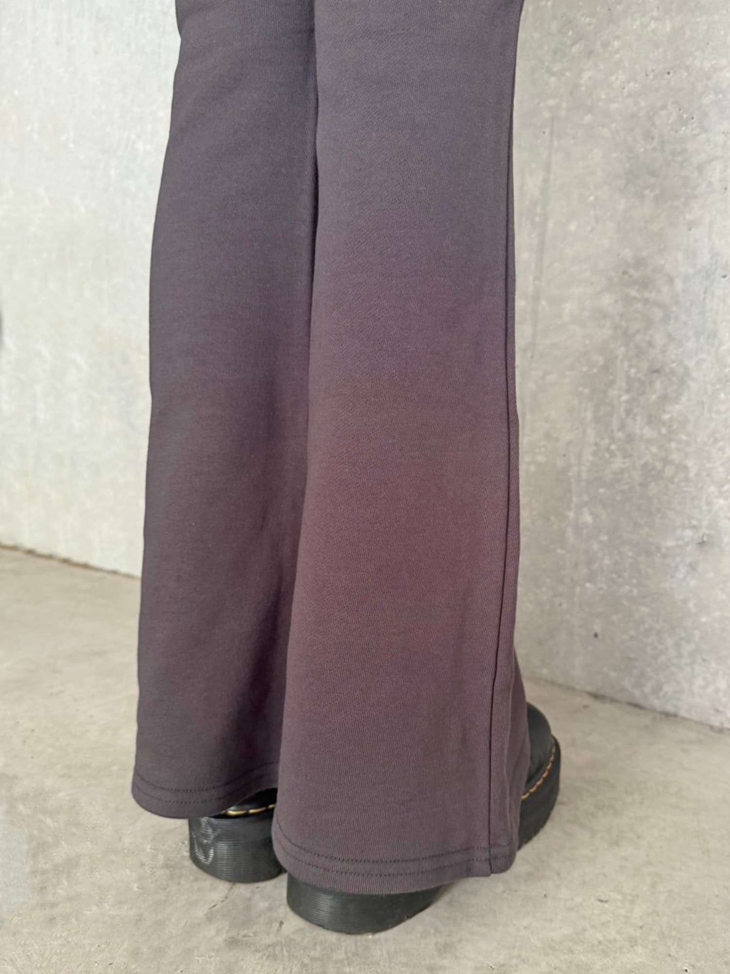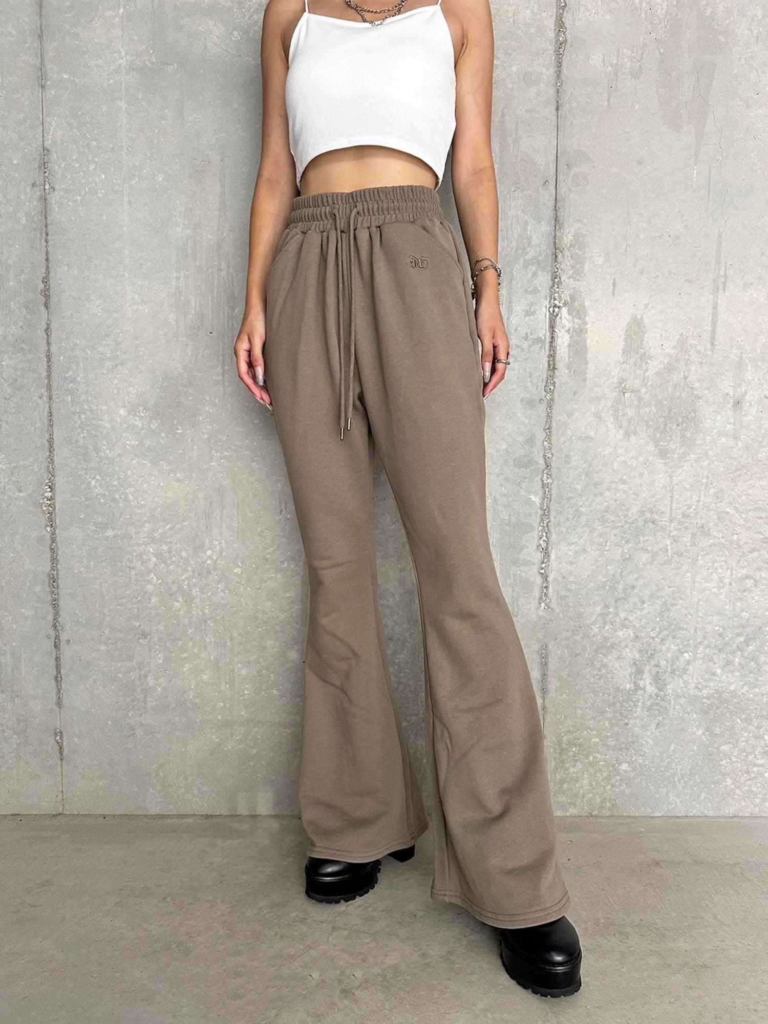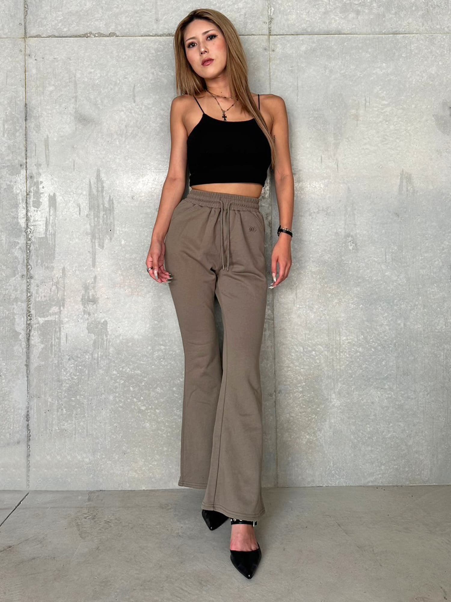 商品説明 ウエストゴムで着脱楽チンなフレアパンツはくびれシルエットでメリハリをつけ美脚効果抜群。左の太ももにはオリジナルのロゴ刺繍をいれていますが同色なので目立ちすぎずデイリー使いしやすいです。加工風の裏毛生地を選んでいるのでくすみカラーがヴィンテージ感あり、今季AWテーマの一つでもあるグランジ要素を取り入れたファッションにぴったりなアイテムとなっています。
