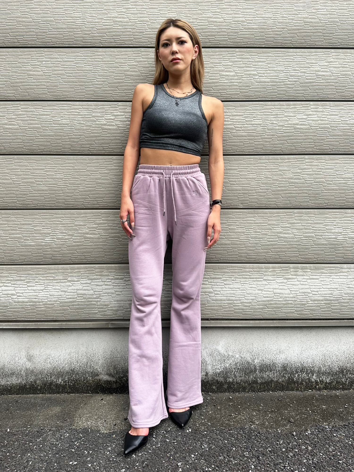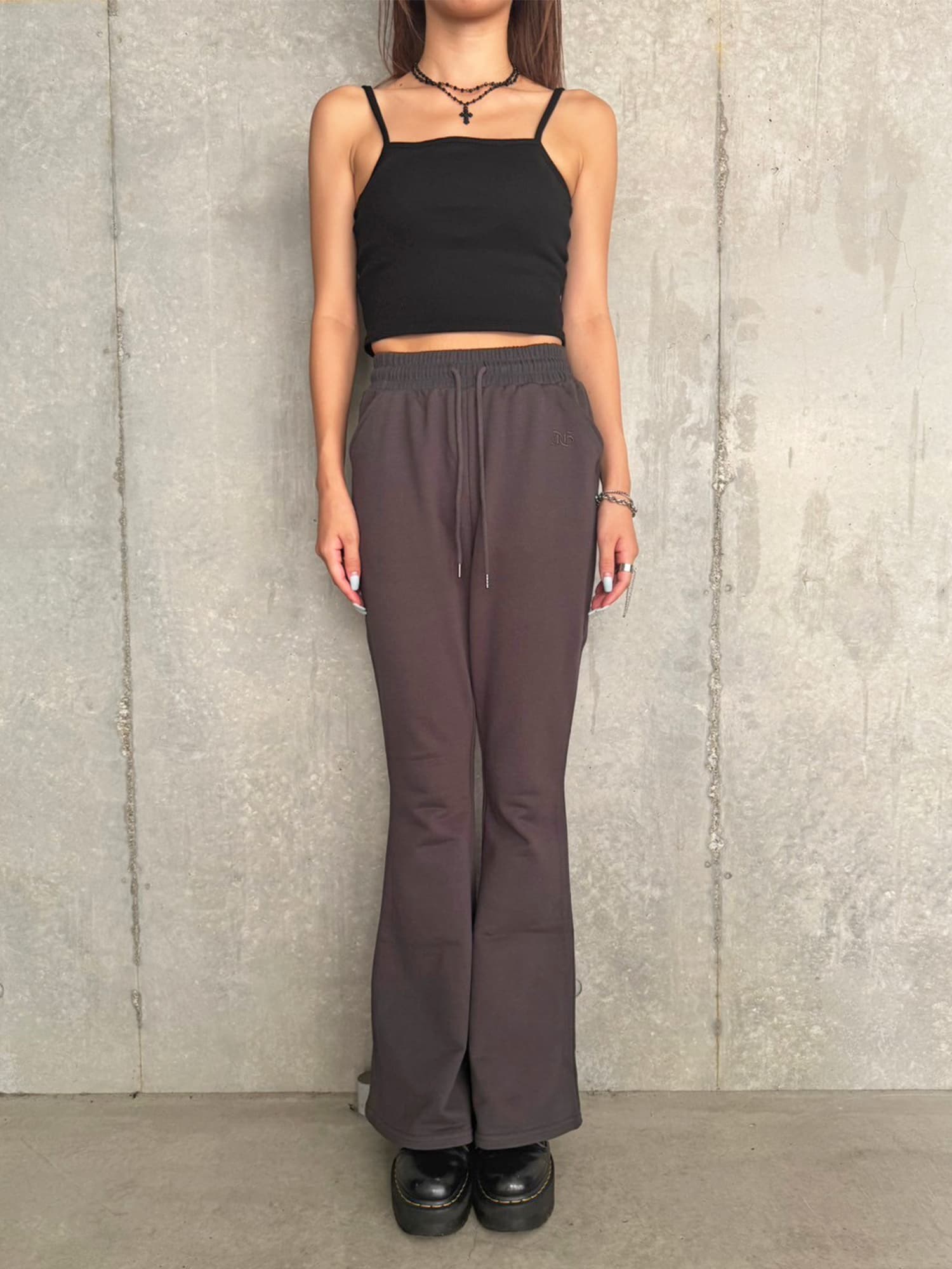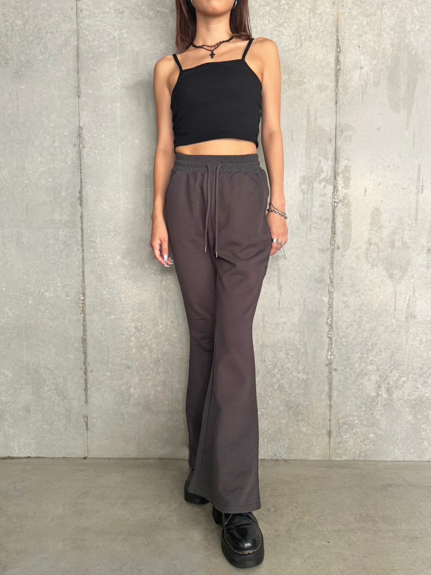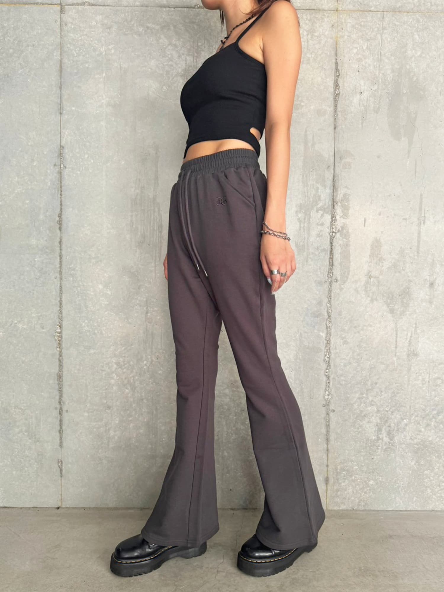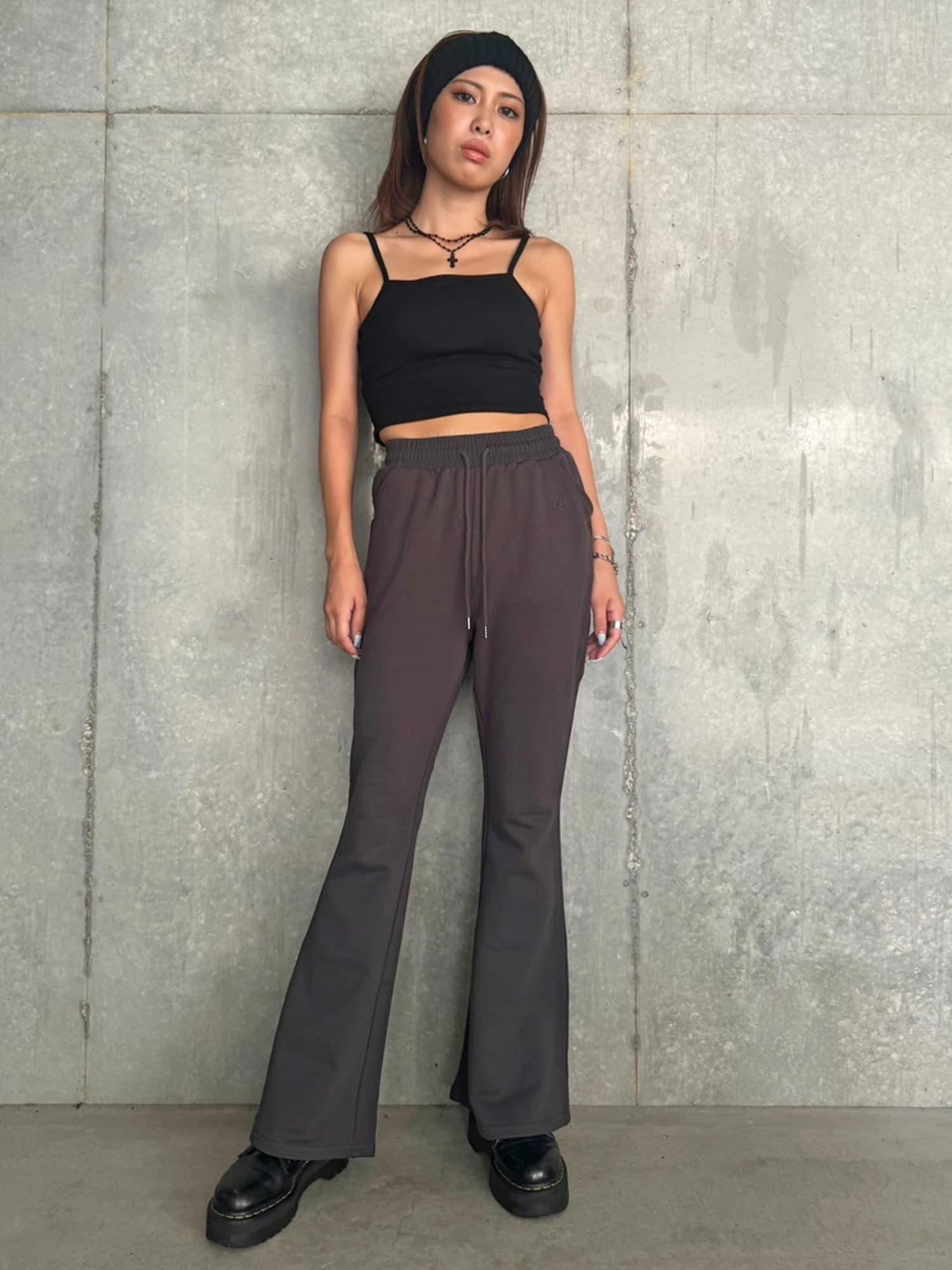 商品説明 ウエストゴムで着脱楽チンなフレアパンツはくびれシルエットでメリハリをつけ美脚効果抜群。左の太ももにはオリジナルのロゴ刺繍をいれていますが同色なので目立ちすぎずデイリー使いしやすいです。加工風の裏毛生地を選んでいるのでくすみカラーがヴィンテージ感あり、今季AWテーマの一つでもあるグランジ要素を取り入れたファッションにぴったりなアイテムとなっています。