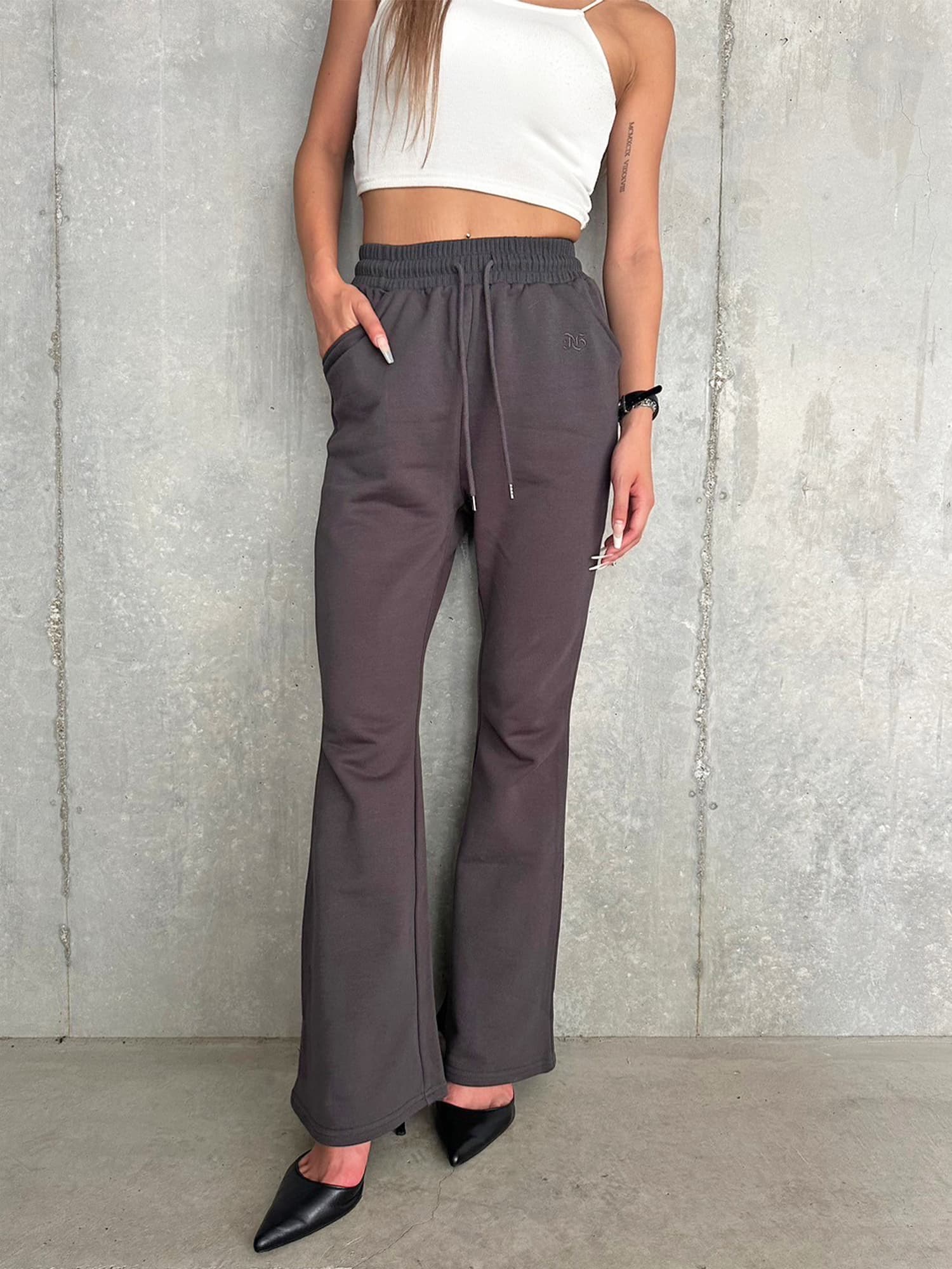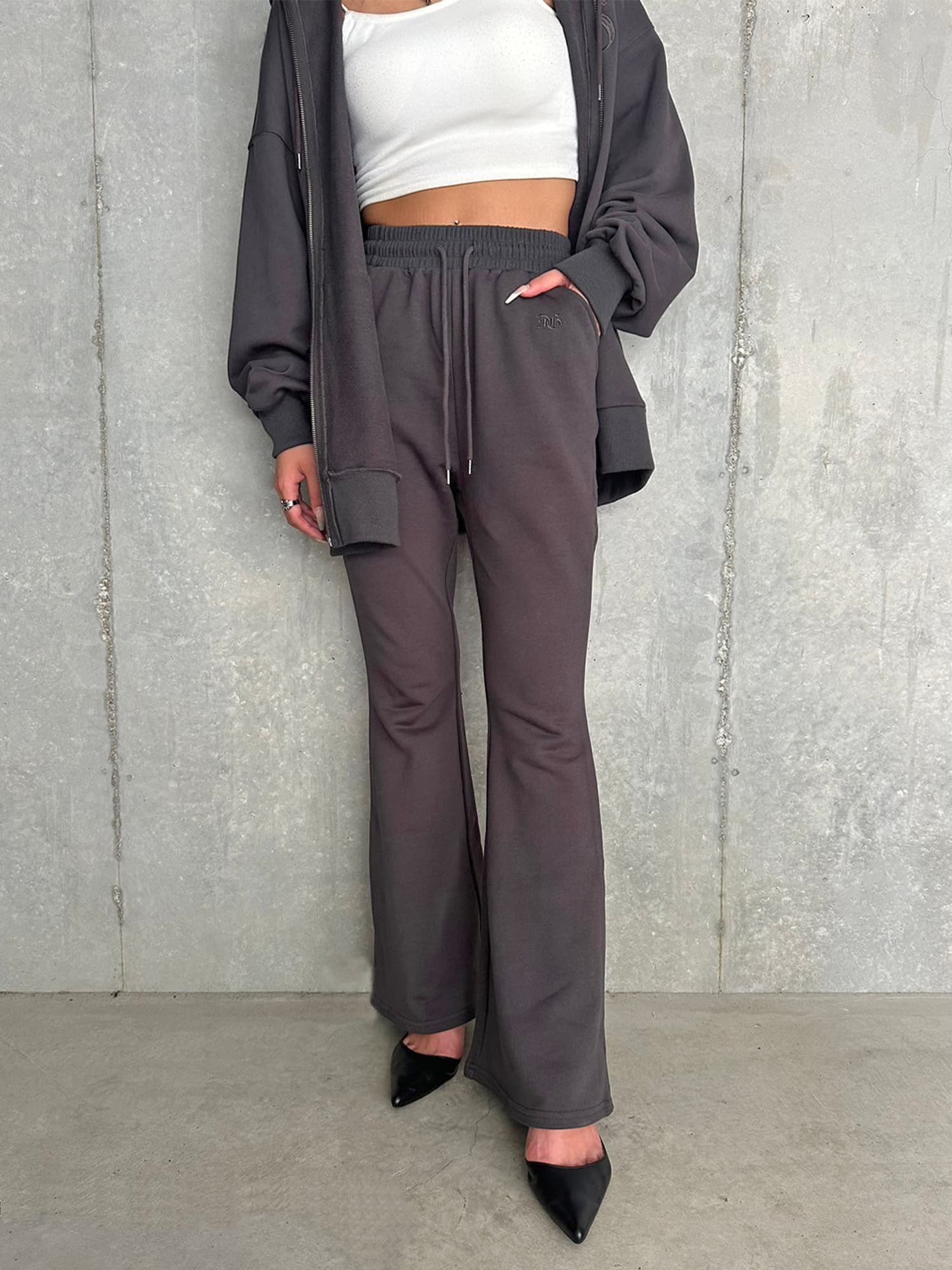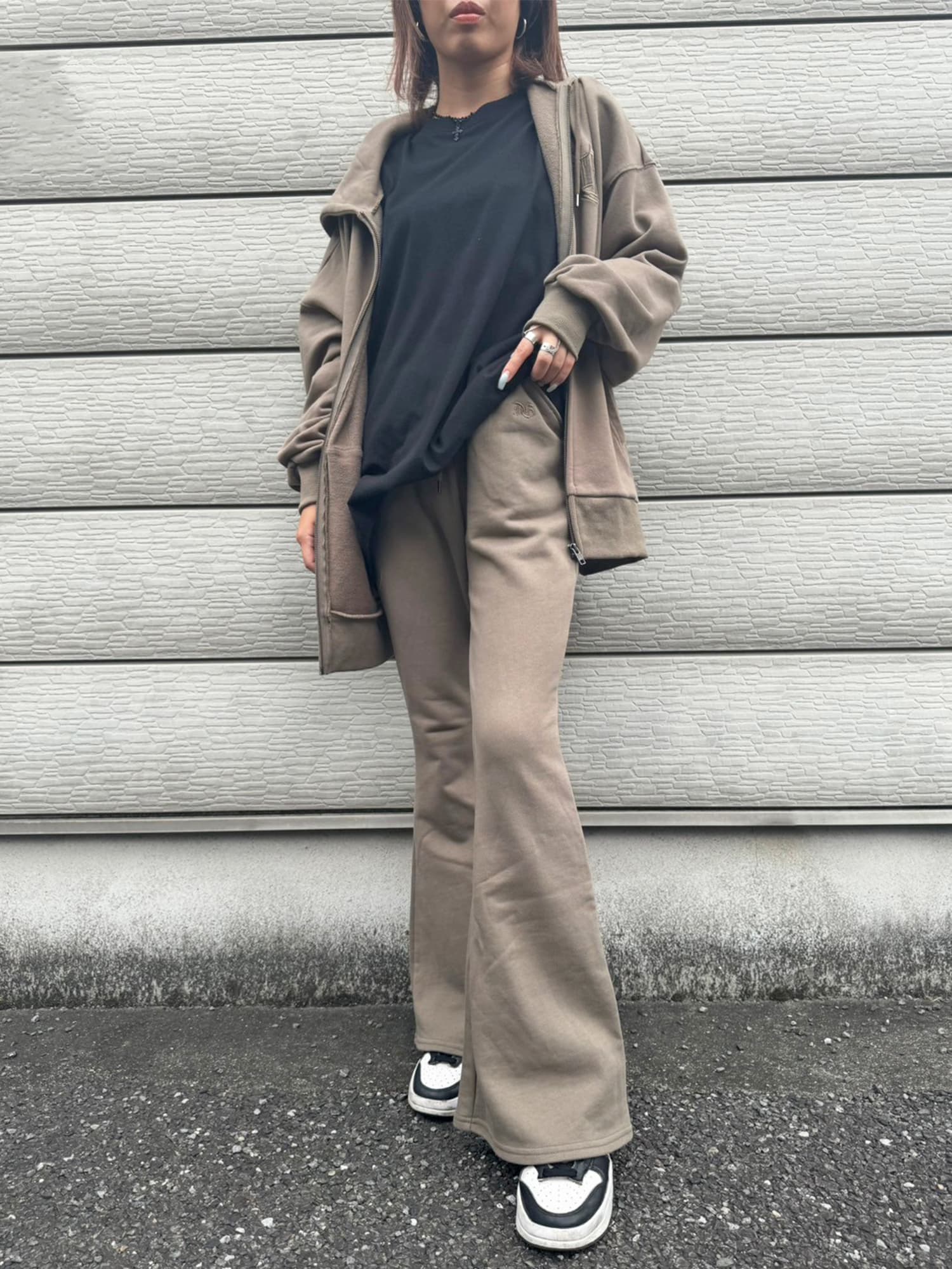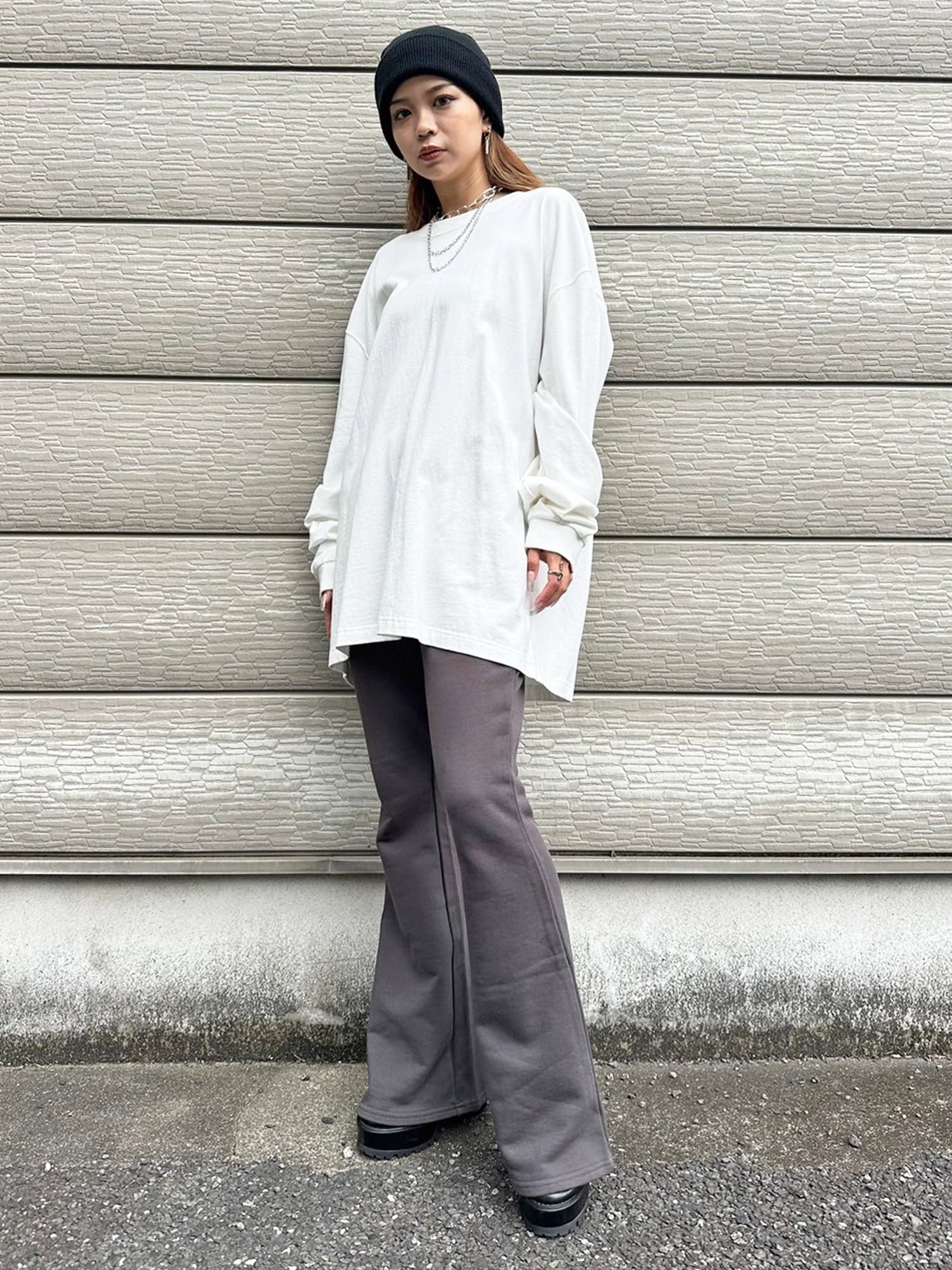 商品説明 ウエストゴムで着脱楽チンなフレアパンツはくびれシルエットでメリハリをつけ美脚効果抜群。左の太ももにはオリジナルのロゴ刺繍をいれていますが同色なので目立ちすぎずデイリー使いしやすいです。加工風の裏毛生地を選んでいるのでくすみカラーがヴィンテージ感あり、今季AWテーマの一つでもあるグランジ要素を取り入れたファッションにぴったりなアイテムとなっています。