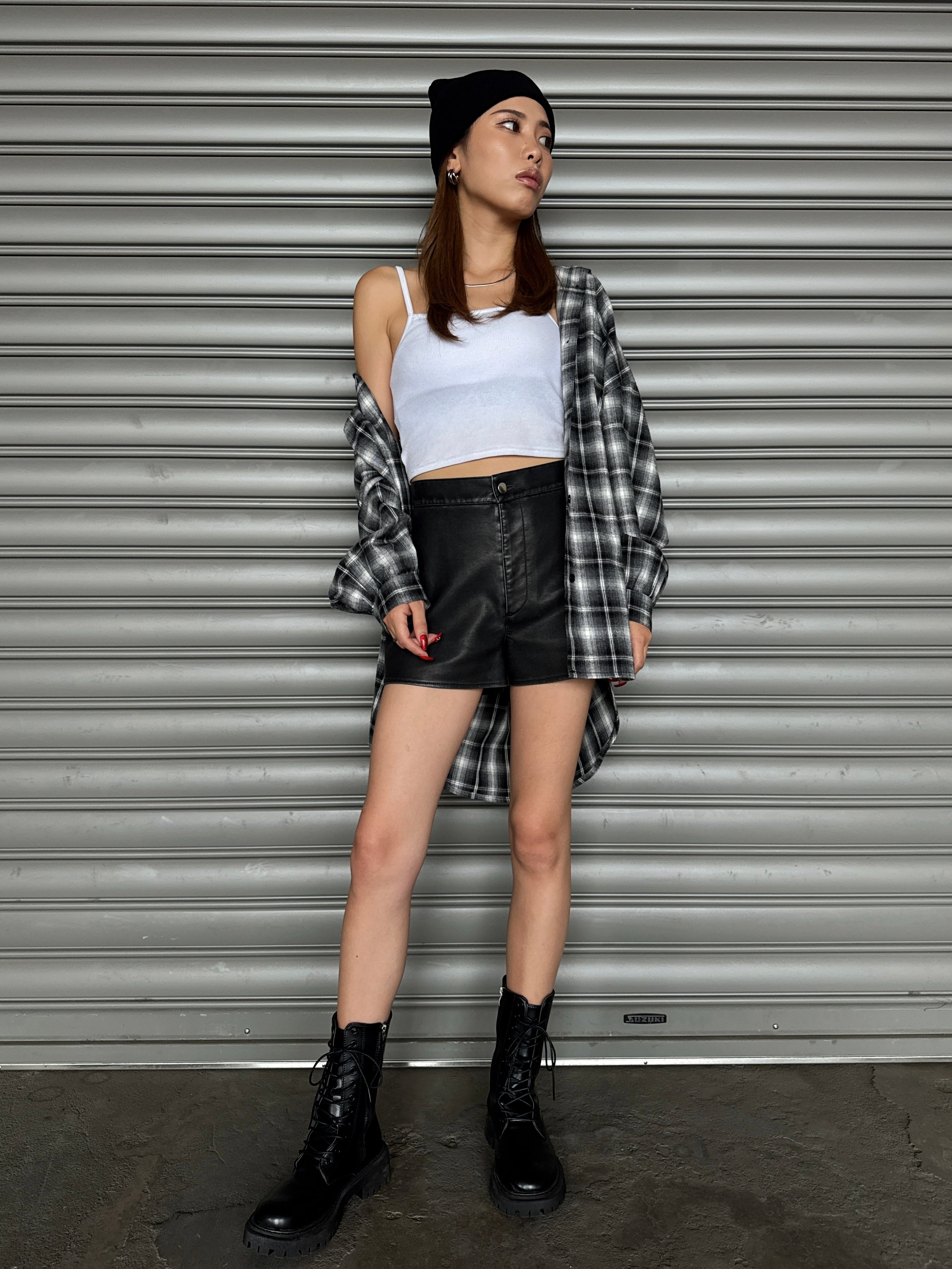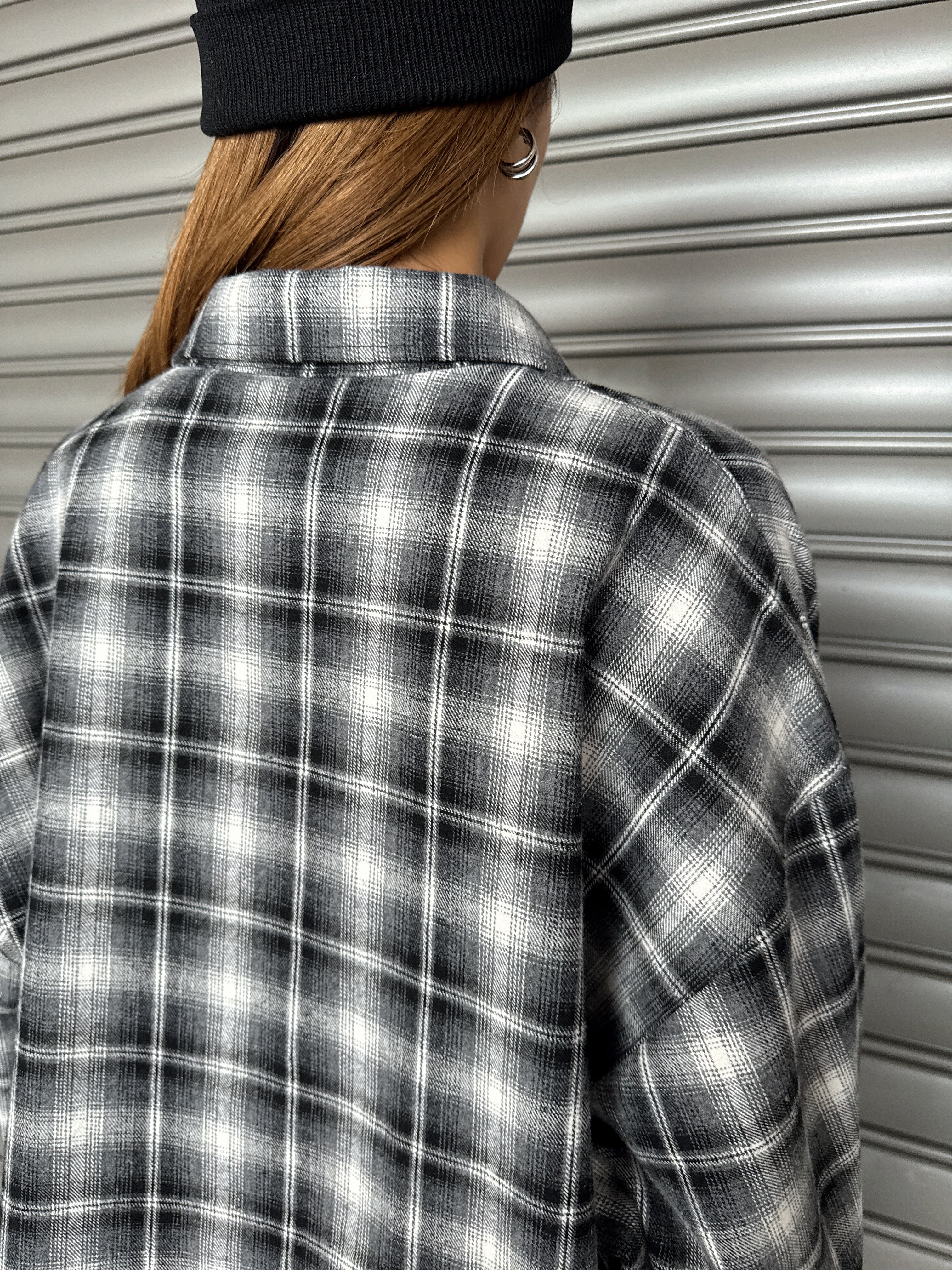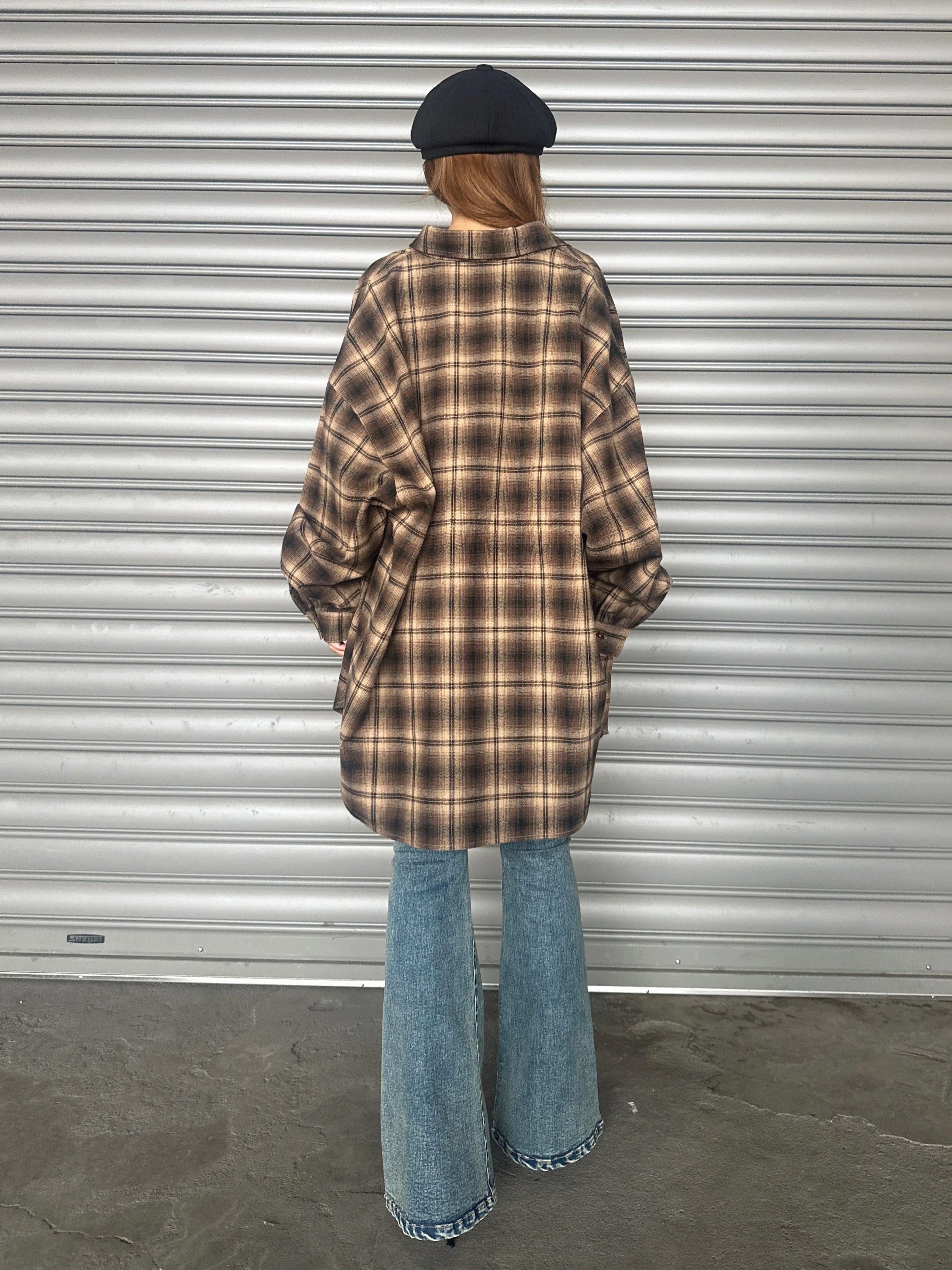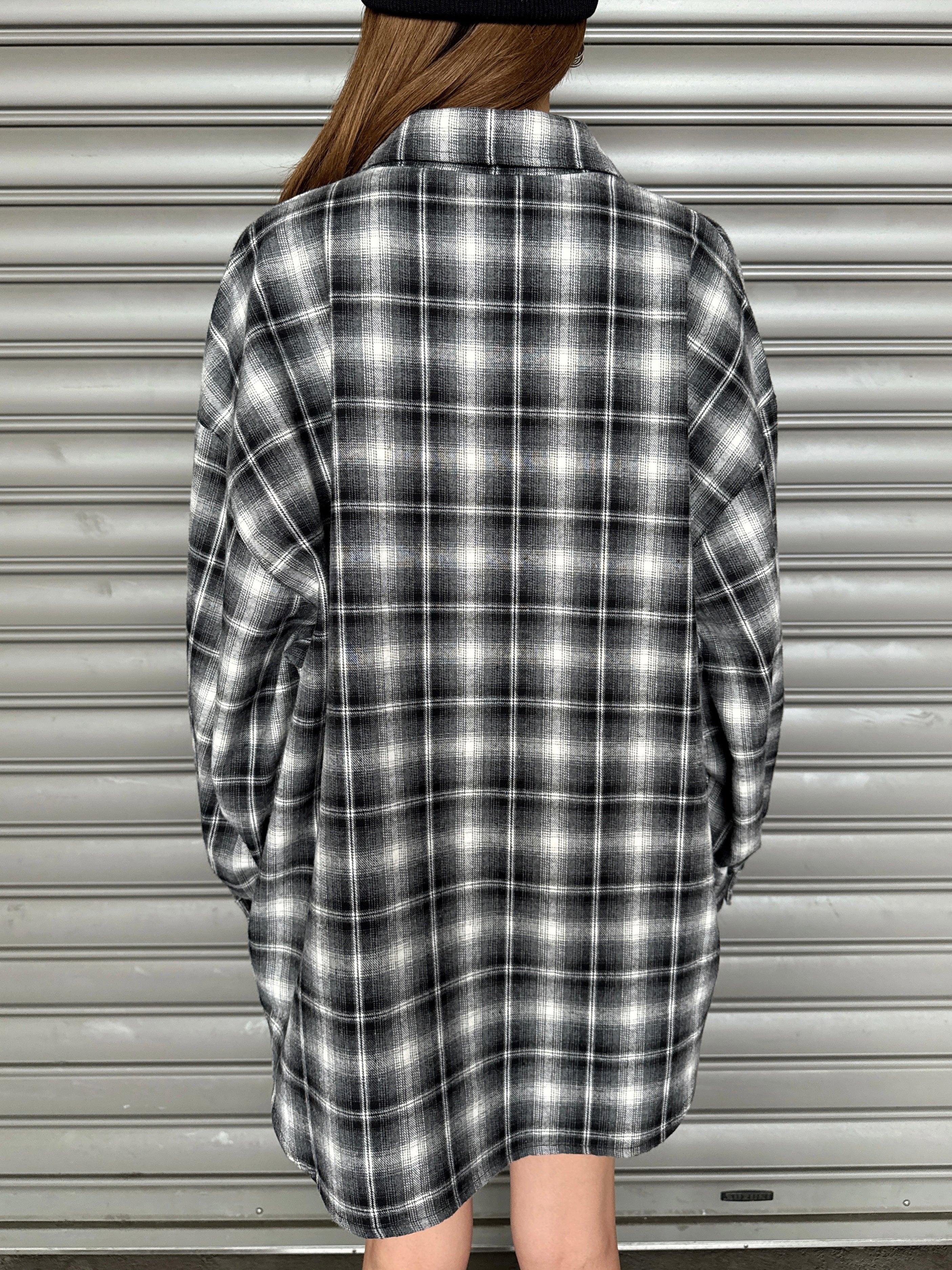 大柄チェックとオーバーサイズがインパクトのあるデザインですが、フロントボタンや袖口ボタンは生地に馴染む色で統一し、バランス良く仕上げました。