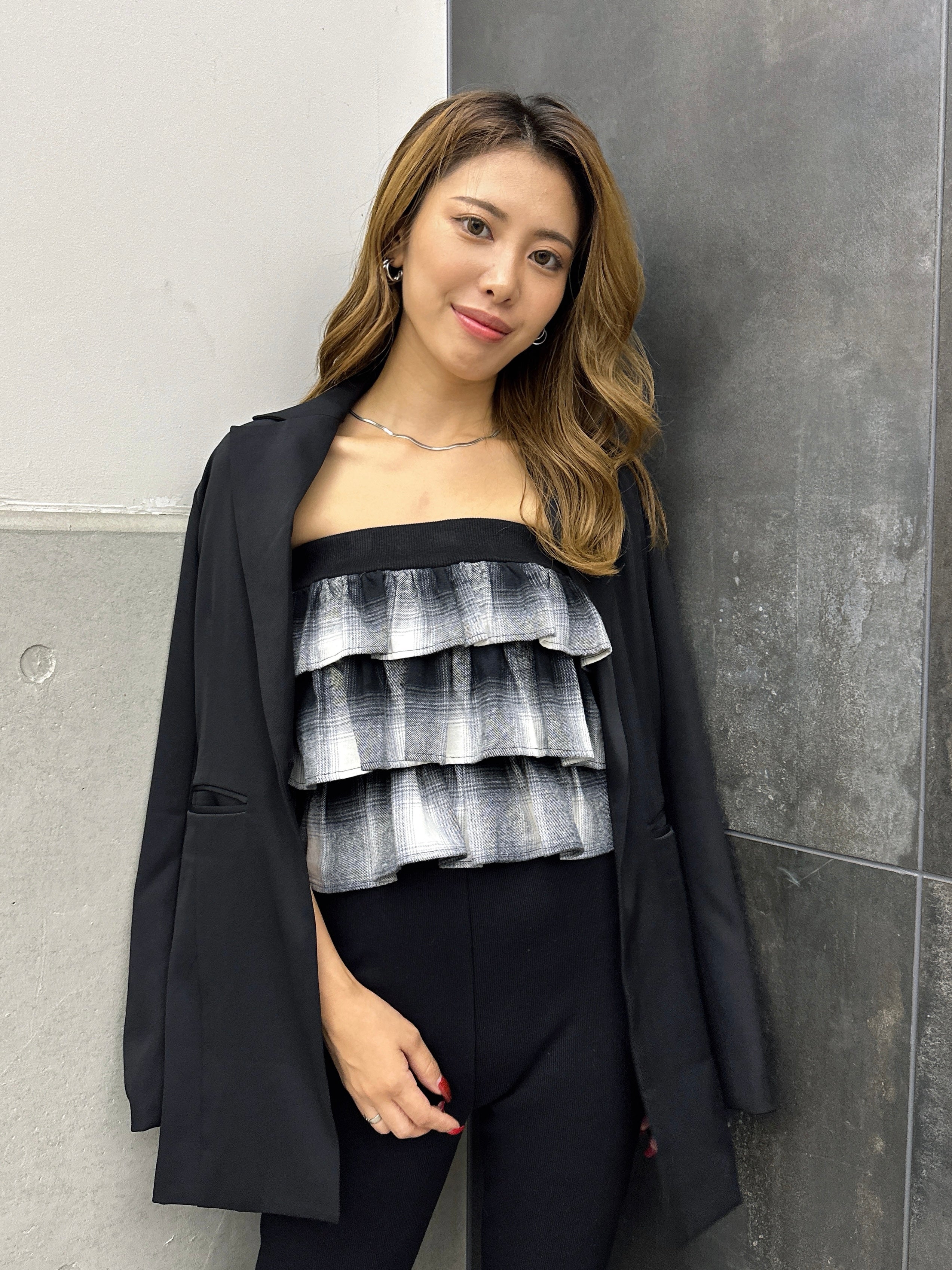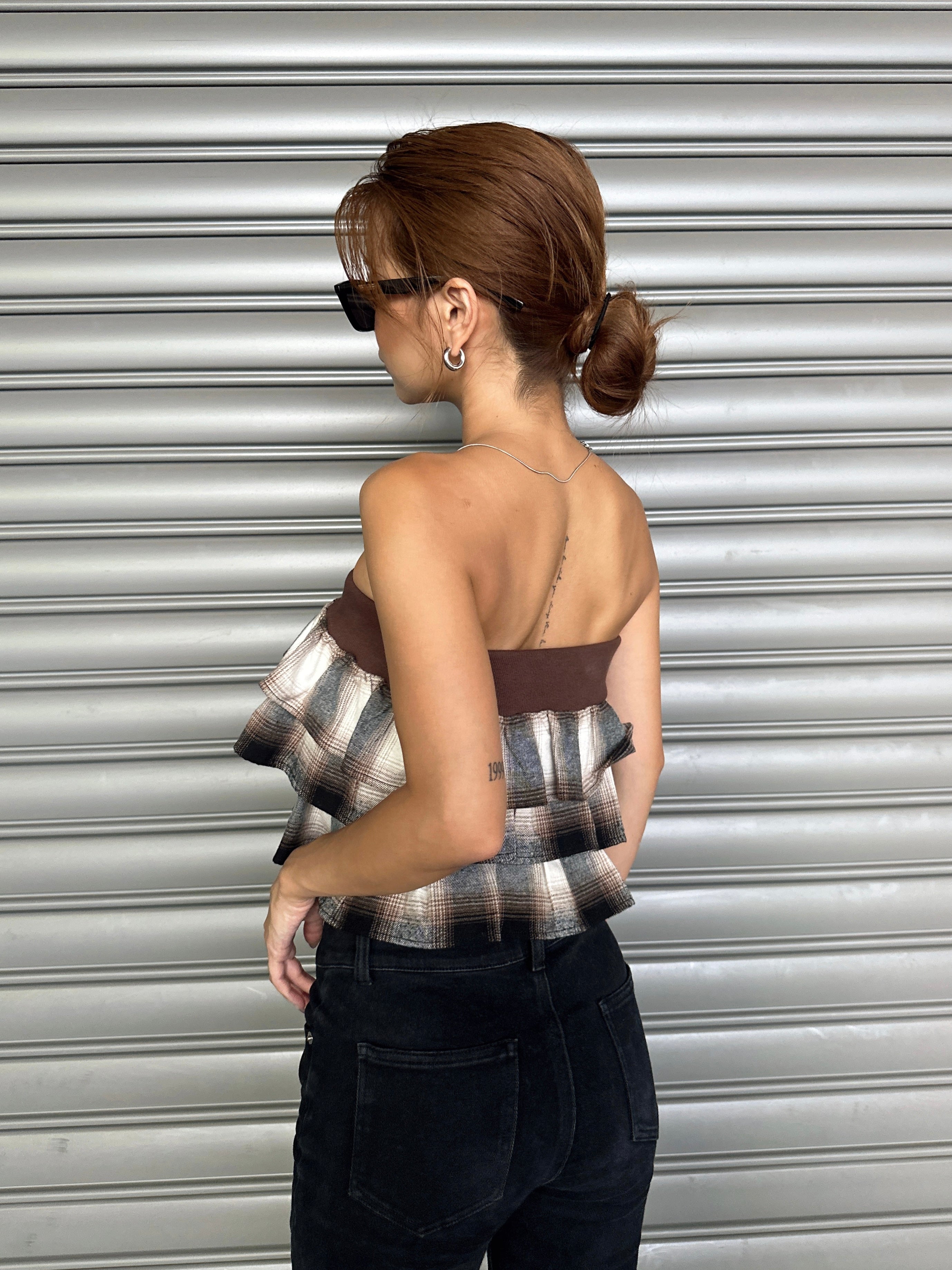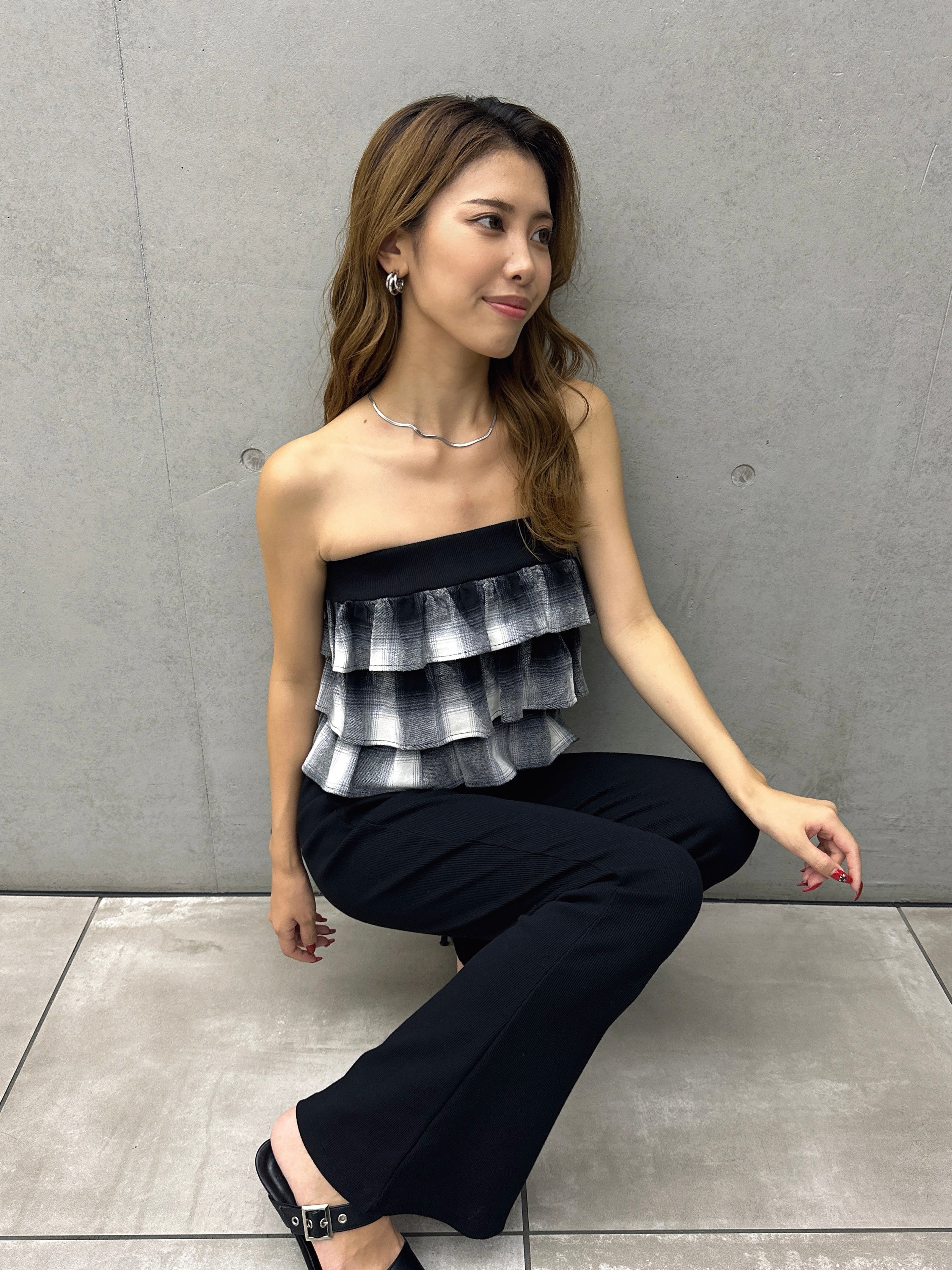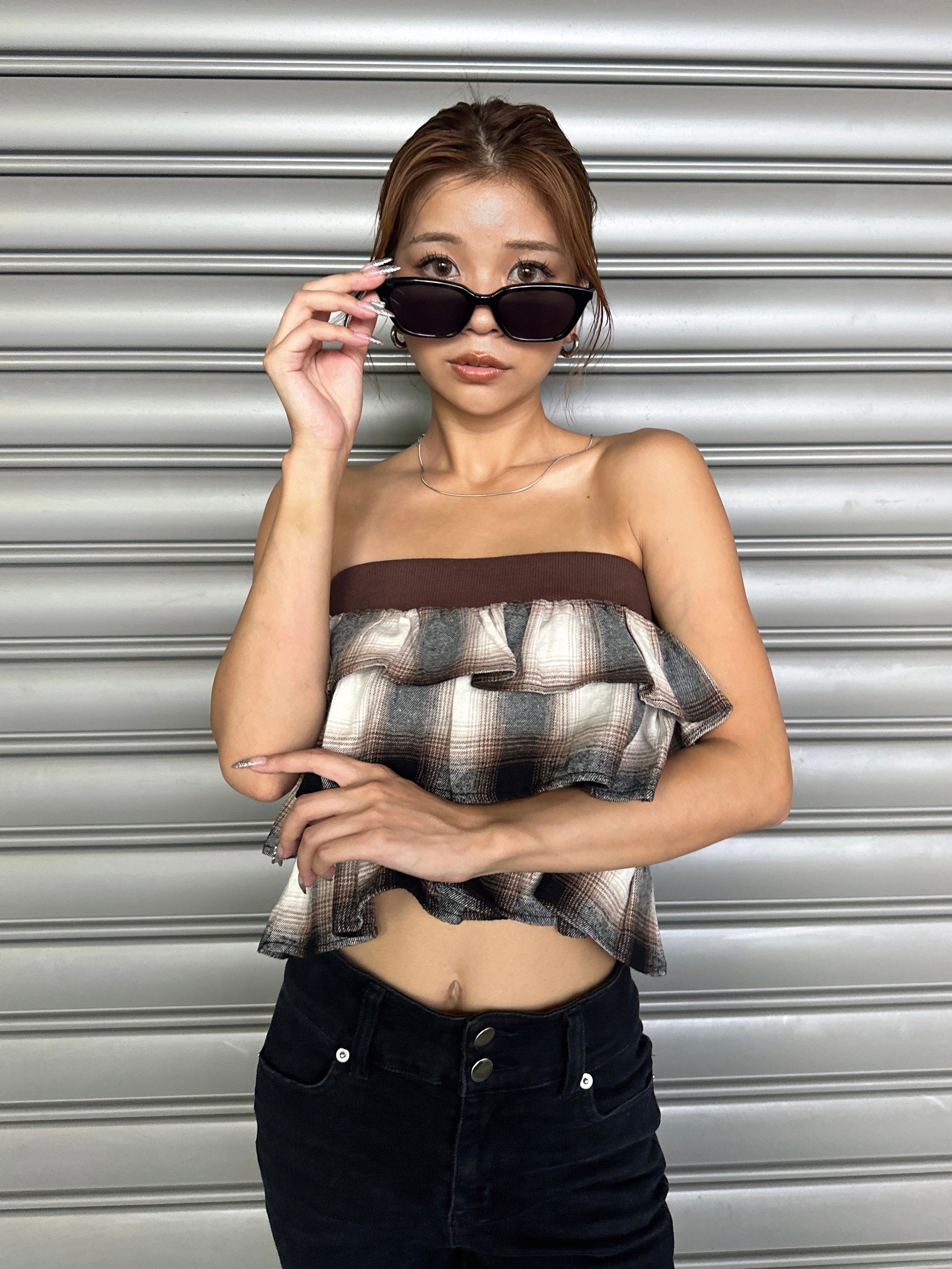 商品説明 三段チェック柄フリルが目を惹くベアトップス。