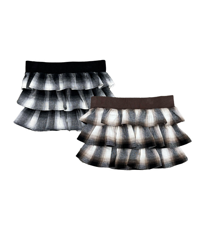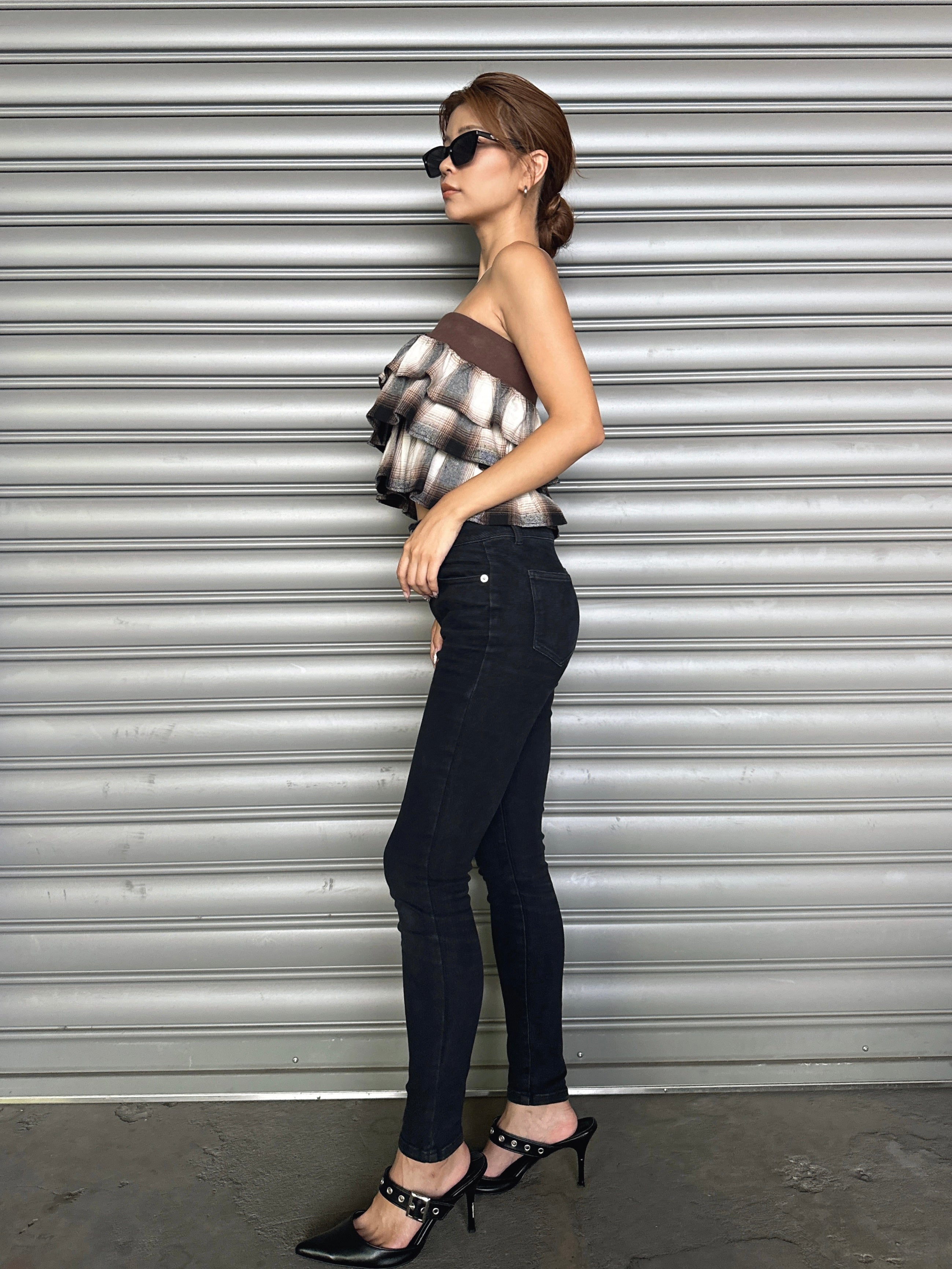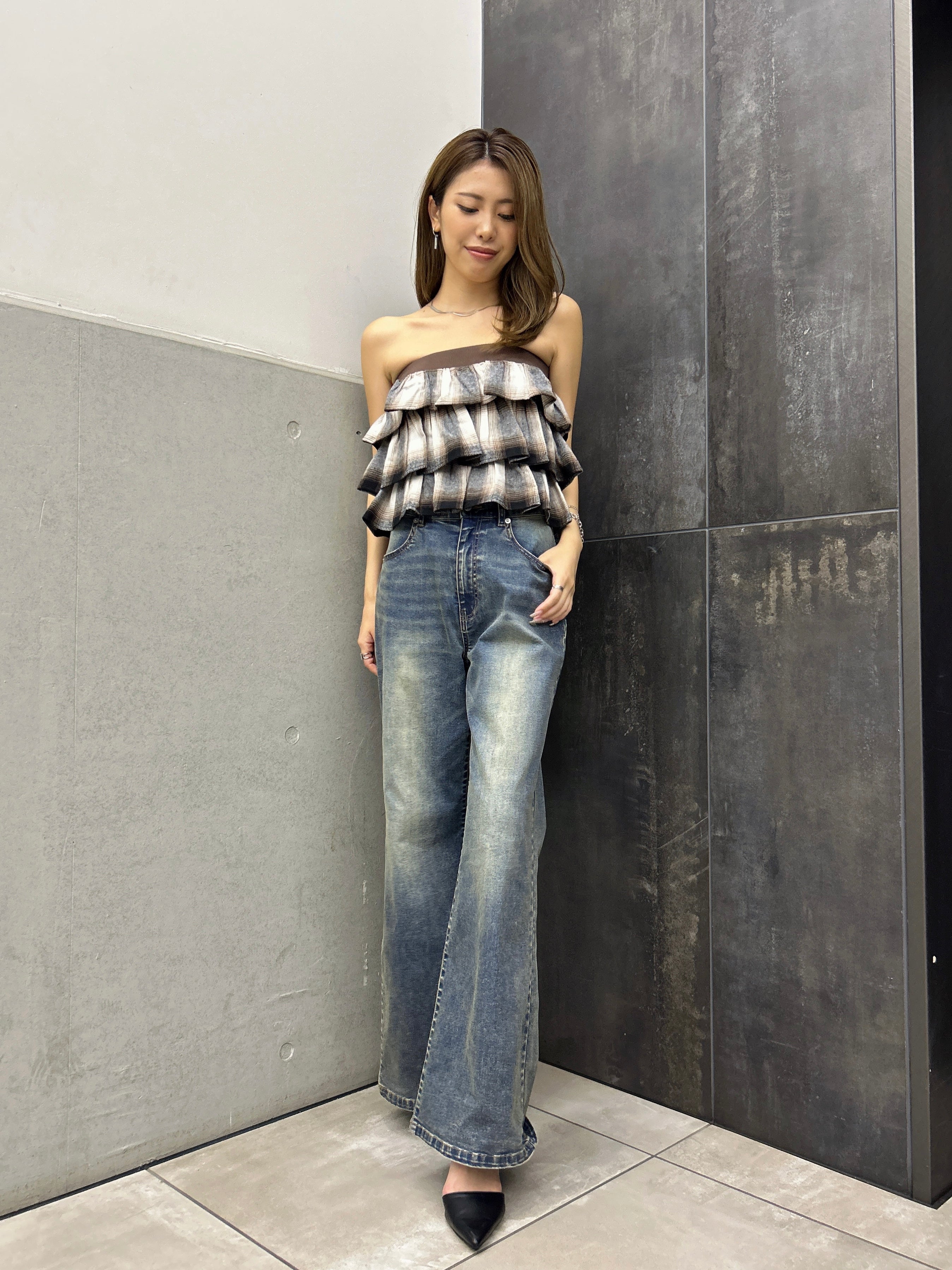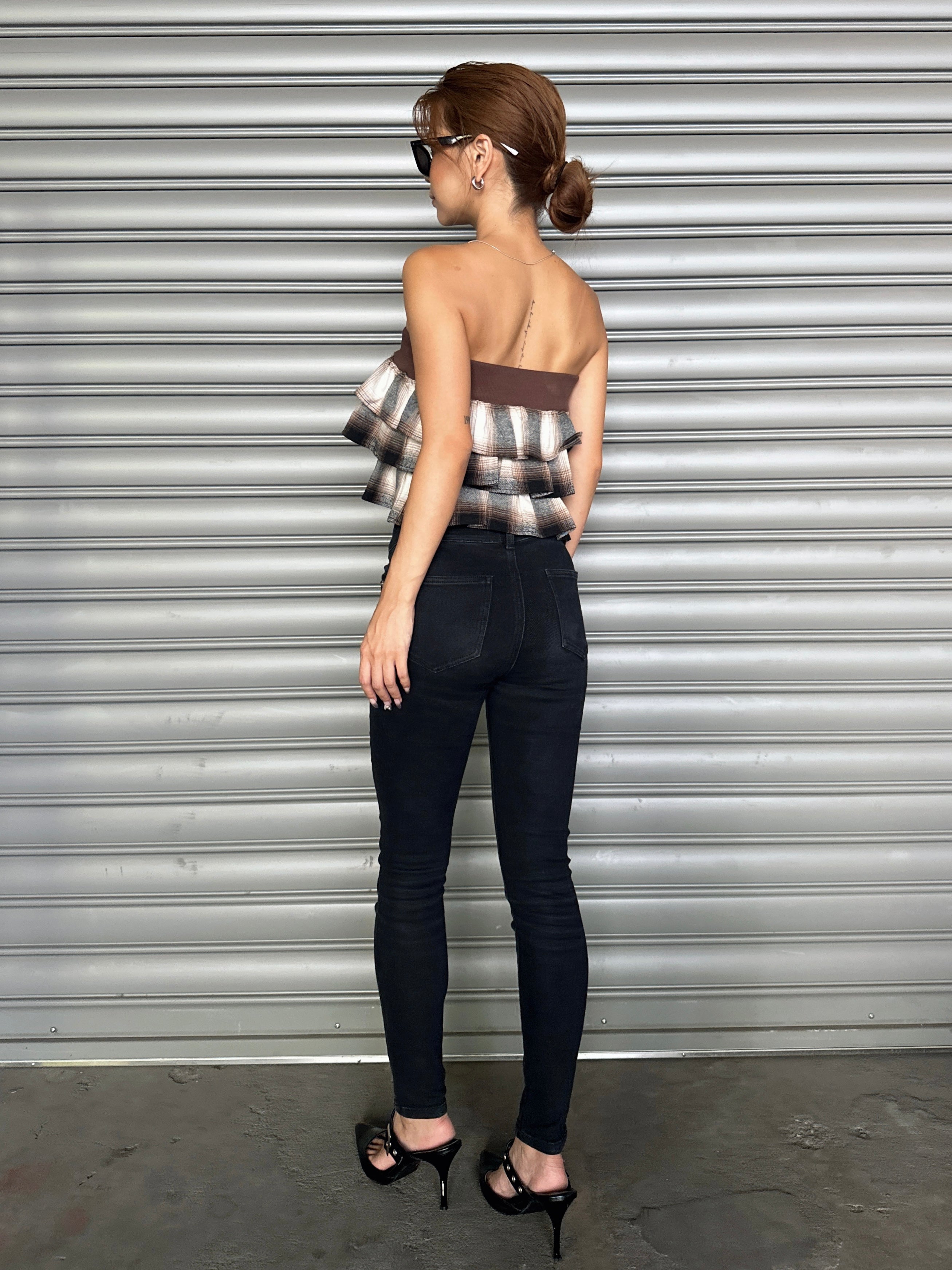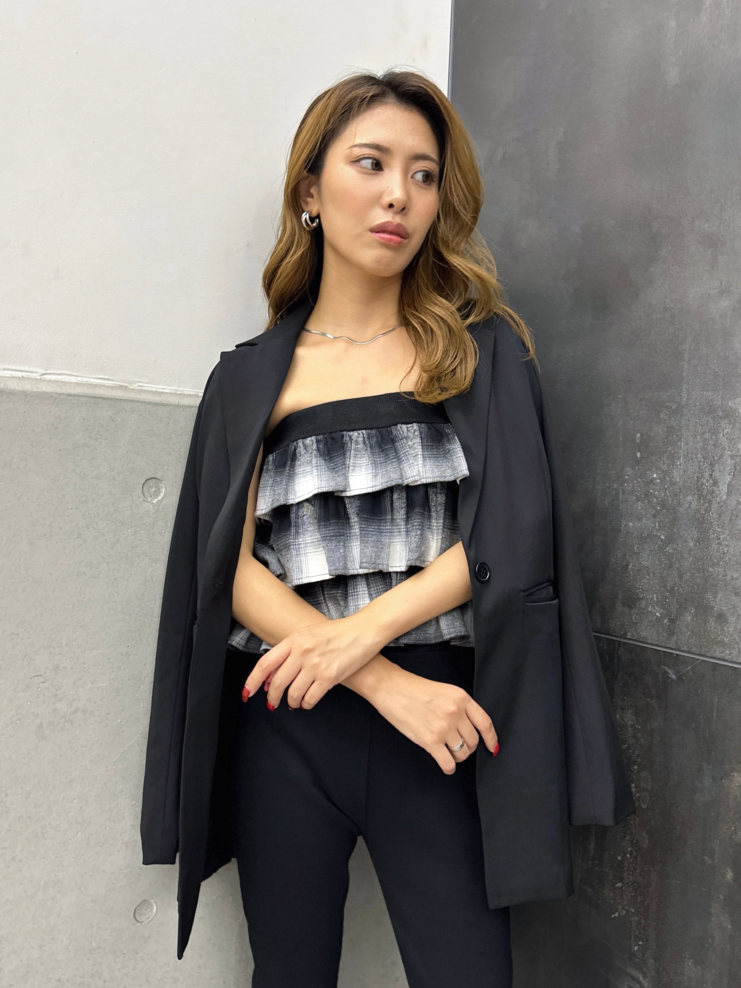 商品説明 三段チェック柄フリルが目を惹くベアトップス。