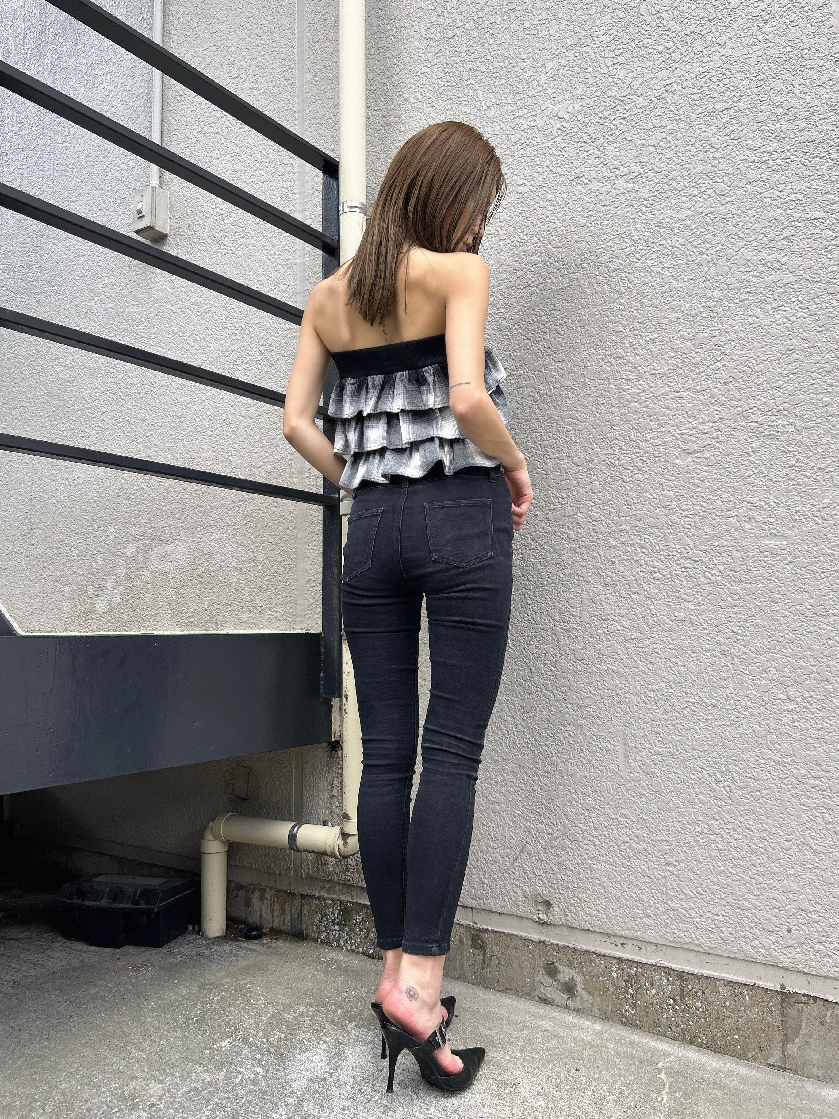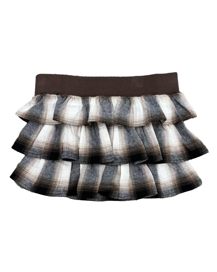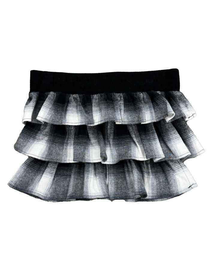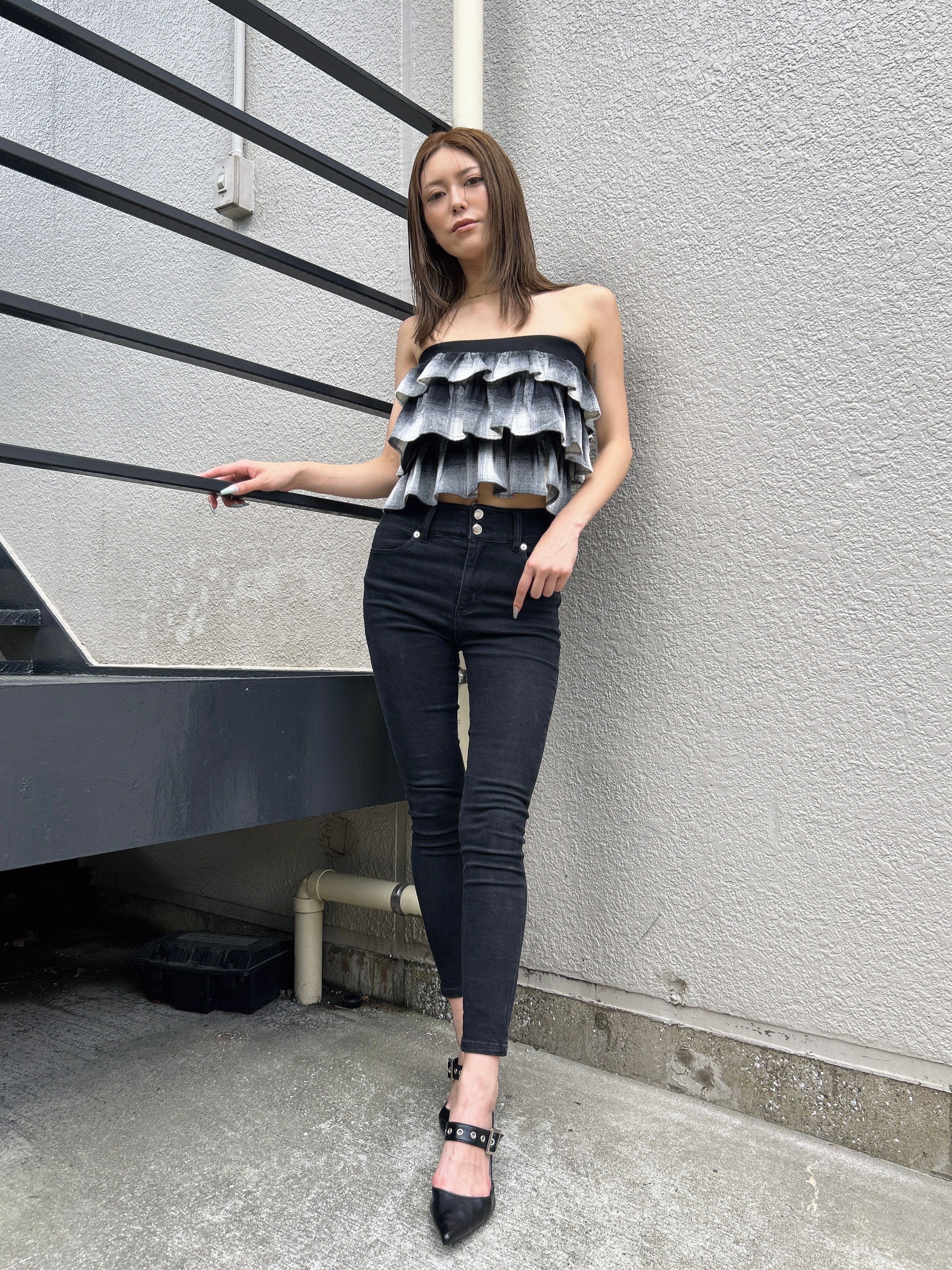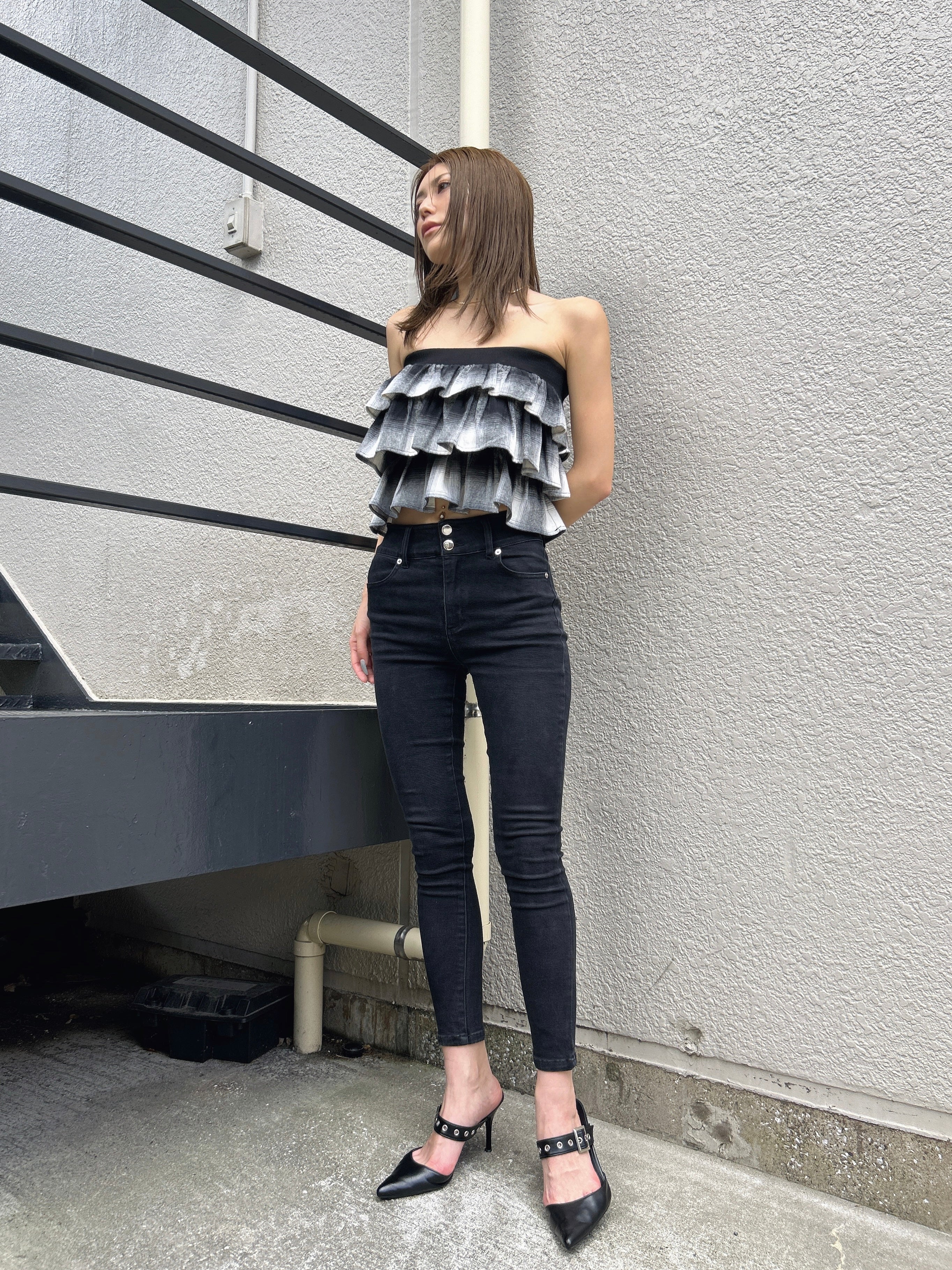 商品説明 三段チェック柄フリルが目を惹くベアトップス。