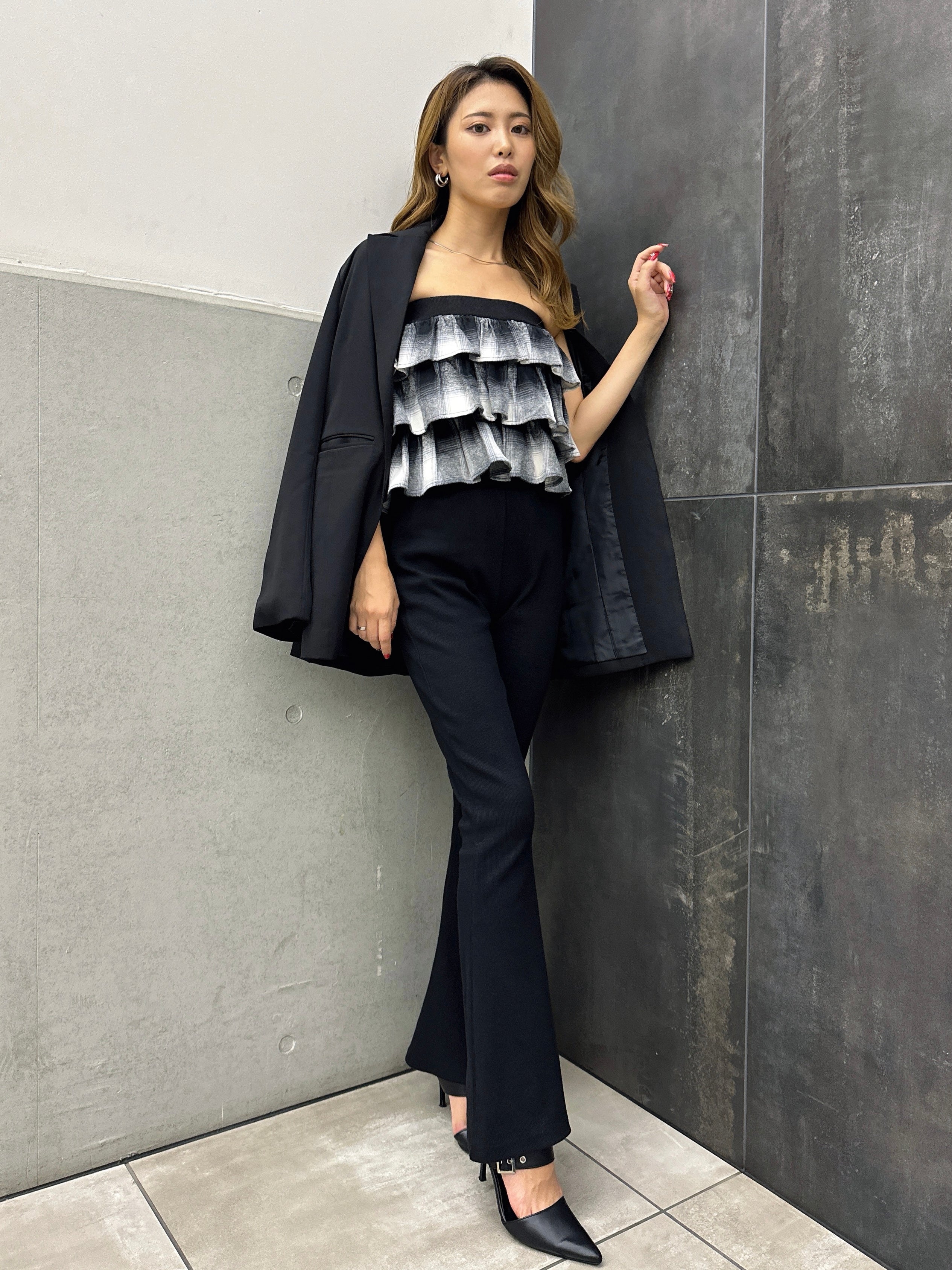 フレアパンツ、ハイウエストスキニー合わせでスタイリッシュに