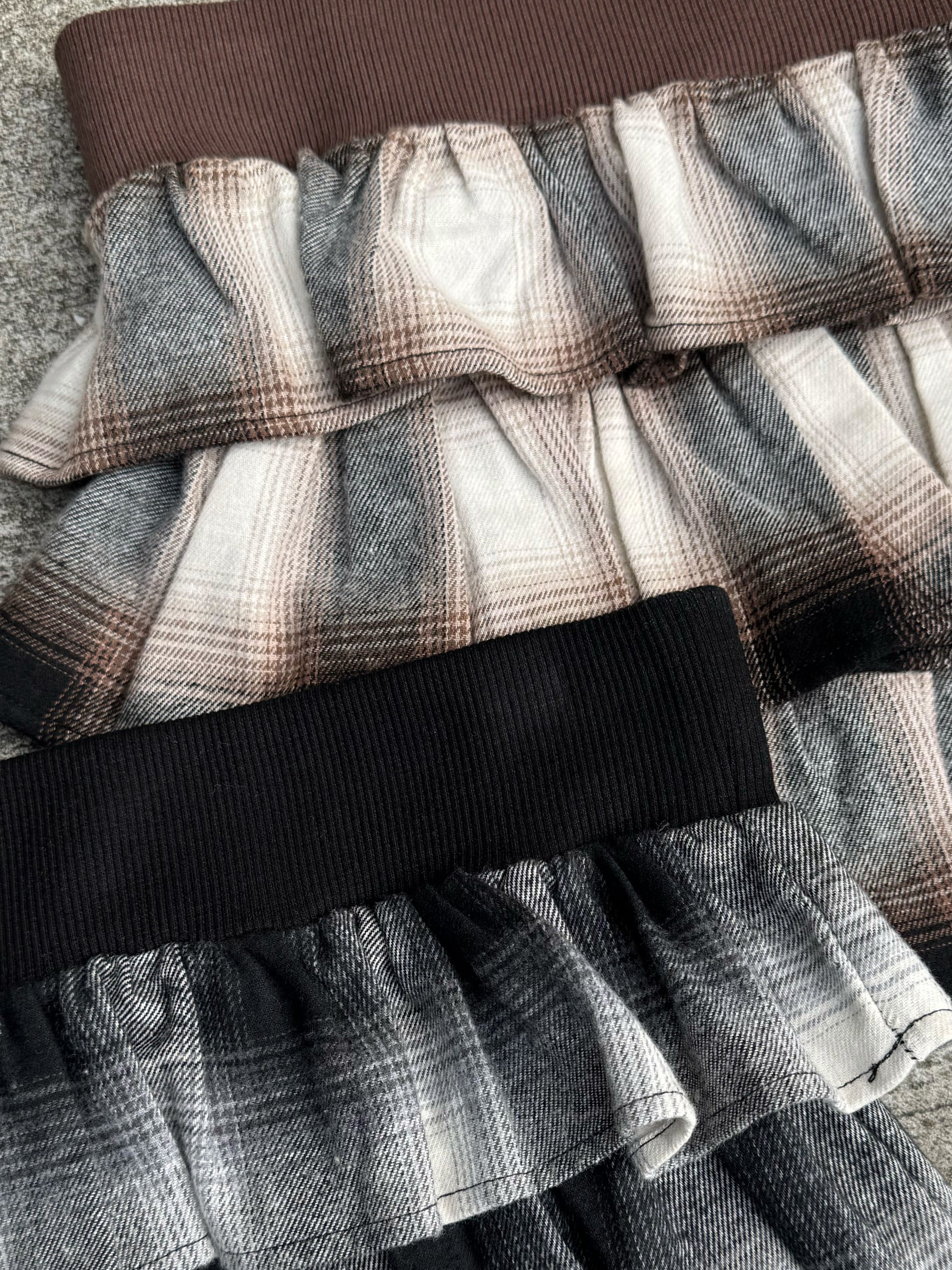 カジュアル見えし過ぎない様に、淡いカラーの大ぶりチェック柄を選びました。
