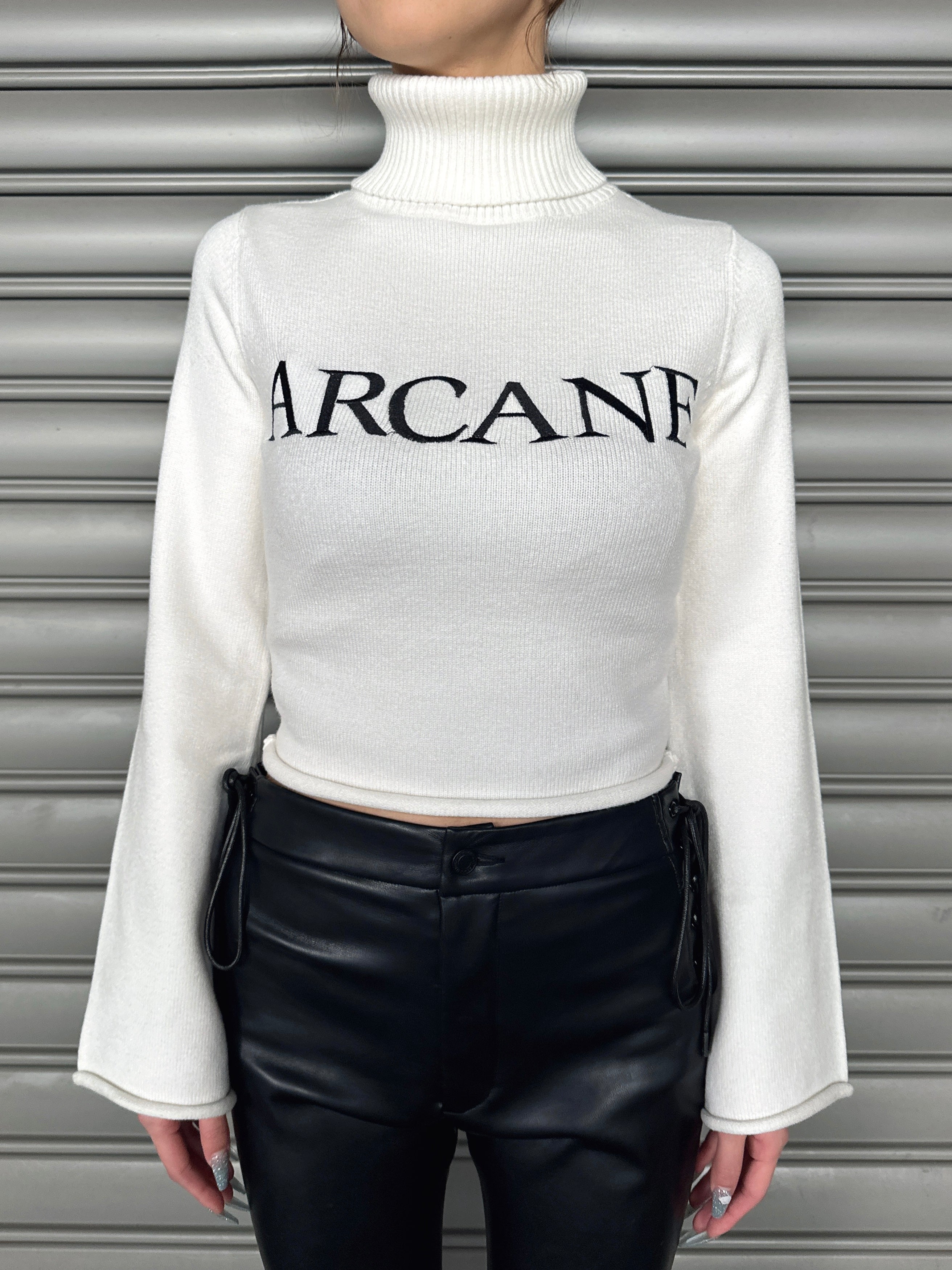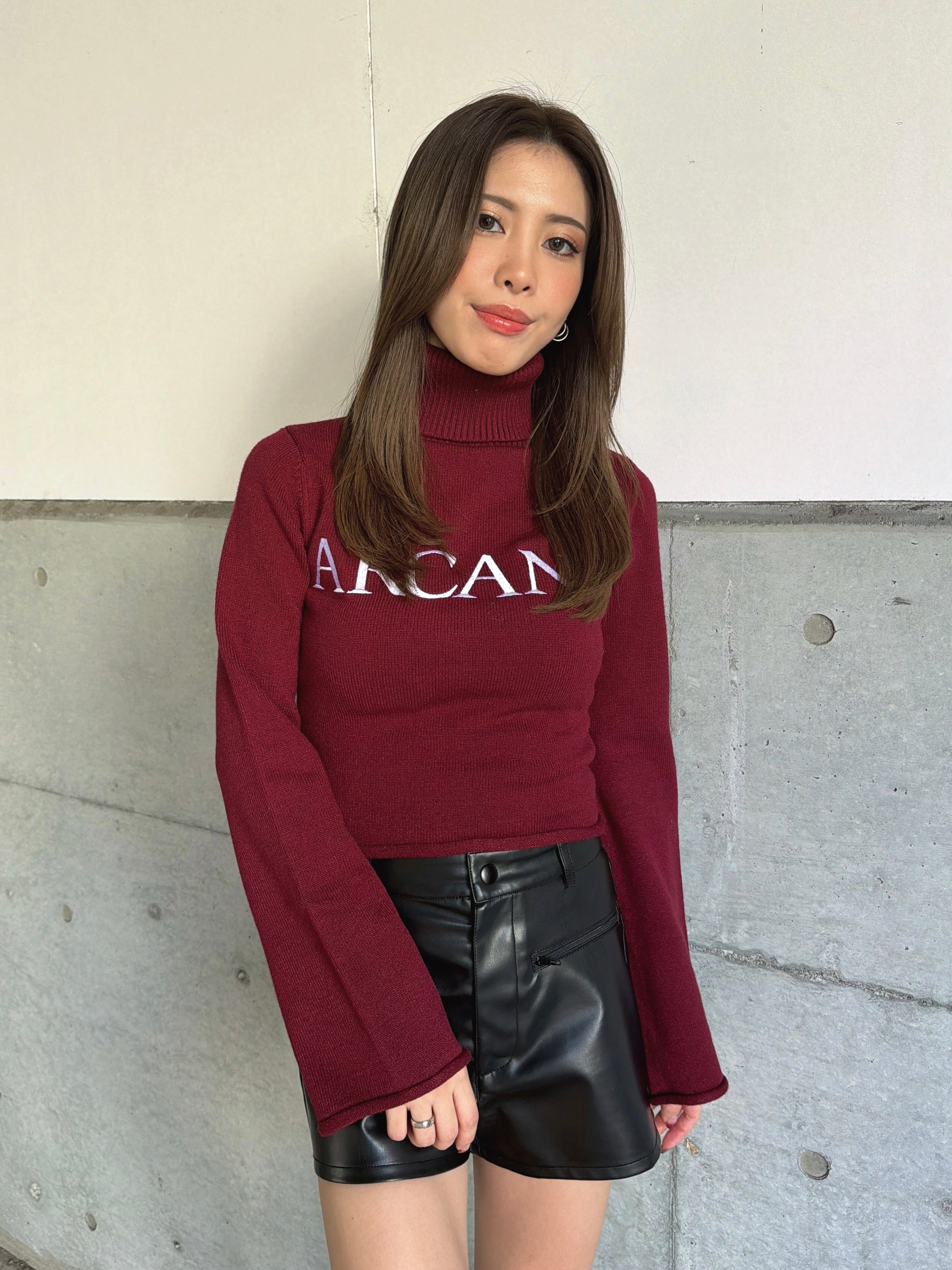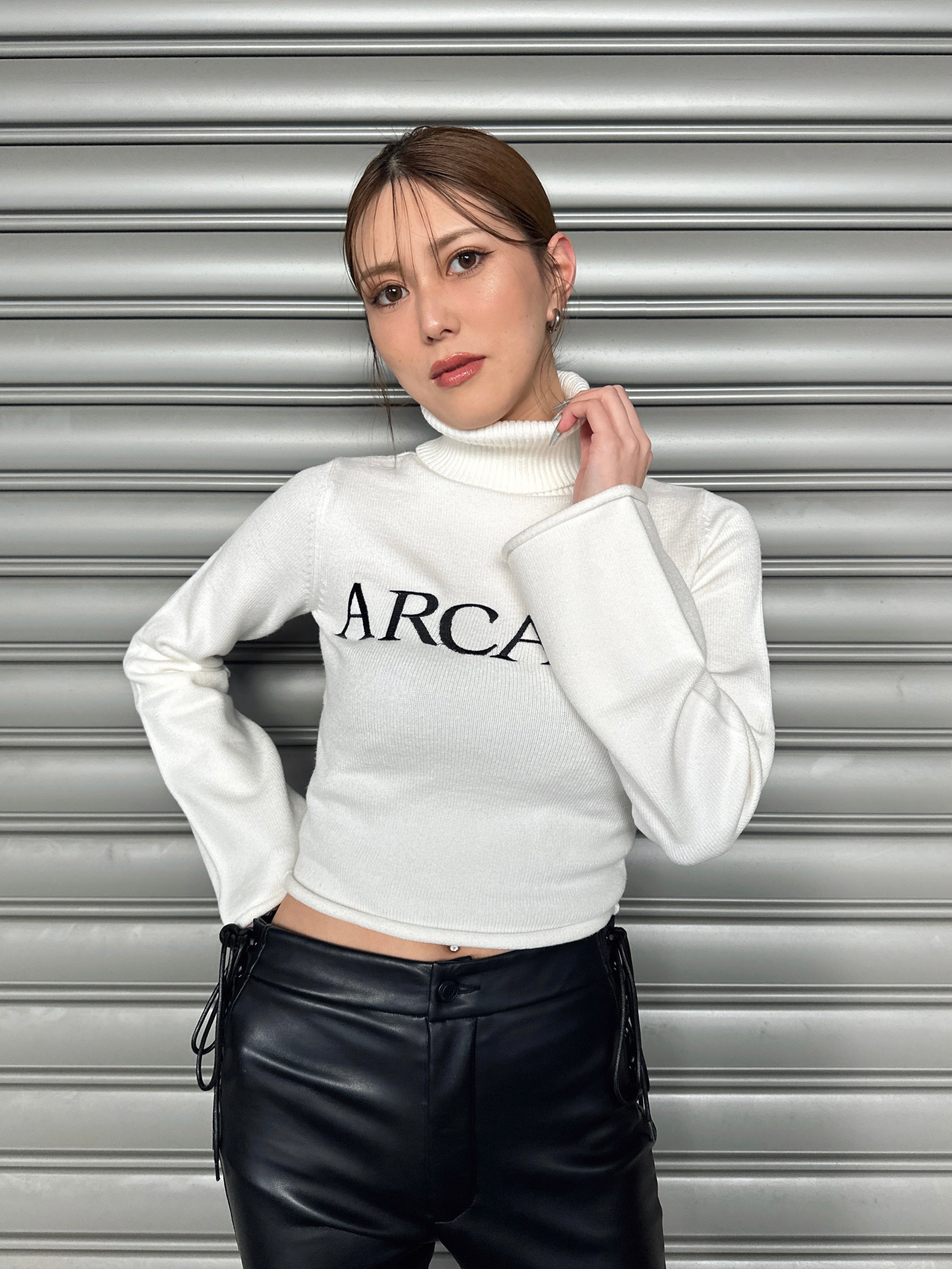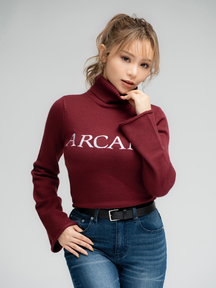 もちっと柔らかくフィット感のある糸を使用した、ショート丈タートルネックニットトップス。フロントには【ARCANE】(アーケイン:秘密の/神秘的な) という意味を持つロゴ刺繍を施しています。ロゴのフォントは大人っぽさを意識して、華奢で綺麗めな明朝体を選んでいます。袖口に向かって徐々に広がるフレアスリーブが女性らしいシルエットを演出。ボディ部分はストレッチ性のある天竺編みで、タートル部分はリブ編みにすることで首元の圧迫感を軽減し、着脱もしやすい仕様にしました。程よい厚みのある生地感はインナー使いにも最適。ジャスト丈なので、フルレングスからミニボトムまで幅広いボトムと相性抜群です。着回しができるので一枚は持っていたい万能アイテムです。