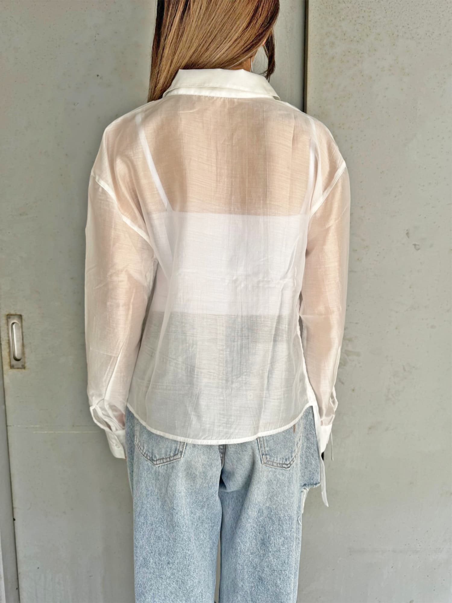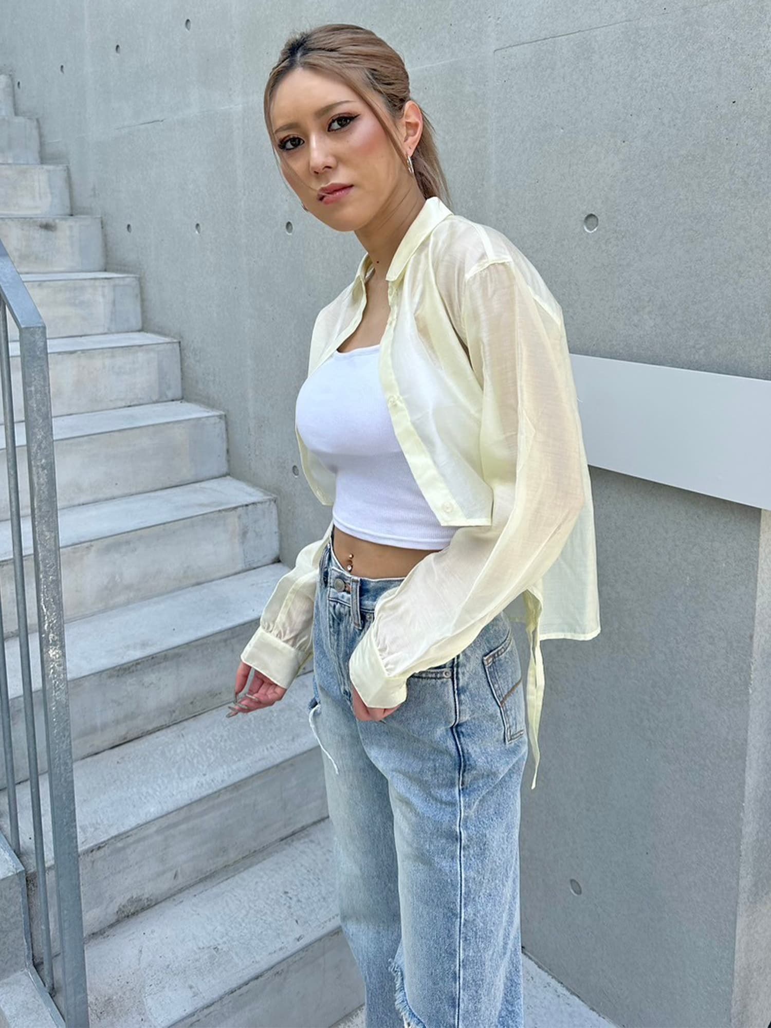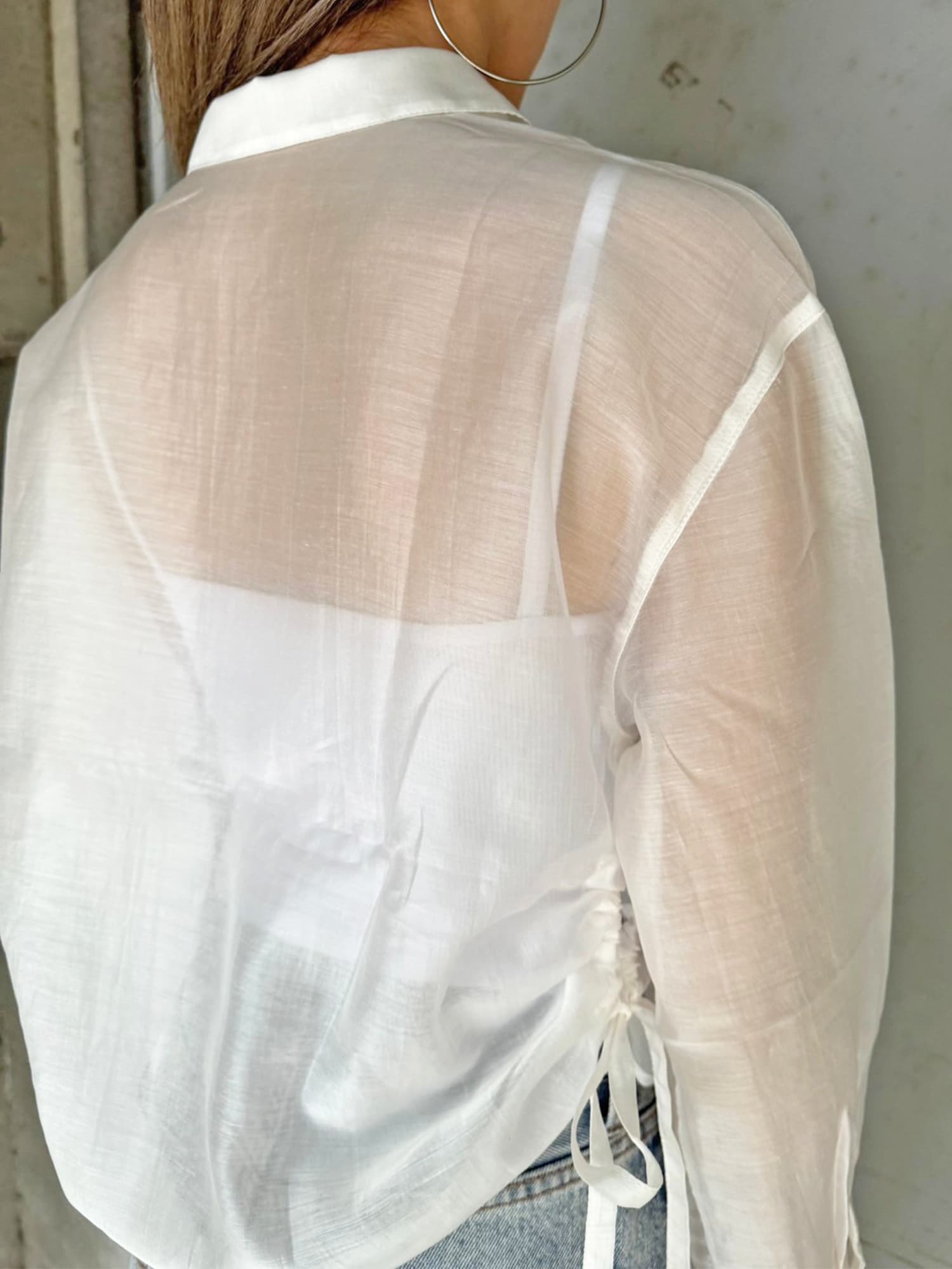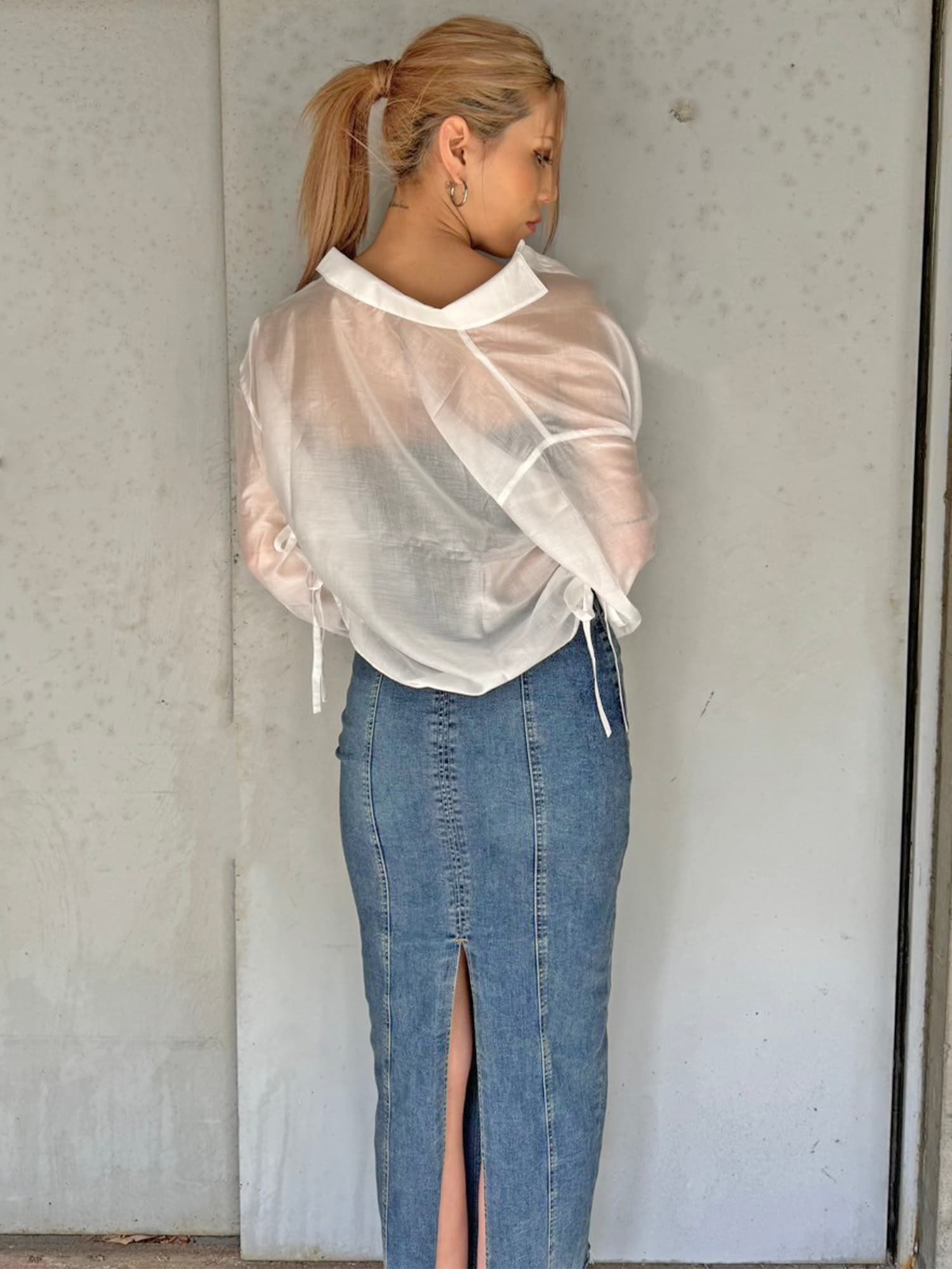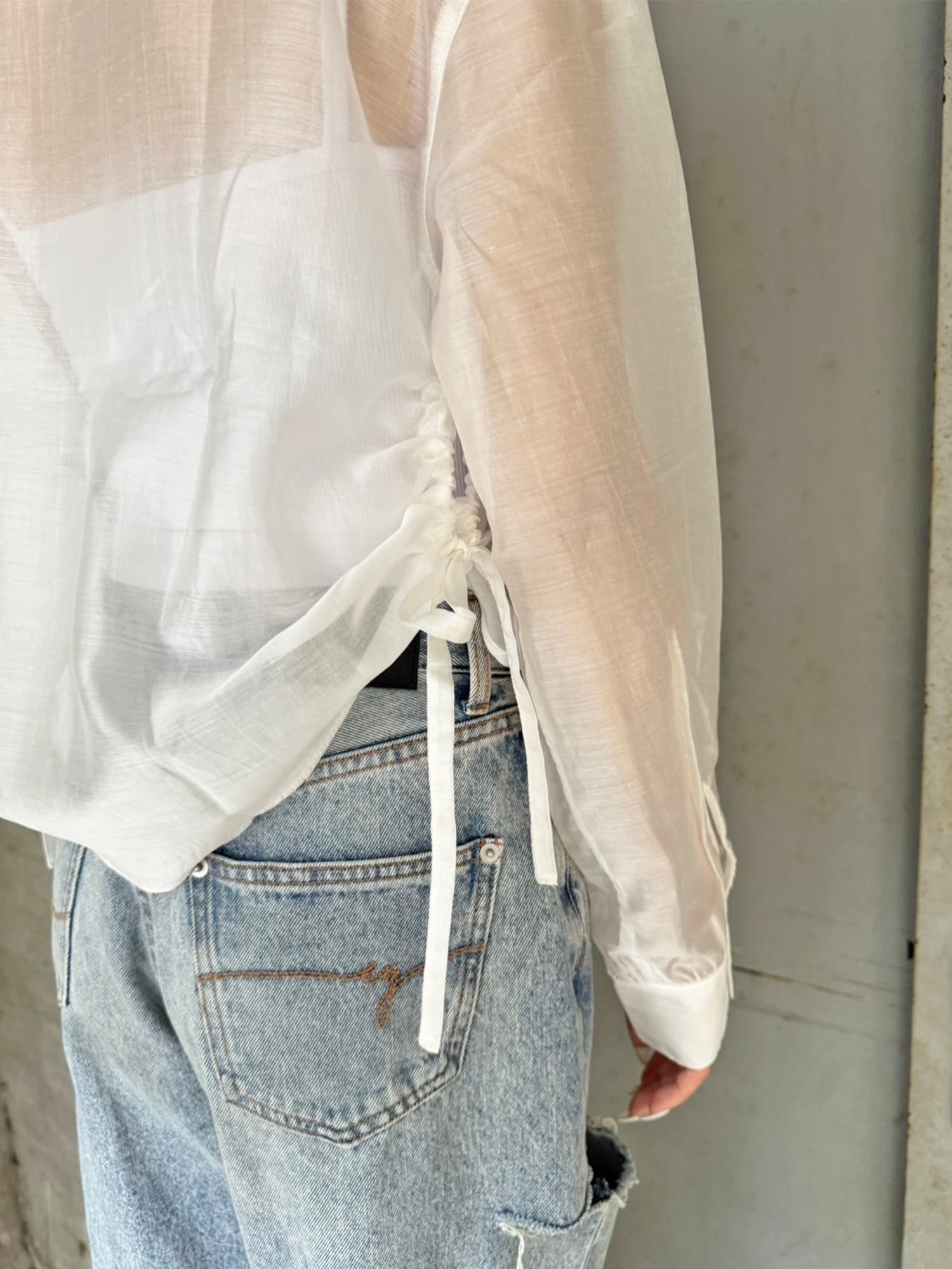 脇の下から裾に向かってスリットとスピンドルを入れたデザインシャツは好きなようにアレンジができ、オリジナリティを楽しめるアイテム。スリットのままの状態や絞って方結びにしたりとあえてリボン結びにせず、モードに着こなすのもおススメです。また透け感を利用して見せるインナー合わせがマスト。この時期羽織りとしても着用できるショート丈は素材も軽く持ち運びにも便利なため様々なシーンでお使いいただけます。