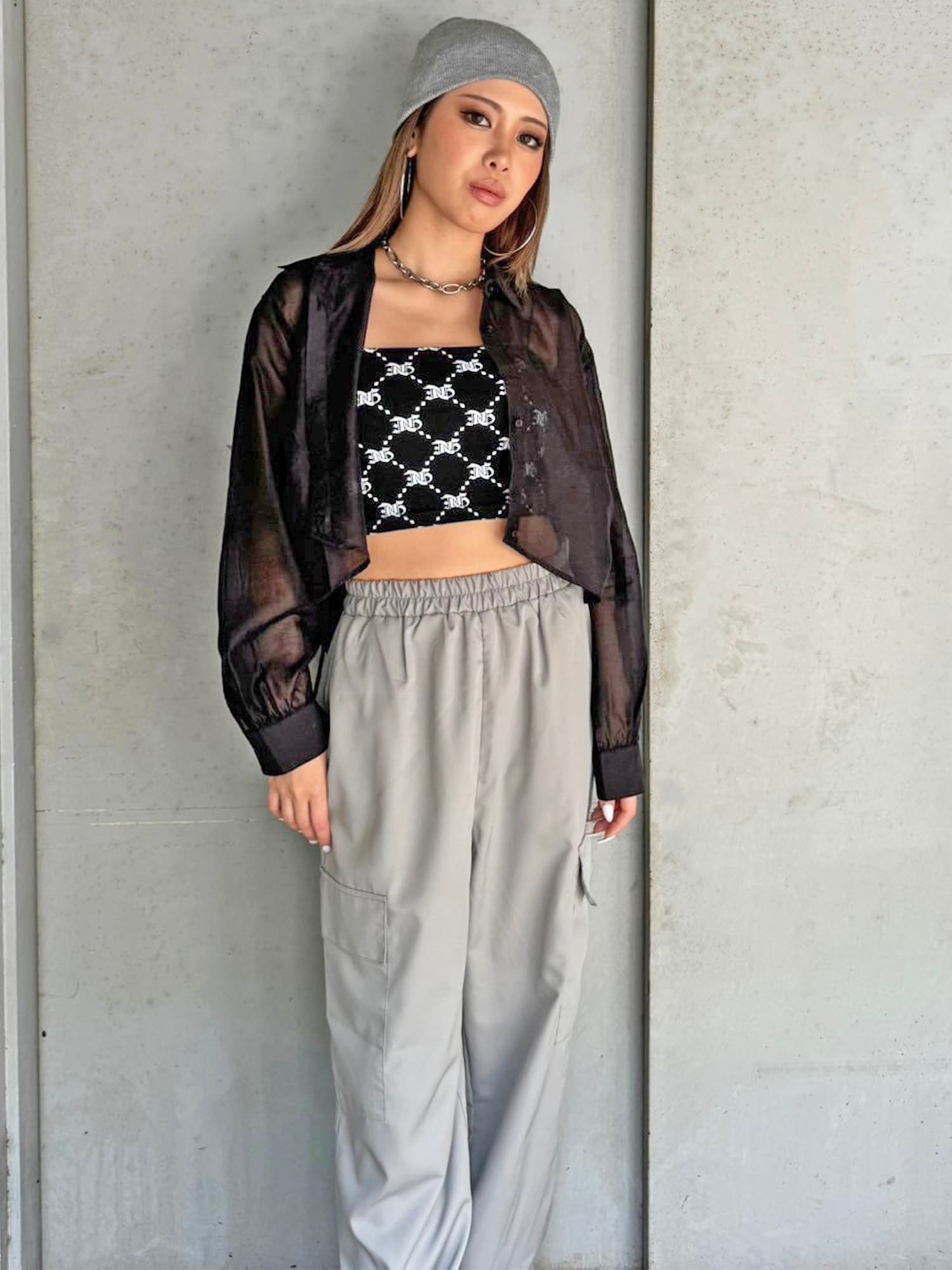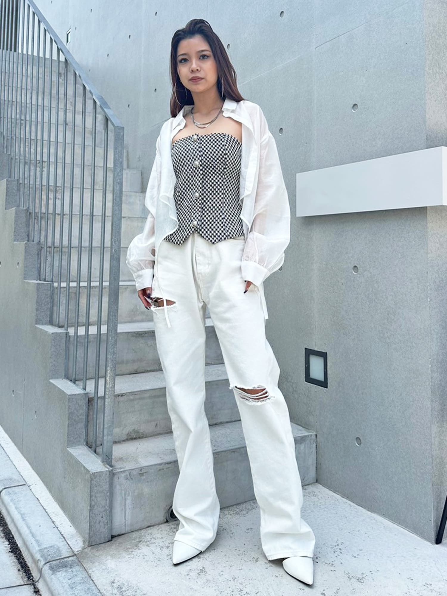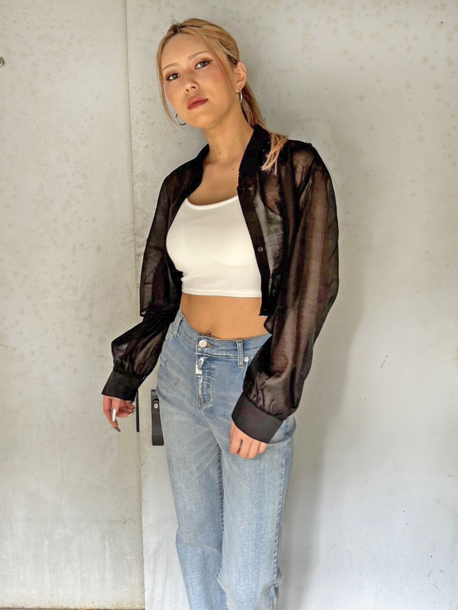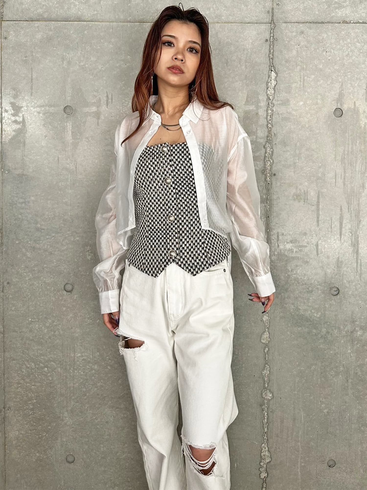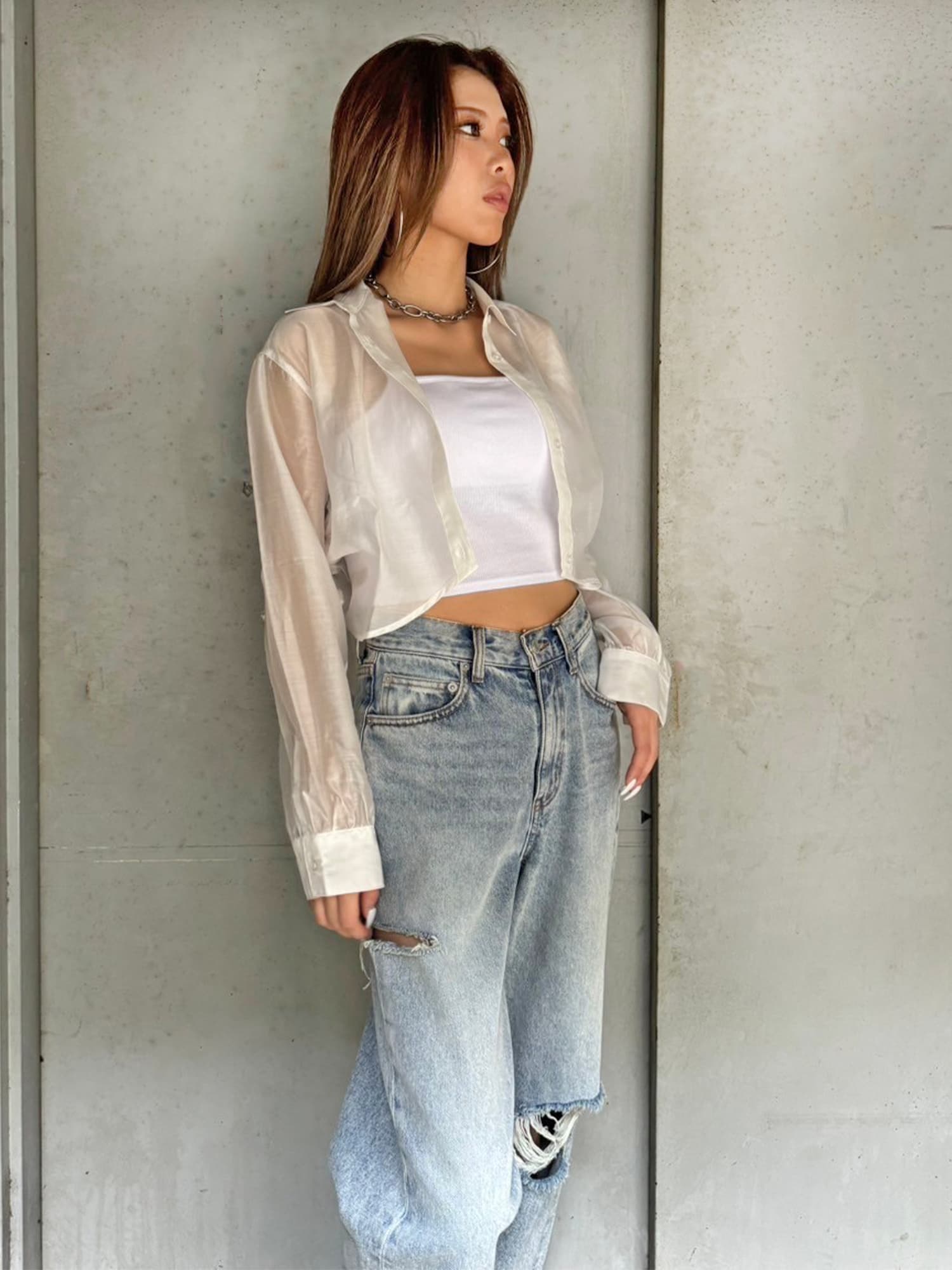 脇の下から裾に向かってスリットとスピンドルを入れたデザインシャツは好きなようにアレンジができ、オリジナリティを楽しめるアイテム。スリットのままの状態や絞って方結びにしたりとあえてリボン結びにせず、モードに着こなすのもおススメです。また透け感を利用して見せるインナー合わせがマスト。この時期羽織りとしても着用できるショート丈は素材も軽く持ち運びにも便利なため様々なシーンでお使いいただけます。