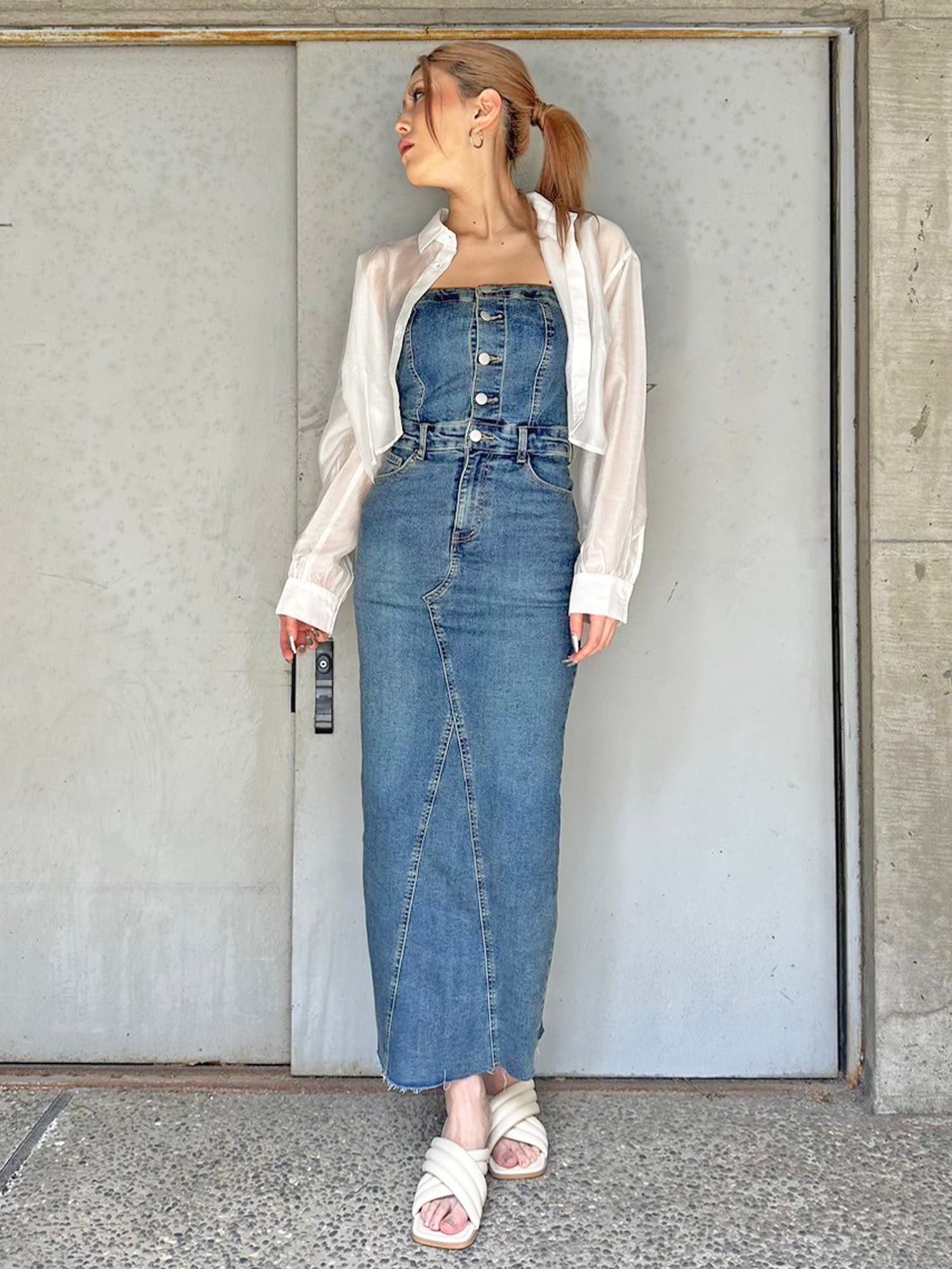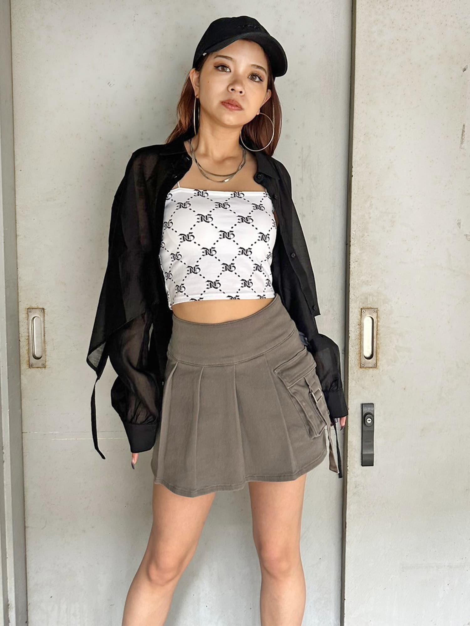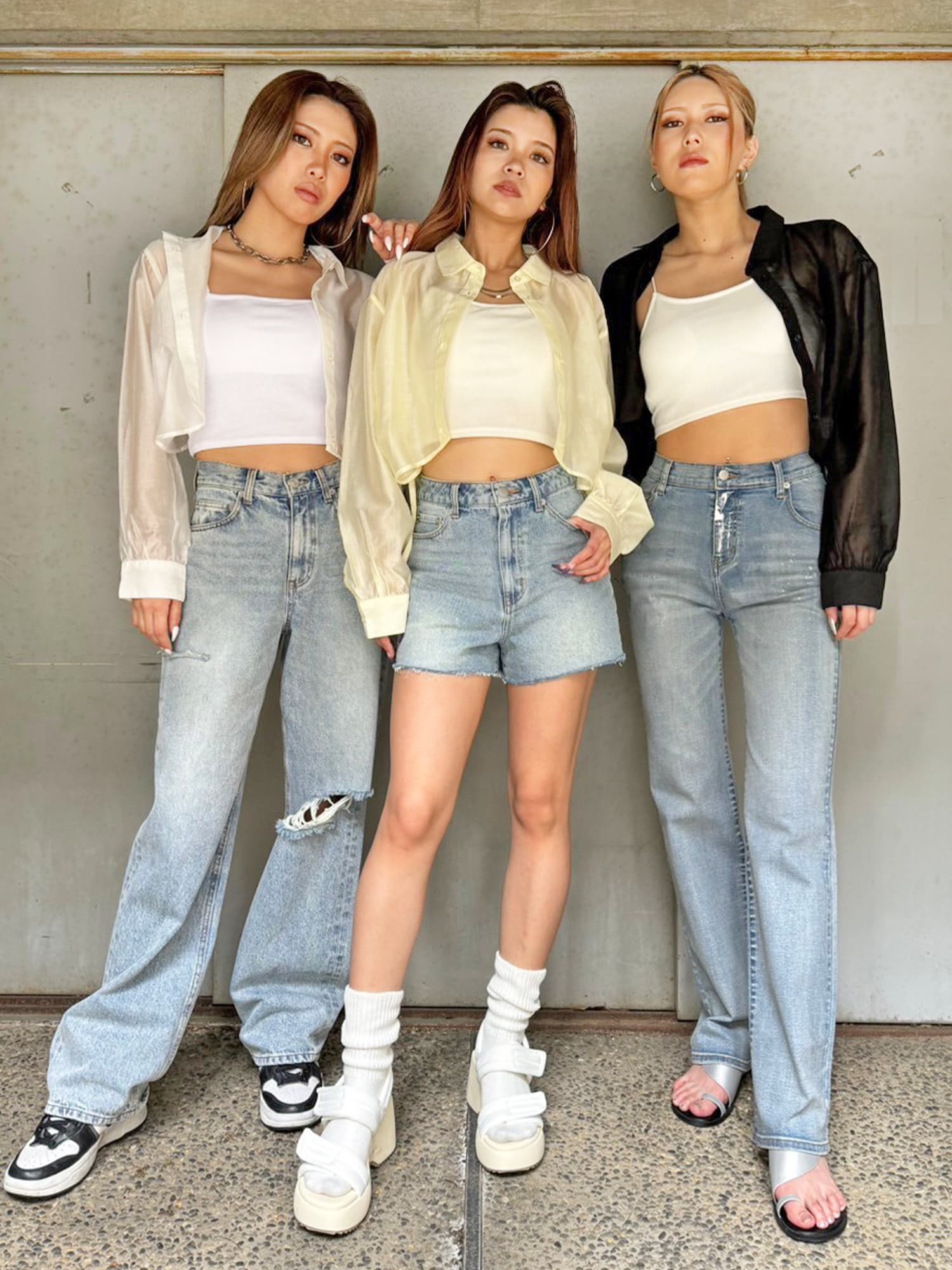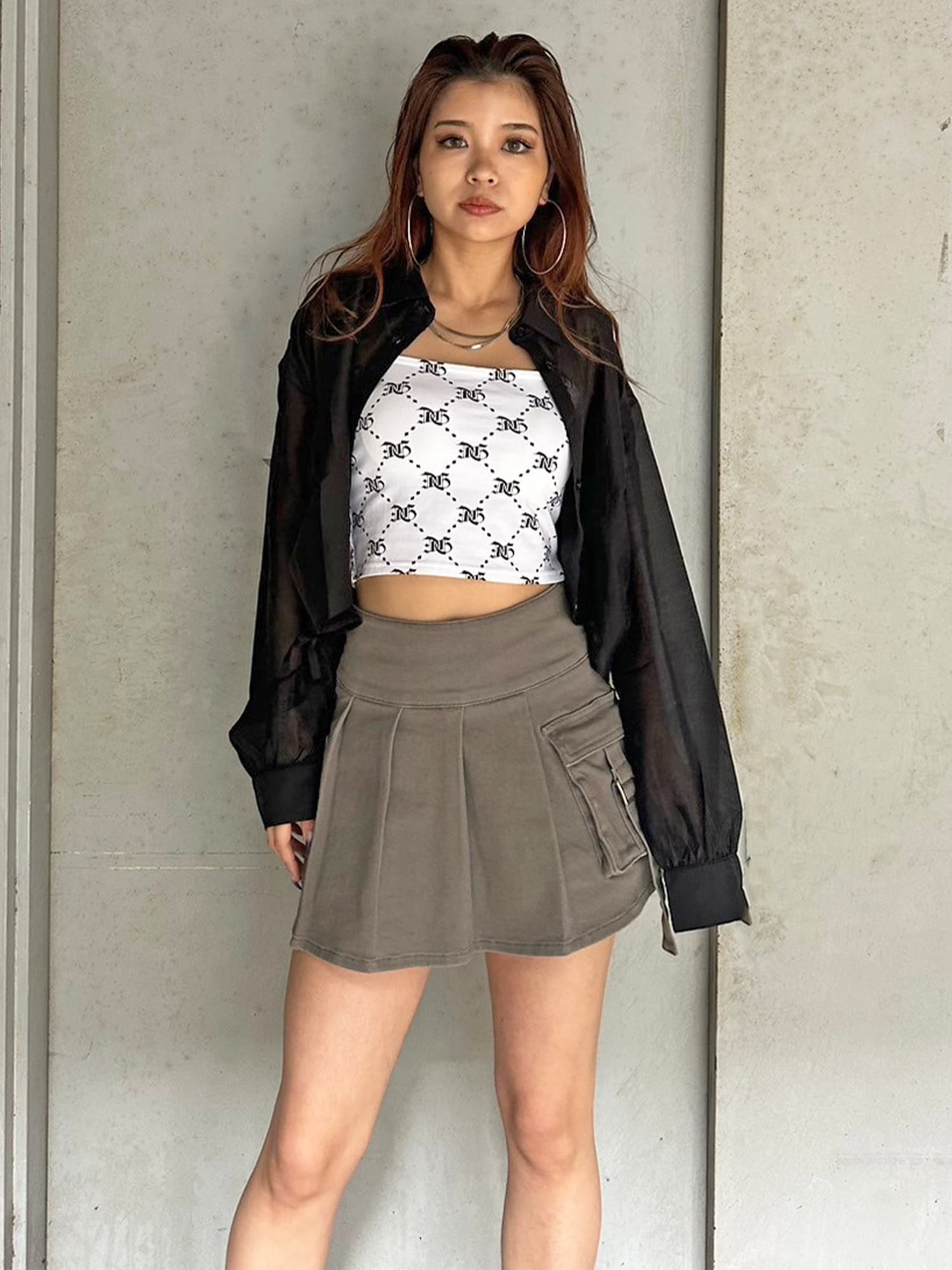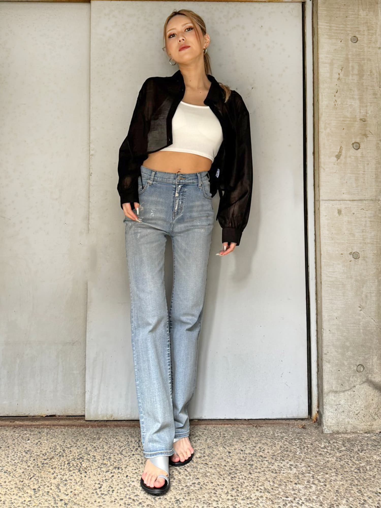 脇の下から裾に向かってスリットとスピンドルを入れたデザインシャツは好きなようにアレンジができ、オリジナリティを楽しめるアイテム。スリットのままの状態や絞って方結びにしたりとあえてリボン結びにせず、モードに着こなすのもおススメです。また透け感を利用して見せるインナー合わせがマスト。この時期羽織りとしても着用できるショート丈は素材も軽く持ち運びにも便利なため様々なシーンでお使いいただけます。