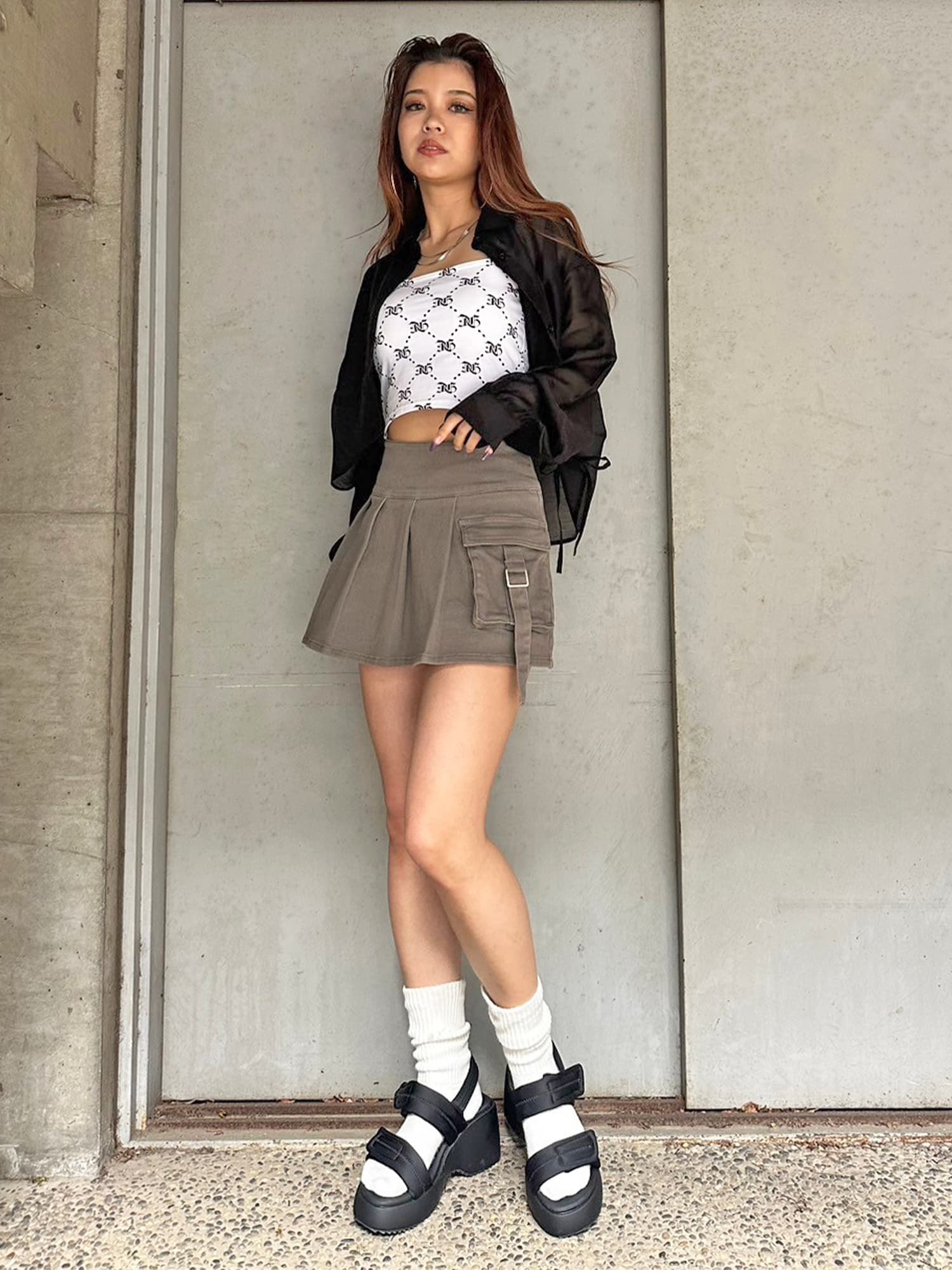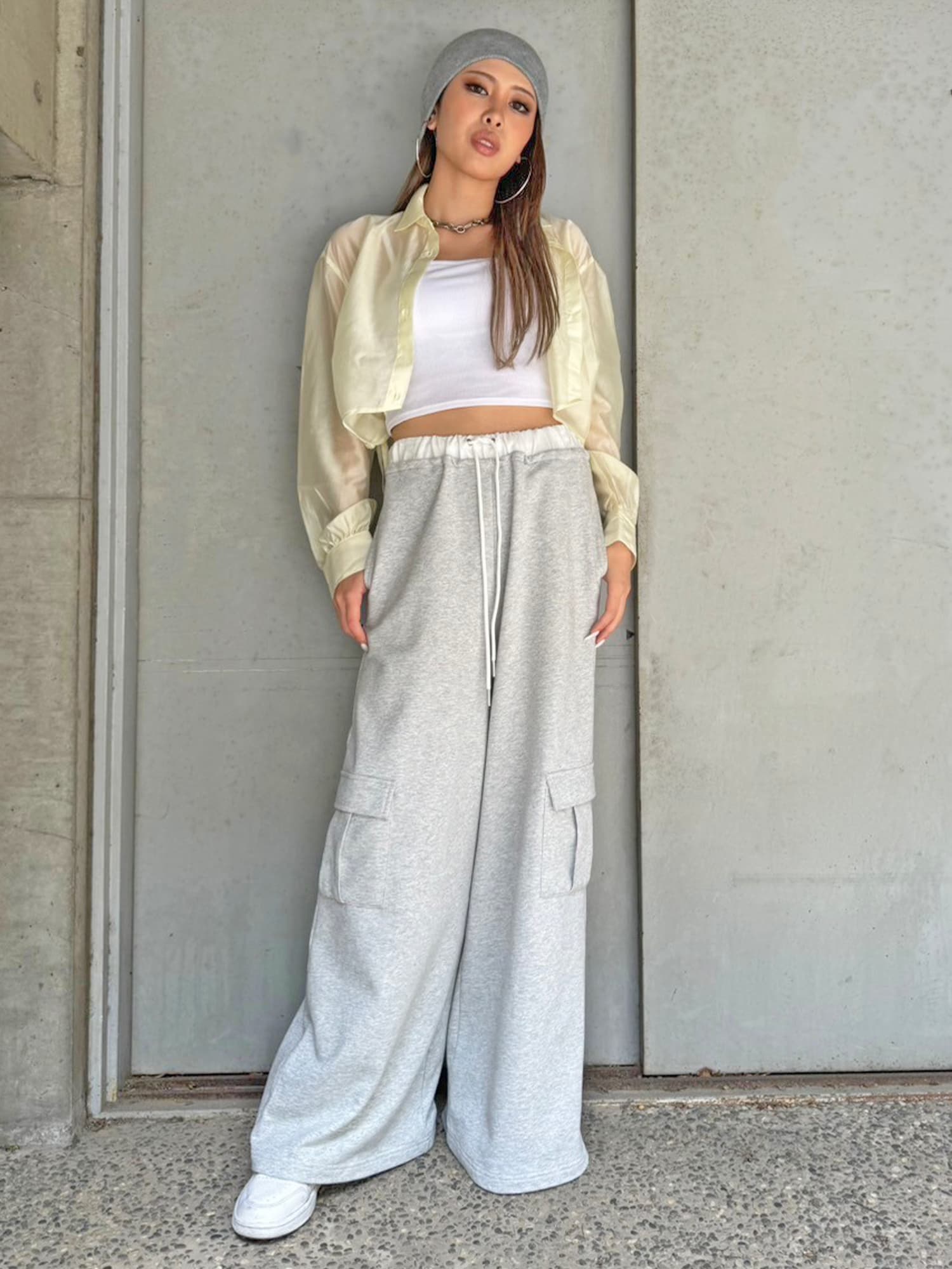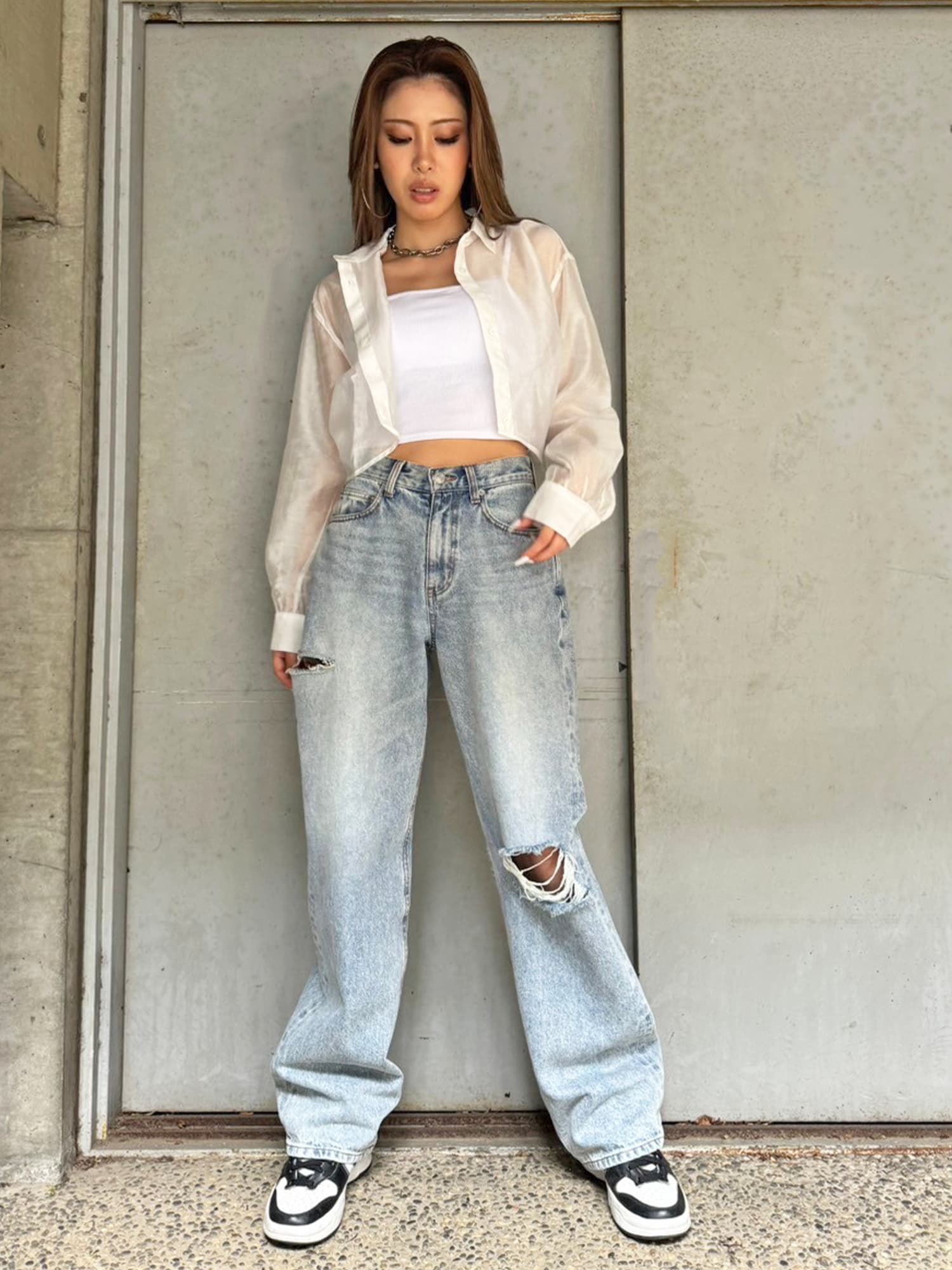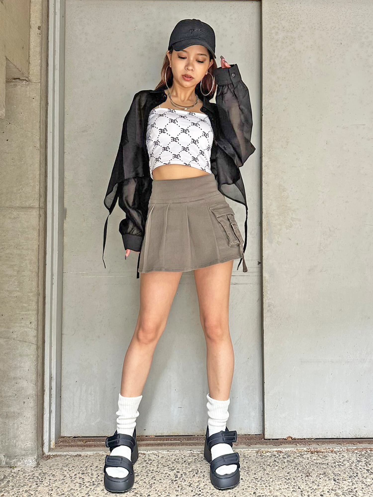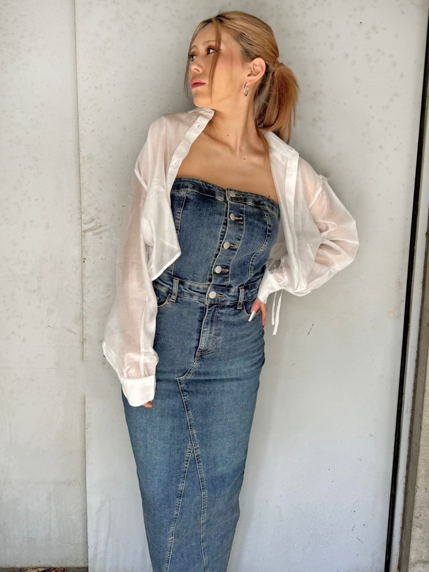 脇の下から裾に向かってスリットとスピンドルを入れたデザインシャツは好きなようにアレンジができ、オリジナリティを楽しめるアイテム。スリットのままの状態や絞って方結びにしたりとあえてリボン結びにせず、モードに着こなすのもおススメです。また透け感を利用して見せるインナー合わせがマスト。この時期羽織りとしても着用できるショート丈は素材も軽く持ち運びにも便利なため様々なシーンでお使いいただけます。