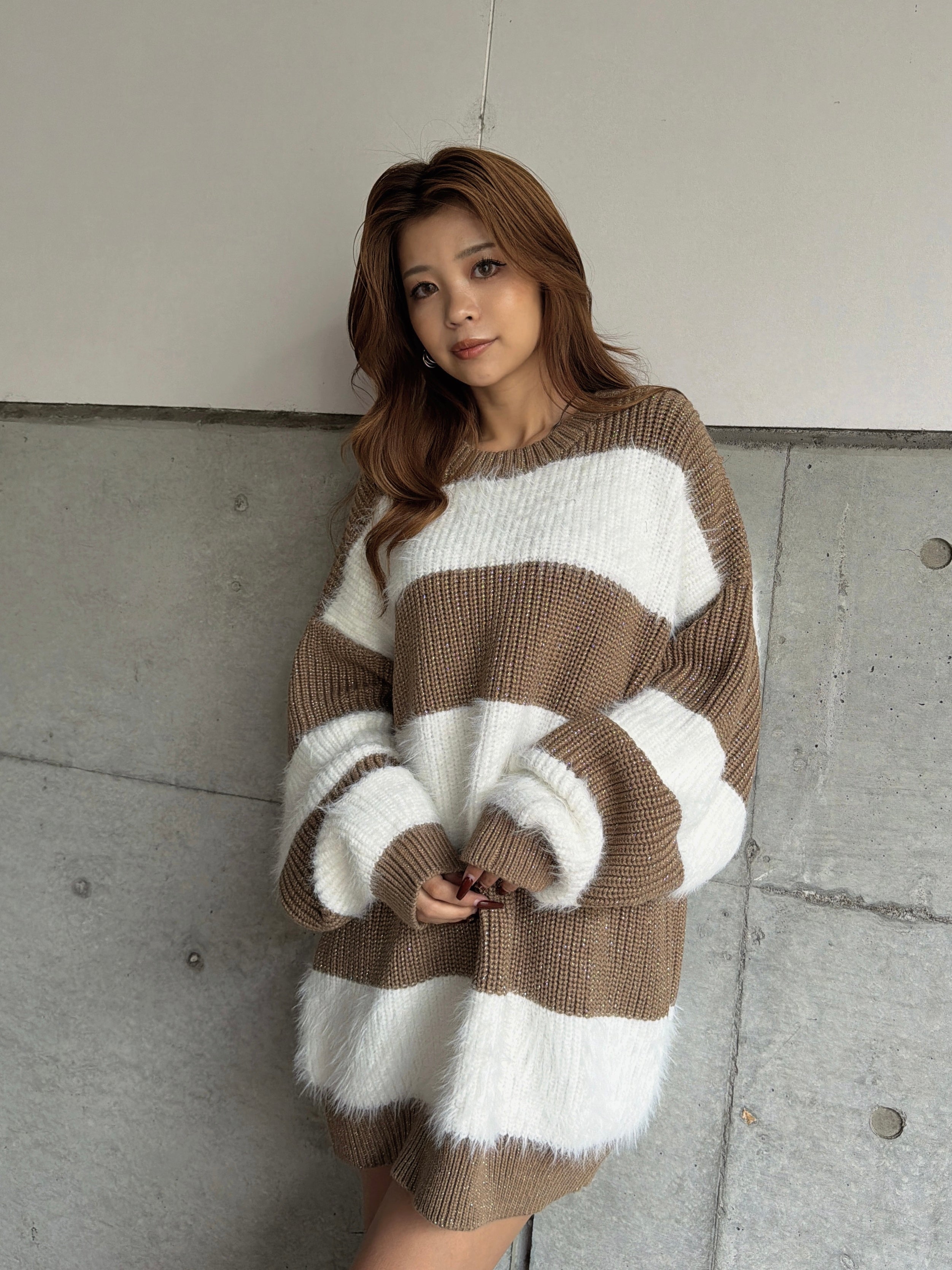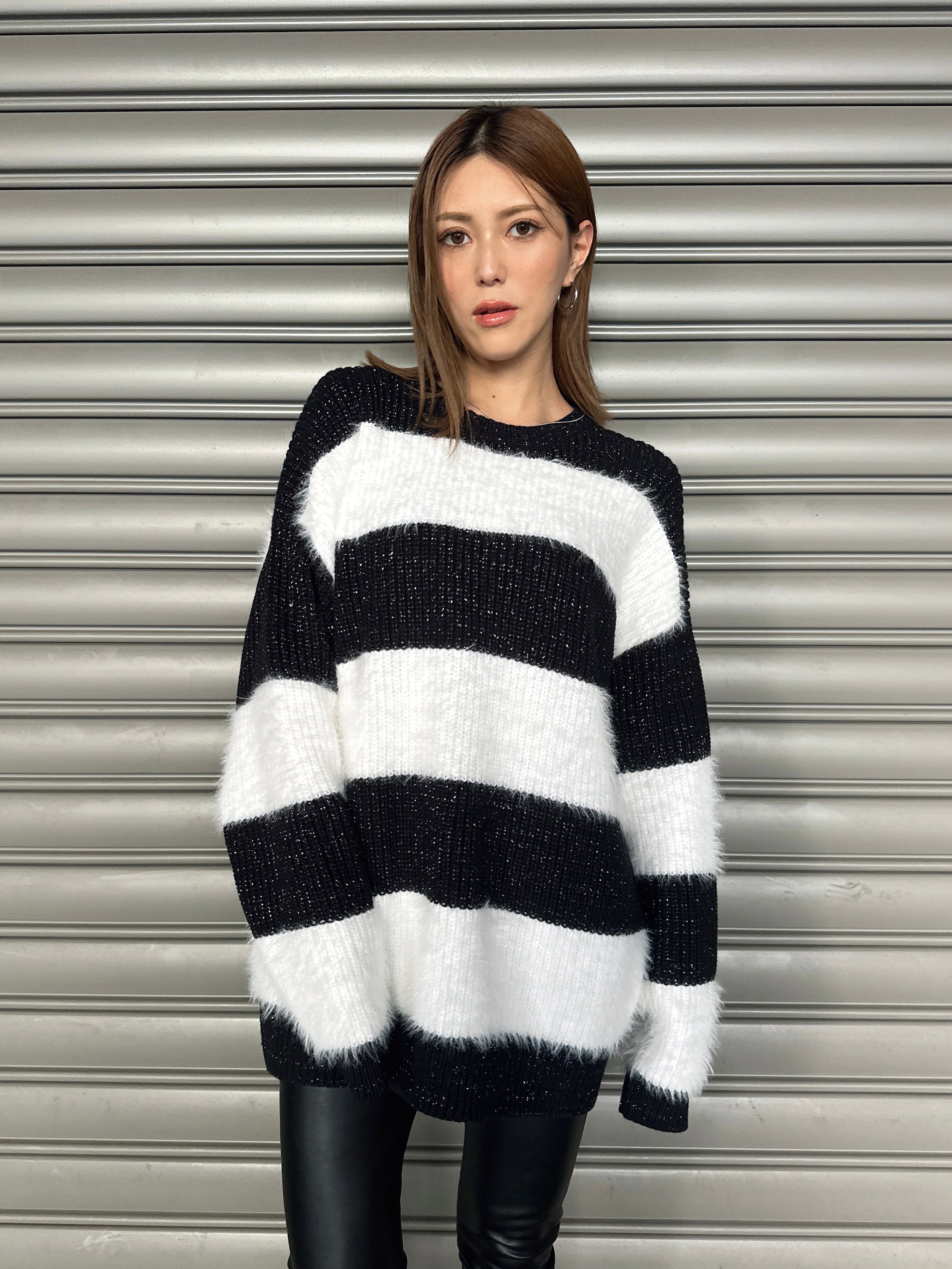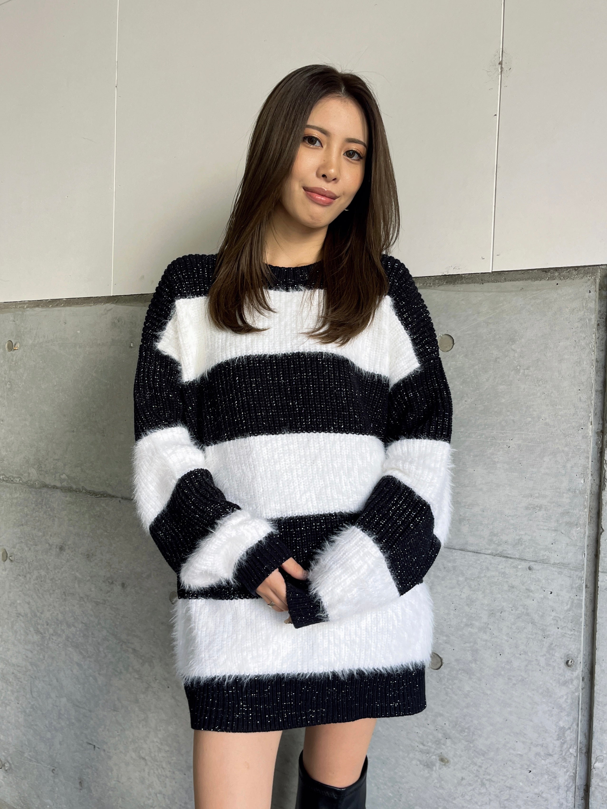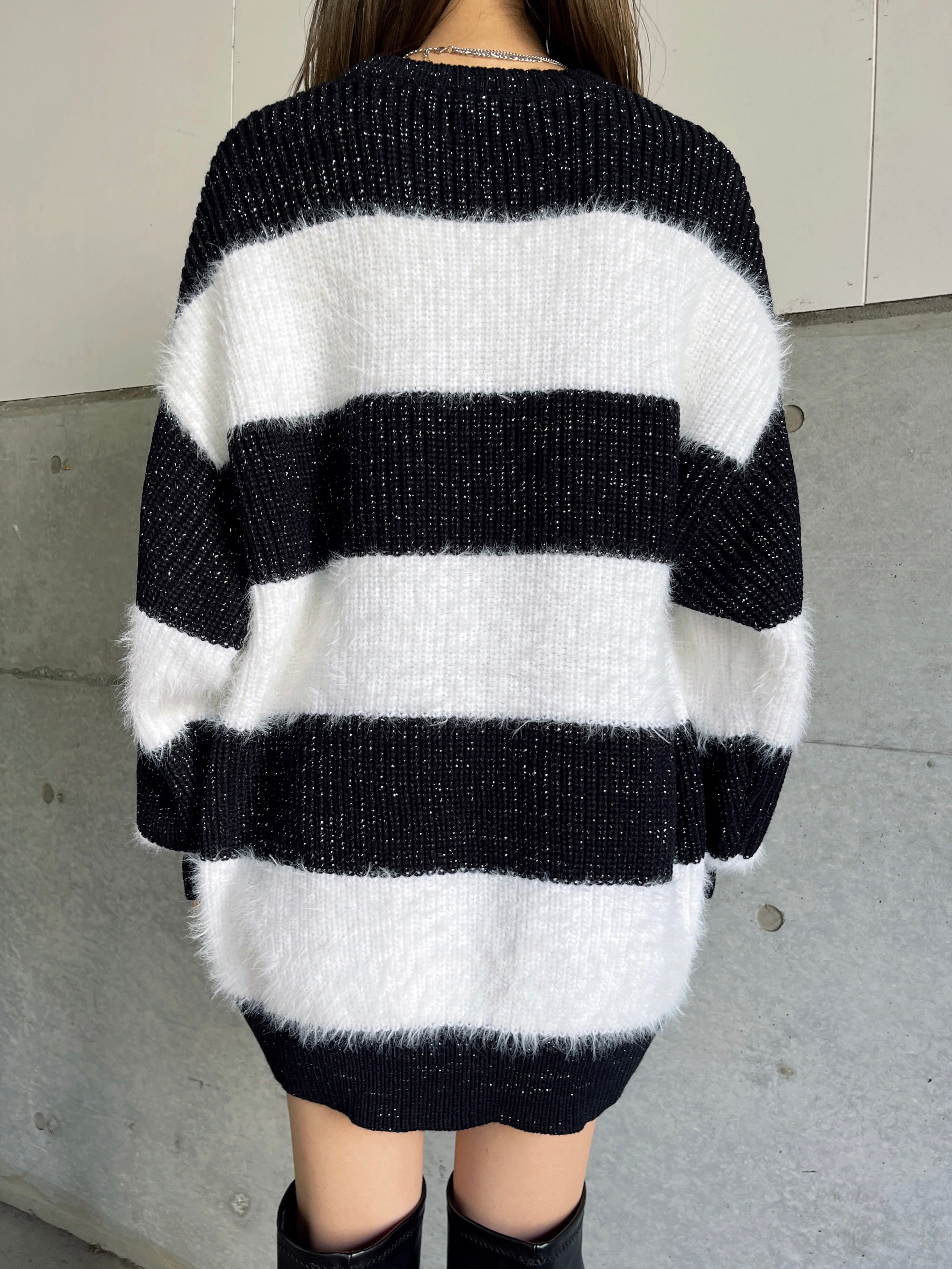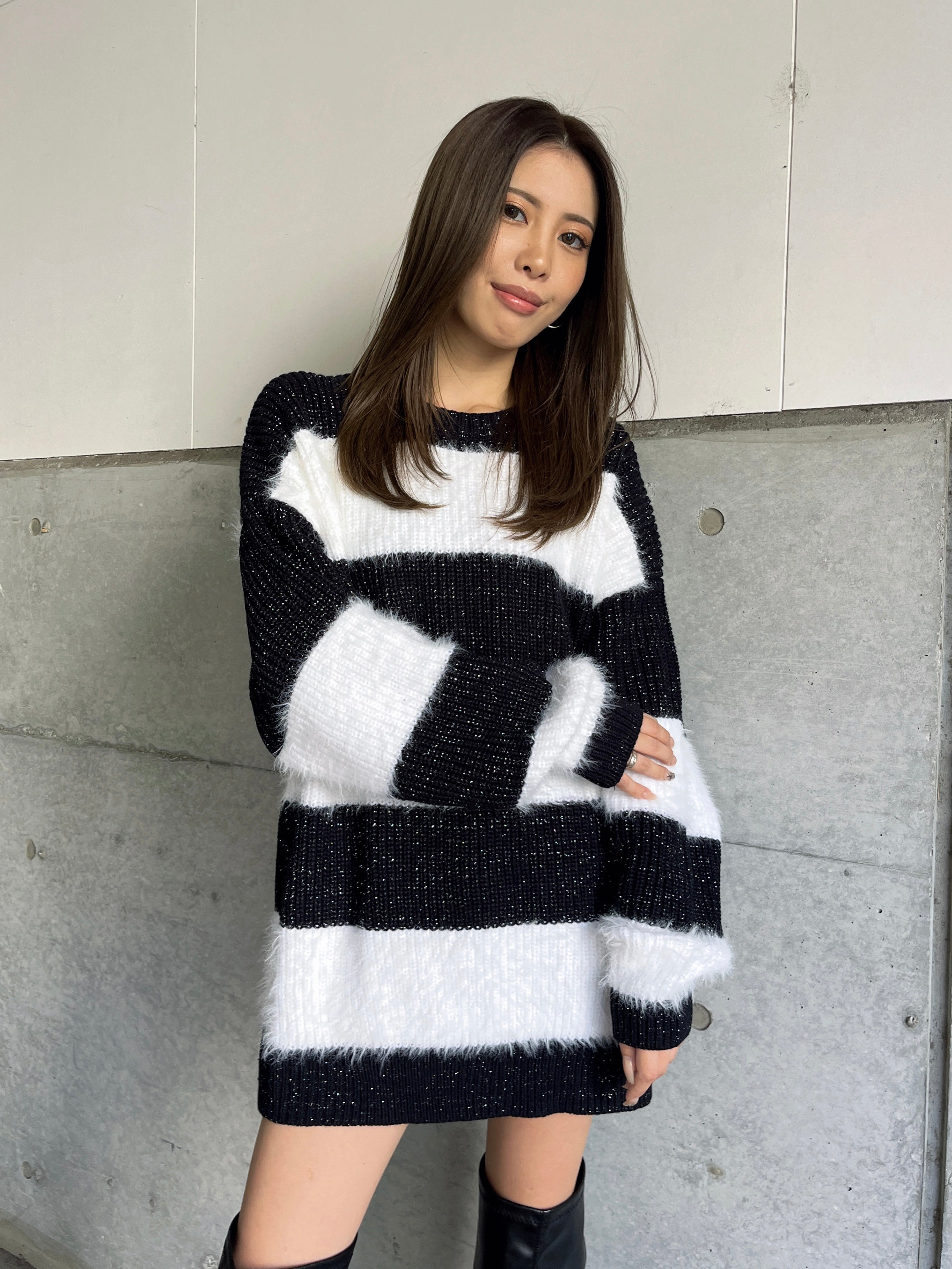 ふわっと柔らかいシャギーときらびやかなアクリルラメニットを使用したボーダーニットップス。太めのピッチボーダーが目を惹き、コーディネートに存在感のあるアクセントをプラスします。袖口にたまるスリーブが着るだけで女性らしい柔らかな印象を演出。ゆったりとしたシルエットが体を優しく包み込み、気負わずにトレンド感を楽しめる一枚です。程よく開いたラウンドネックが、顔回りをすっきりとさせてくれます。着丈はヒップ隠れる長さに設定しているので、ミニボトムとロングブーツを合わせた王道コーデがオススメです。