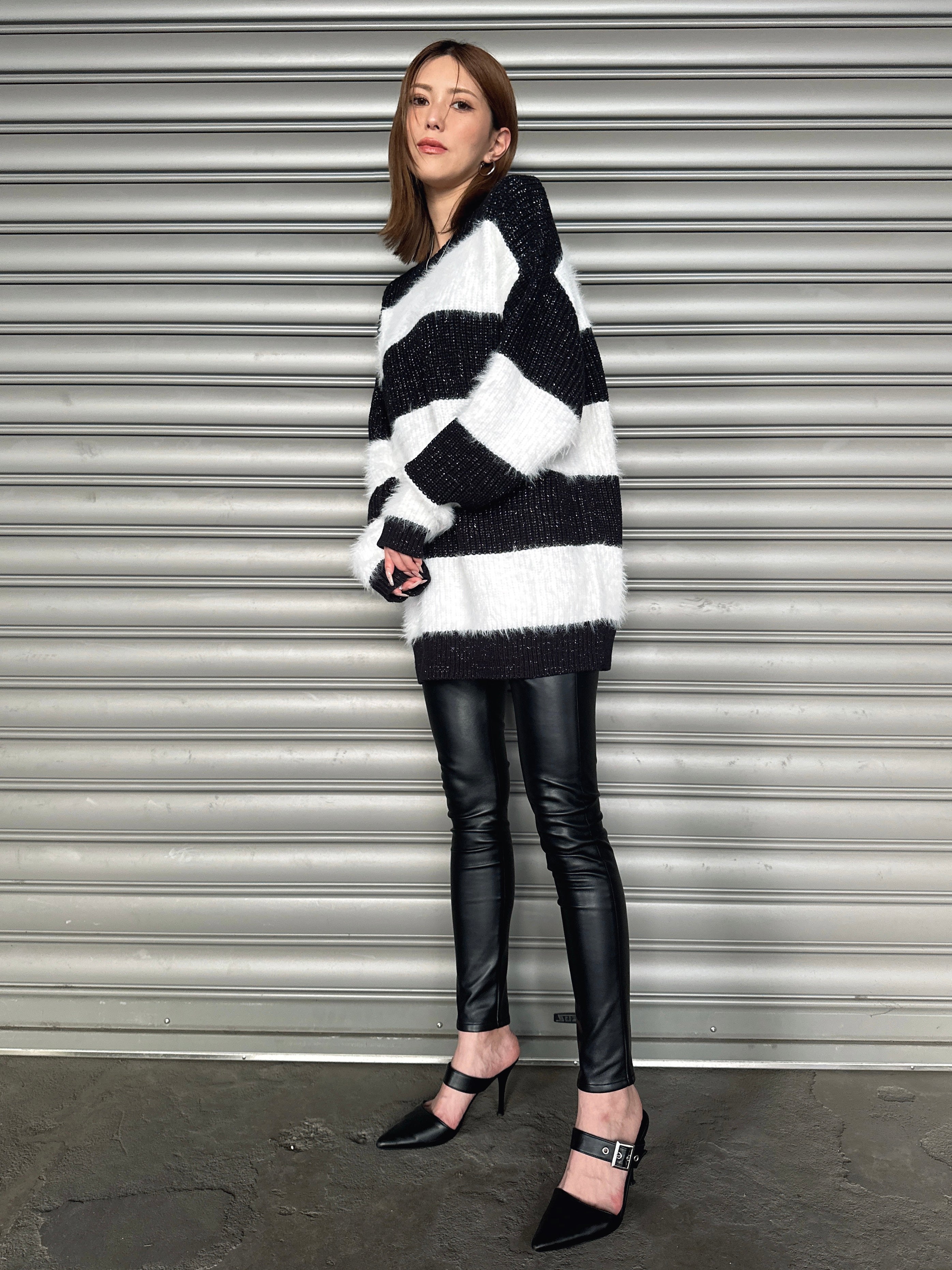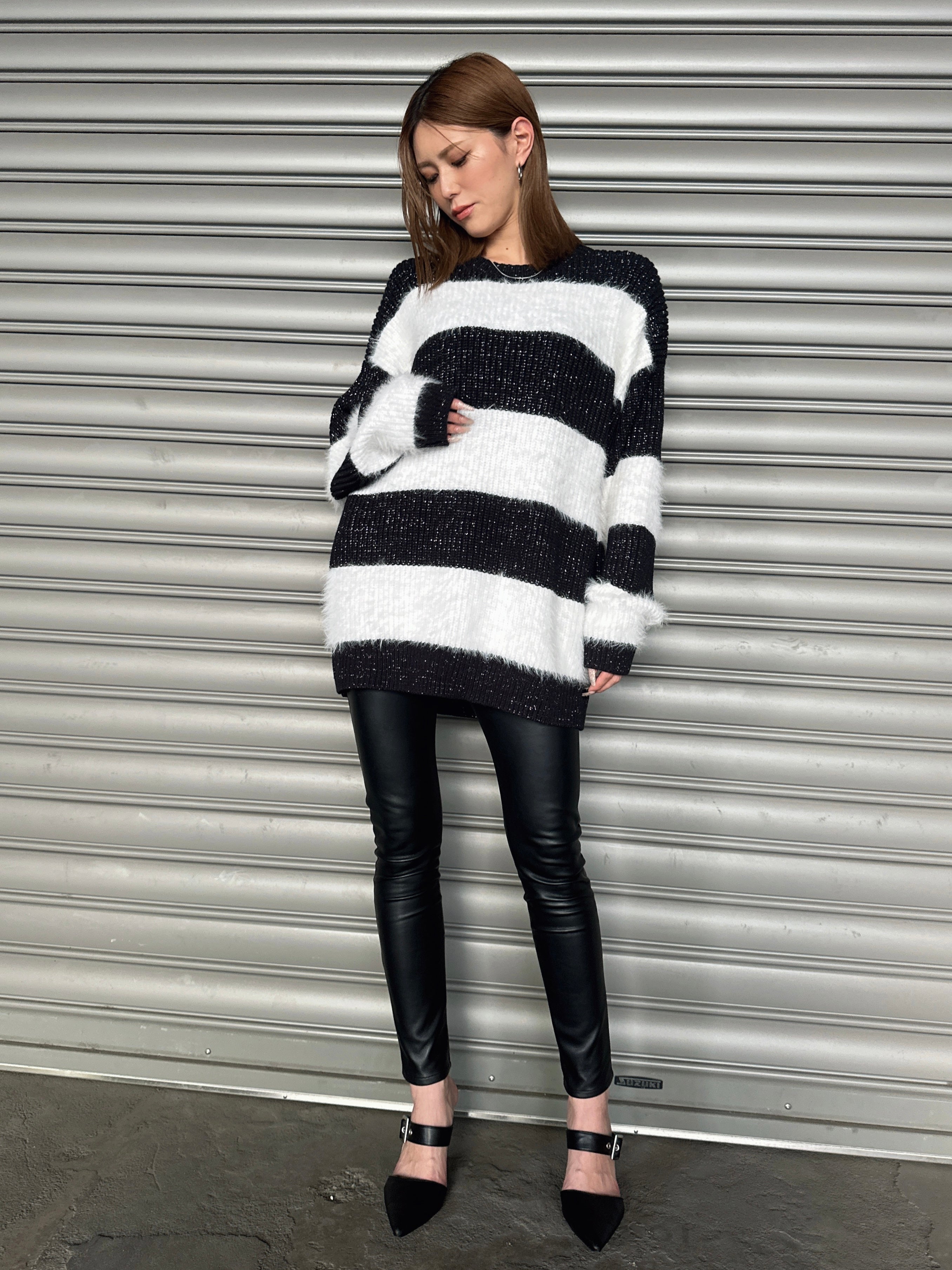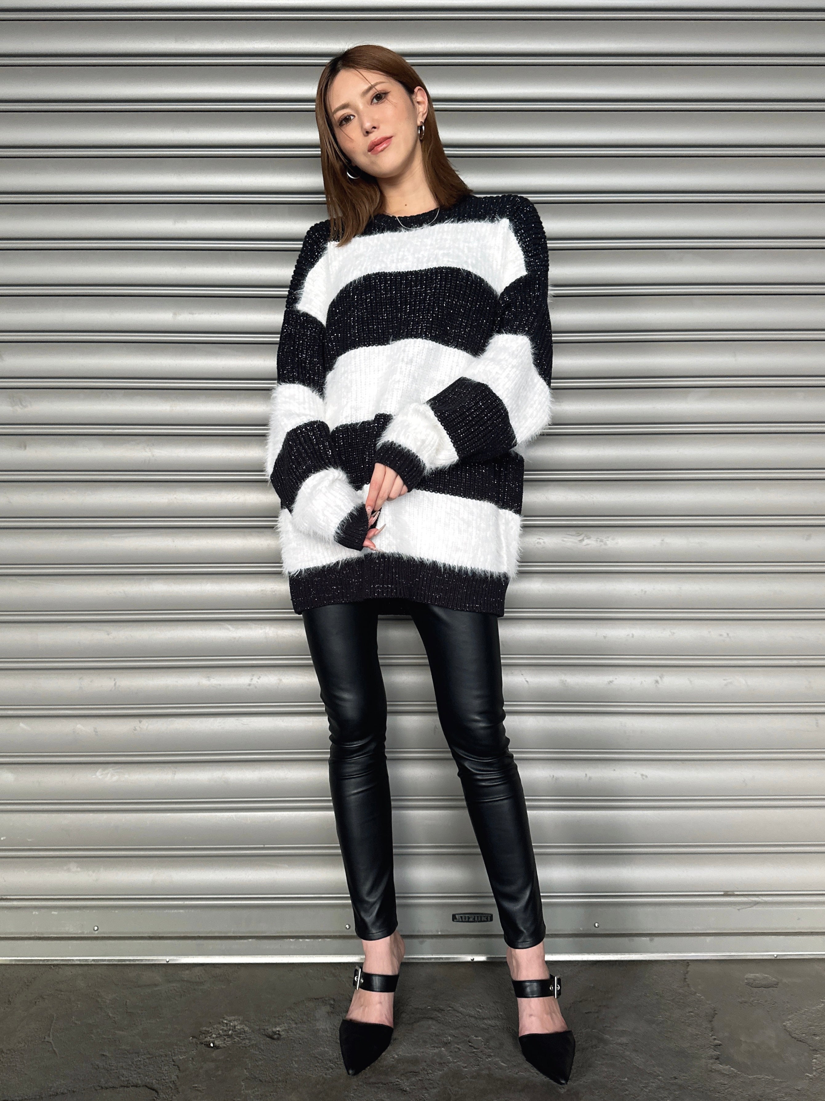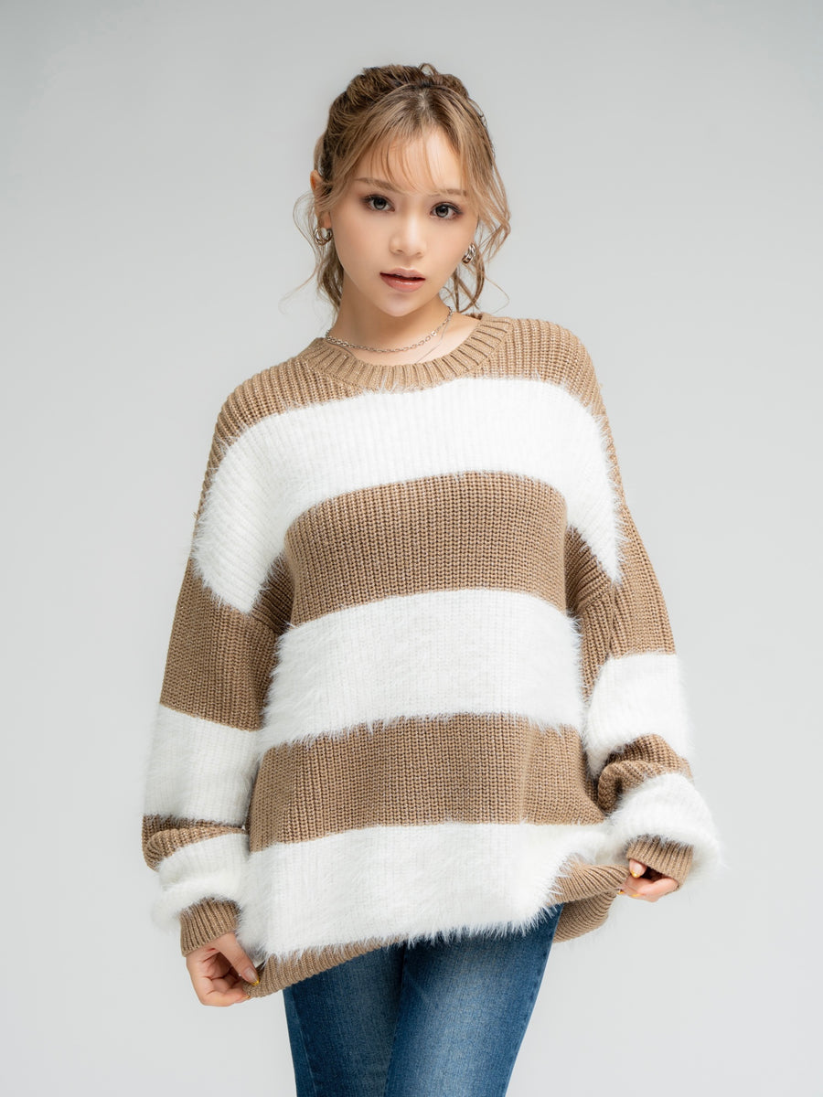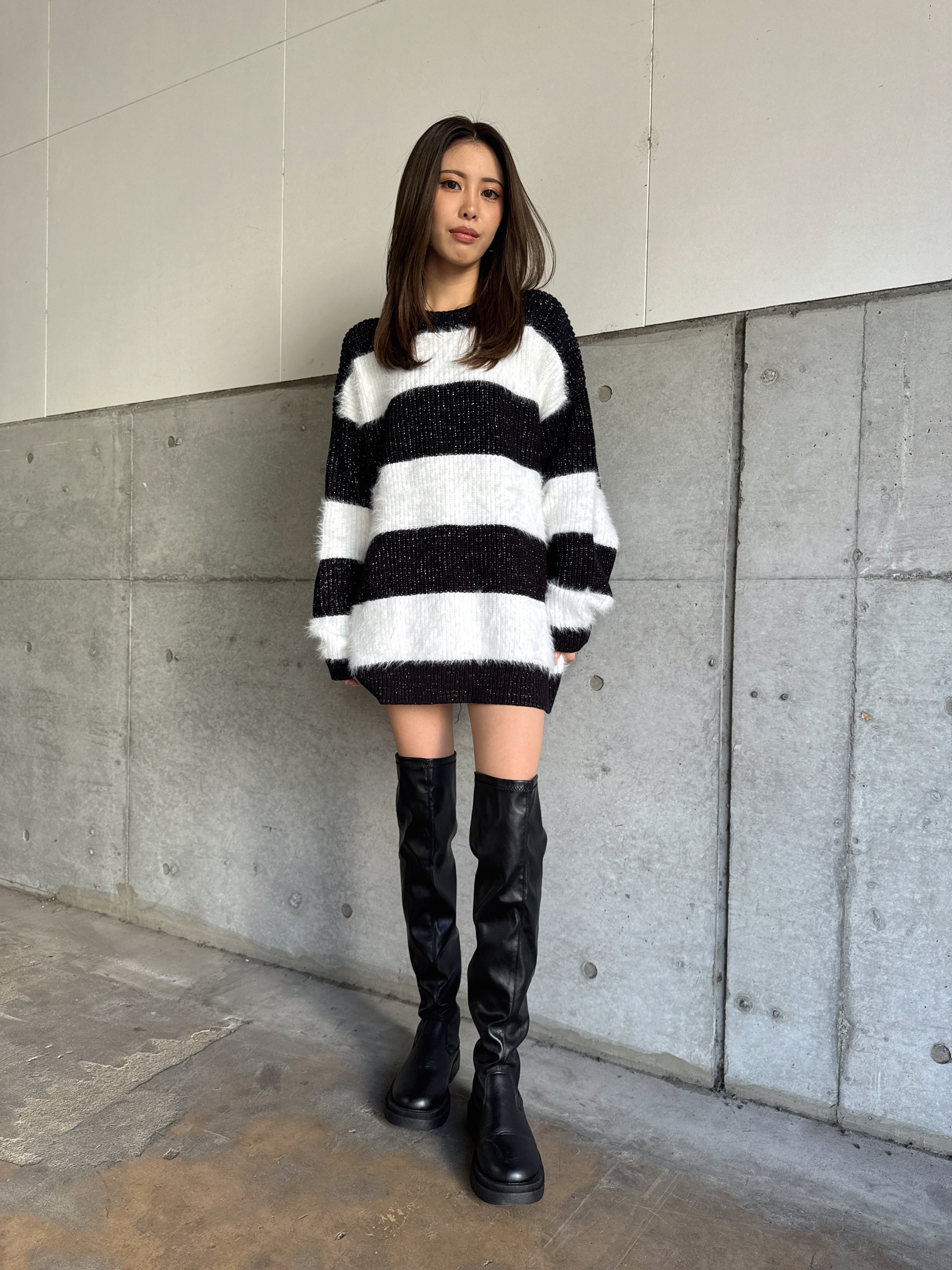ふわっと柔らかいシャギーときらびやかなアクリルラメニットを使用したボーダーニットップス。太めのピッチボーダーが目を惹き、コーディネートに存在感のあるアクセントをプラスします。袖口にたまるスリーブが着るだけで女性らしい柔らかな印象を演出。ゆったりとしたシルエットが体を優しく包み込み、気負わずにトレンド感を楽しめる一枚です。程よく開いたラウンドネックが、顔回りをすっきりとさせてくれます。着丈はヒップ隠れる長さに設定しているので、ミニボトムとロングブーツを合わせた王道コーデがオススメです。
