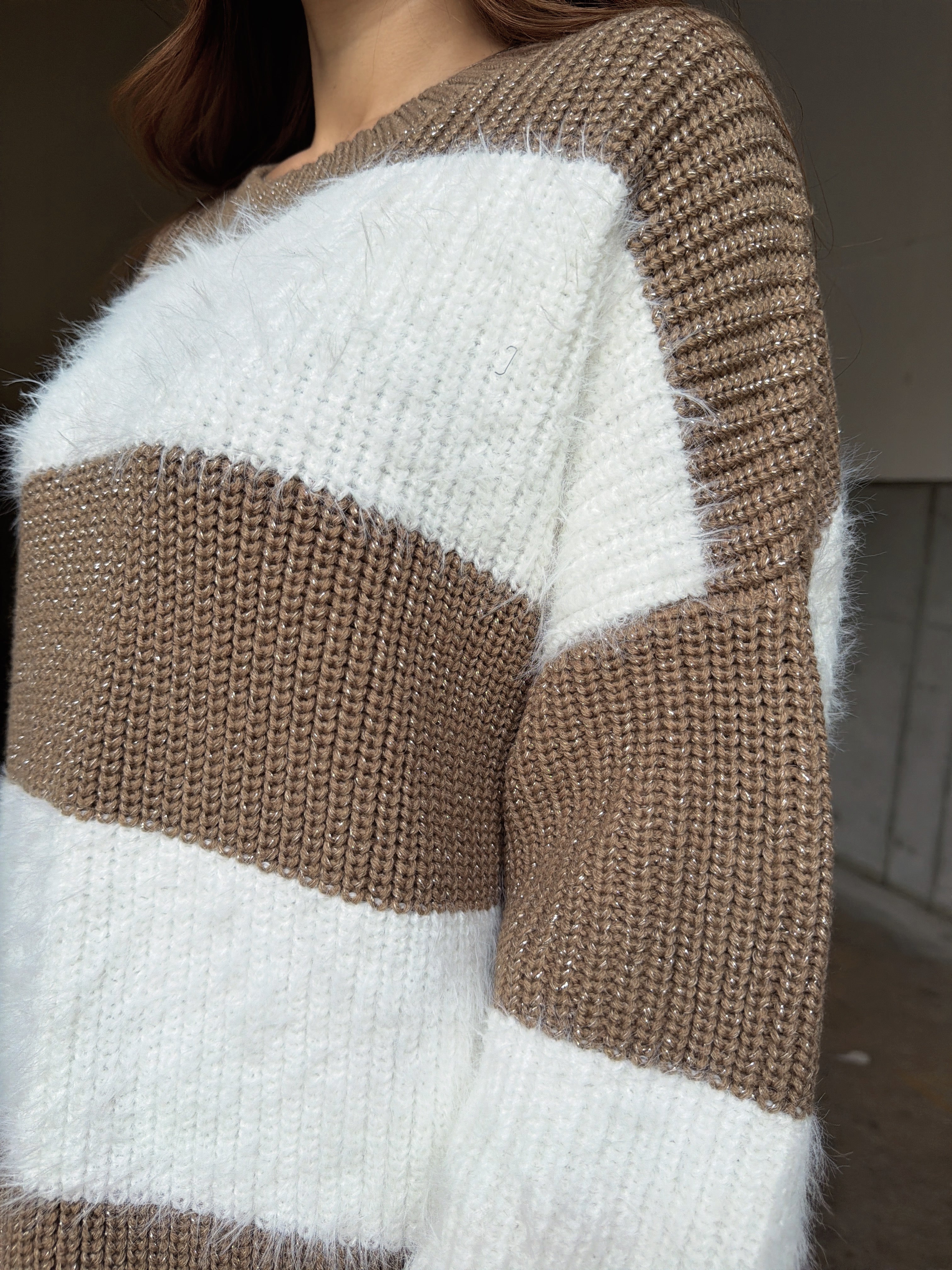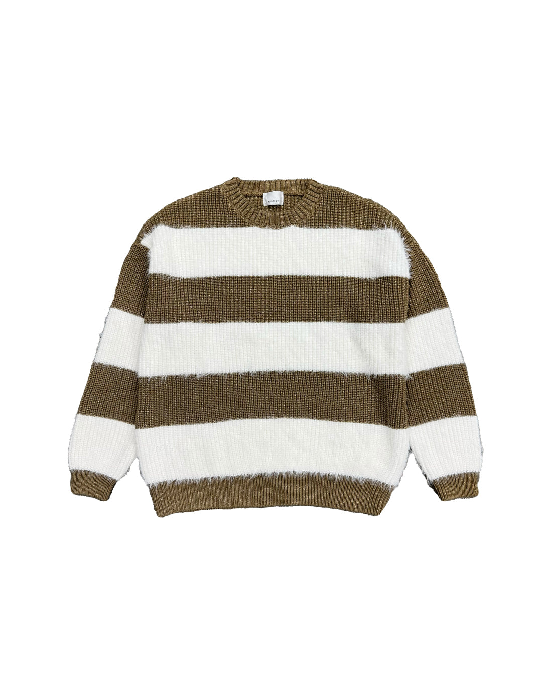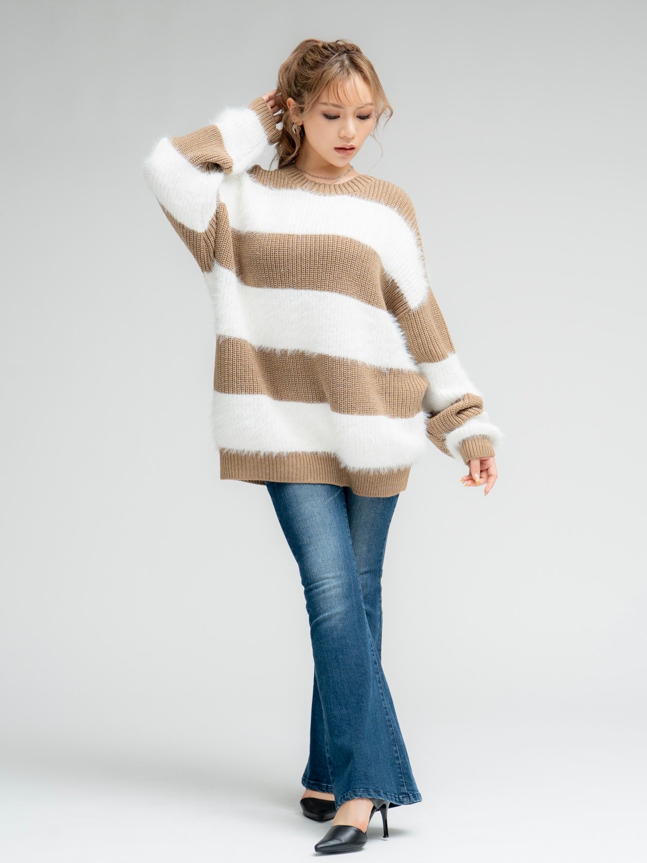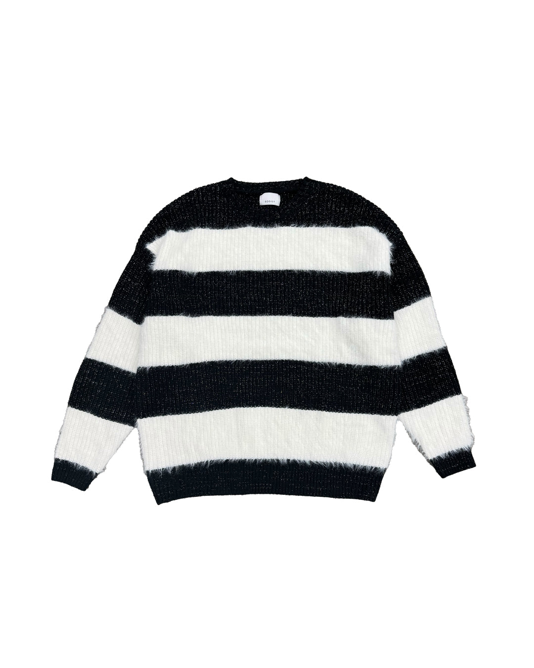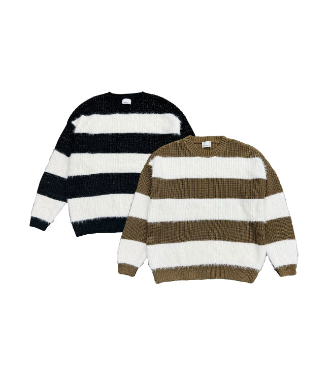 ふわっと柔らかいシャギーときらびやかなアクリルラメニットを使用したボーダーニットップス。太めのピッチボーダーが目を惹き、コーディネートに存在感のあるアクセントをプラスします。袖口にたまるスリーブが着るだけで女性らしい柔らかな印象を演出。ゆったりとしたシルエットが体を優しく包み込み、気負わずにトレンド感を楽しめる一枚です。程よく開いたラウンドネックが、顔回りをすっきりとさせてくれます。着丈はヒップ隠れる長さに設定しているので、ミニボトムとロングブーツを合わせた王道コーデがオススメです。